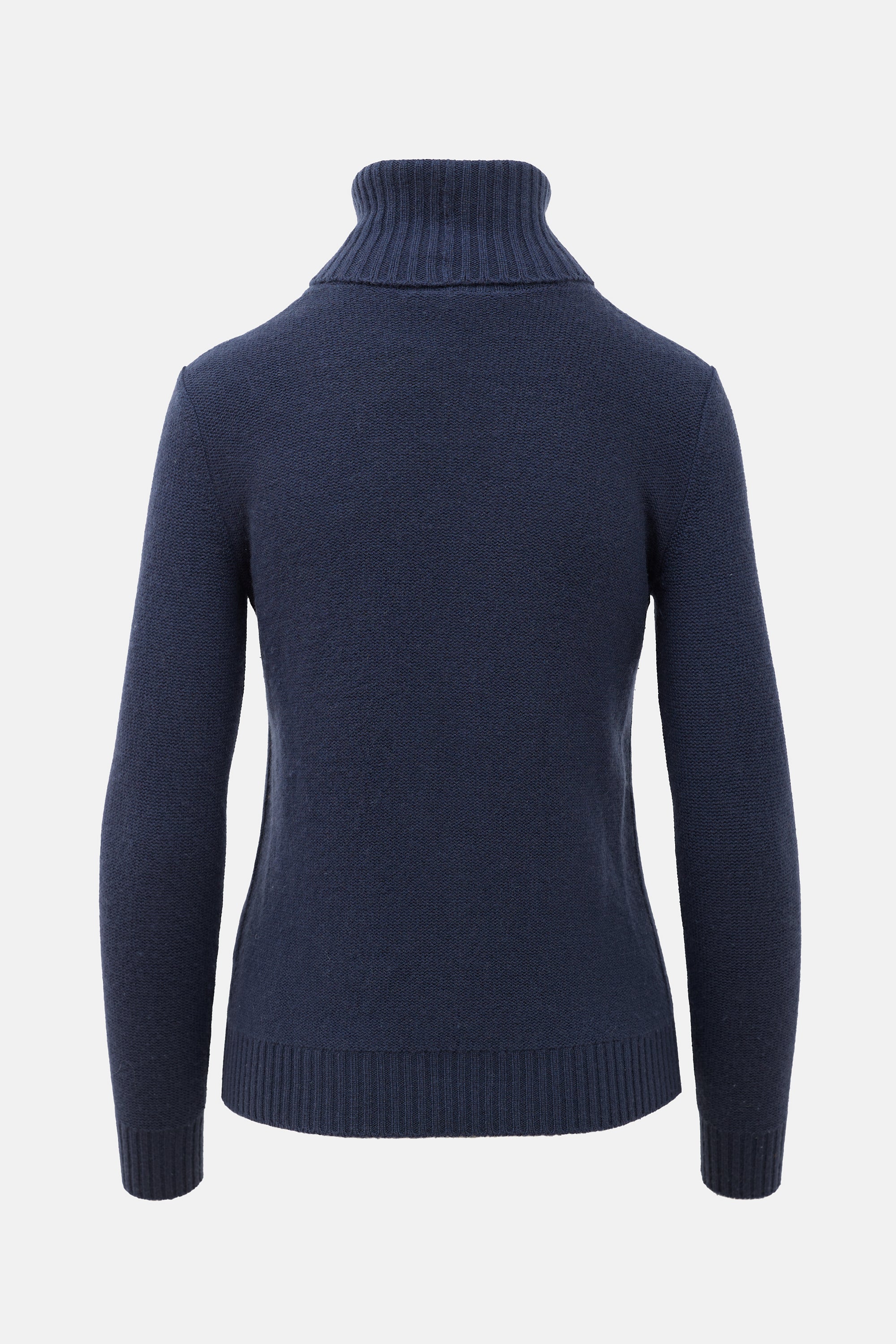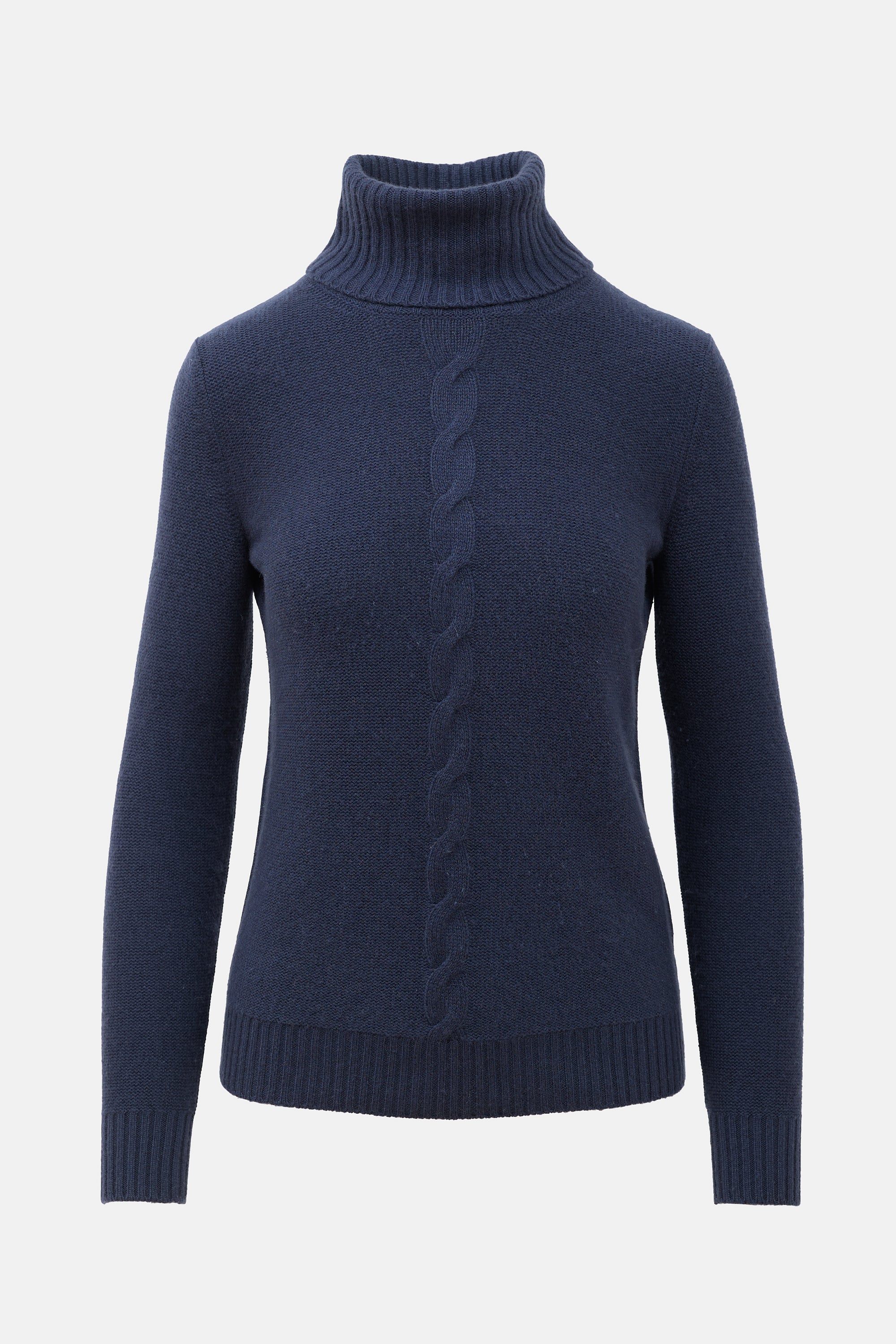 Pre-owned Loro Piana navy cashmere sweater featuring a ribbed fold over turtleneck, cable knit detail at front, and a ribbed hem and cuffs.