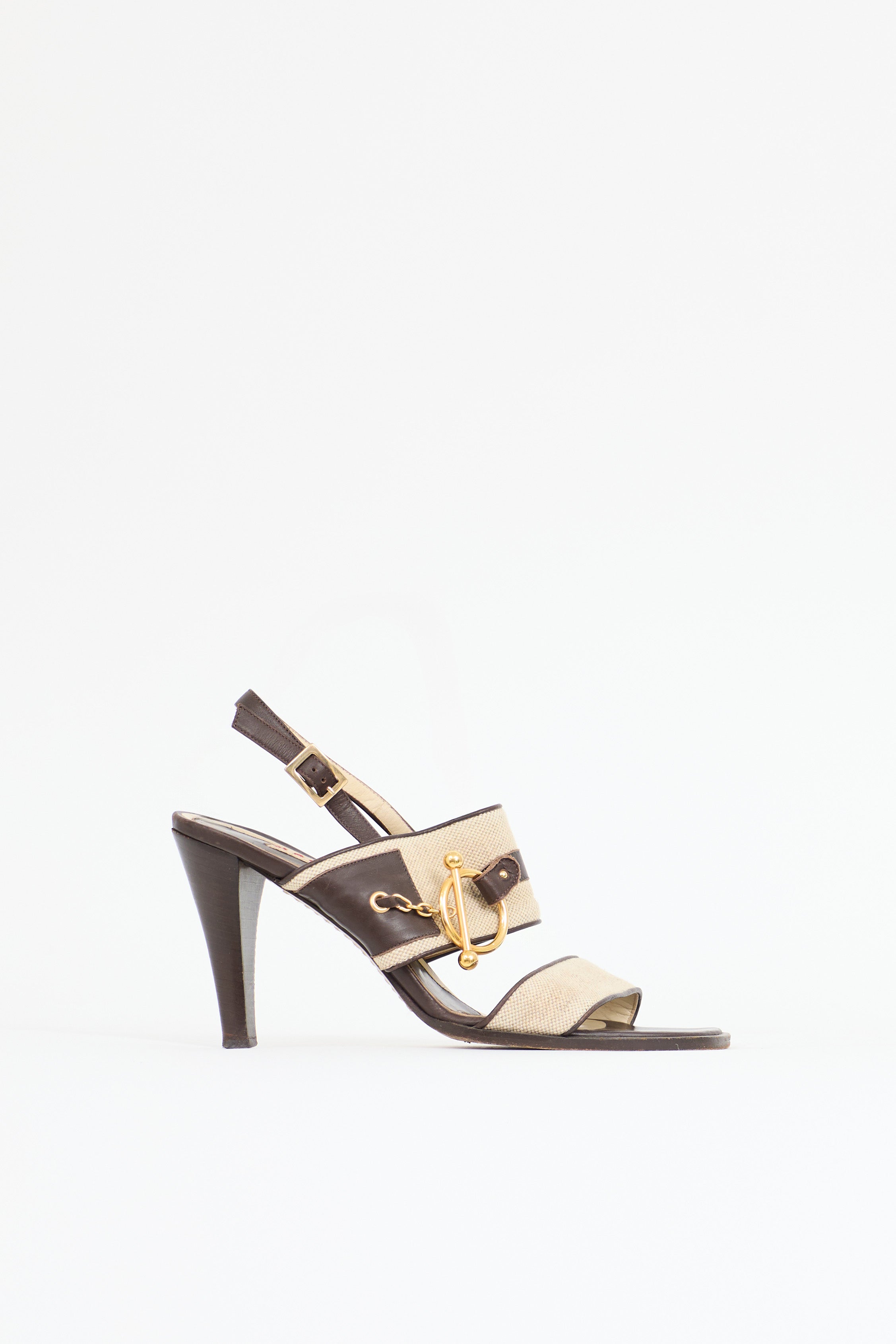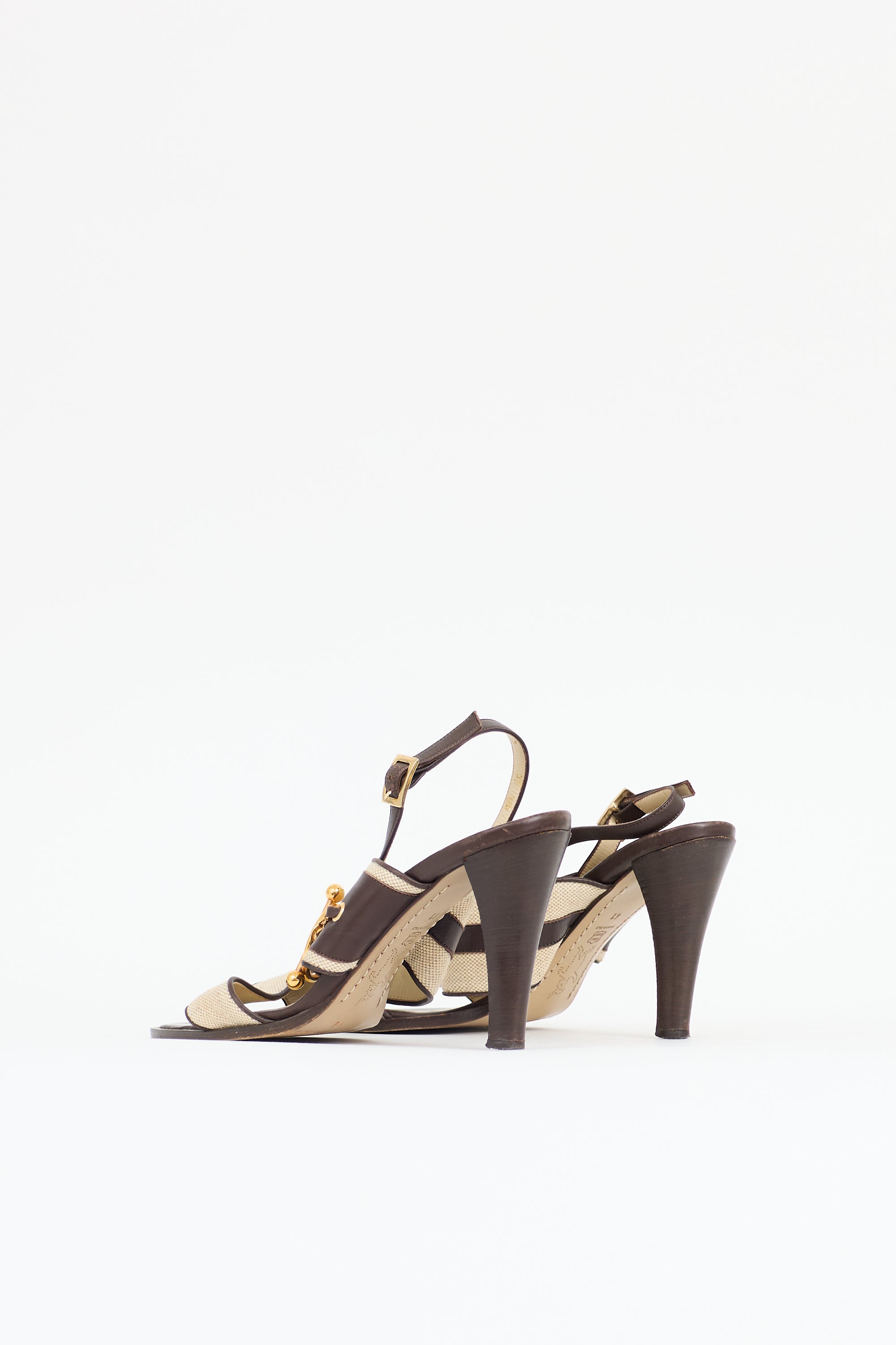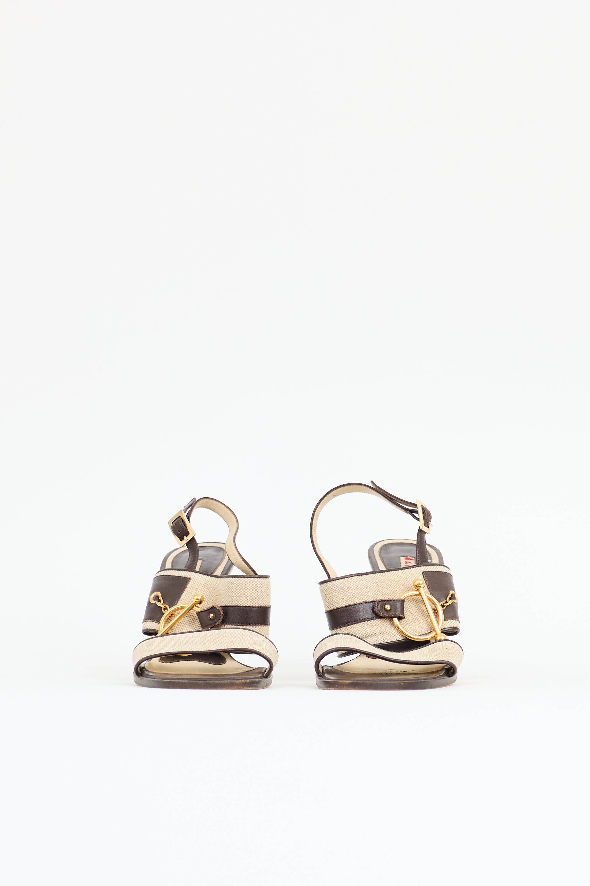 Pre-owned Marni beige canvas and brown leather sandals featuring square tie, toggle embellishment at instep, adjustable slingback strap, and stacked cone heel.