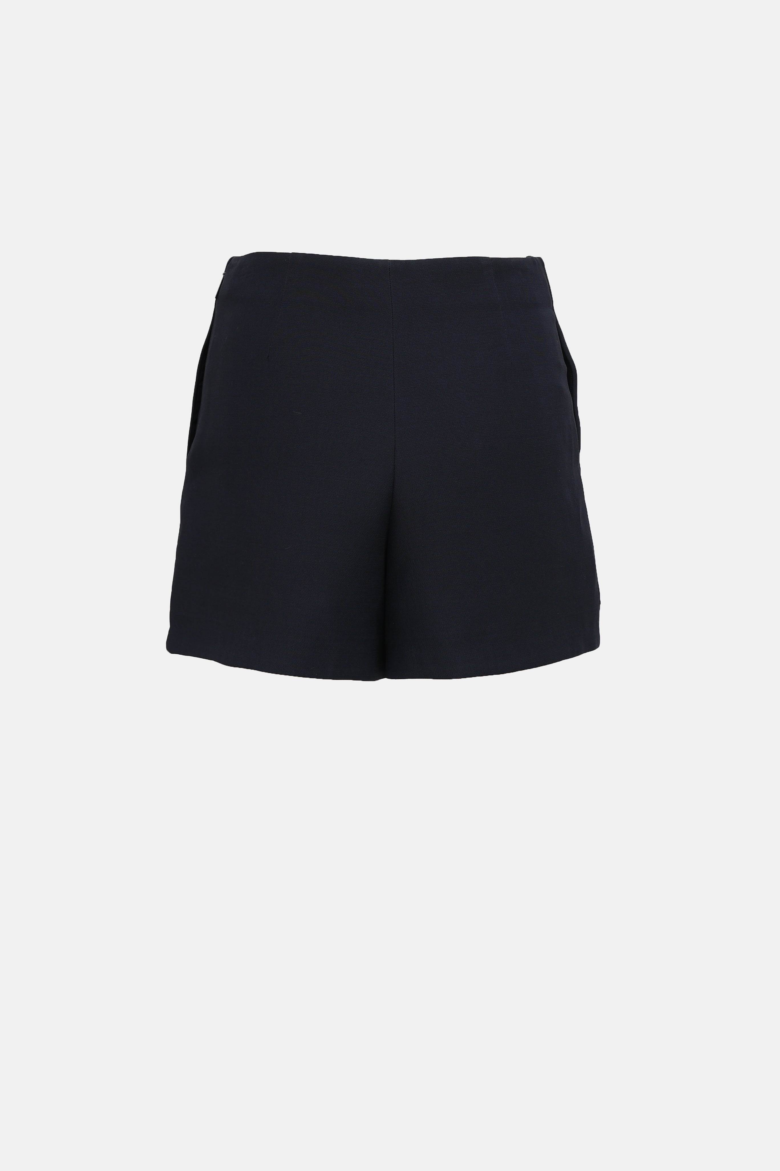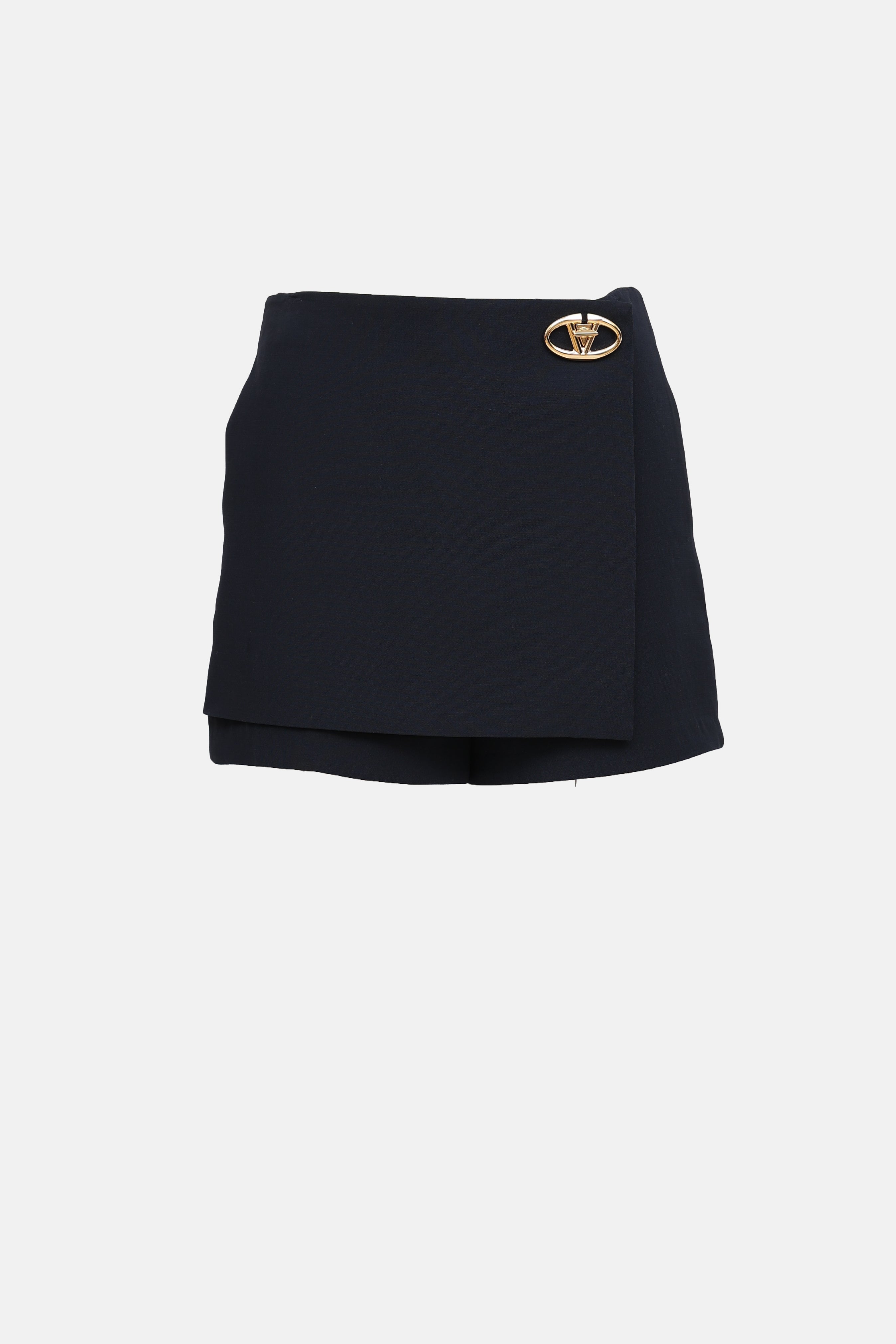 Pre-owned Valentino navy skort featuring metal logo turnlock at waist, slit pockets at hip, wrap front, and concealed zip at side.
