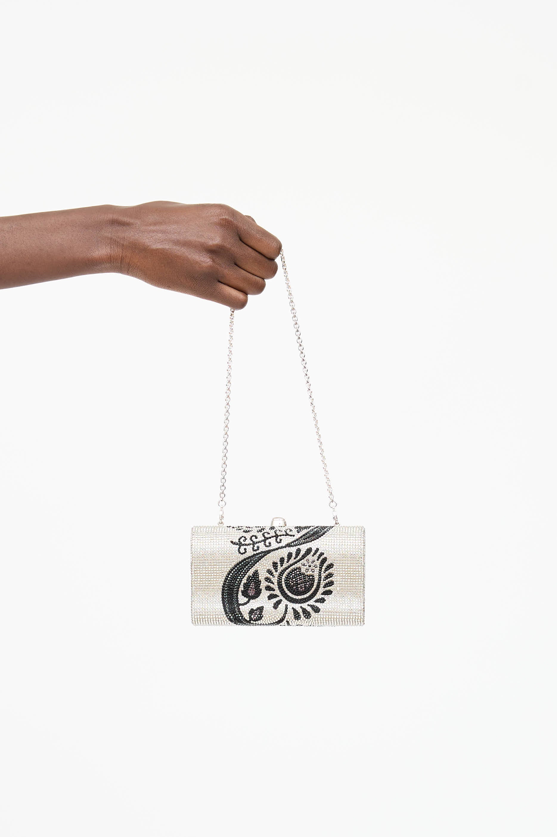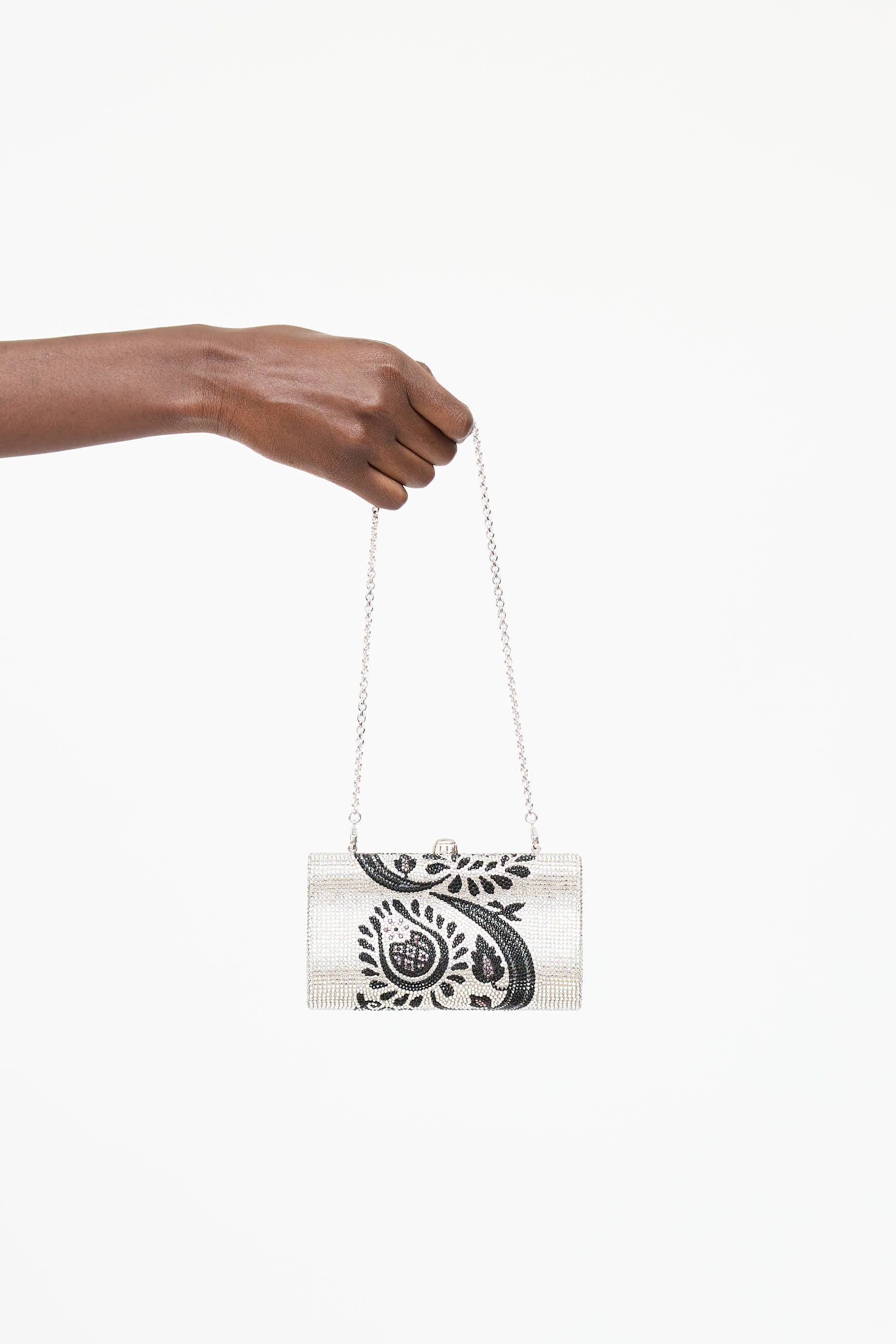 Pre-owned Judith Leiber silver and black clutch featuring crystal embellishments throughout, detachable chain-link strap, push lock closure, and one main compartment.