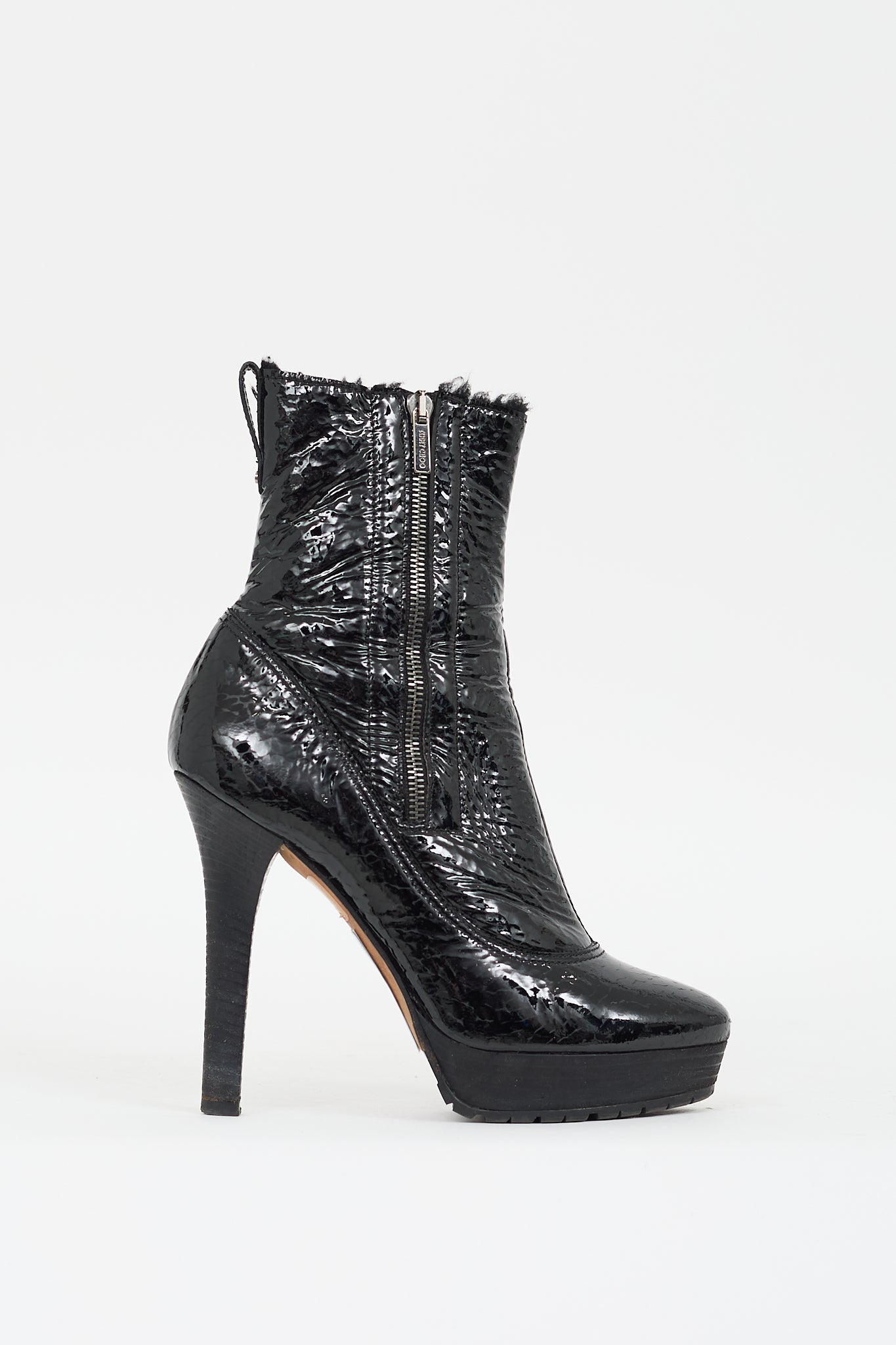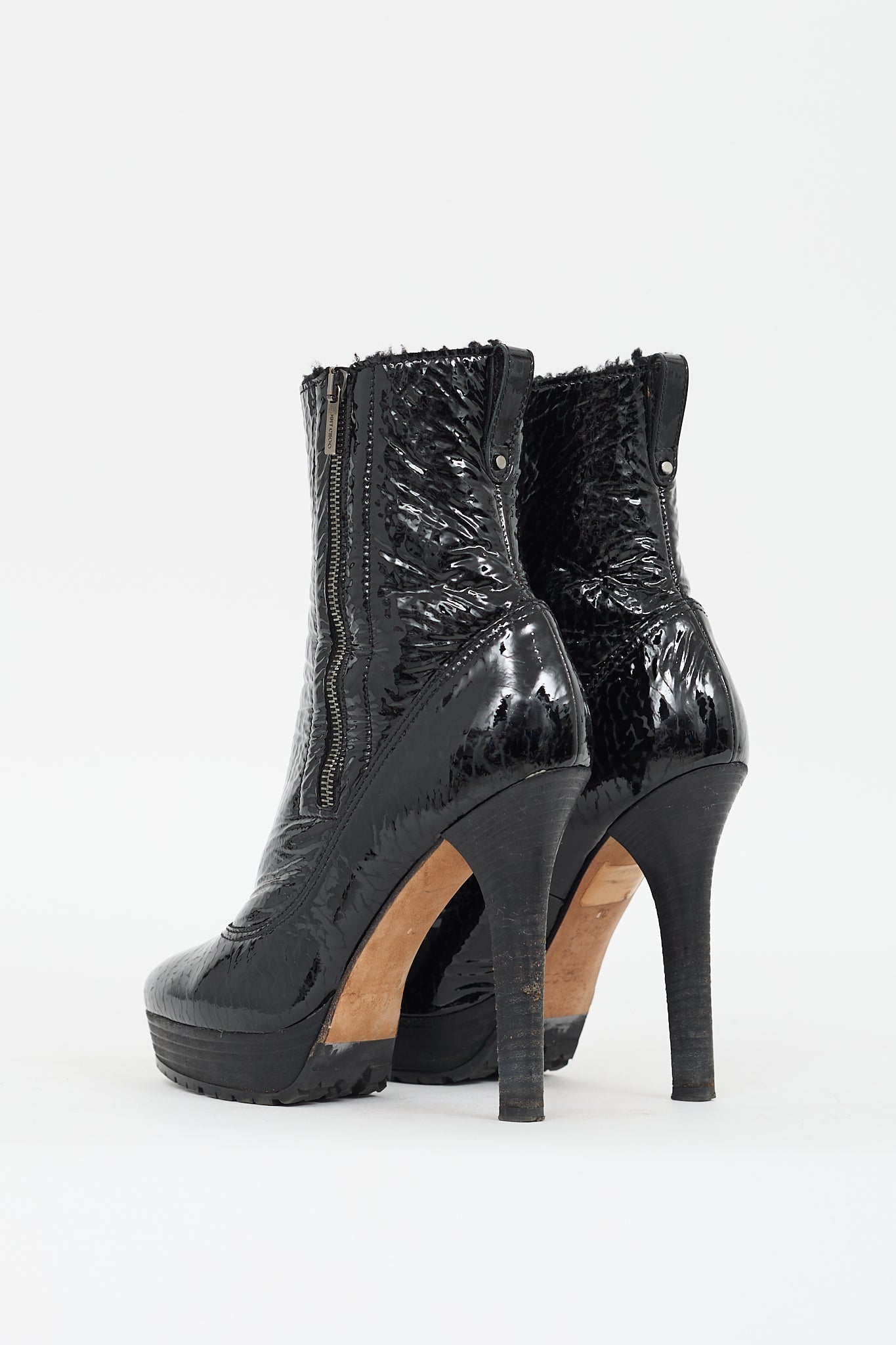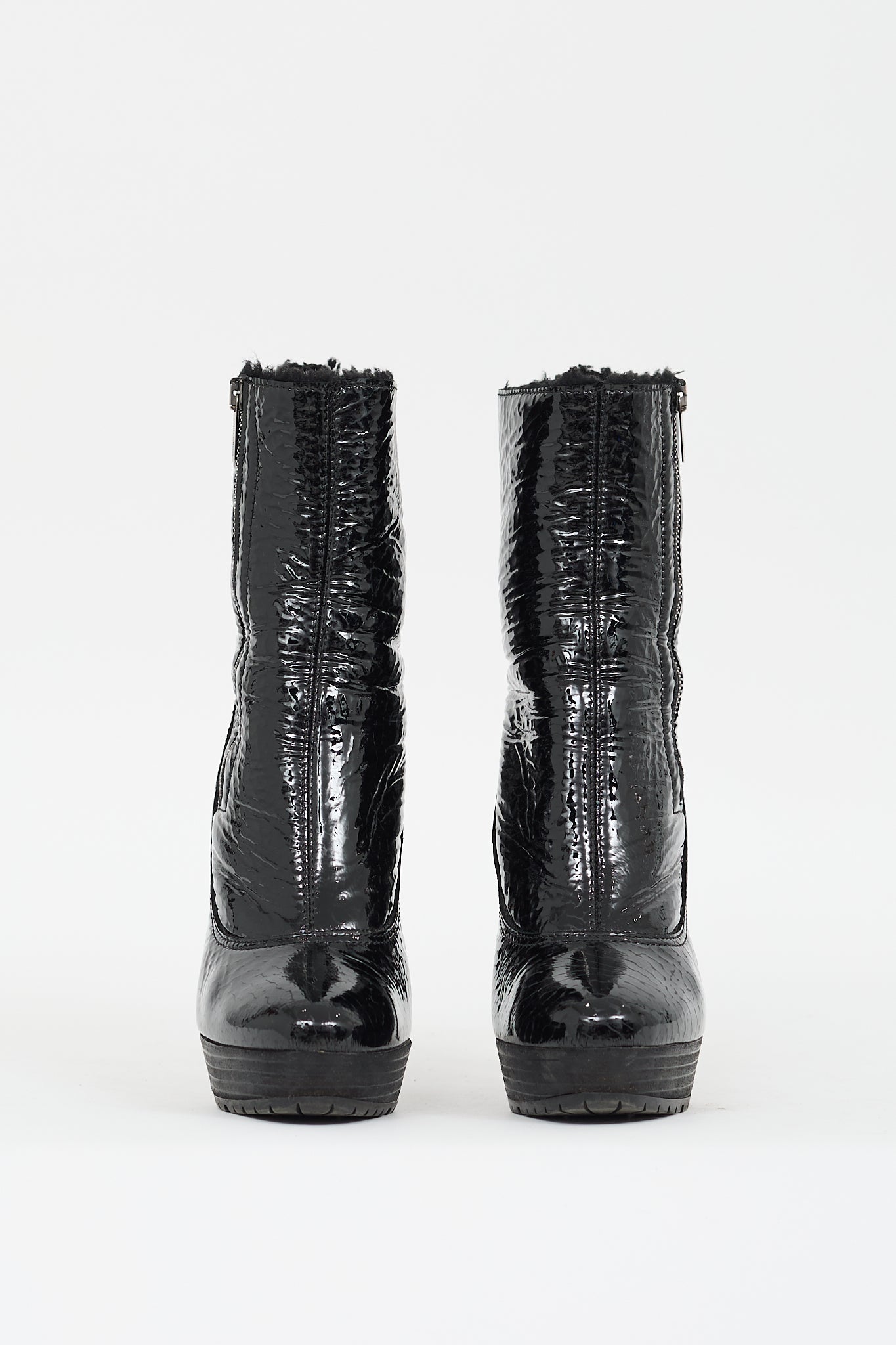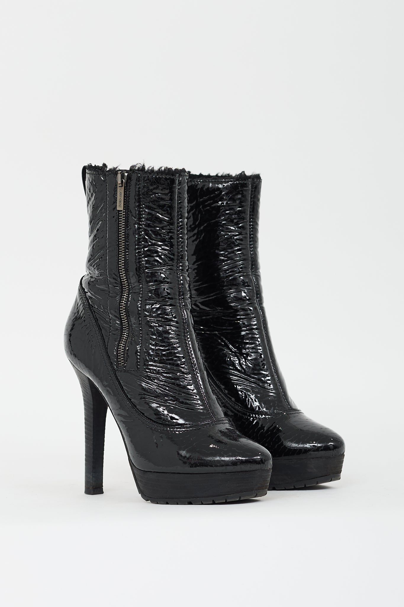 Pre-owned Jimmy Choo black Trixie boots featuring almond toe, wrinkle textured patent leather upper, outer side zip closure, shearling lining, stacked platform and heel, and treaded sole.