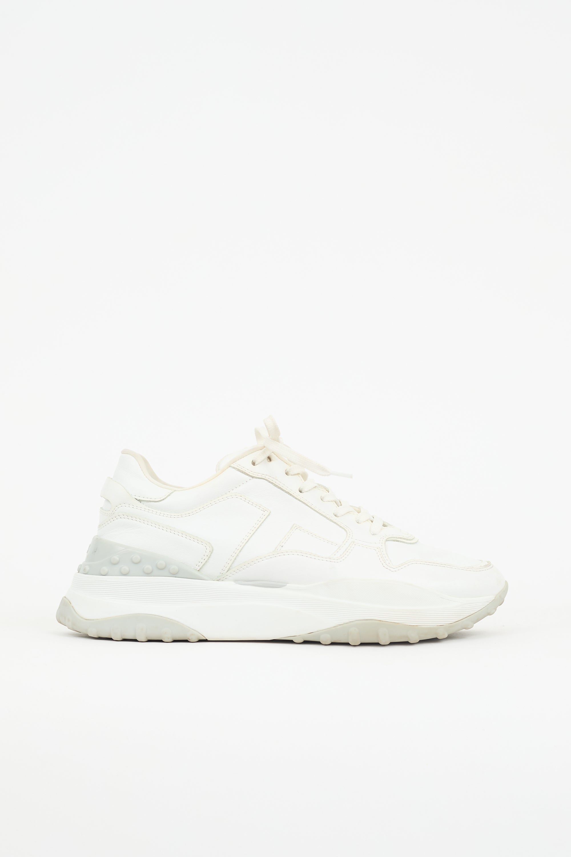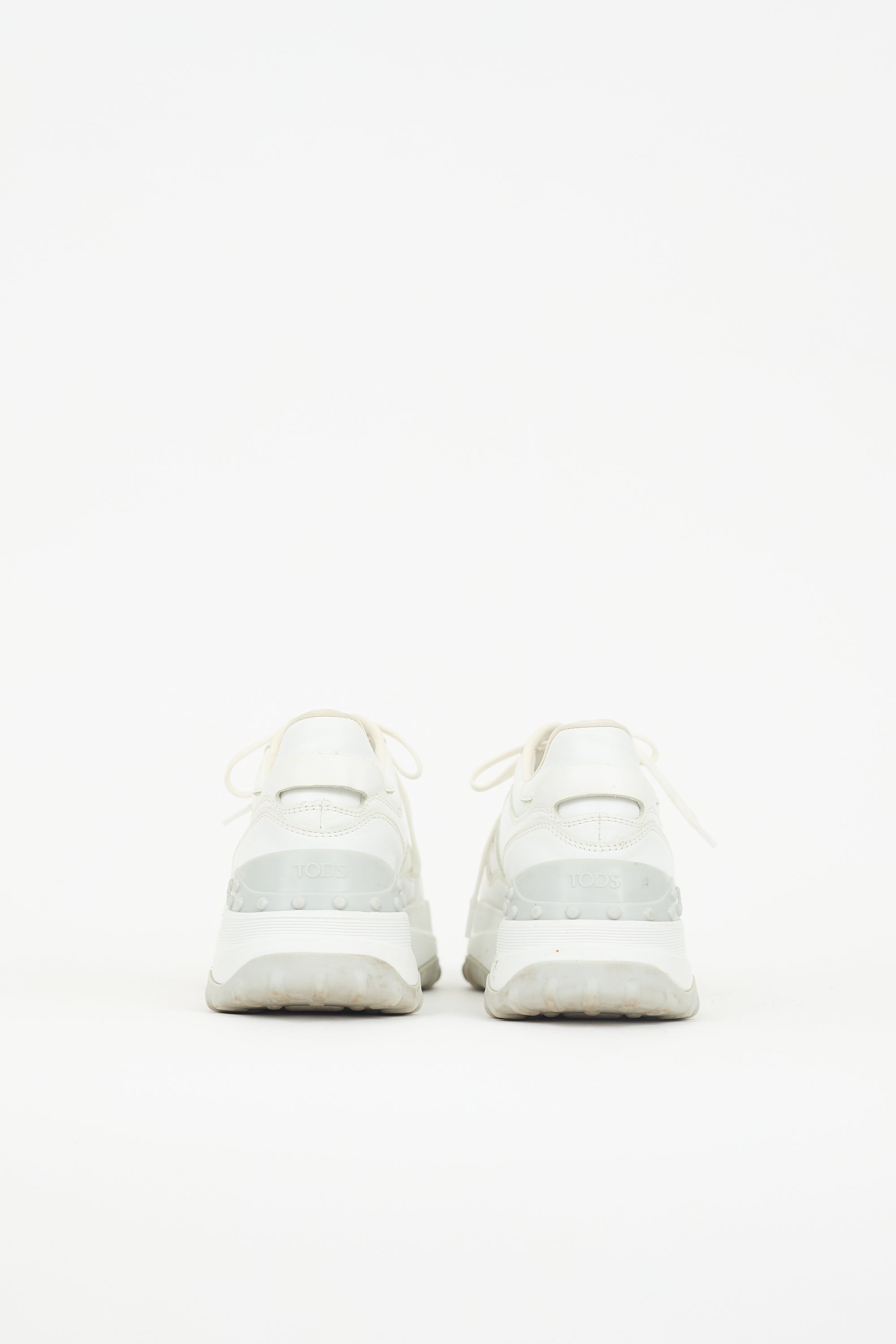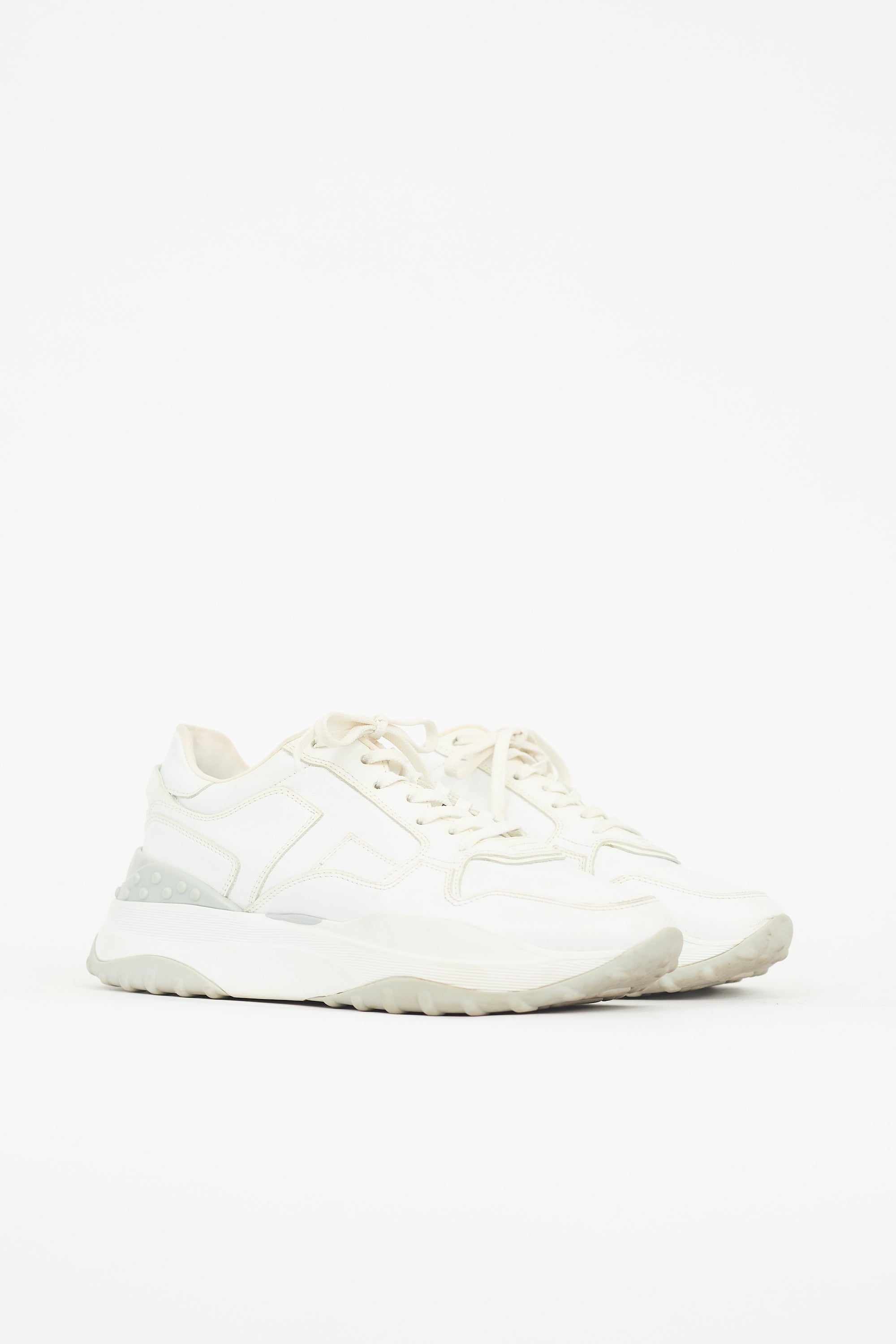 Pre-owned Tod's white leather sneakers featuring rounded toe, lace up instep, embroidered logo at tongue, panelled T at sides, pull tab and rubber logo panel at counter, and rubber sole.