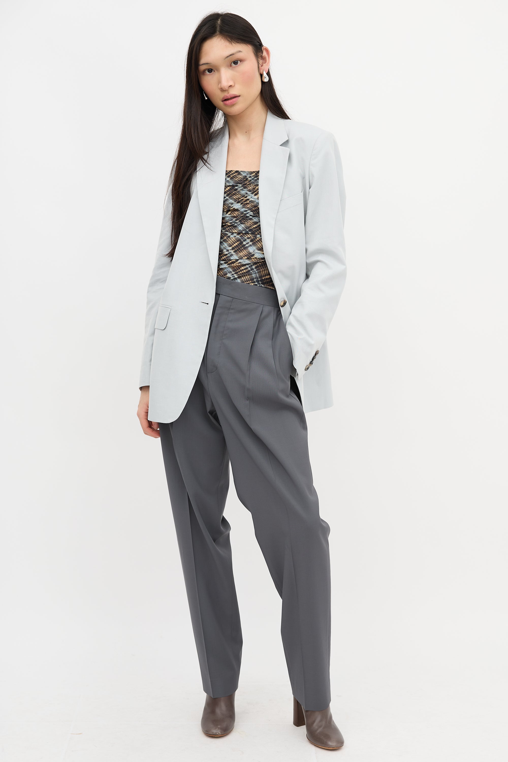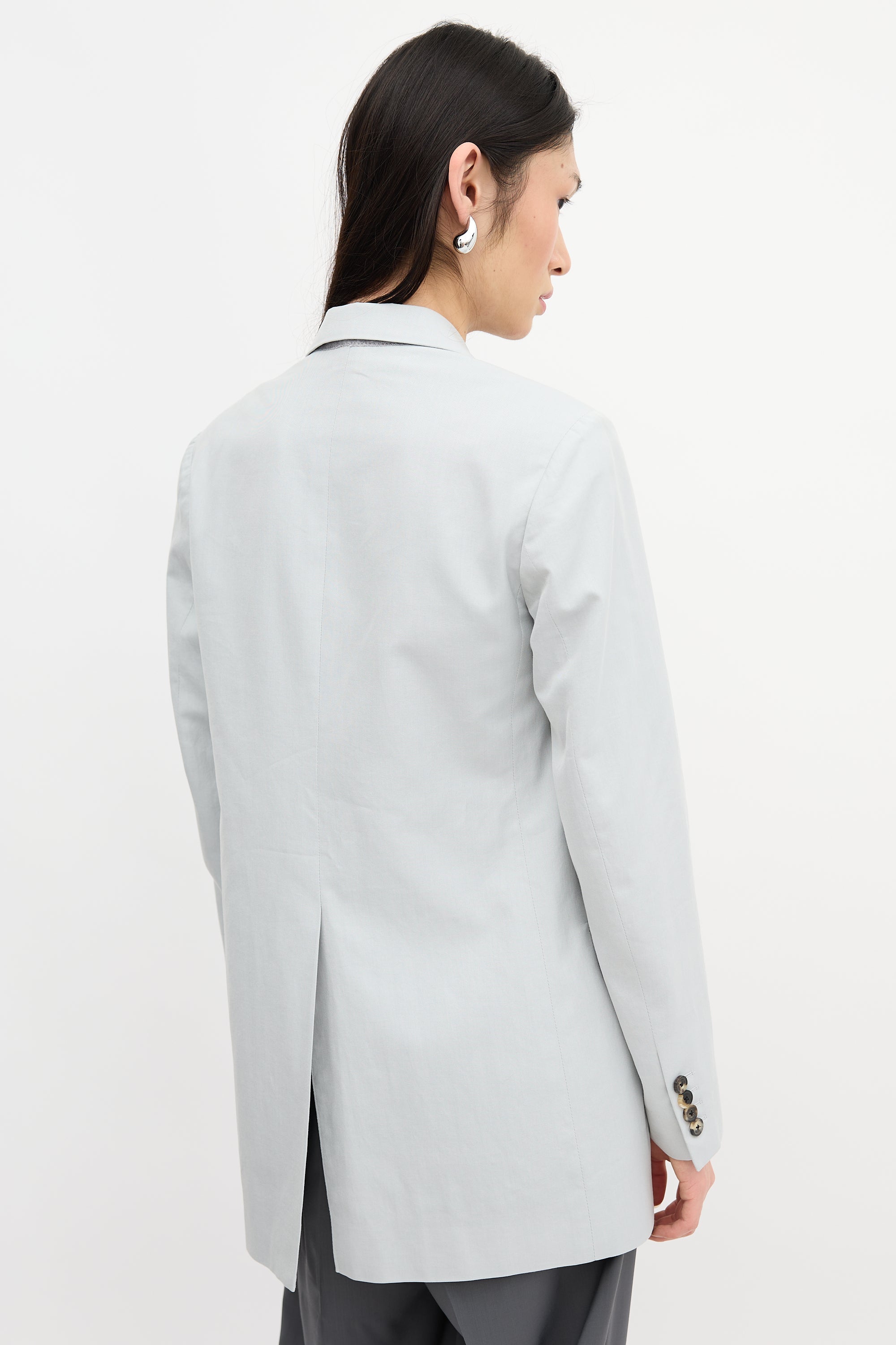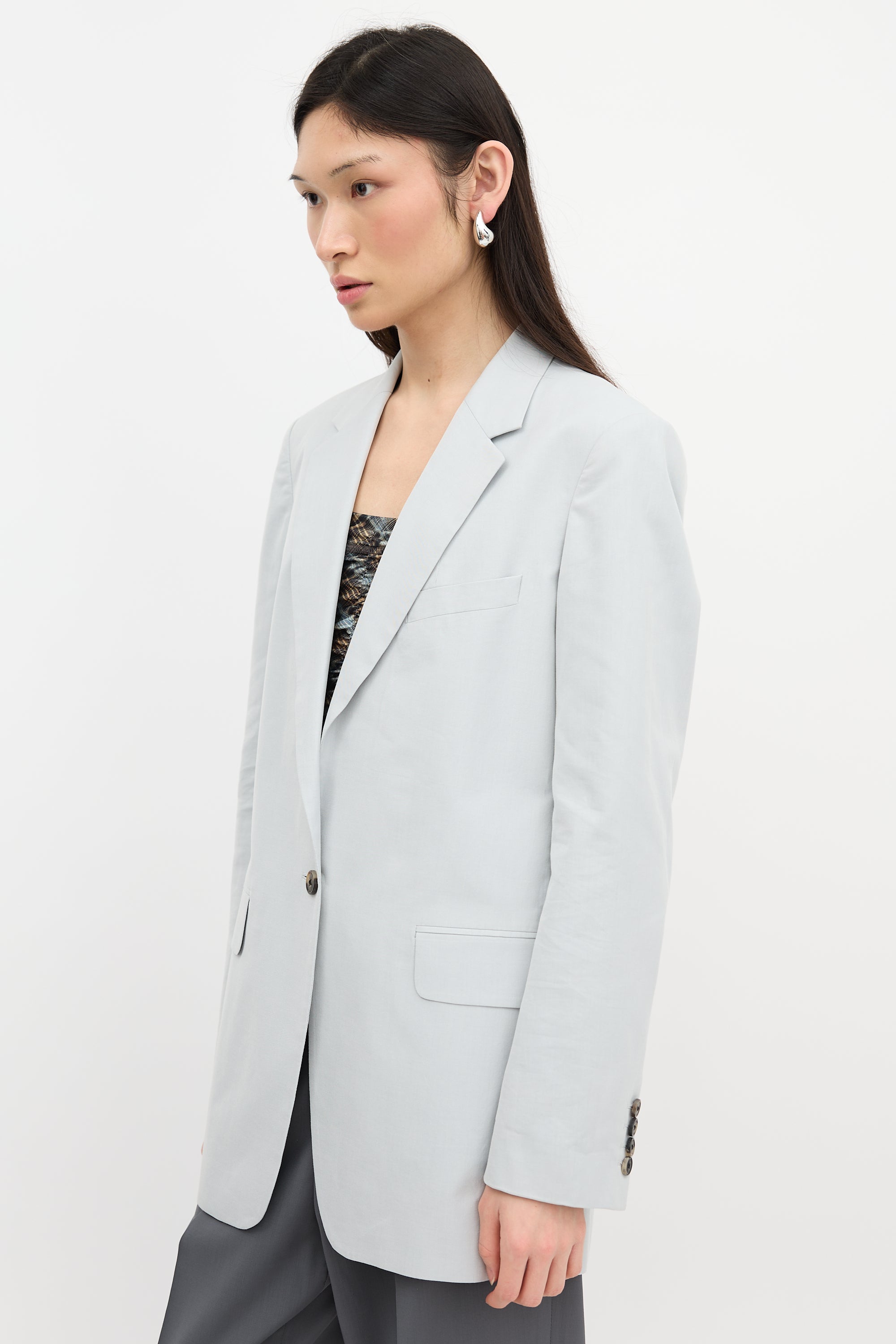Pre-owned Dries Van Noten grey blazer featuring notched lapel, single front button closure, three front pockets, back vent, padded shoulders, and buttoned cuffs. Lined.