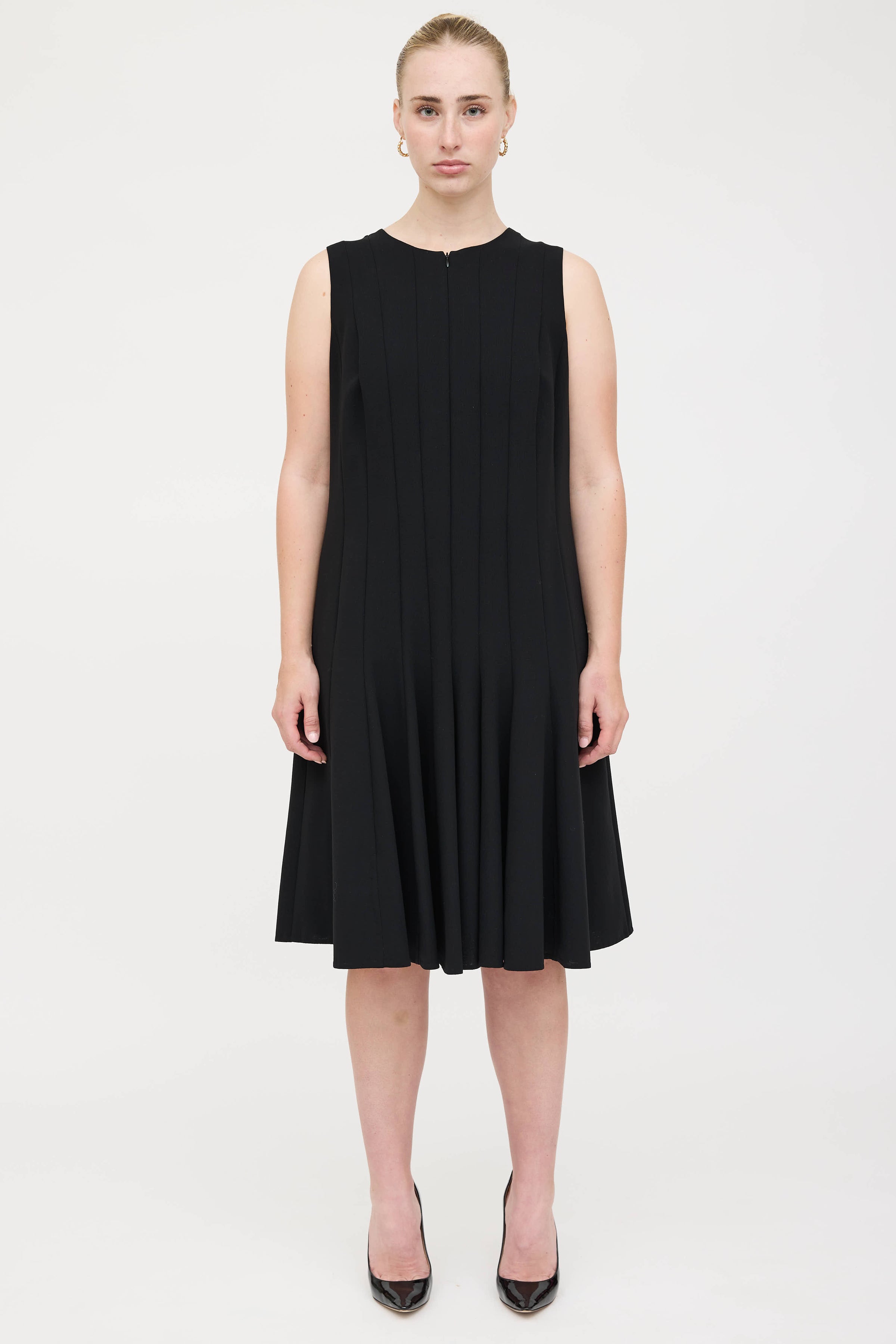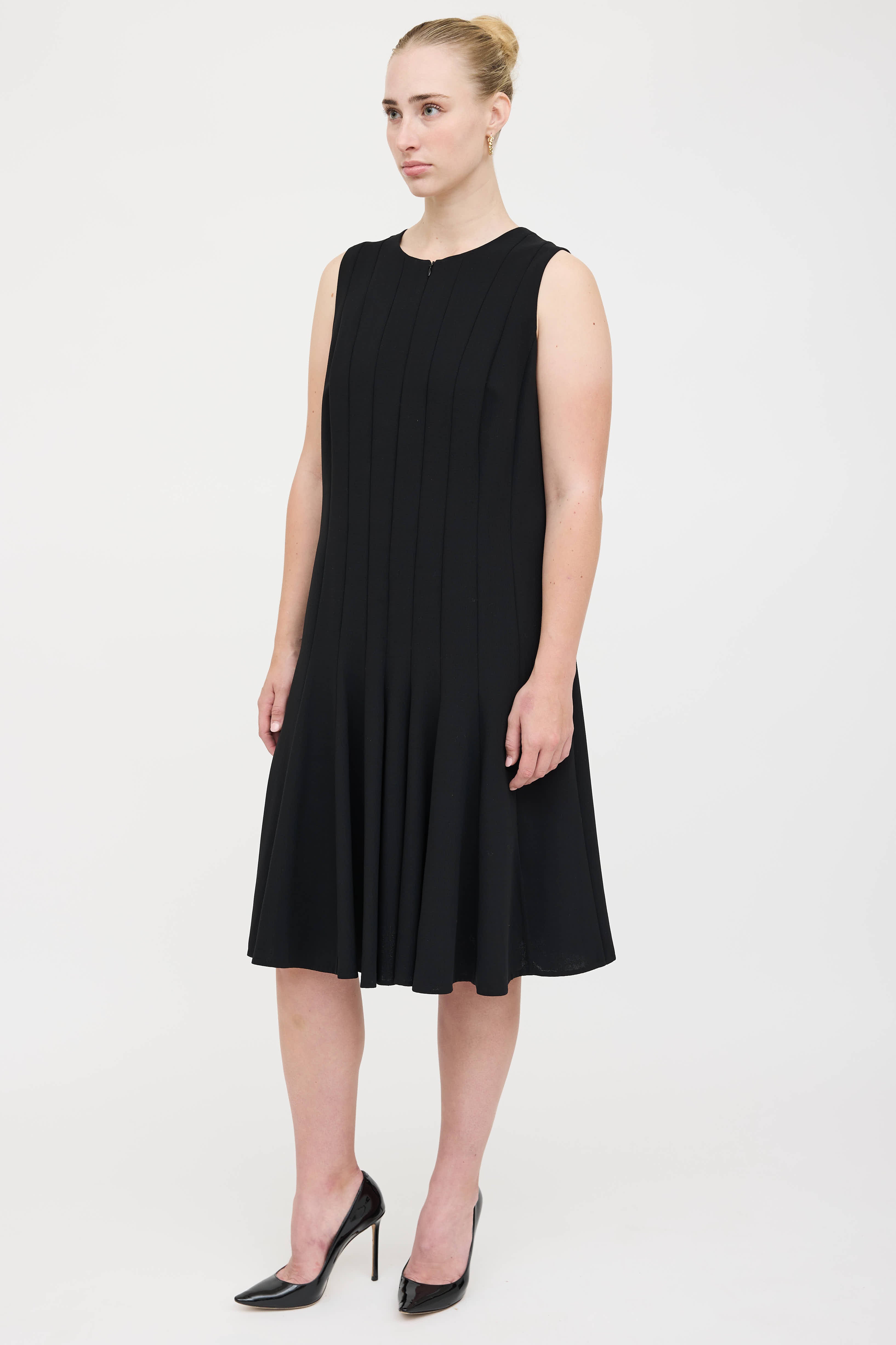Pre-owned Akris black wool sleeveless dress featuring round neckline, zip front, and pleated throughout. Lined.