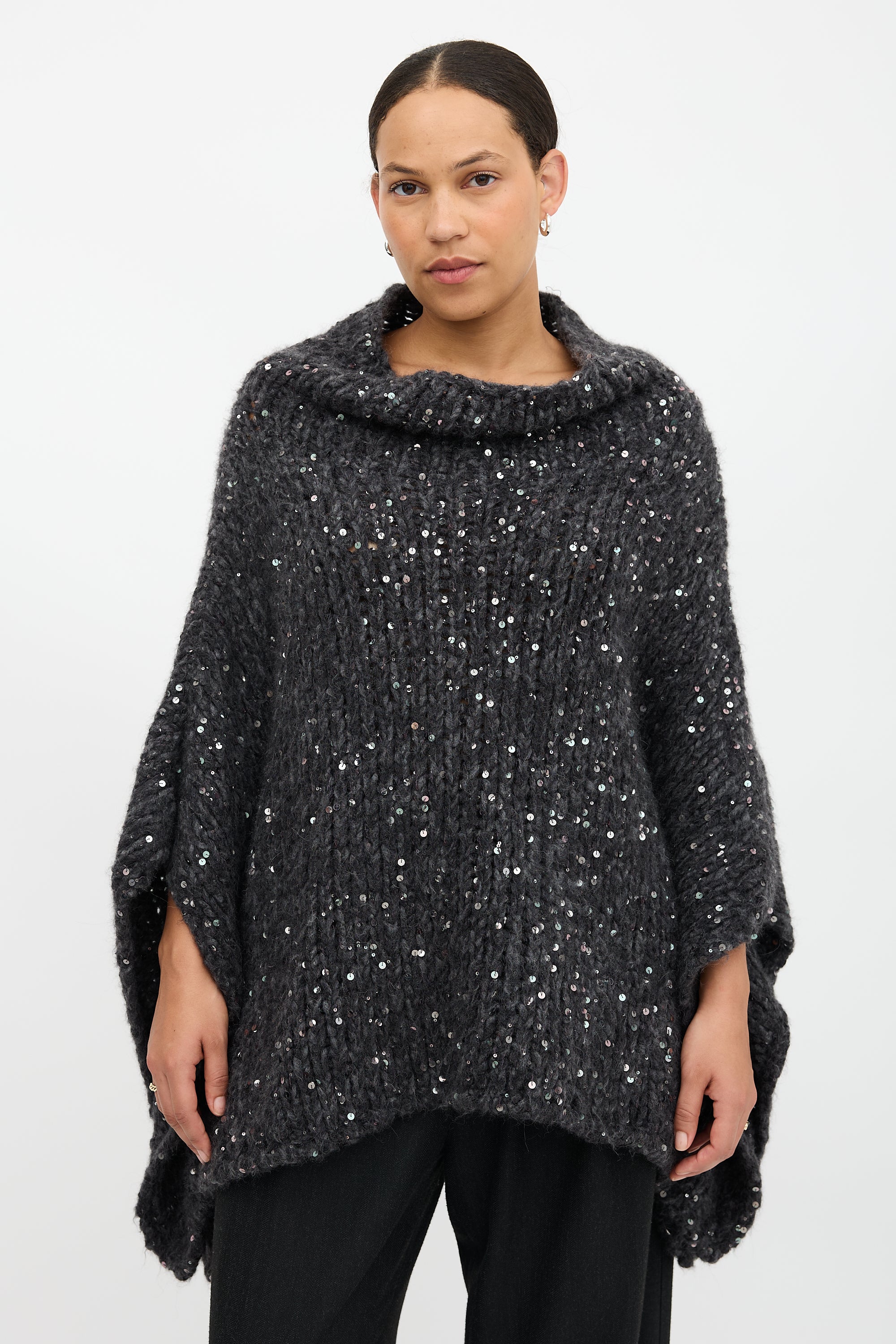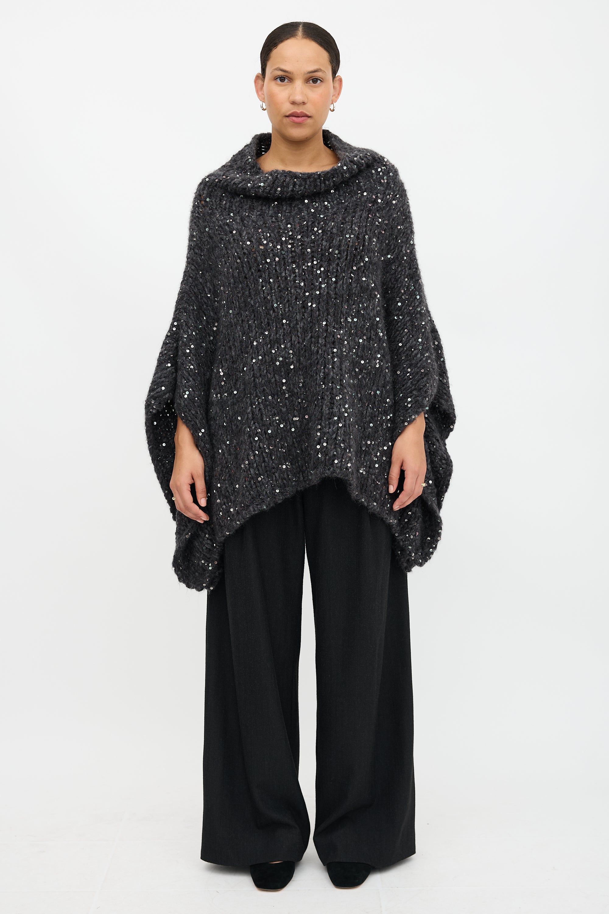Pre-owned Brunello Cucinelli grey alpaca wool blend sweater featuring tonal sequin embellishments throughout, mock neckline, and cape sleeves.