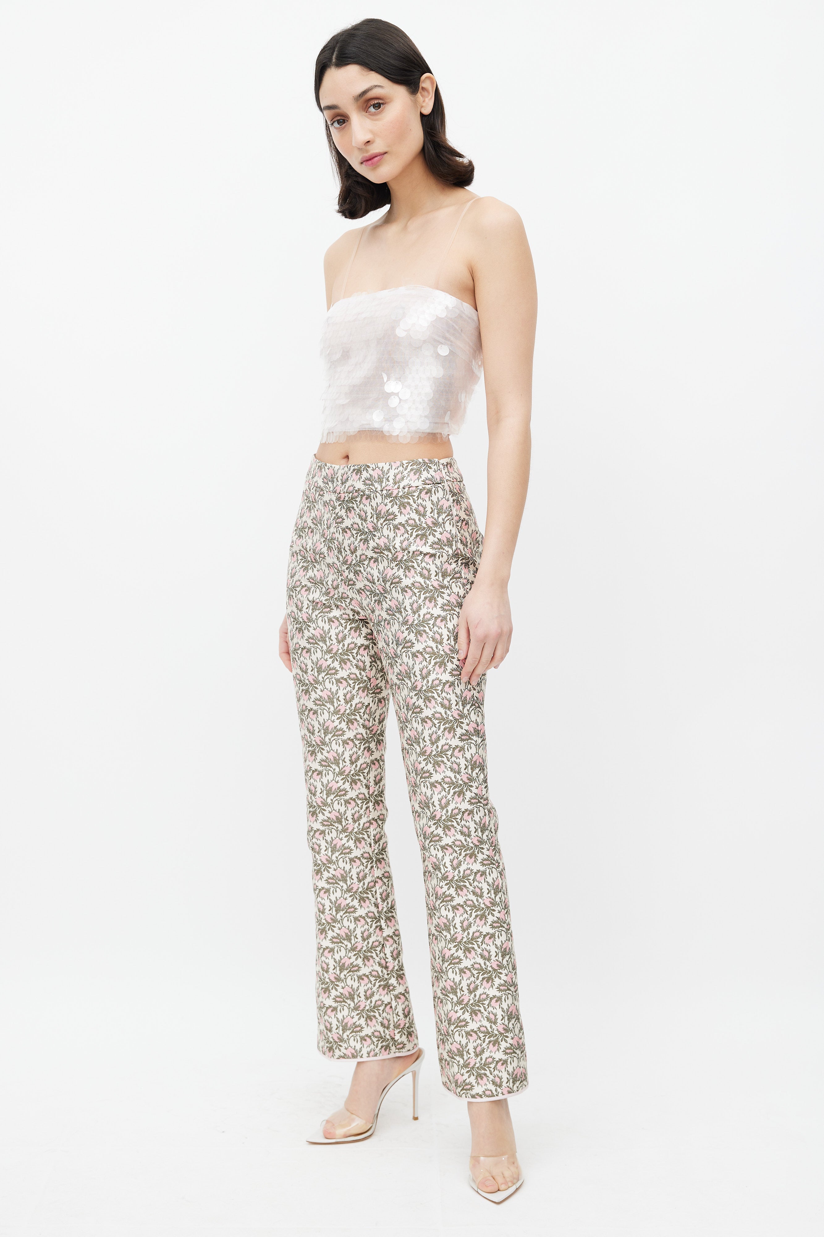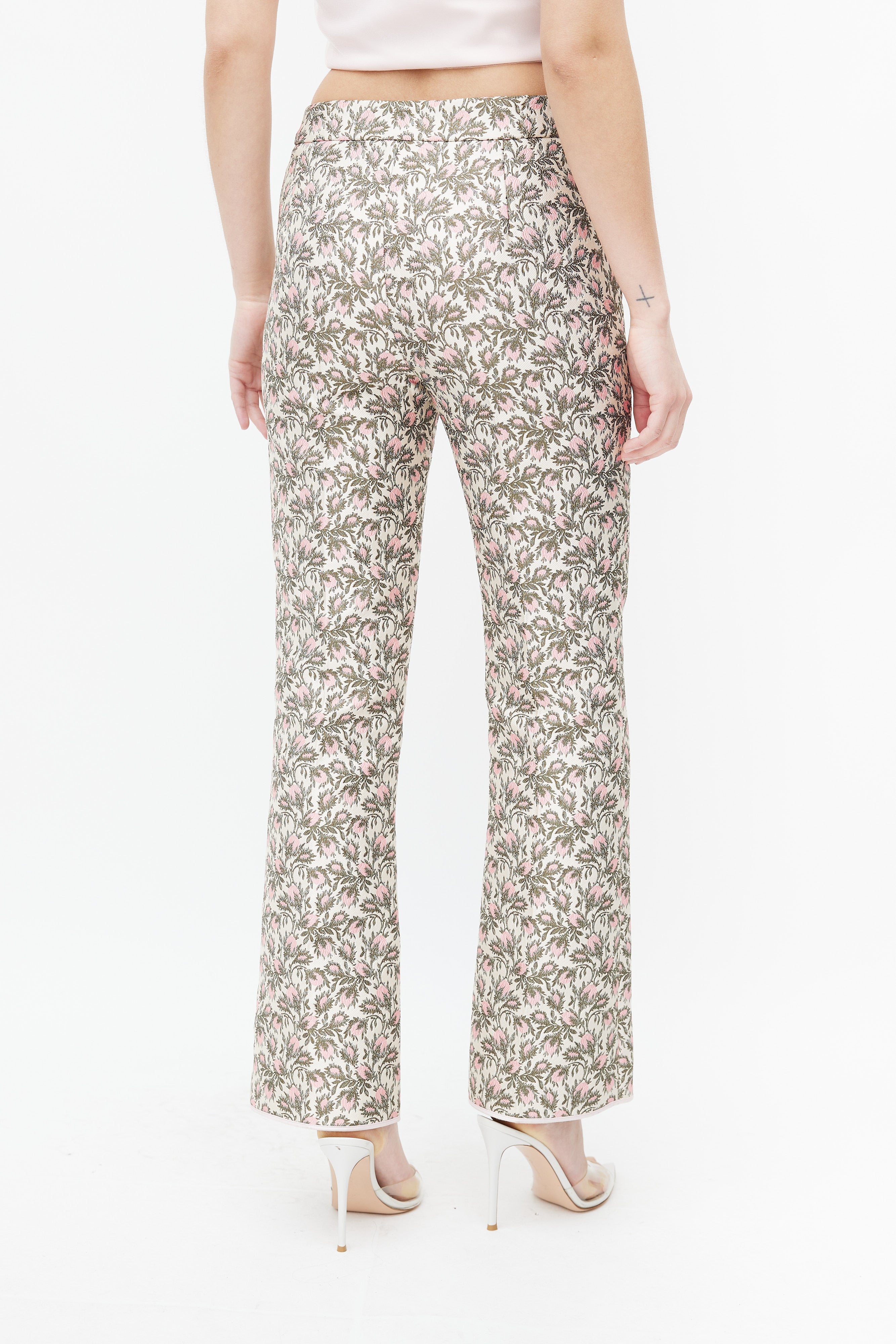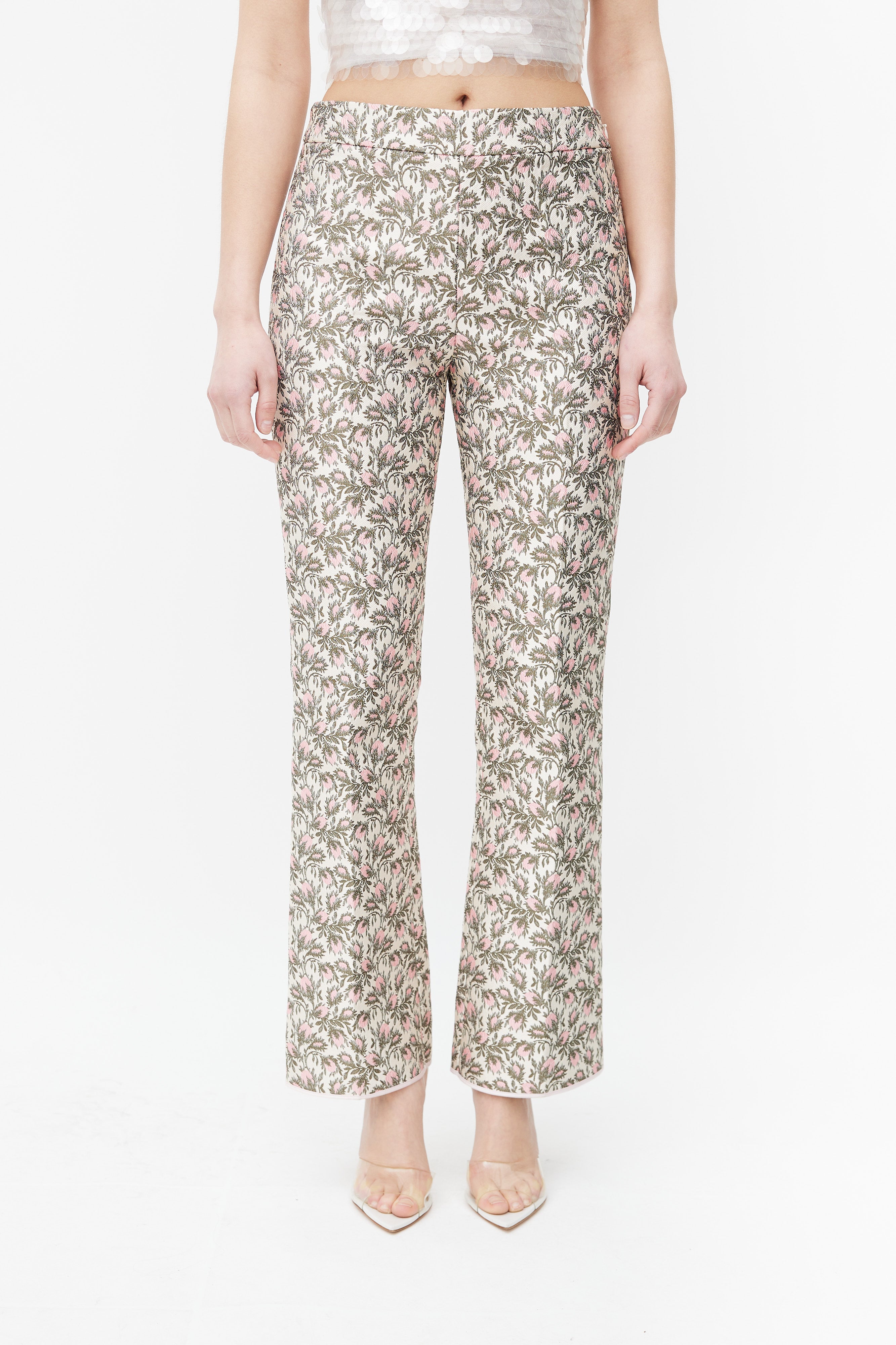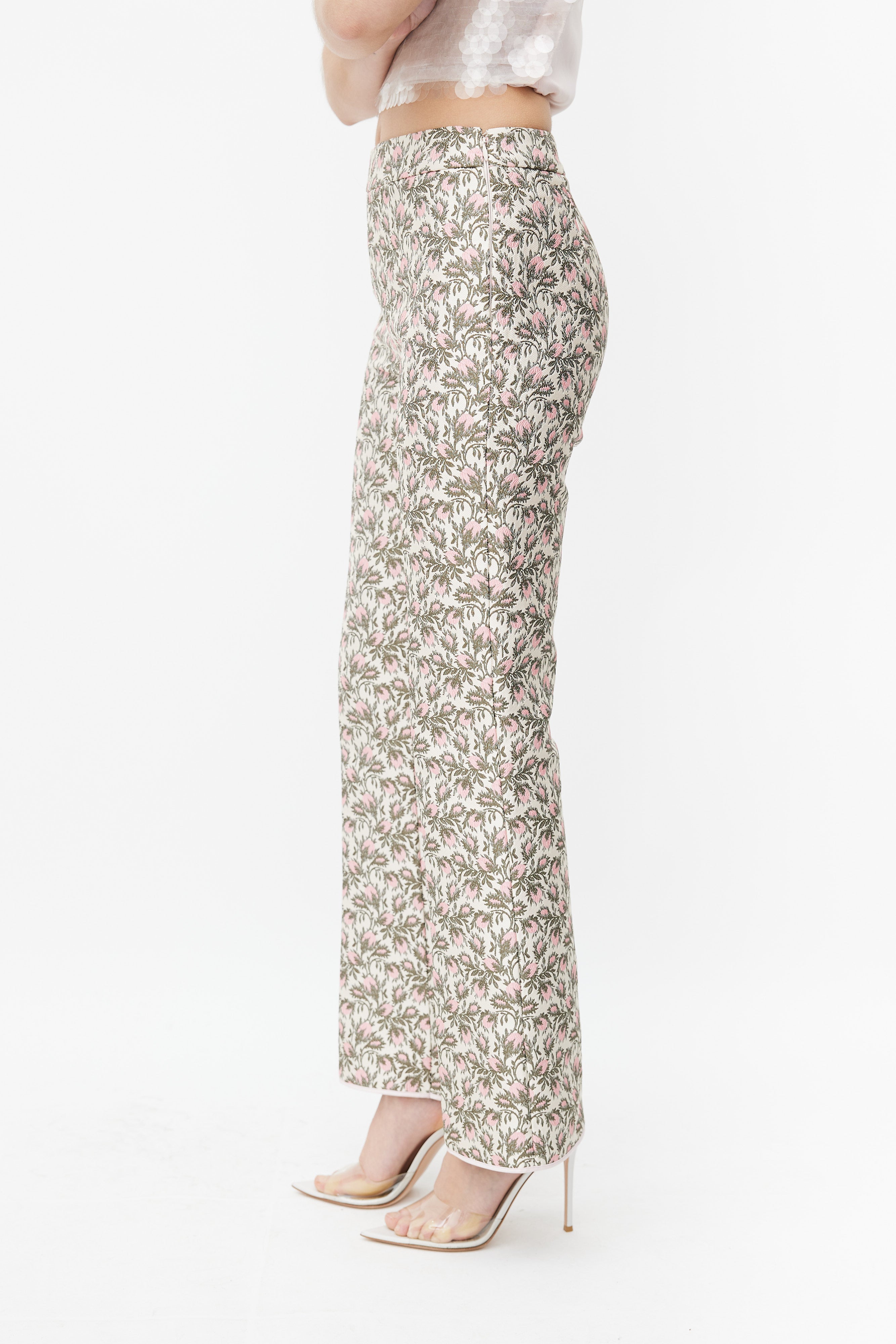 Pre-owned Giambattista Valli trousers featuring a pink and green floral brocade throughout, darting at back waist, flared leg with pink trimming at hem, and concealed side zip with top hook and eye fastener.