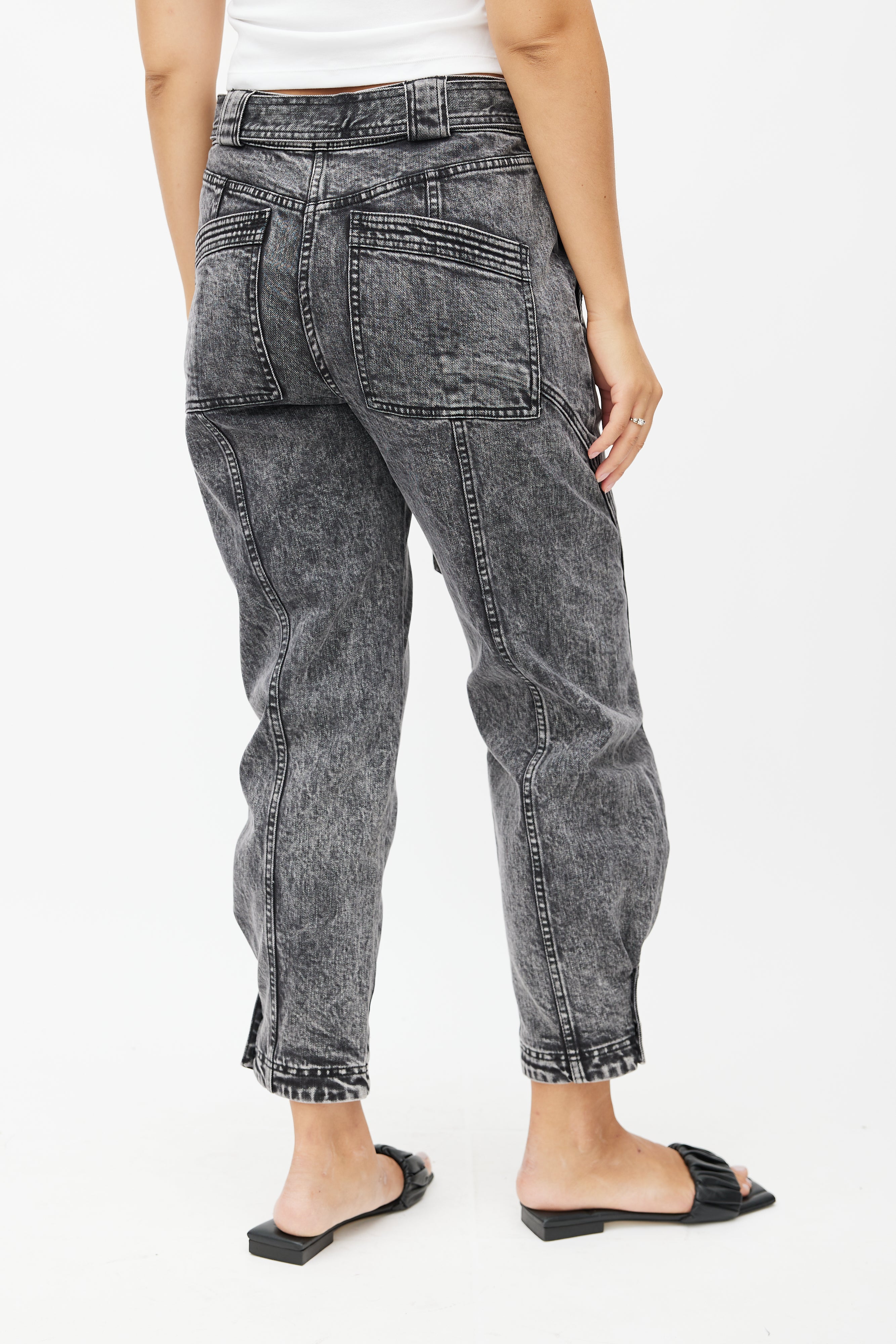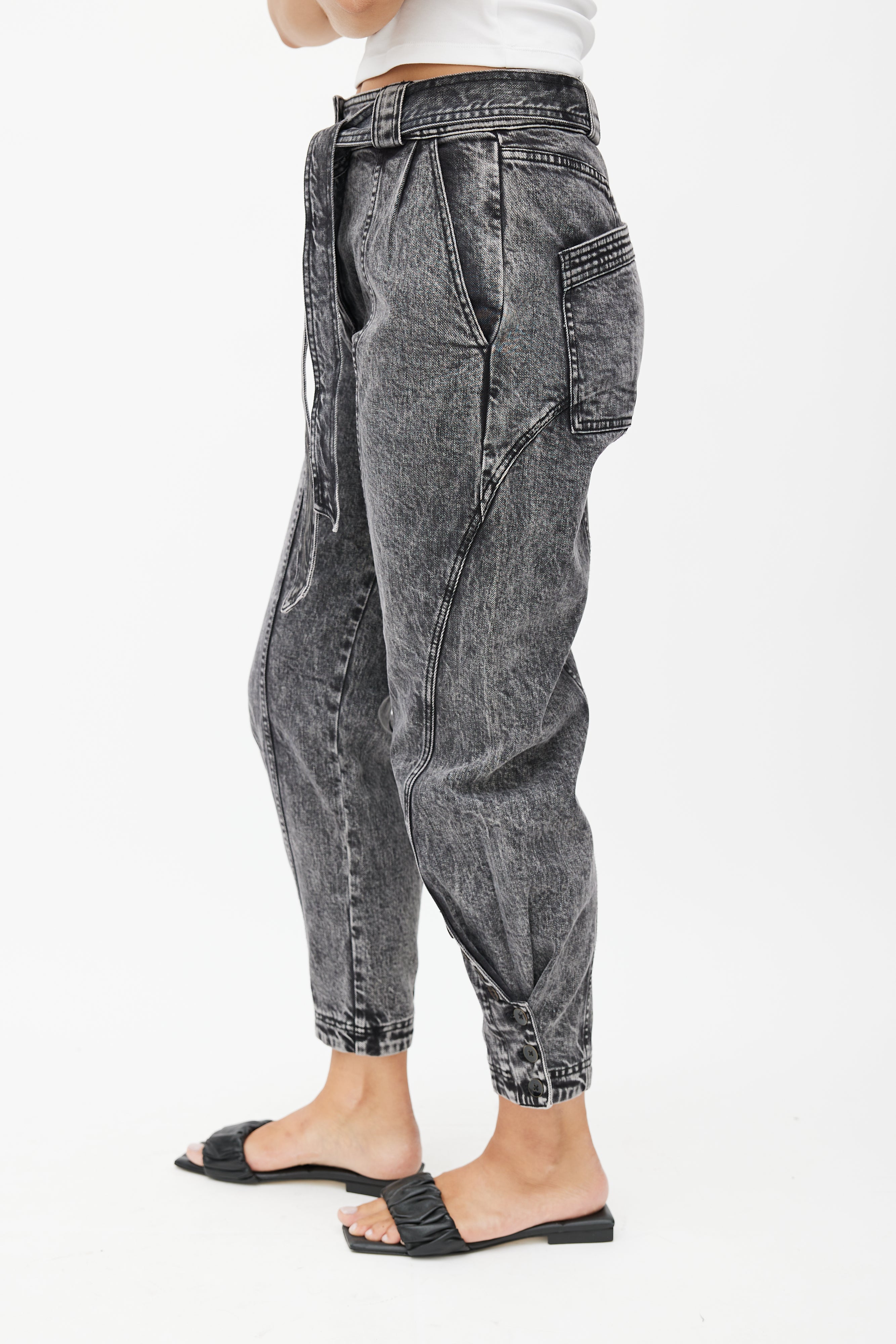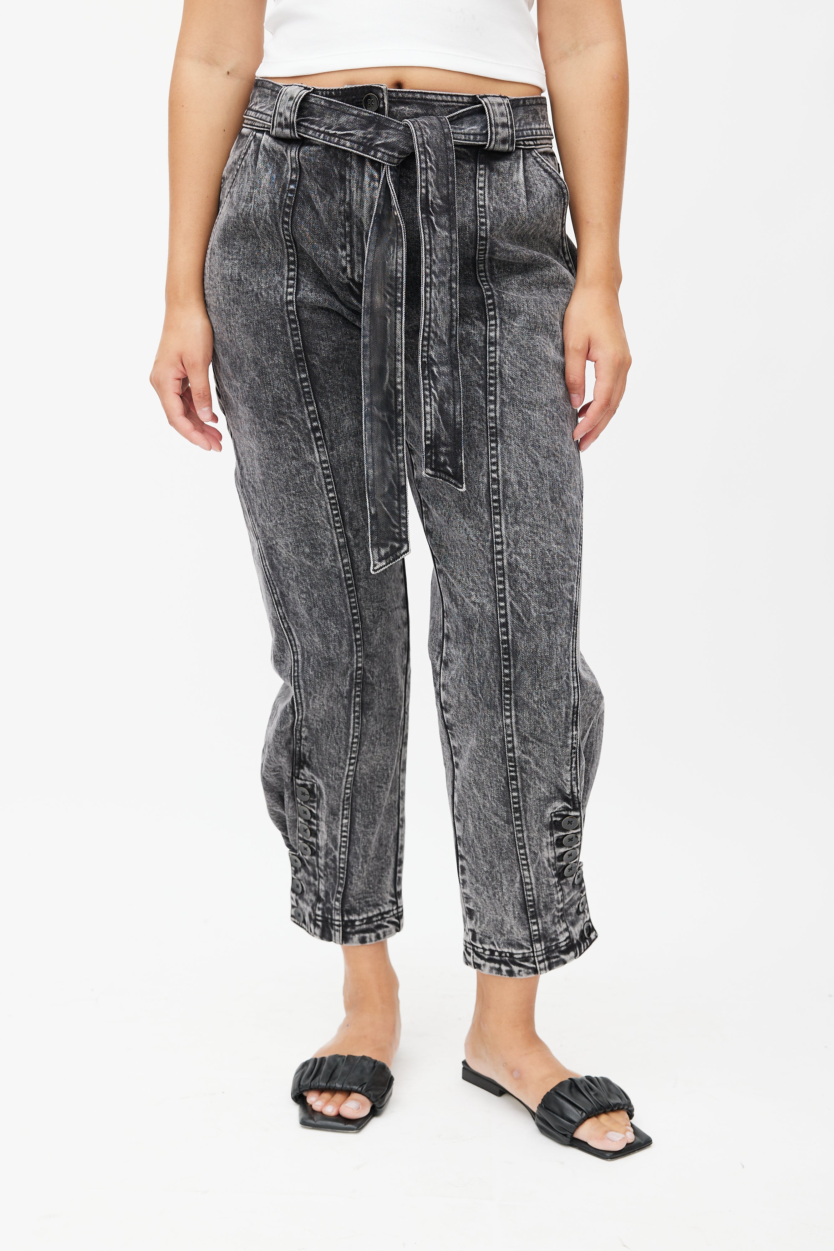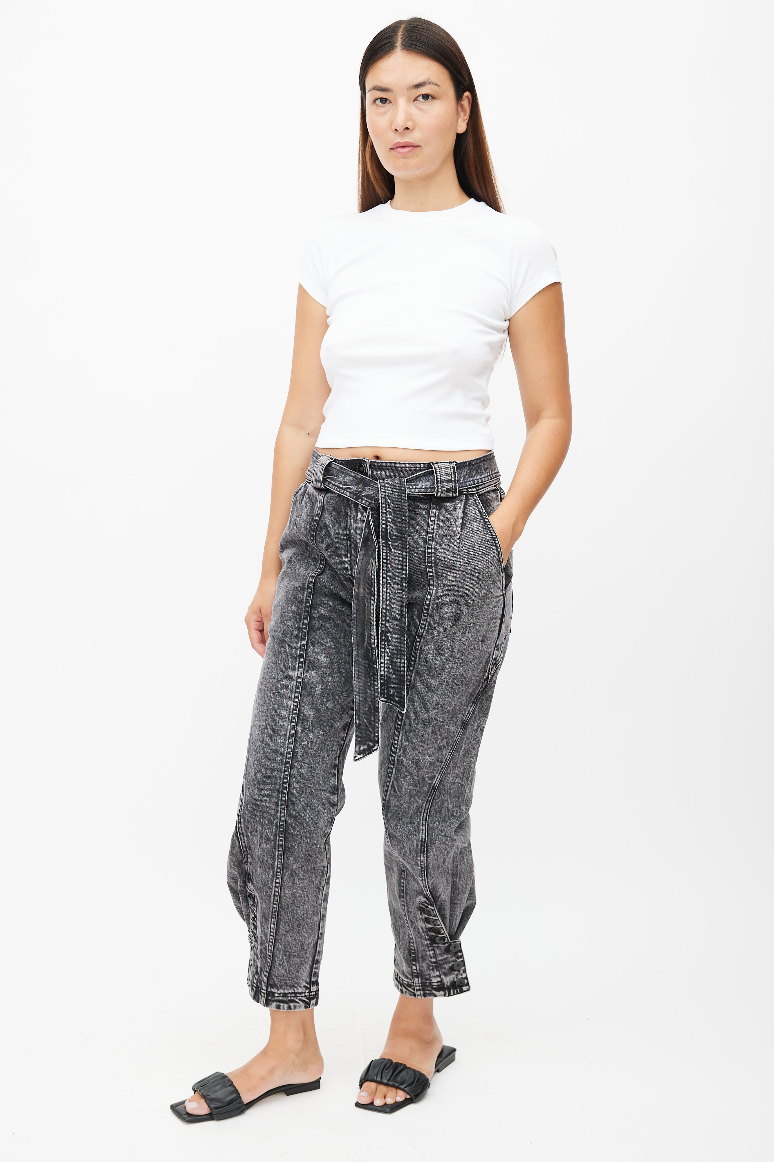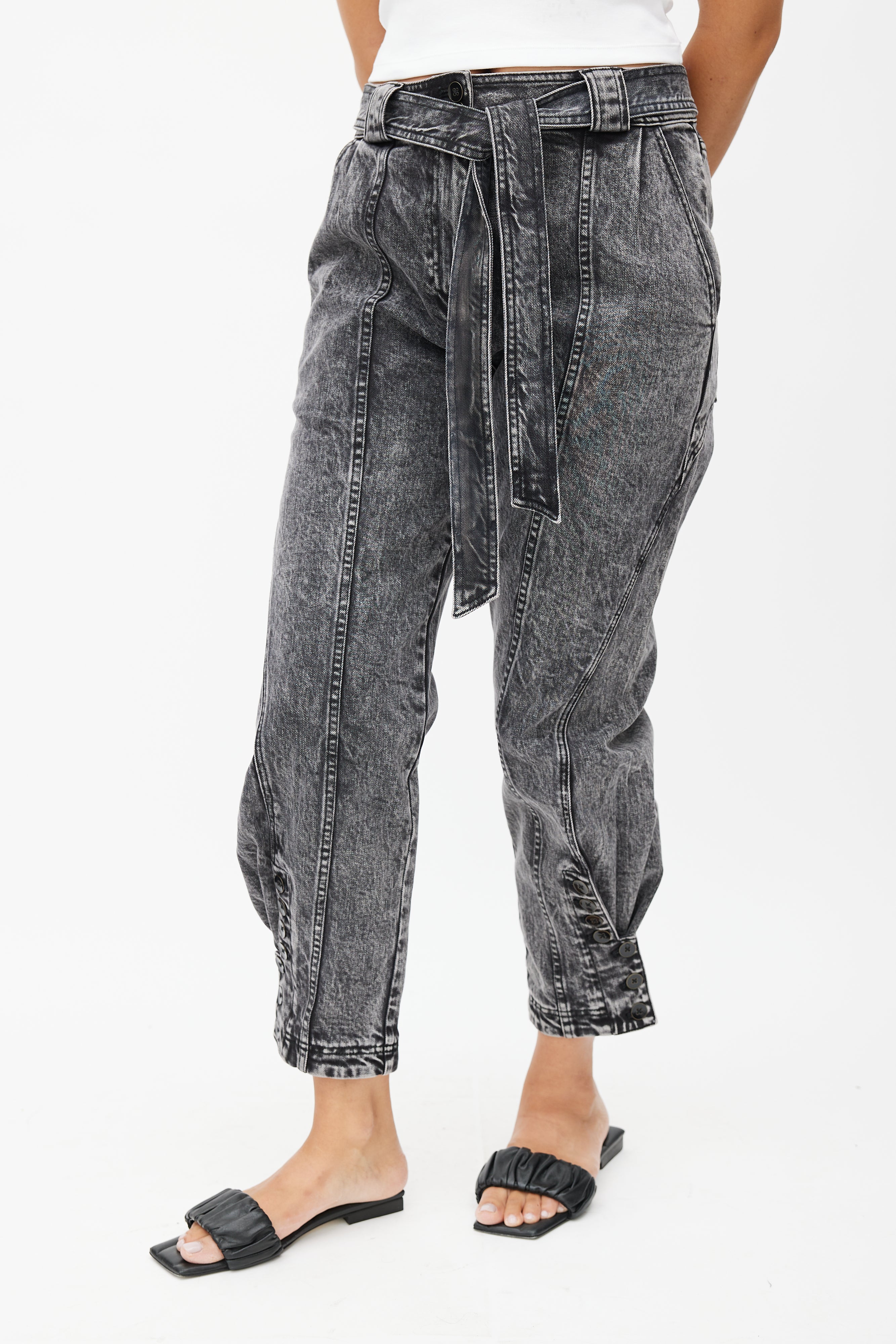 Ulla Johnson black stonewash denim trousers featuring two slip pockets at hip, two patch pockets at back, centre seam, tapered leg, buttoned detail at hem, tie belt at waist, and zip fly with button closure.