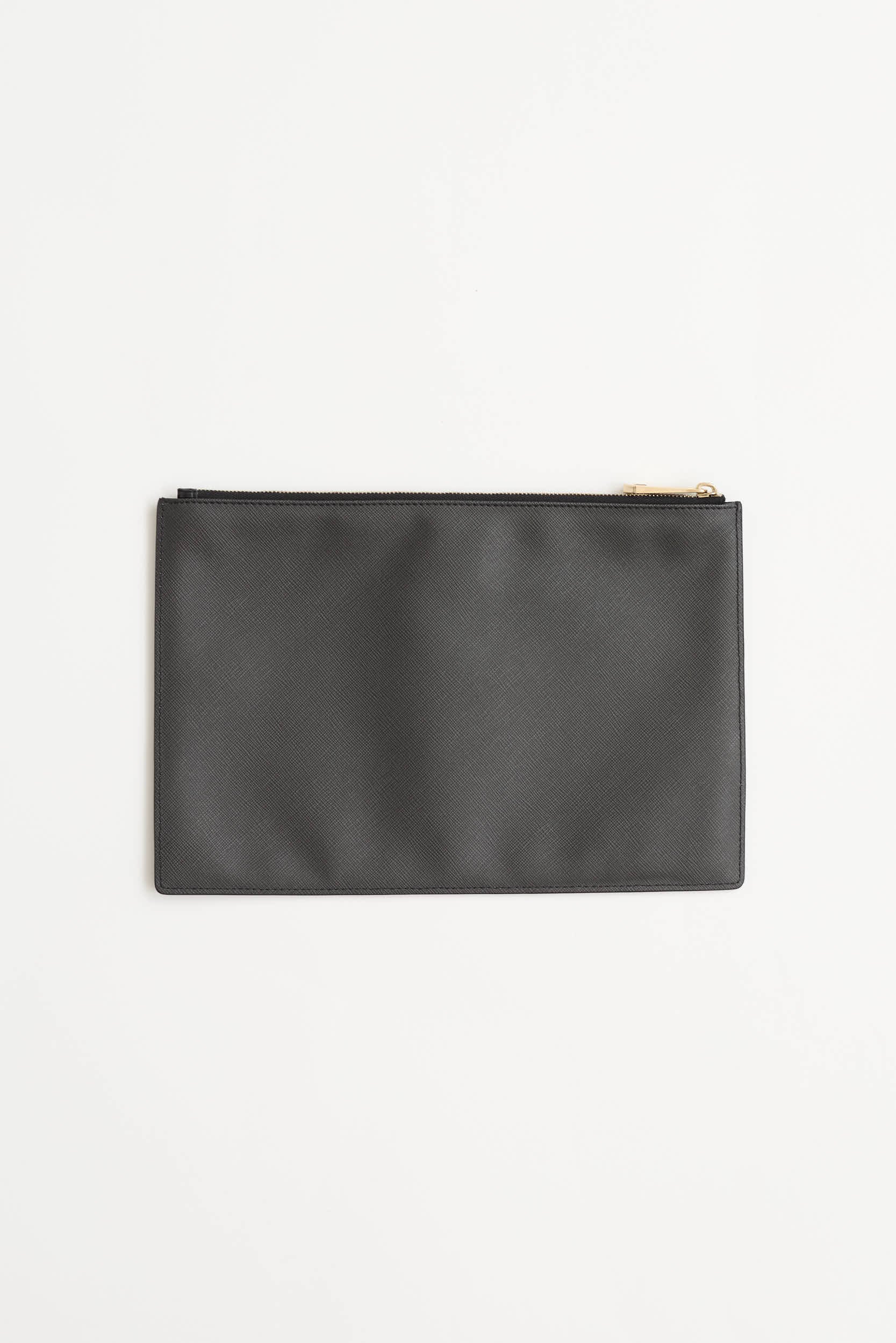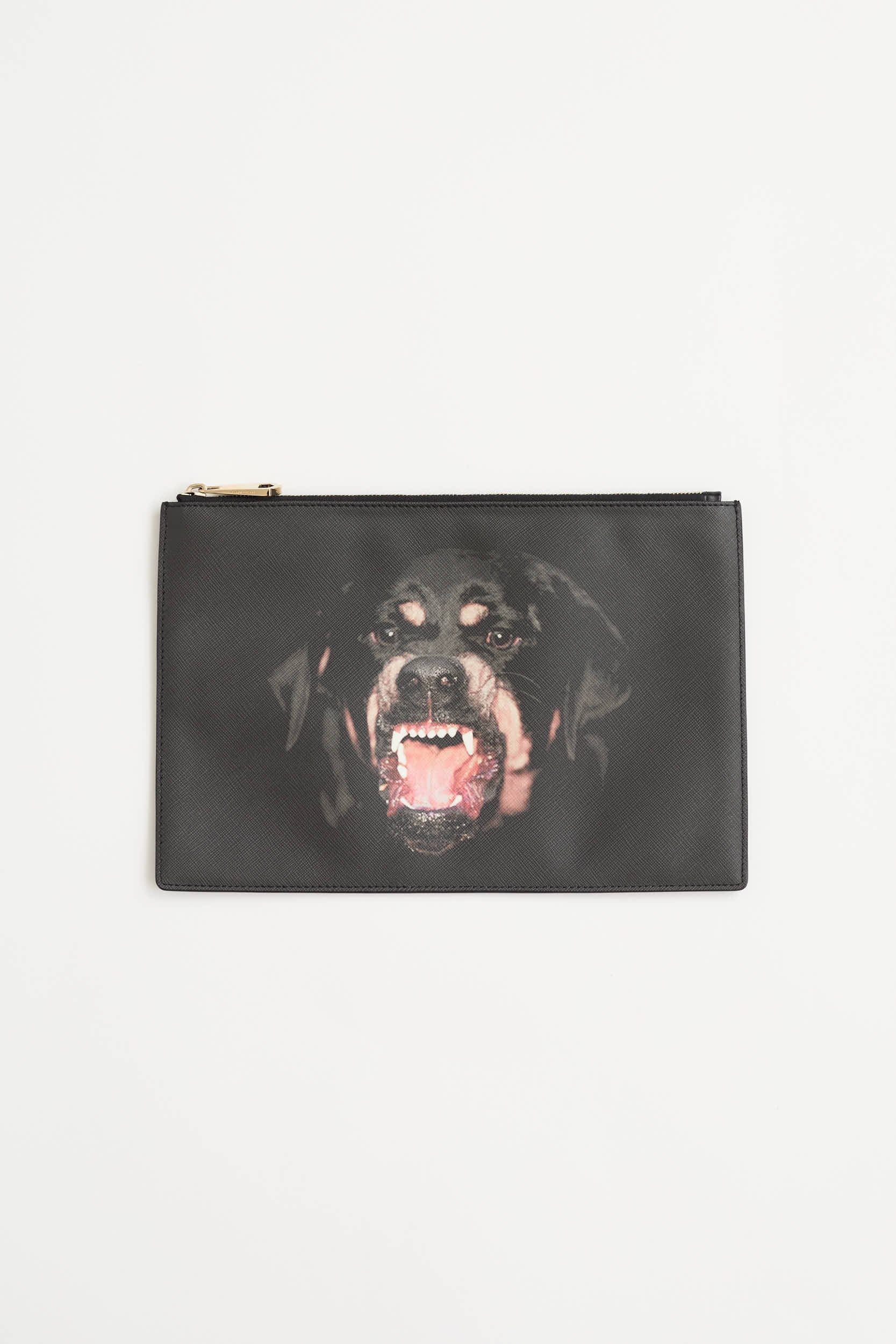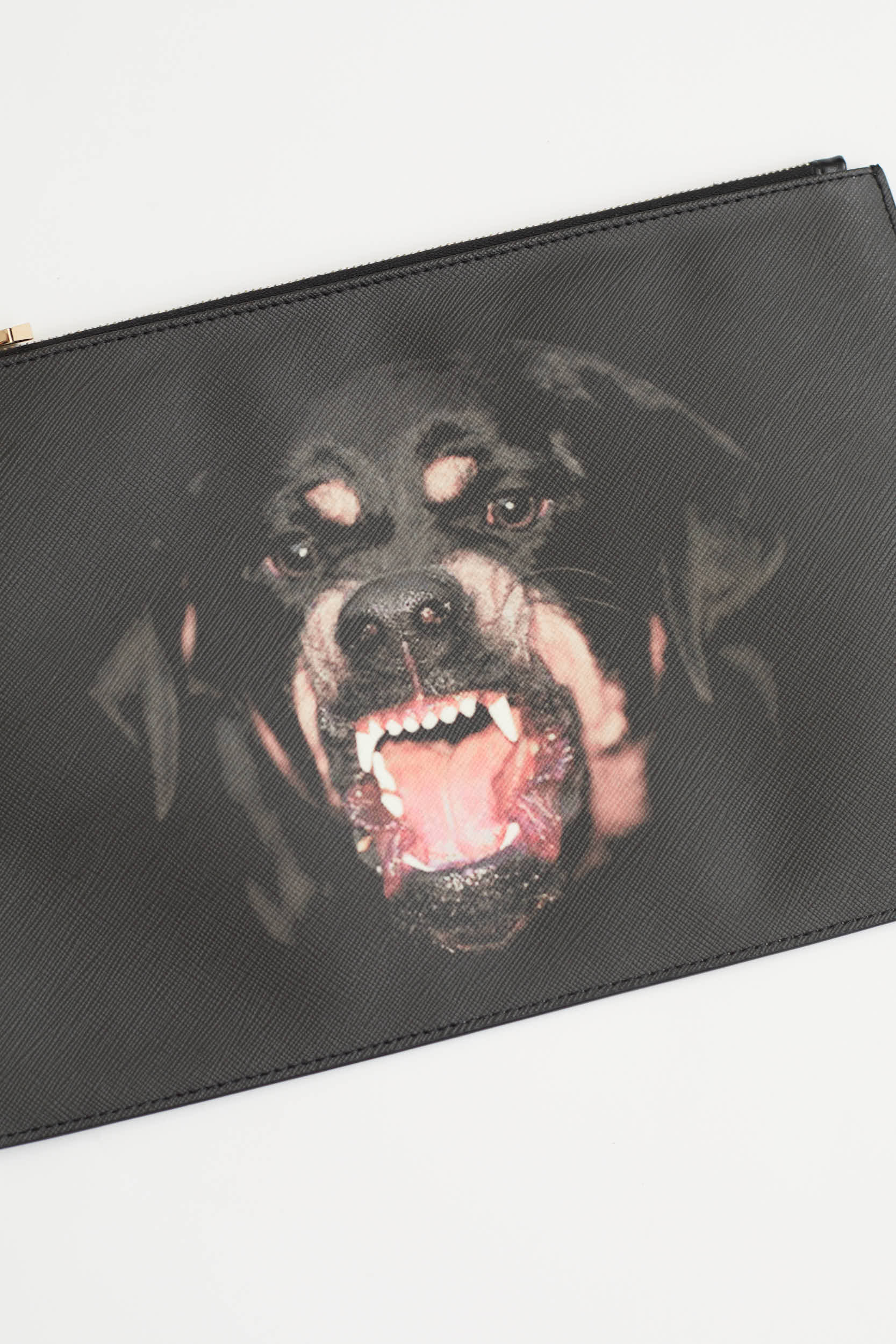Pre-owned Givenchy black coated canvas pouch featuring a multicolour Rottweiler graphic at face, one main compartment, and top zip closure.