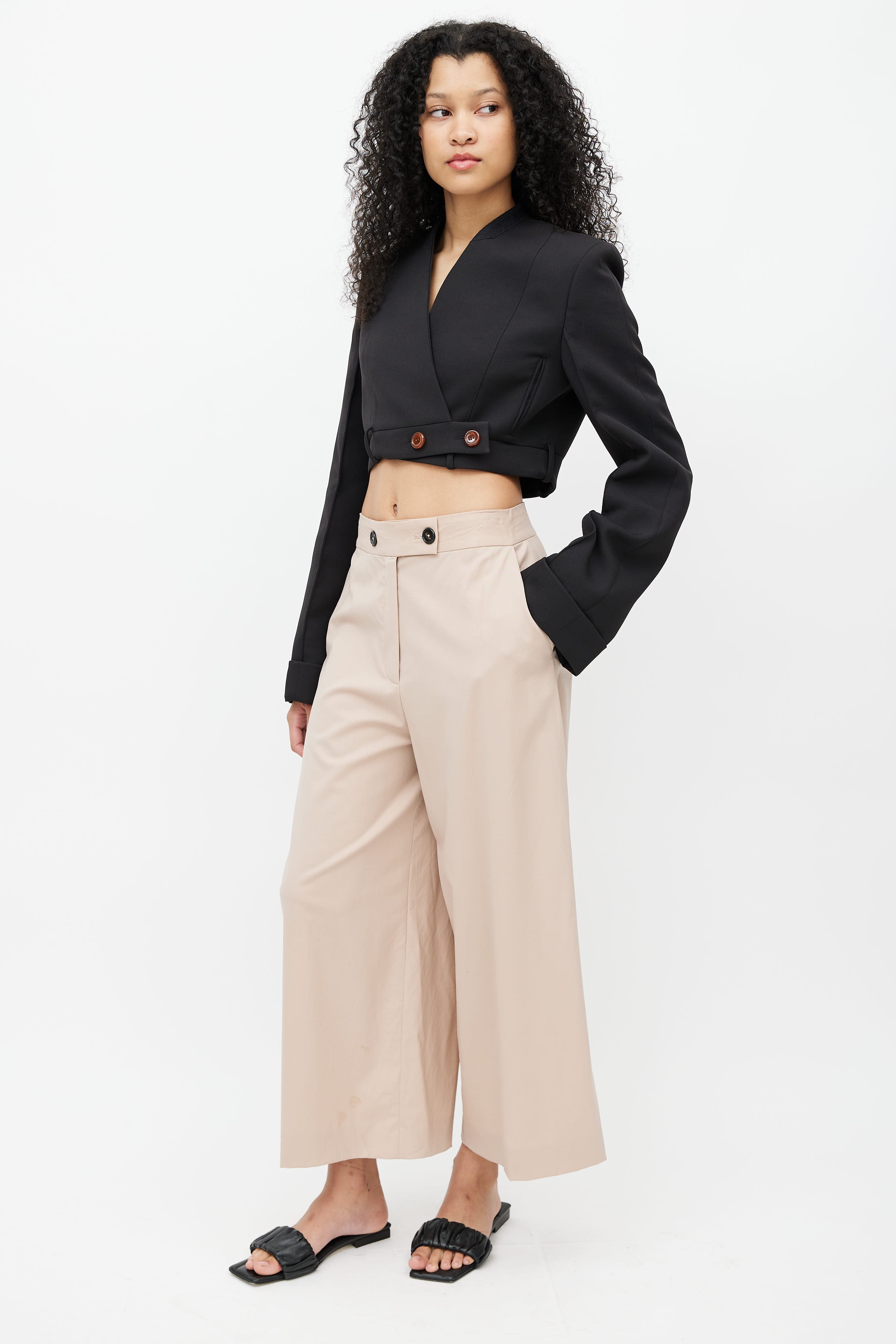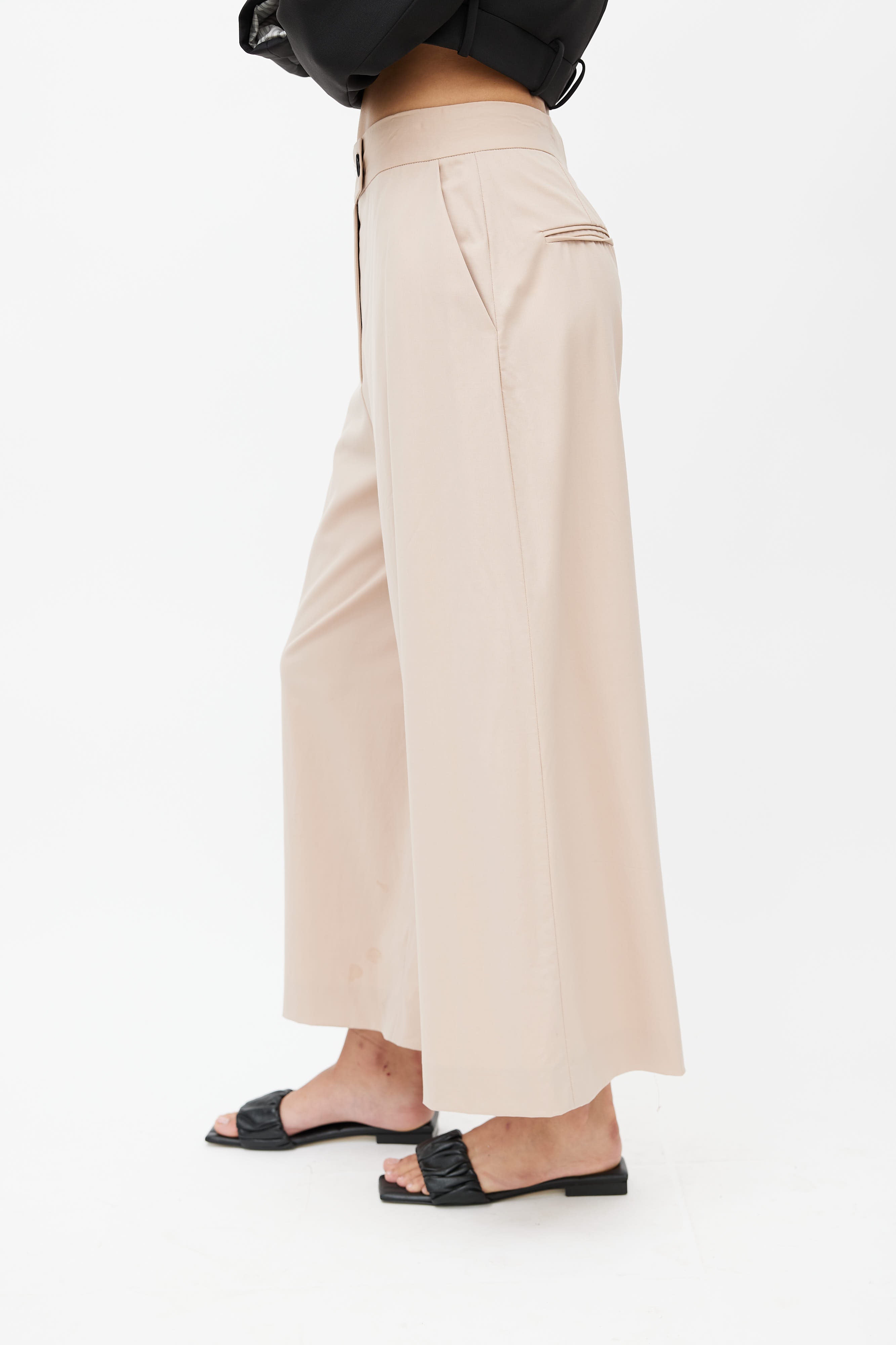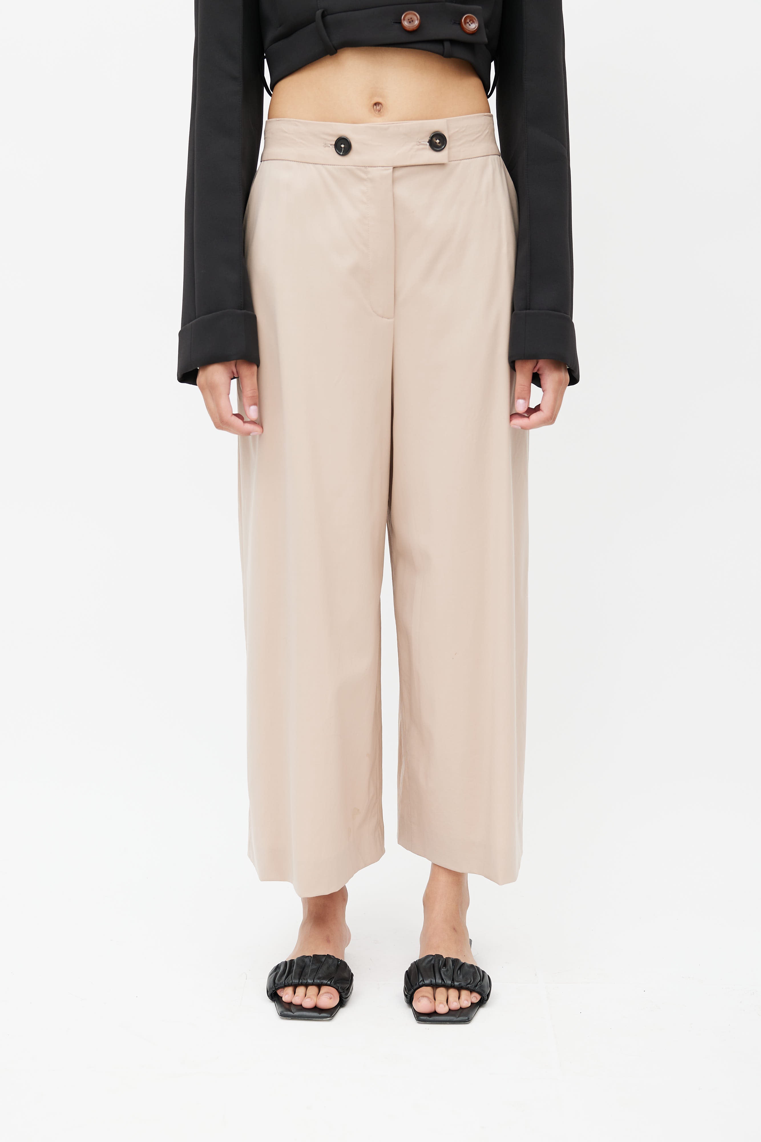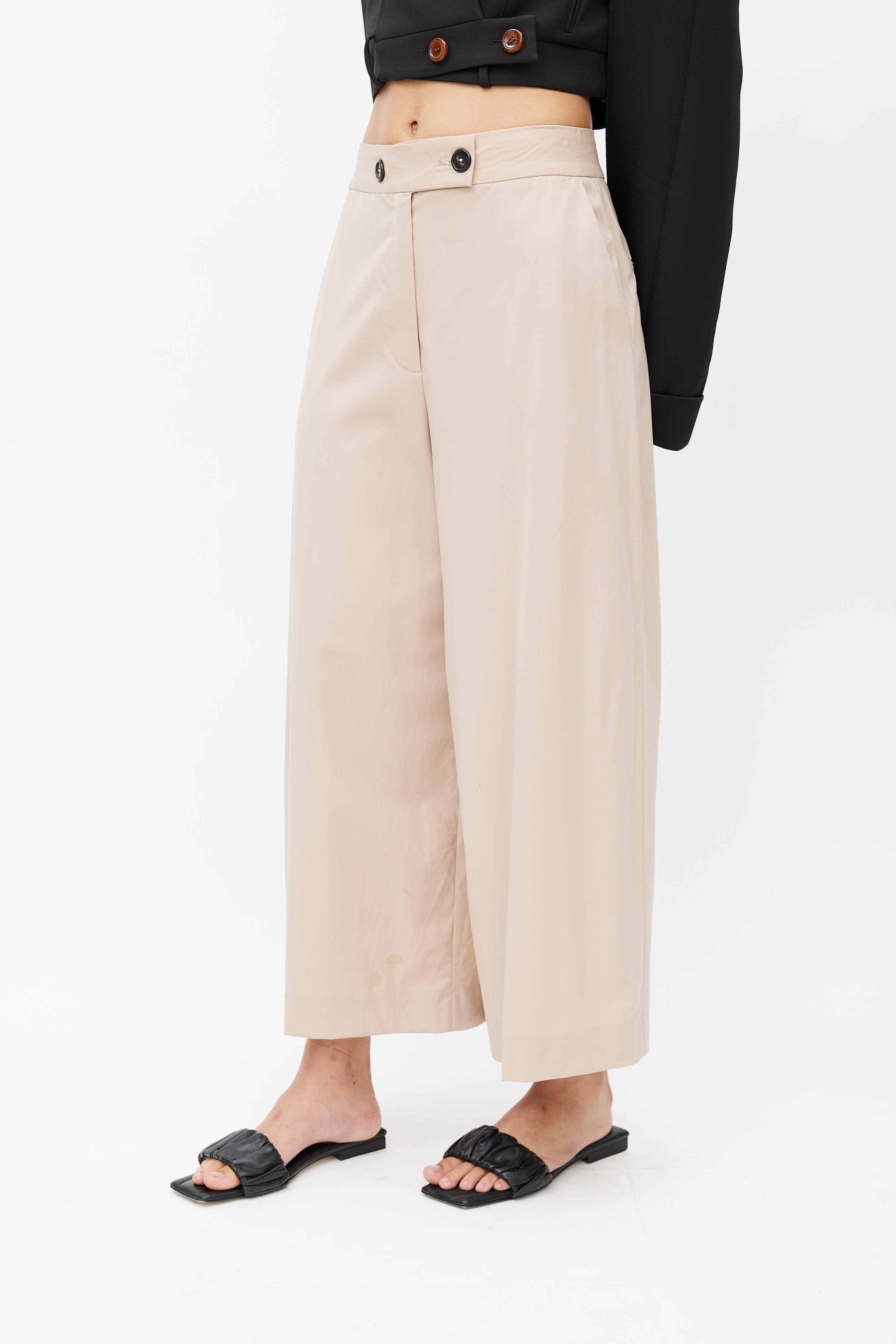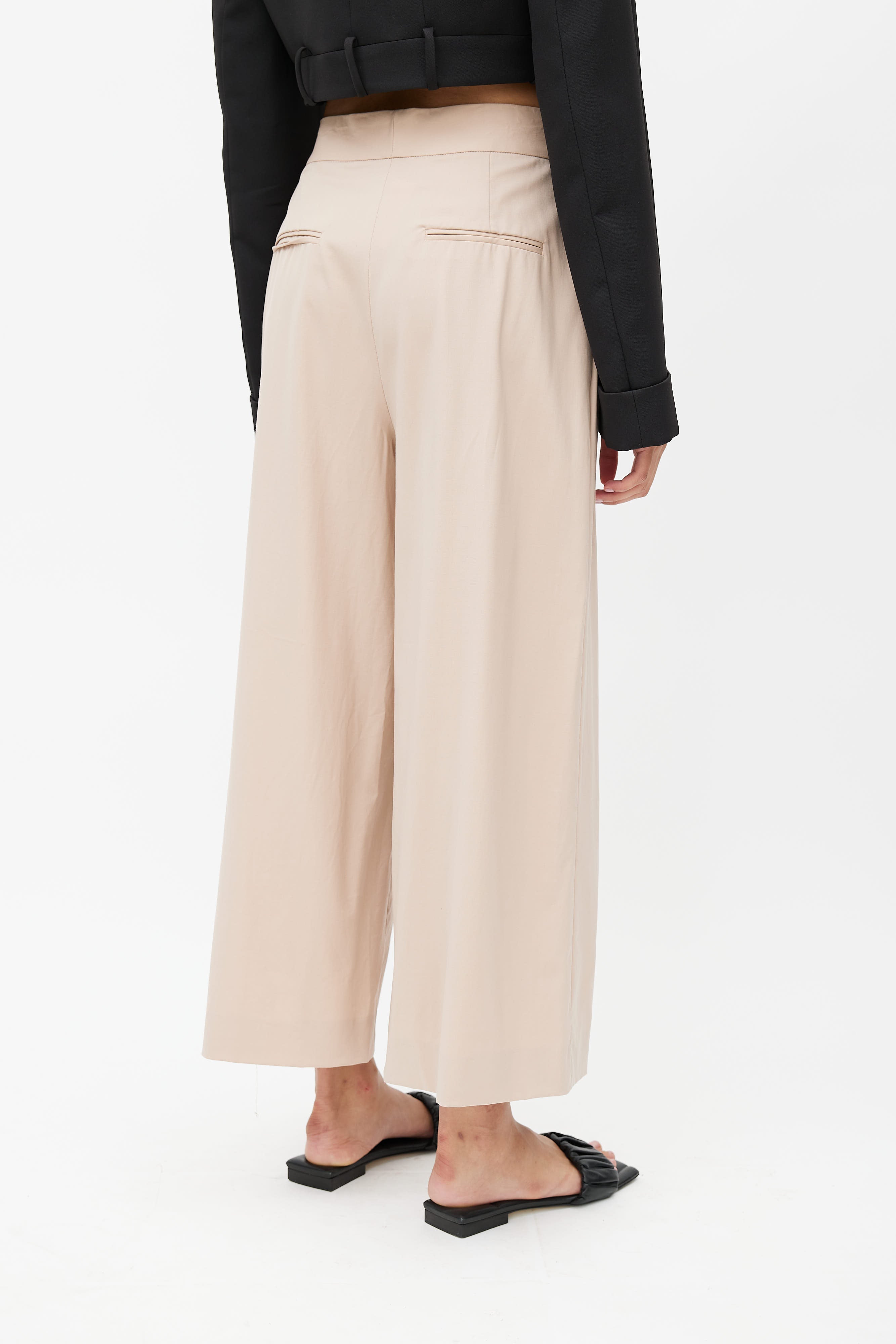 Pre-owned Proenza Schouler beige wide leg trouser featuring two buttons fastening, zip fly, two slash pockets at front, and two welt pockets at back.