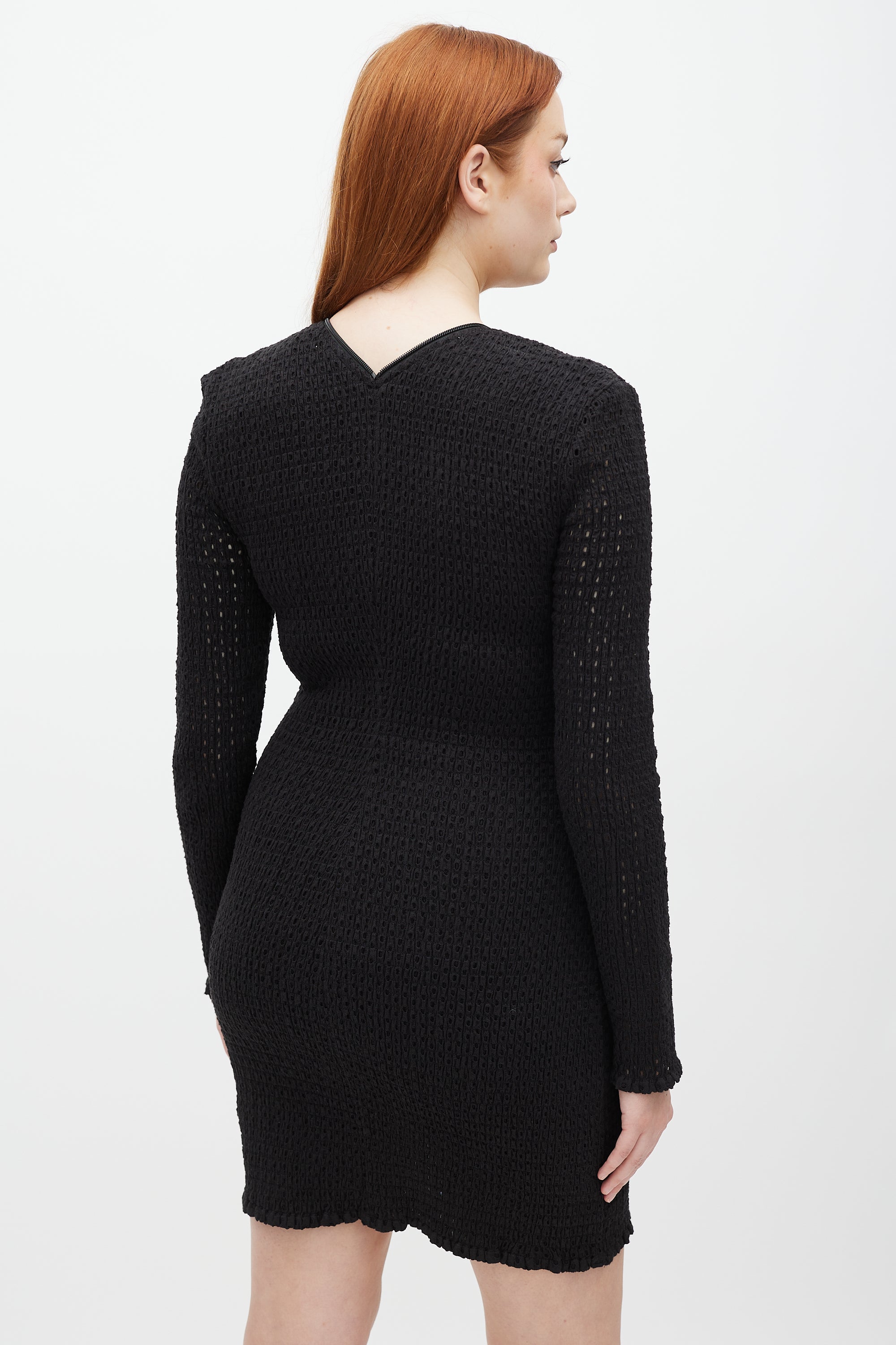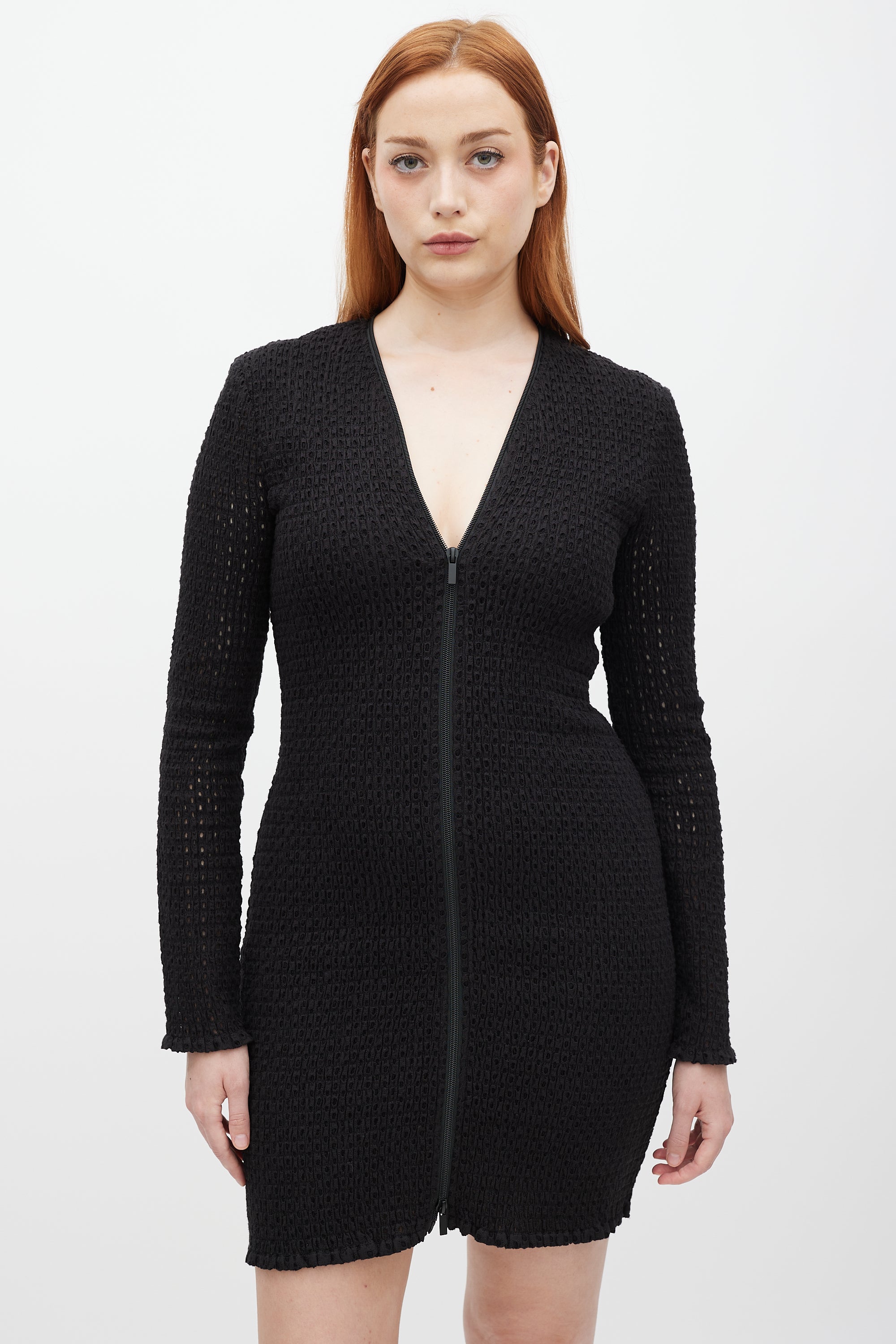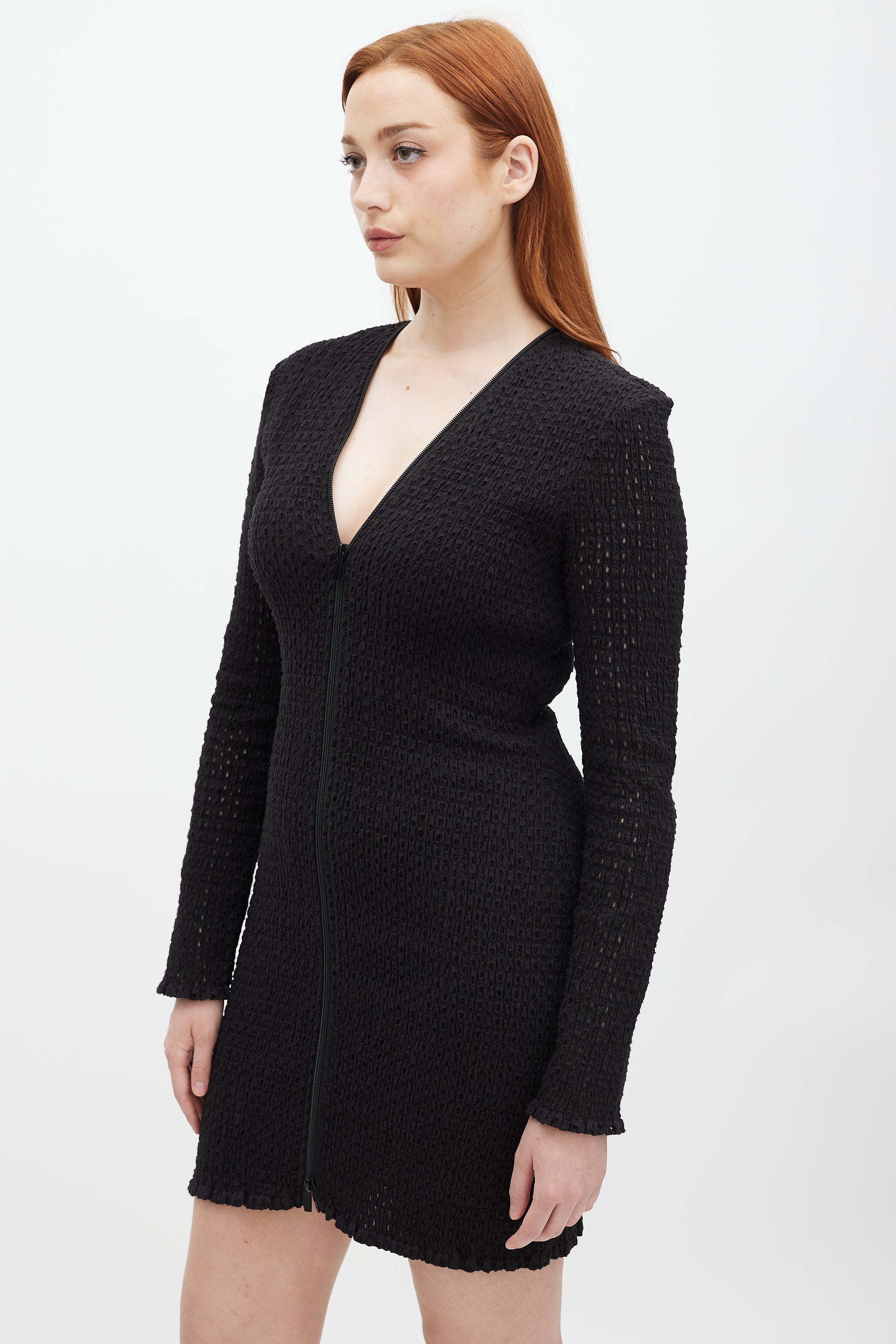 Pre-owned Proenza Schouler White Label black Broderie Anglaise mini dress featuring a V-neckline, smocking and eyelets throughout, full centre front double zip, and long sleeves.