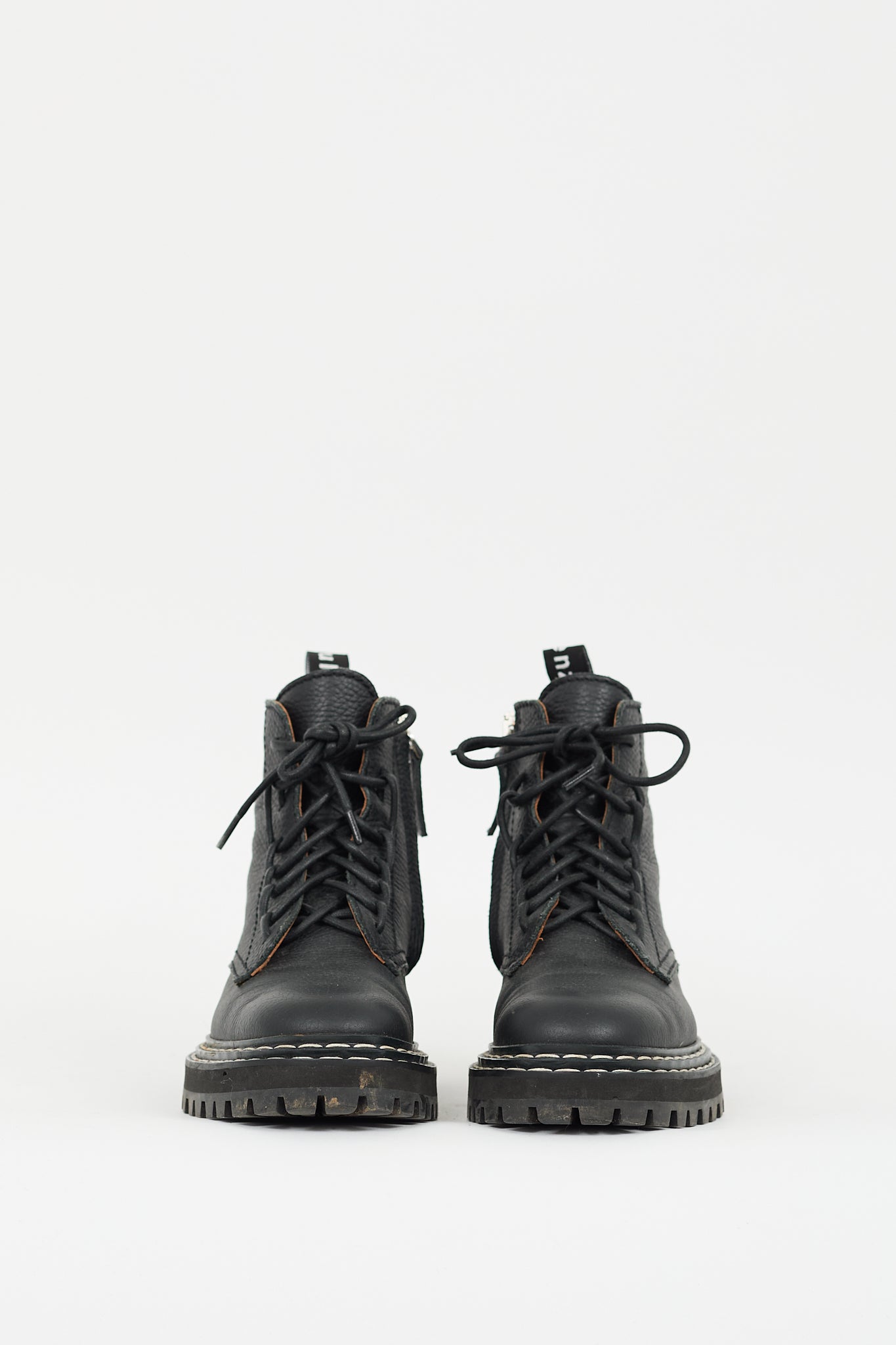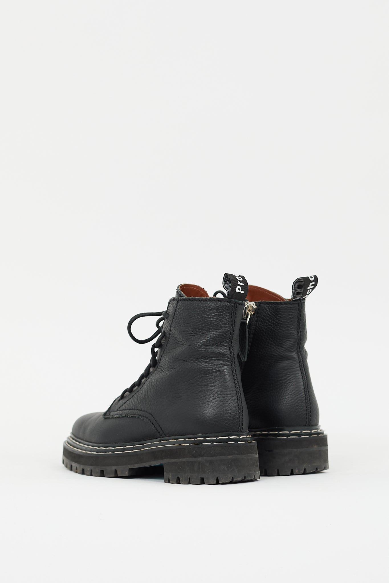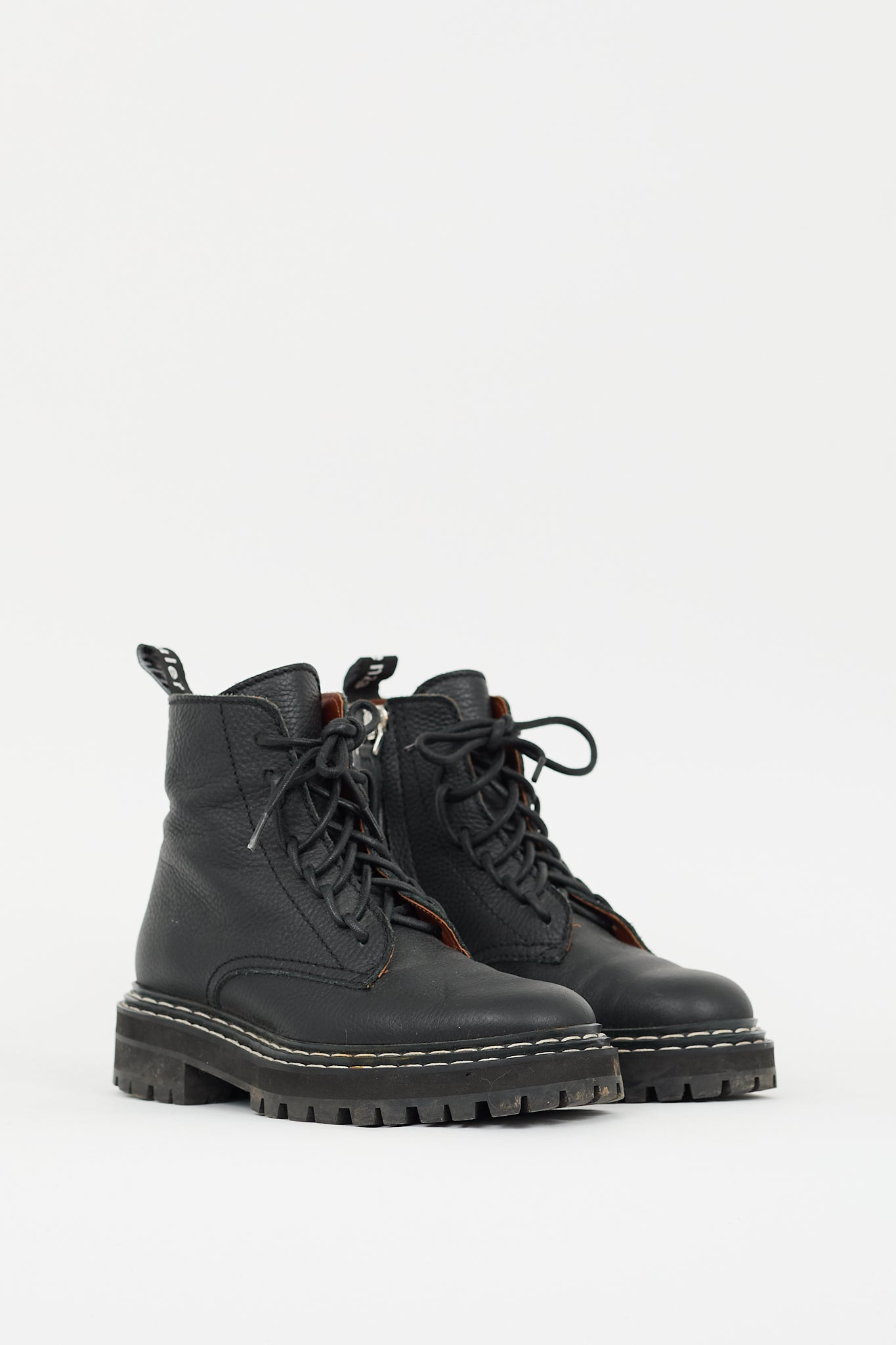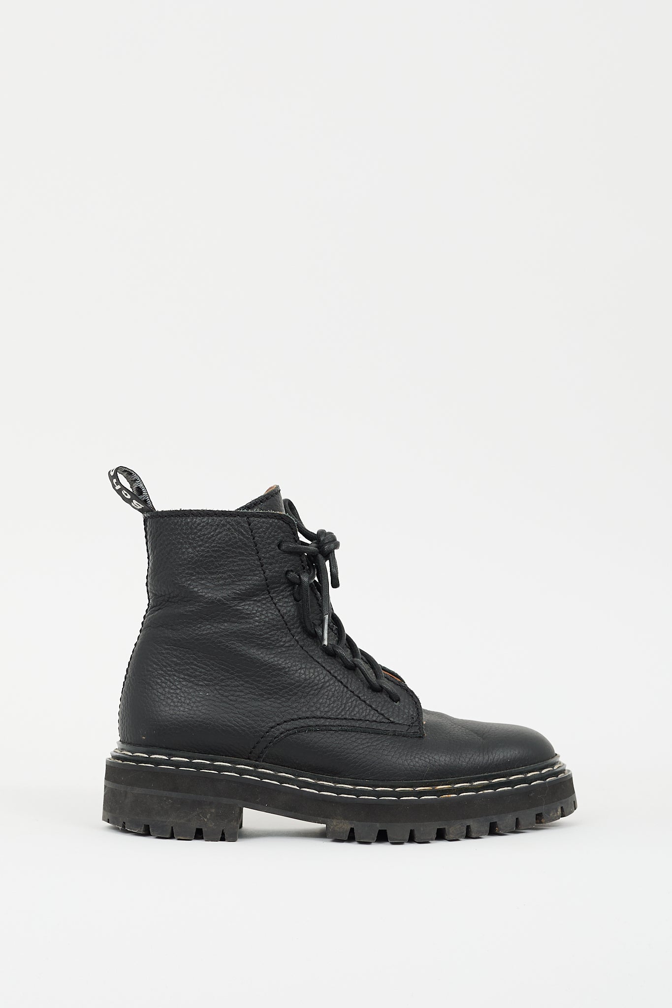 Pre-owned Proenza Schouler black leather combat boots featuring rounded toe, lace up front, inner side zip closure, pull tab at back, and rubber lug sole.