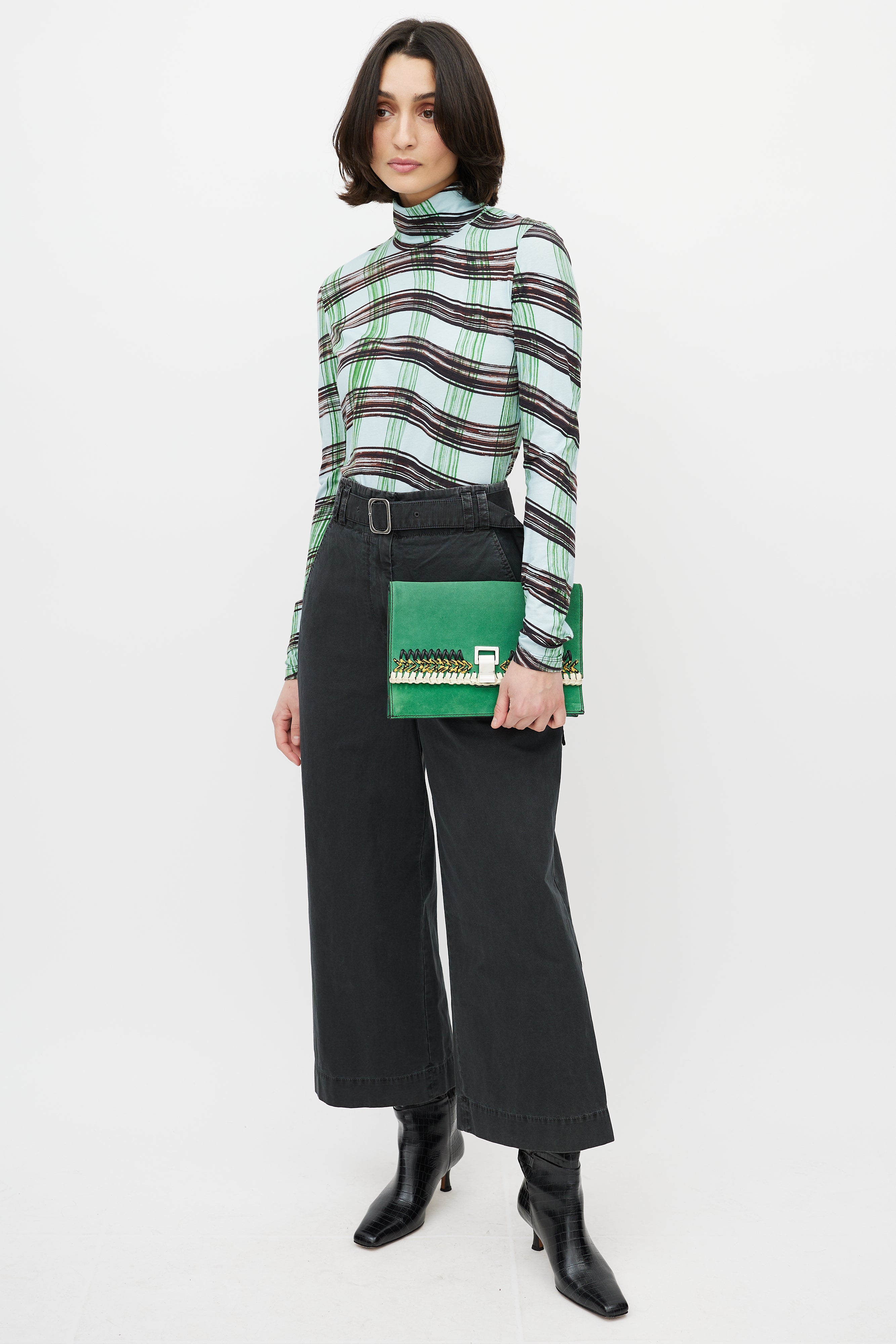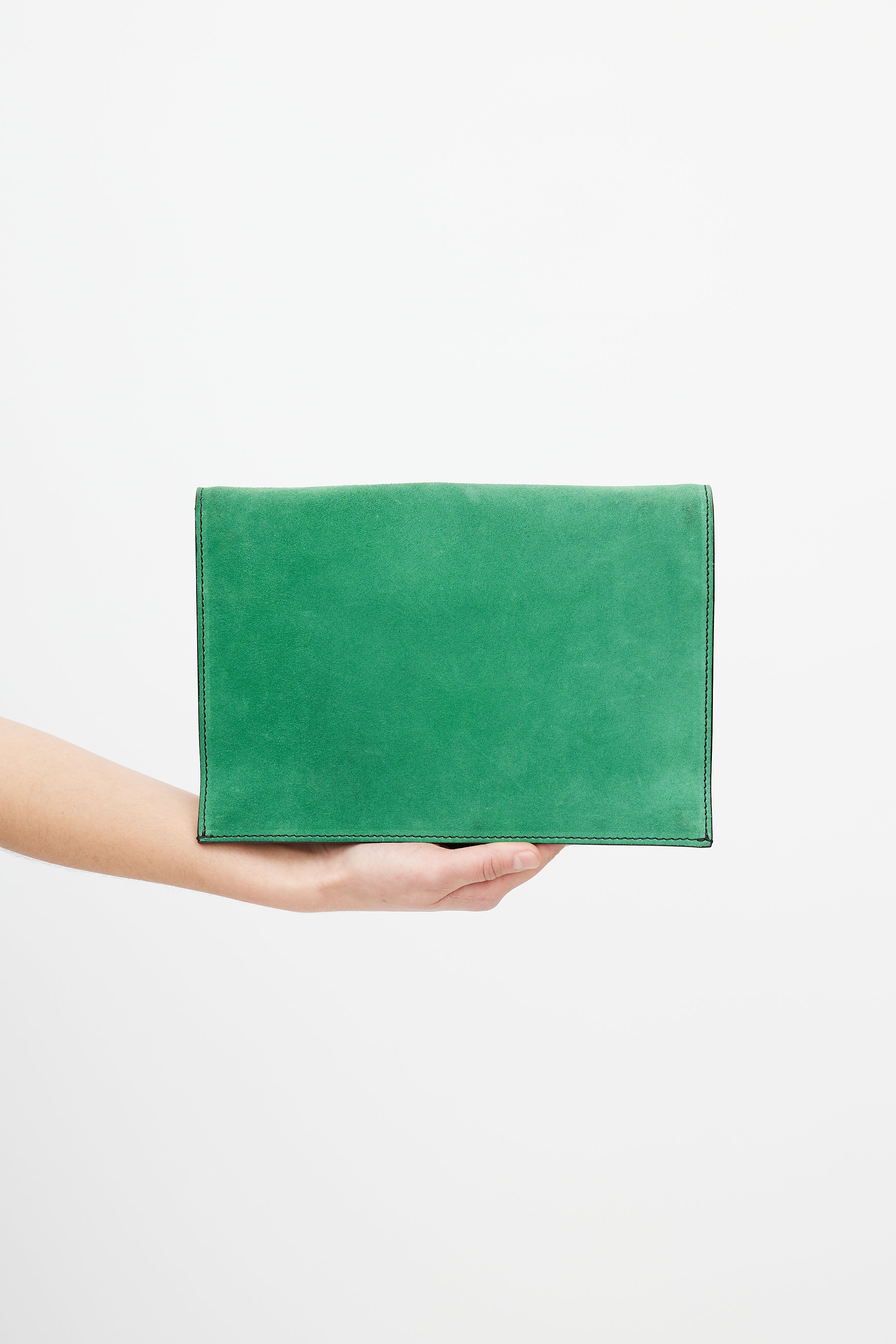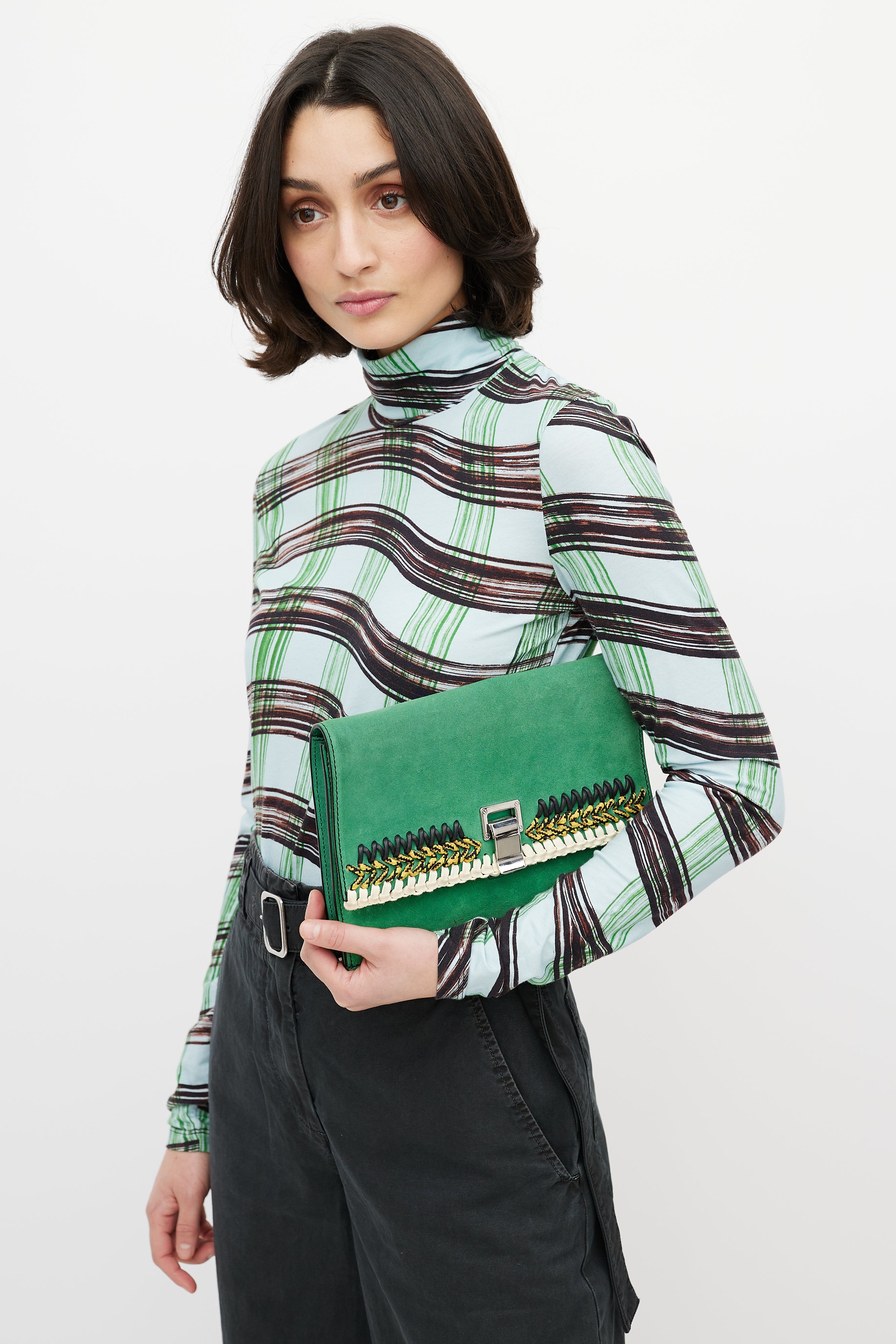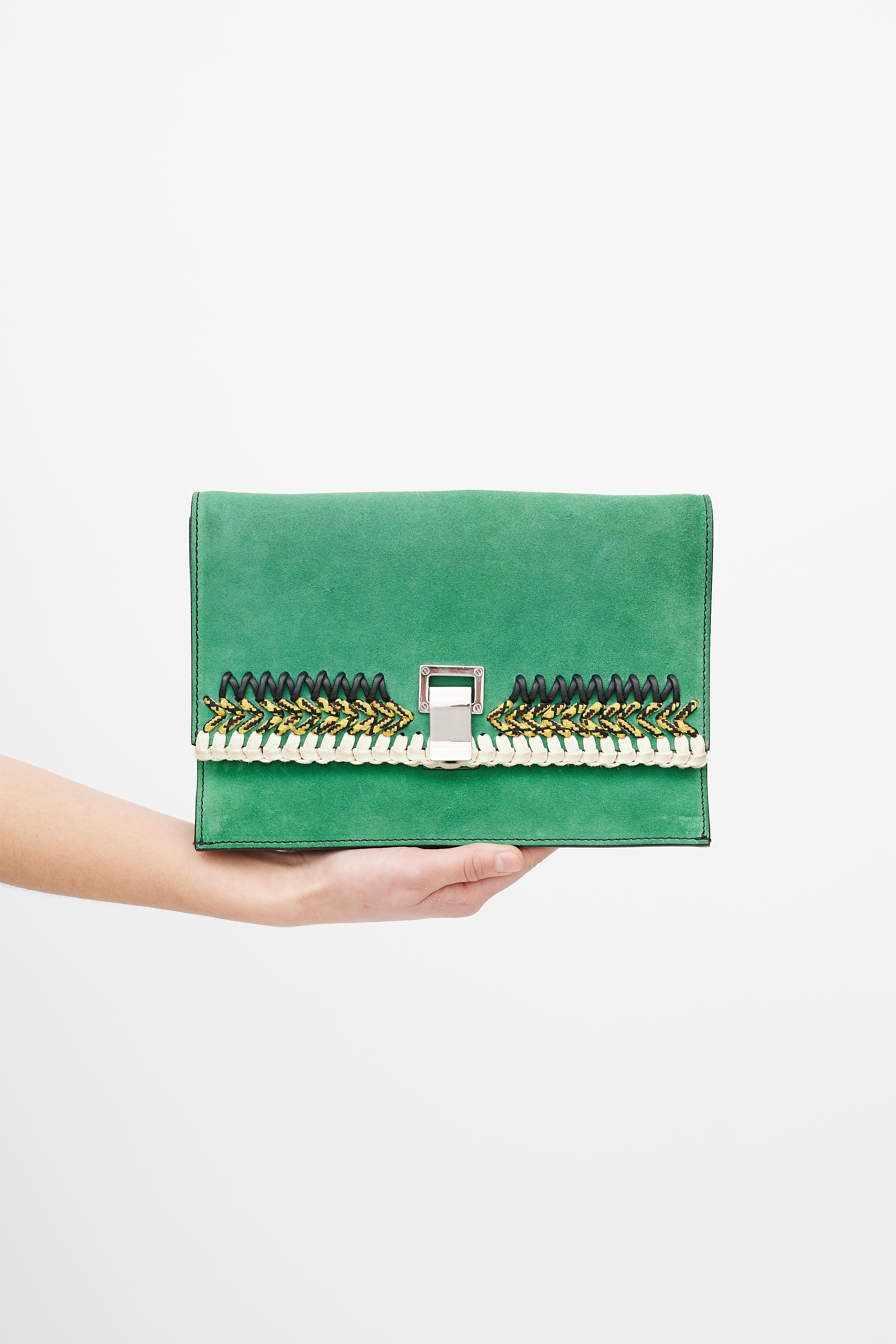 Pre-owned Proenza Schouler green suede clutch featuring multicolour crochet trim, silver tone clasp closure, detachable and adjustable shoulder strap, leather lining, and one card slot. Comes with a dust bag.