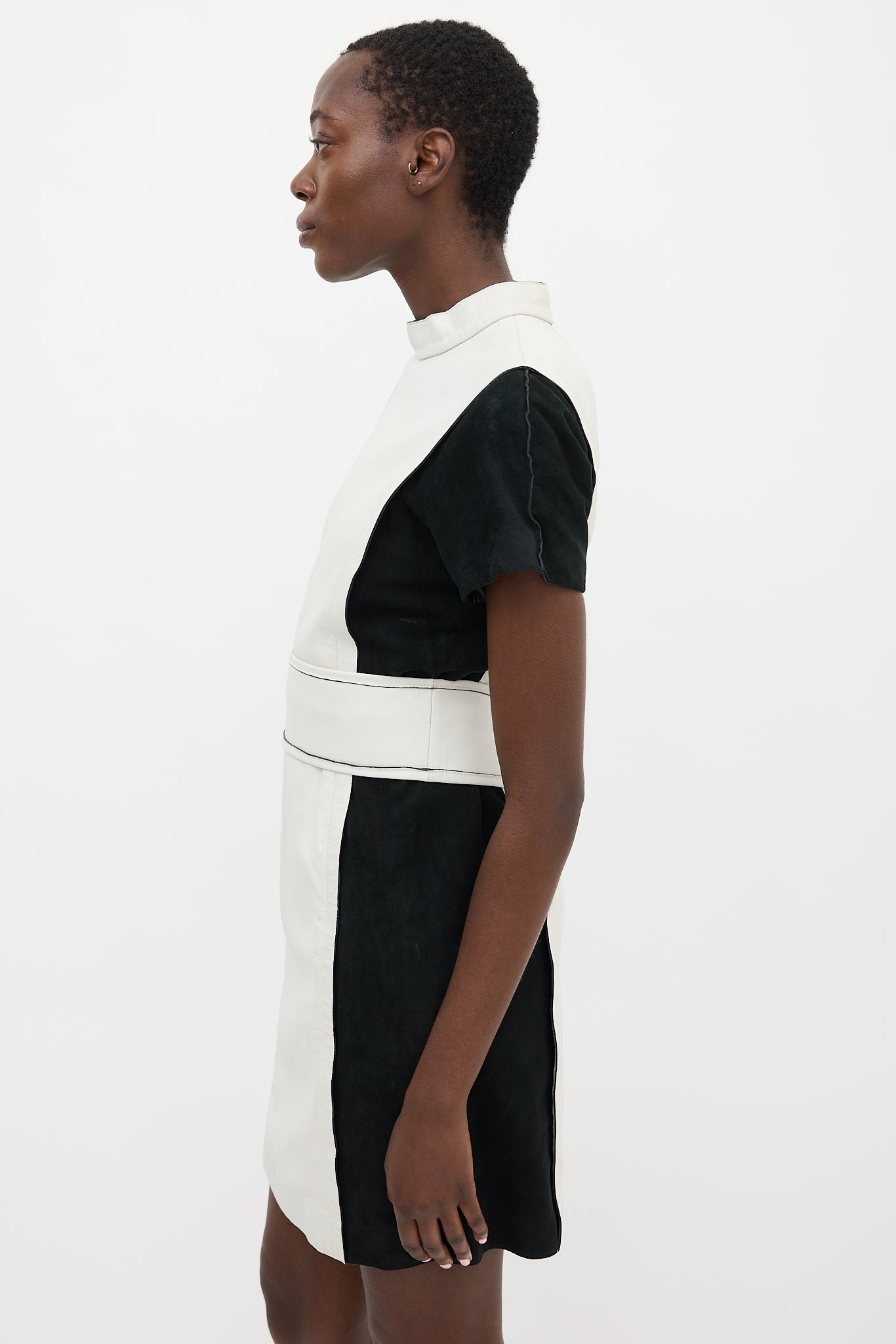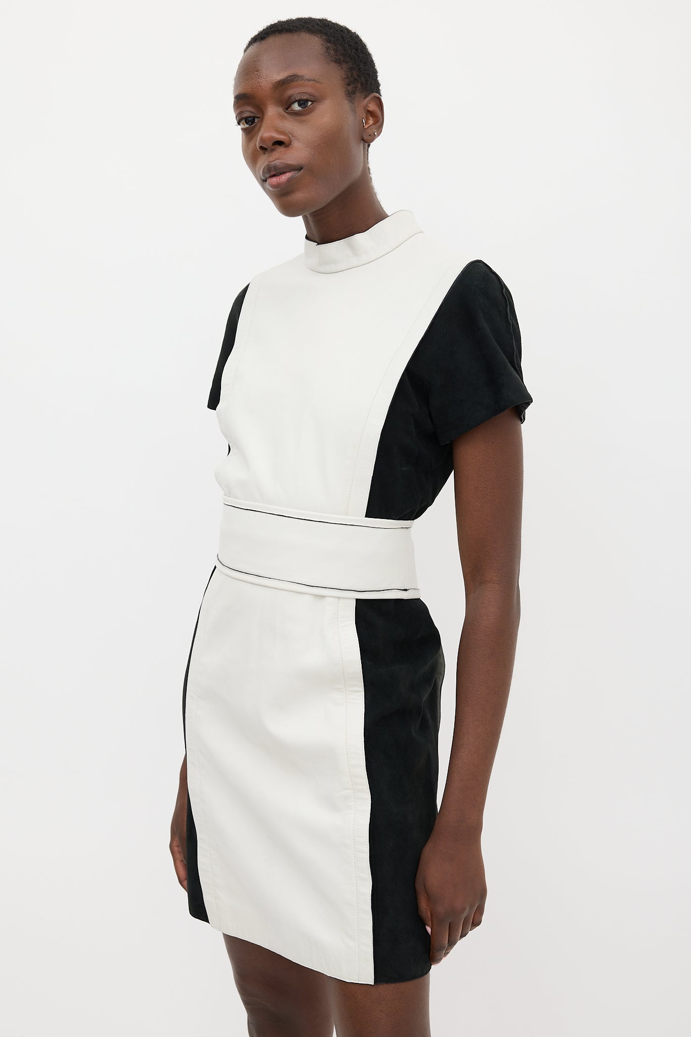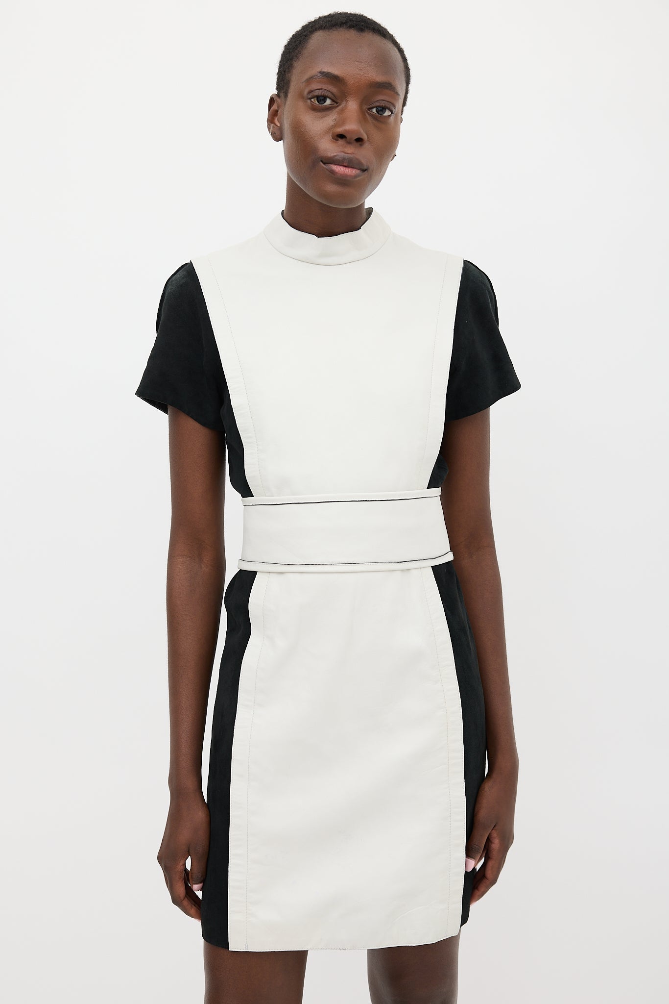 Pre-owned Proenza Schouler white leather dress featuring a mock neck collar, cap sleeves, belt at waist with snap closure, cut out at back, black suede trim at sides, and zip closure at back. Lined.
