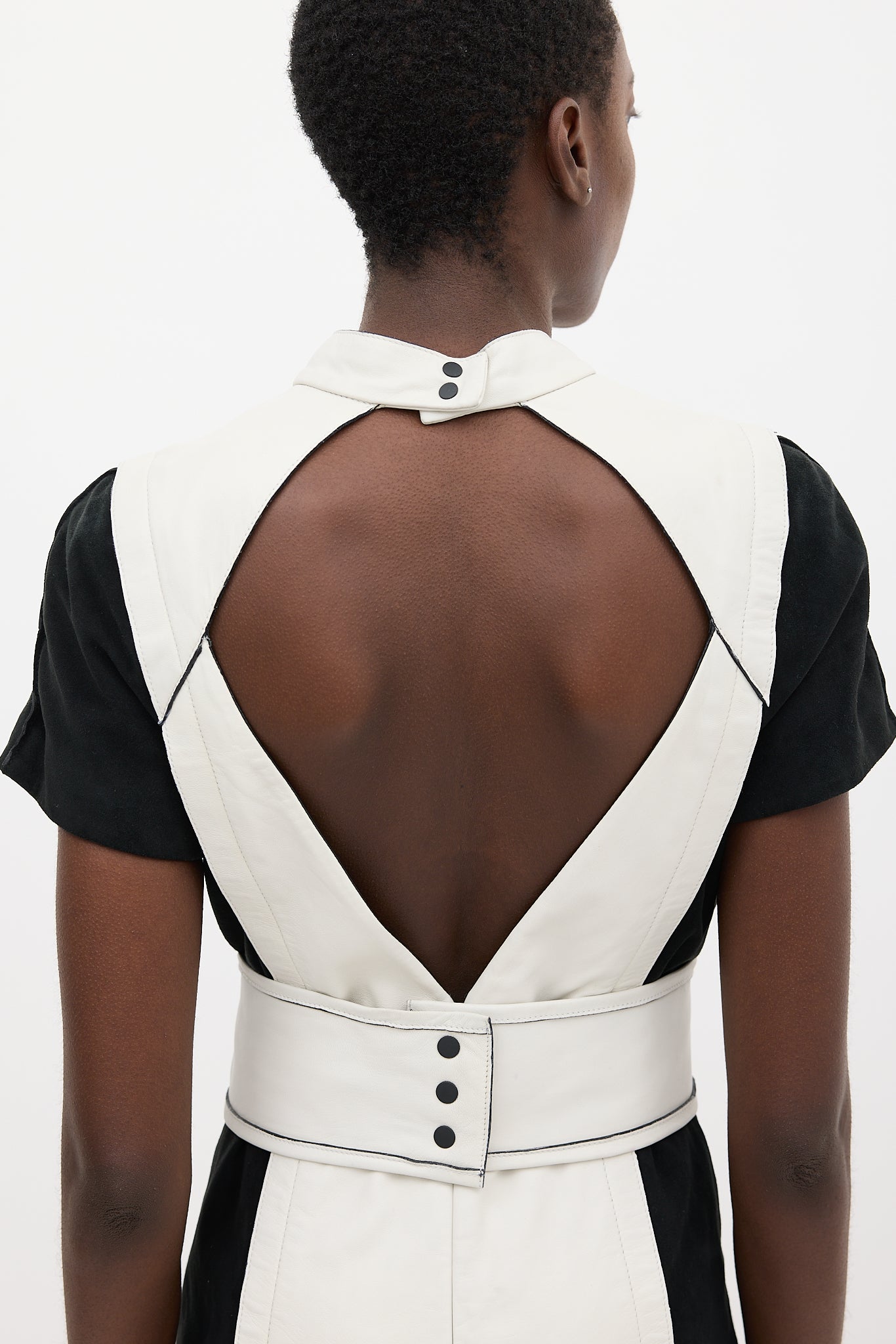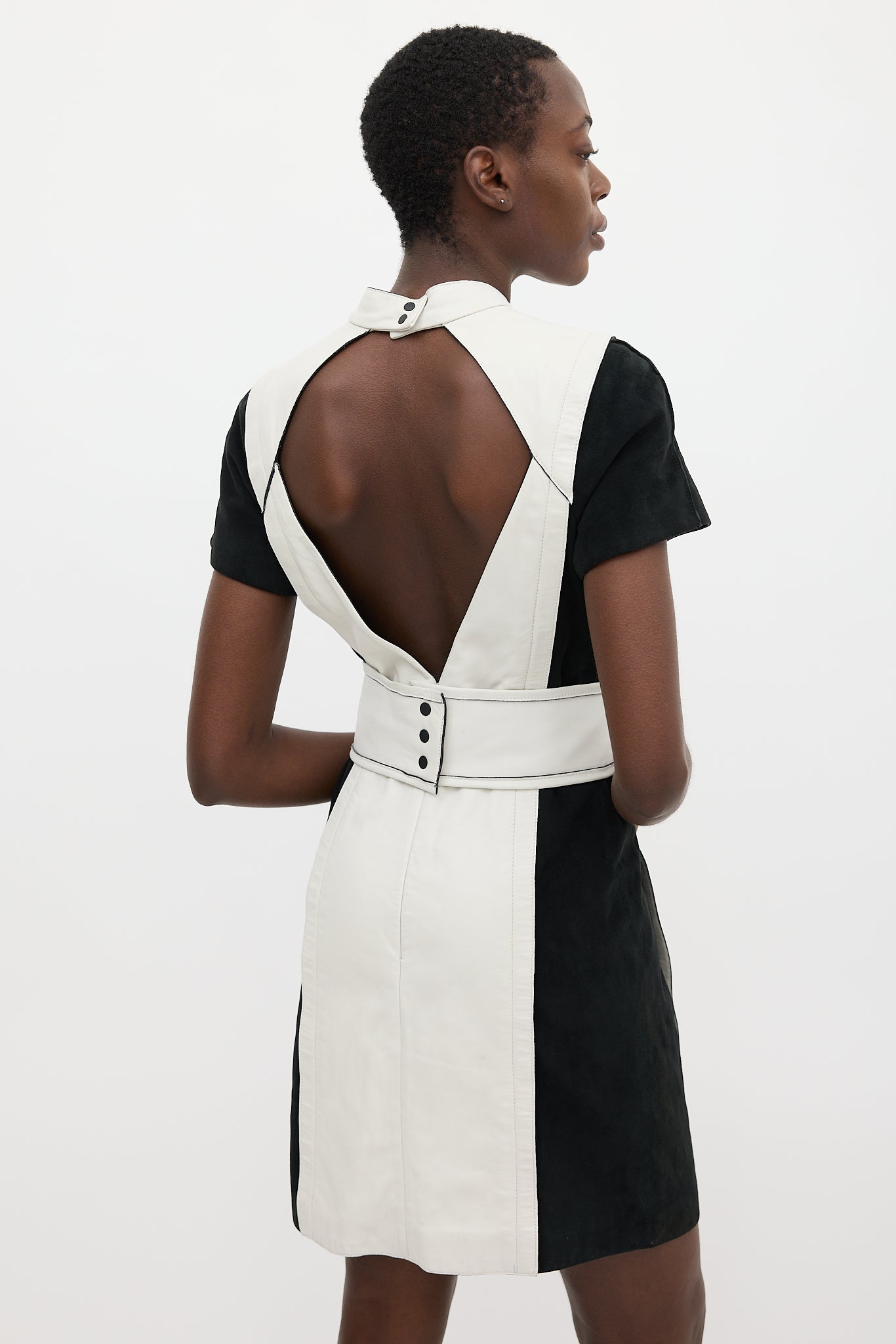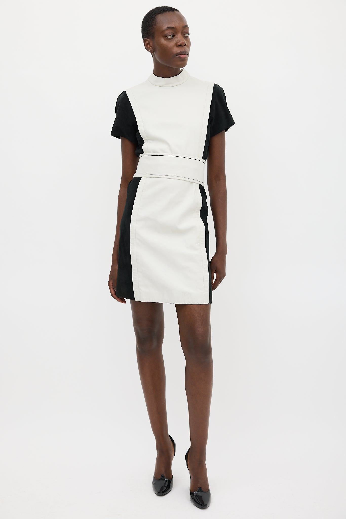 Pre-owned Proenza Schouler white leather dress featuring a mock neck collar, cap sleeves, belt at waist with snap closure, cut out at back, black suede trim at sides, and zip closure at back. Lined.