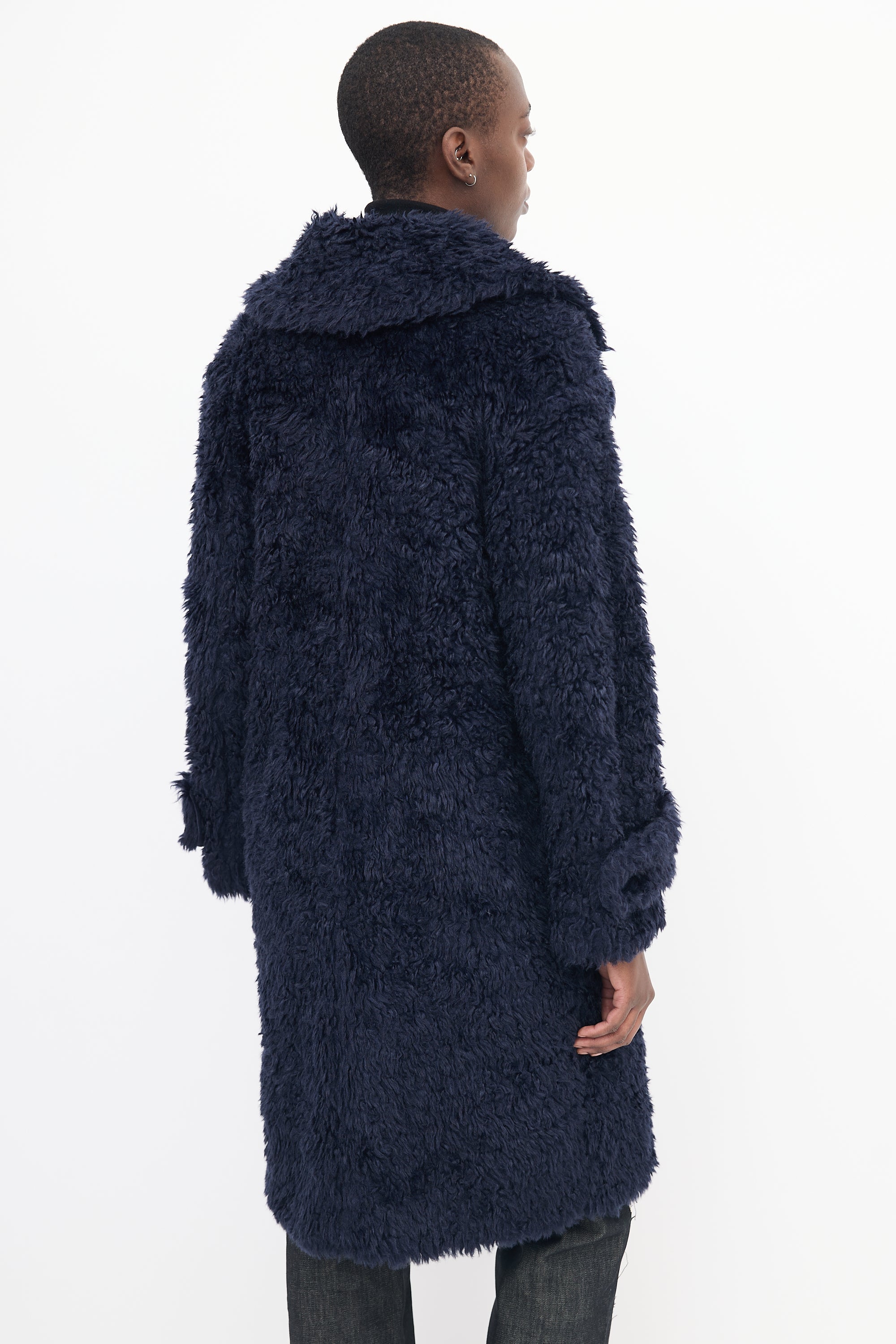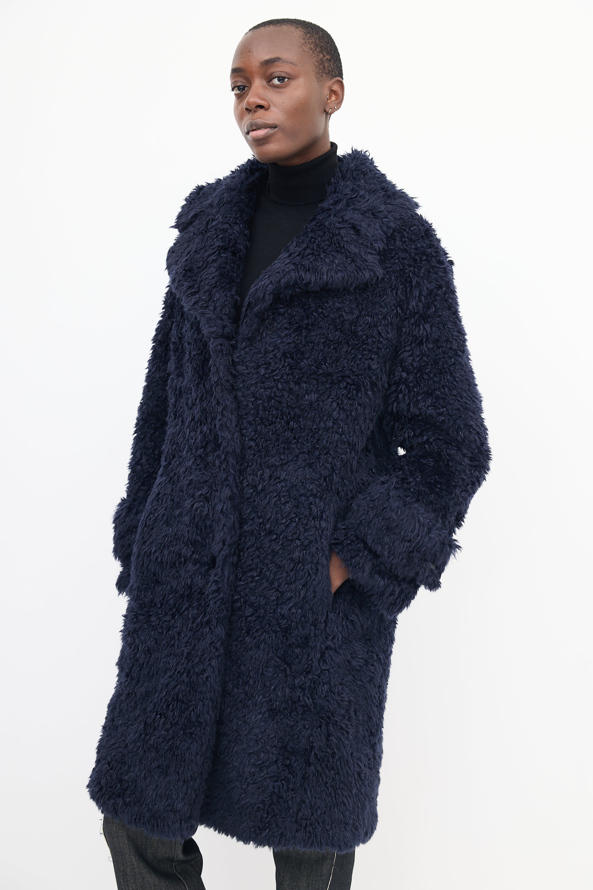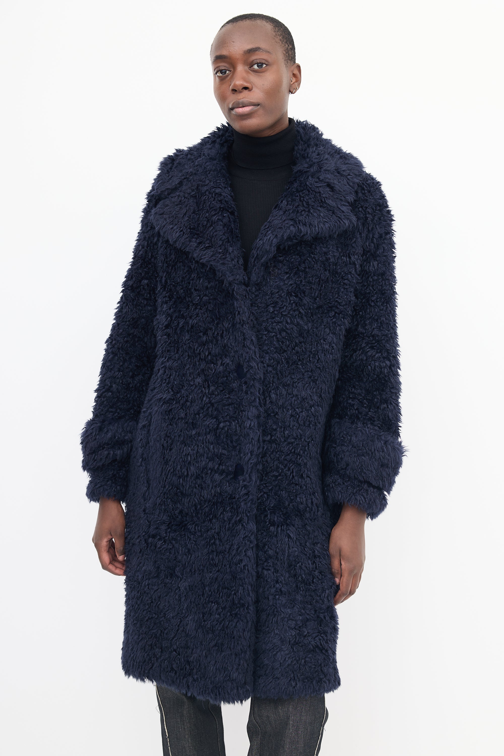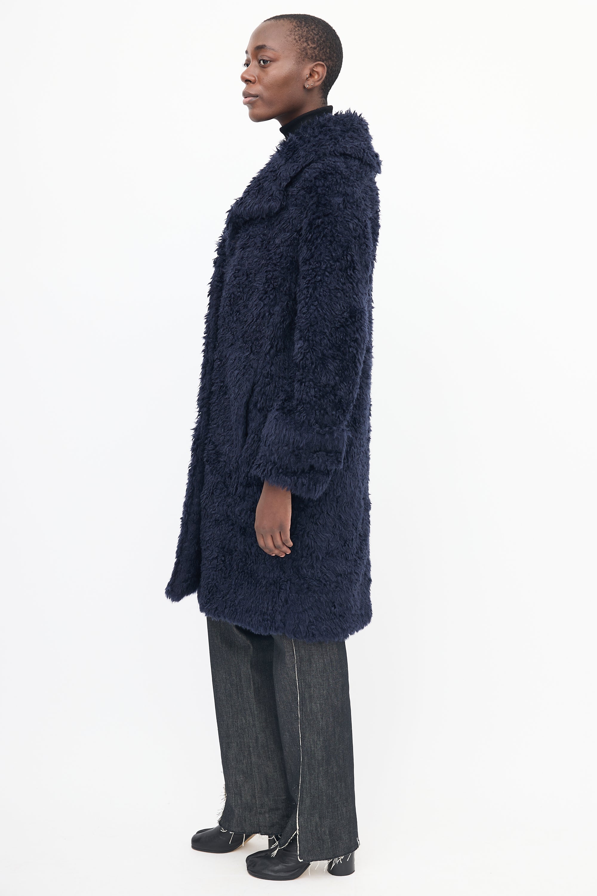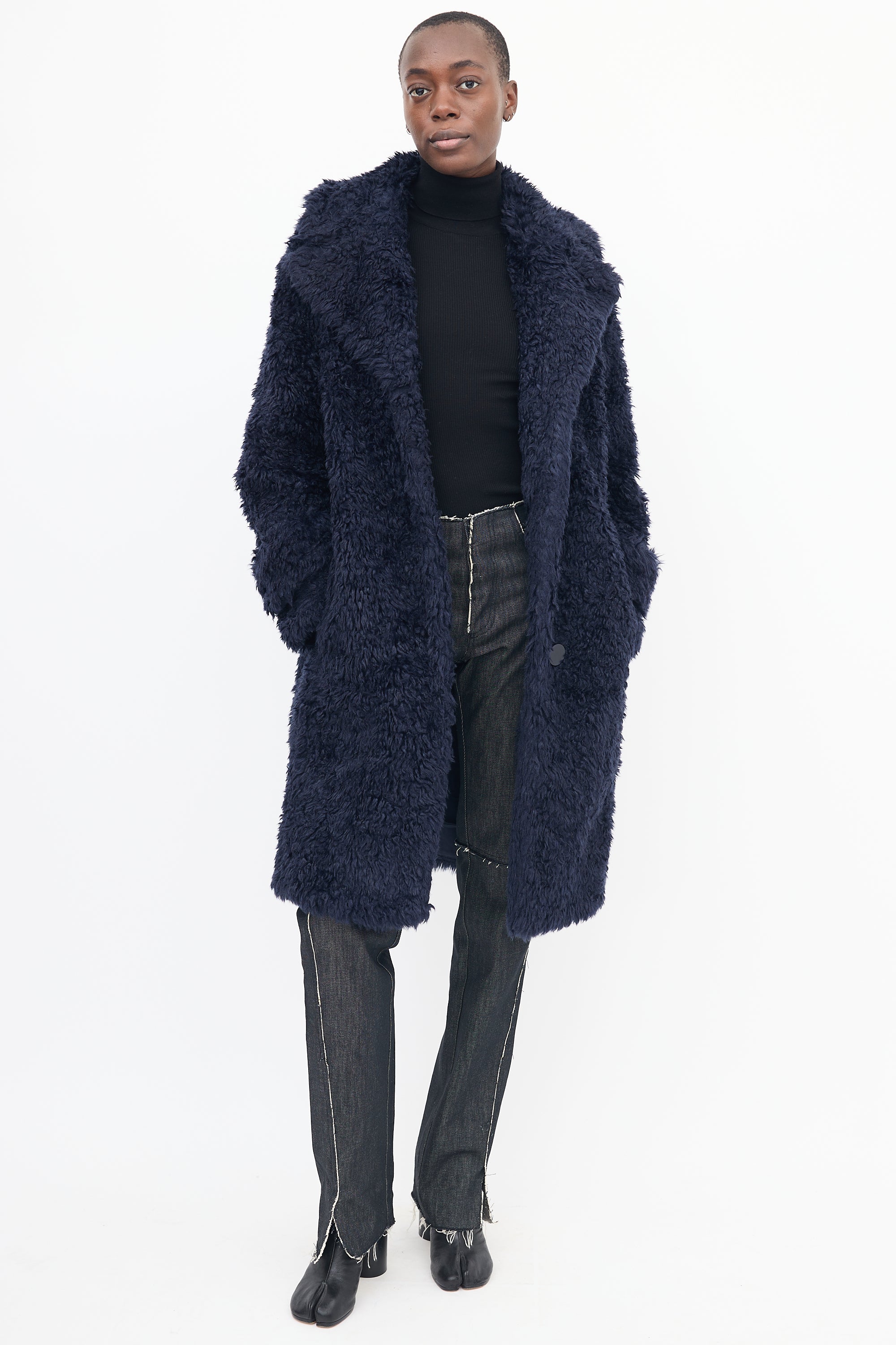 Pre-owned Proenza Schouler White Label navy shaggy coat featuring notch lapel, buttoned front, two hip pockets, and buttoned cuffs. Lined.