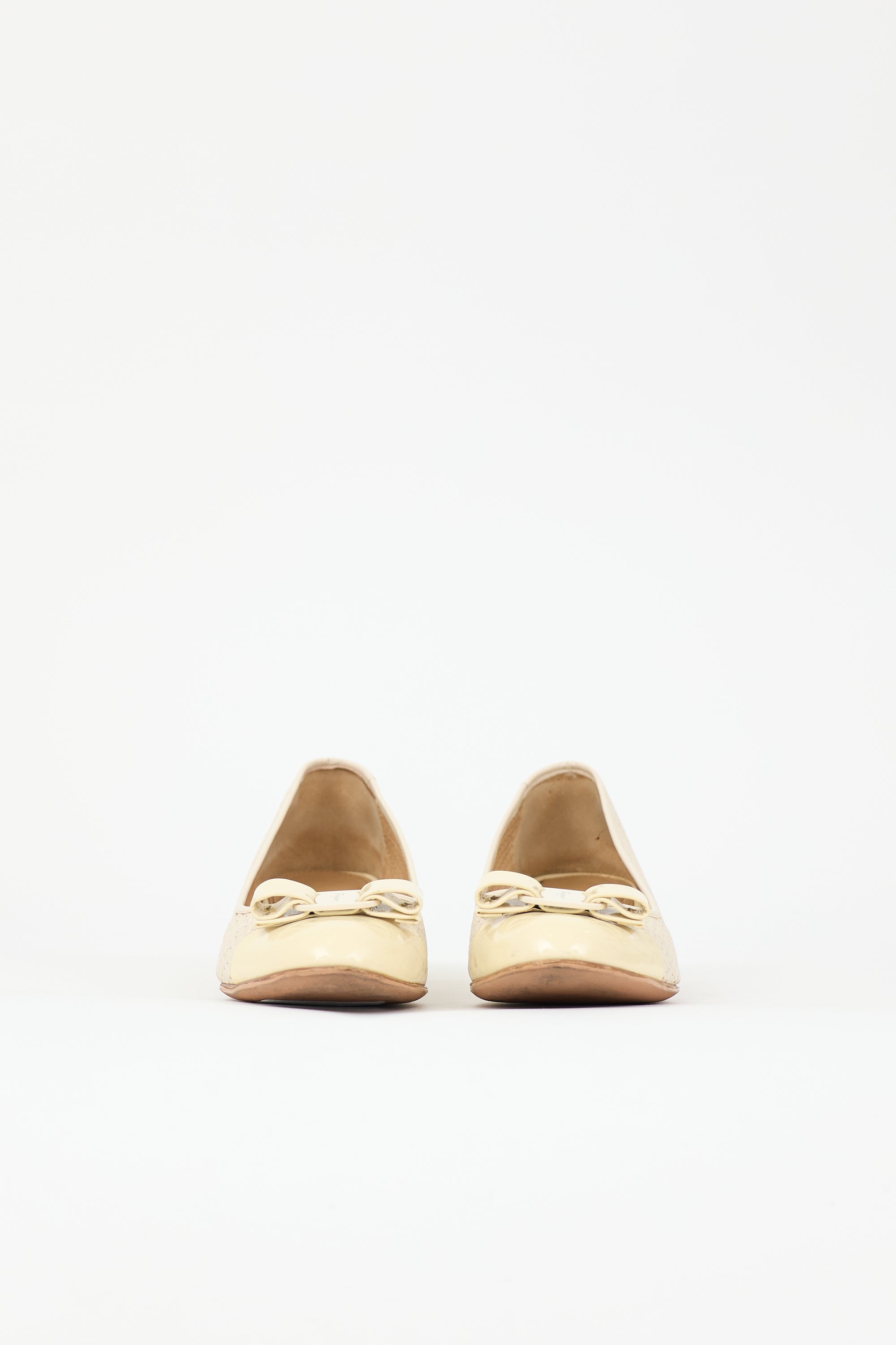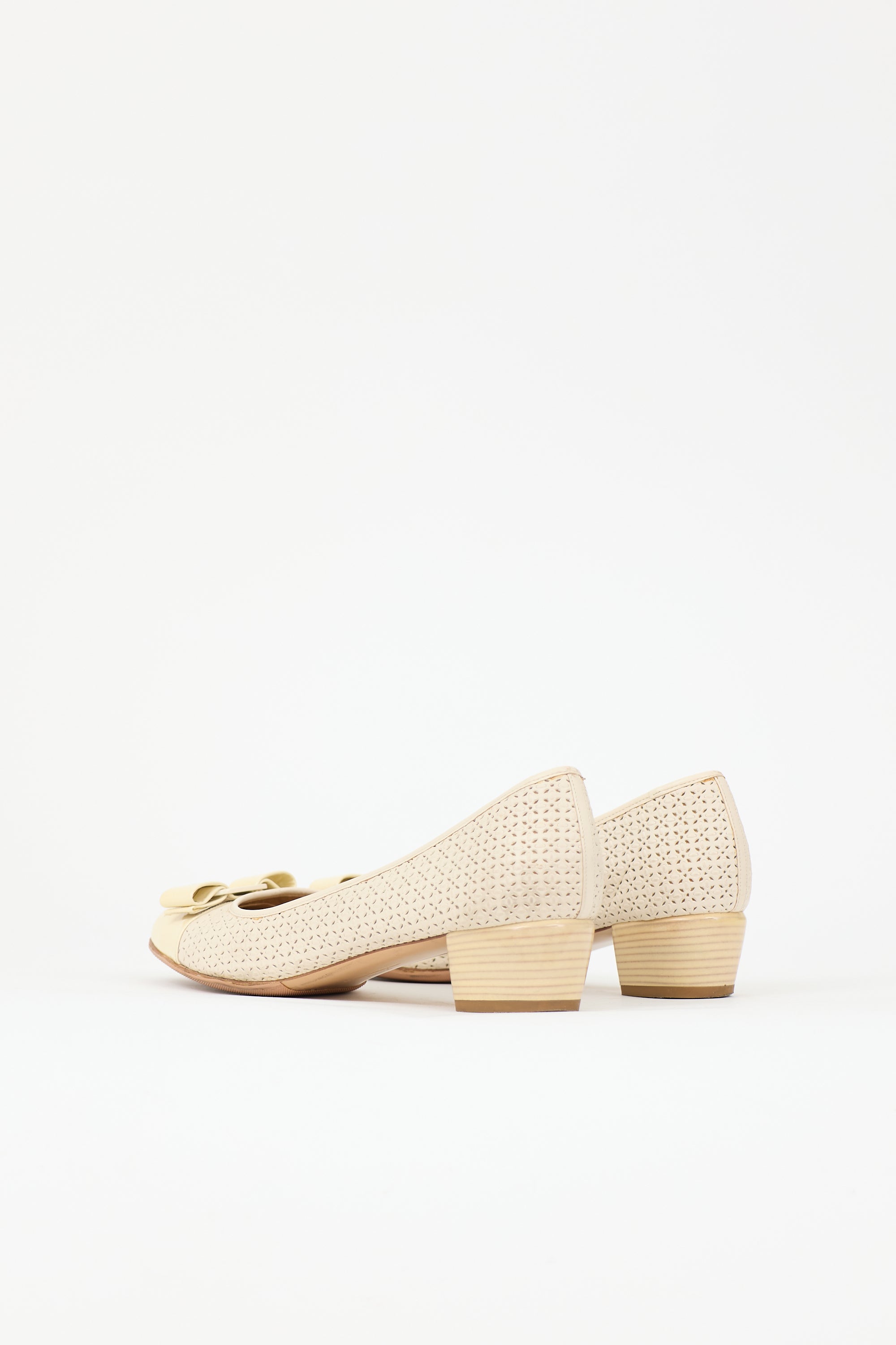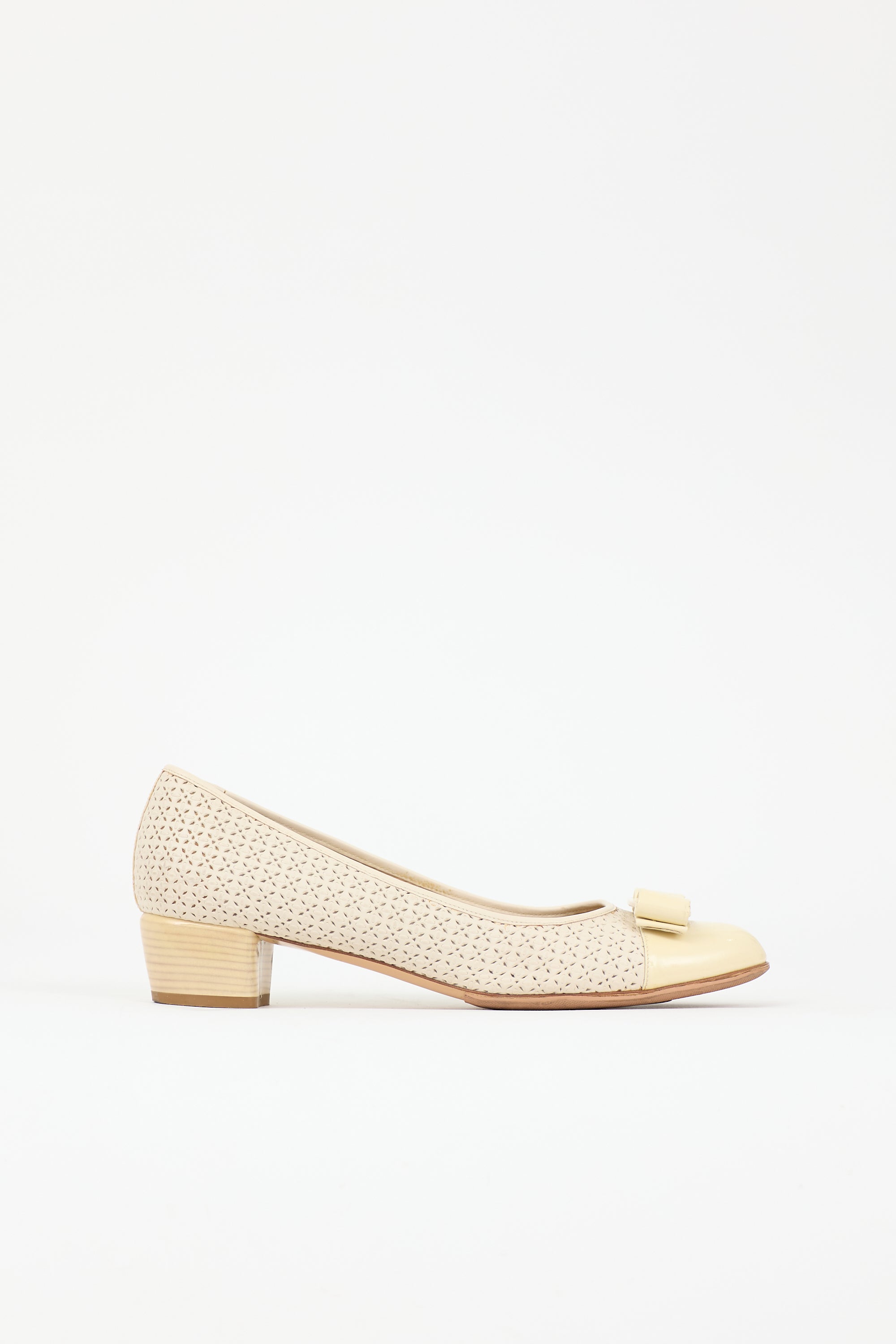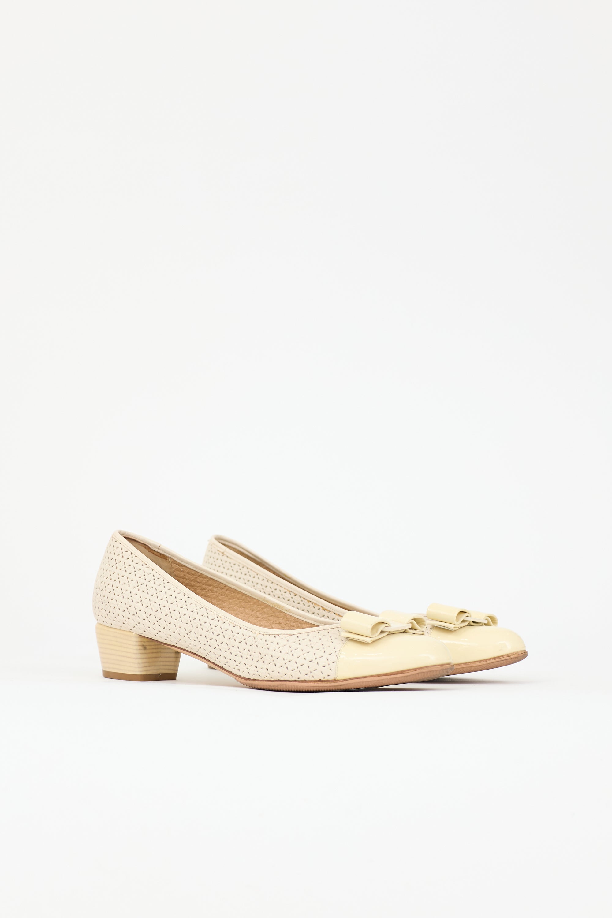 Pre-owned Ferragamo cream Vara Bow pumps featuring rounded toe with patent cap, attached bow with engraved logo, laser cutout upper, and printed block heel.