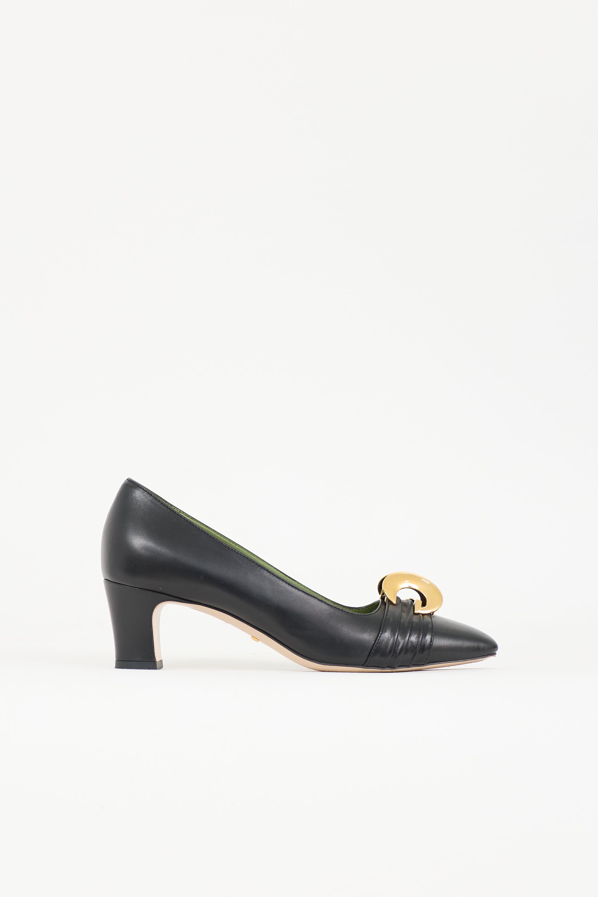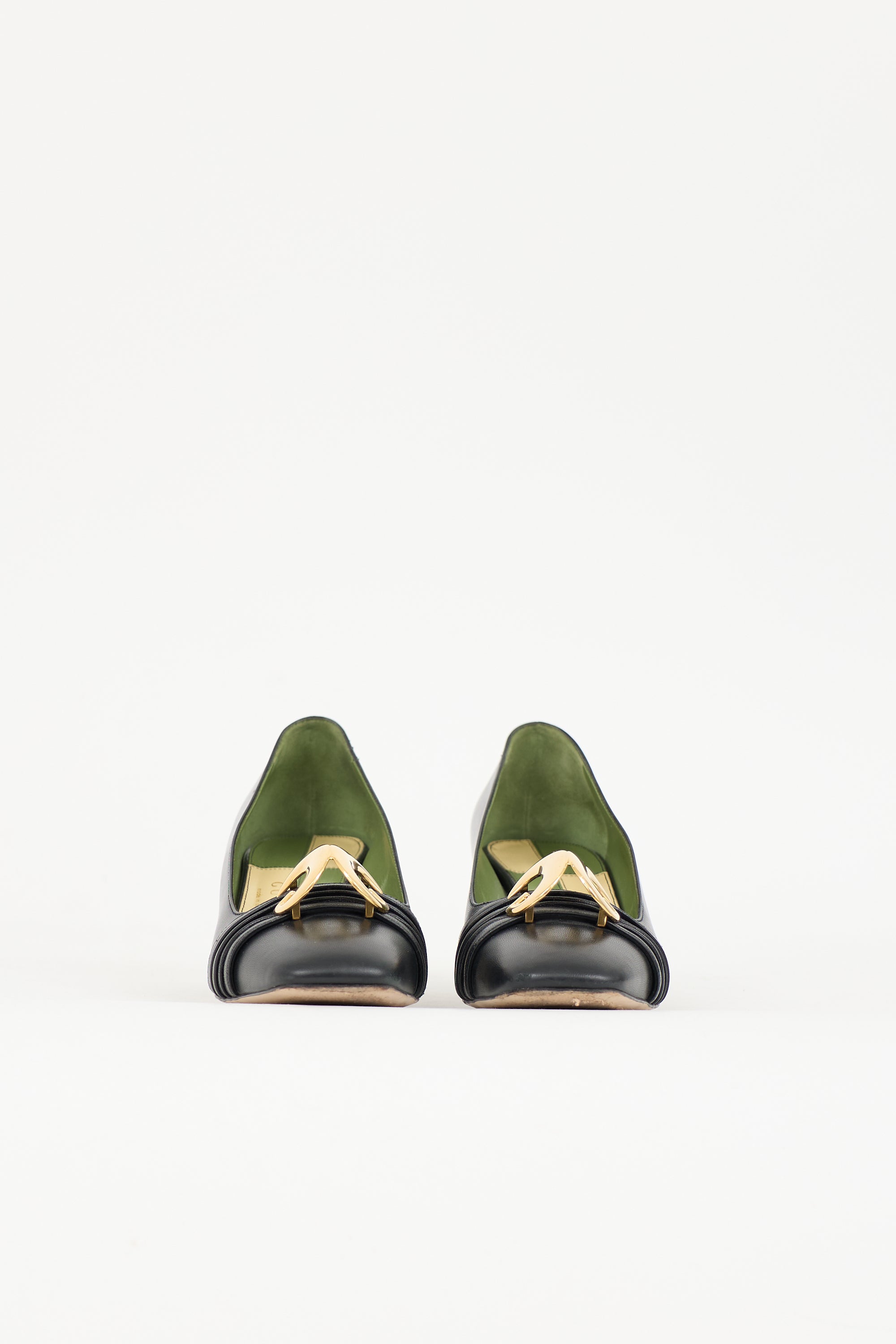 Pre-owned Gucci black leather Malaga Kid pumps featuring square toe, gold tone G logo hardware, green and cream checkered insole, and low block heel.