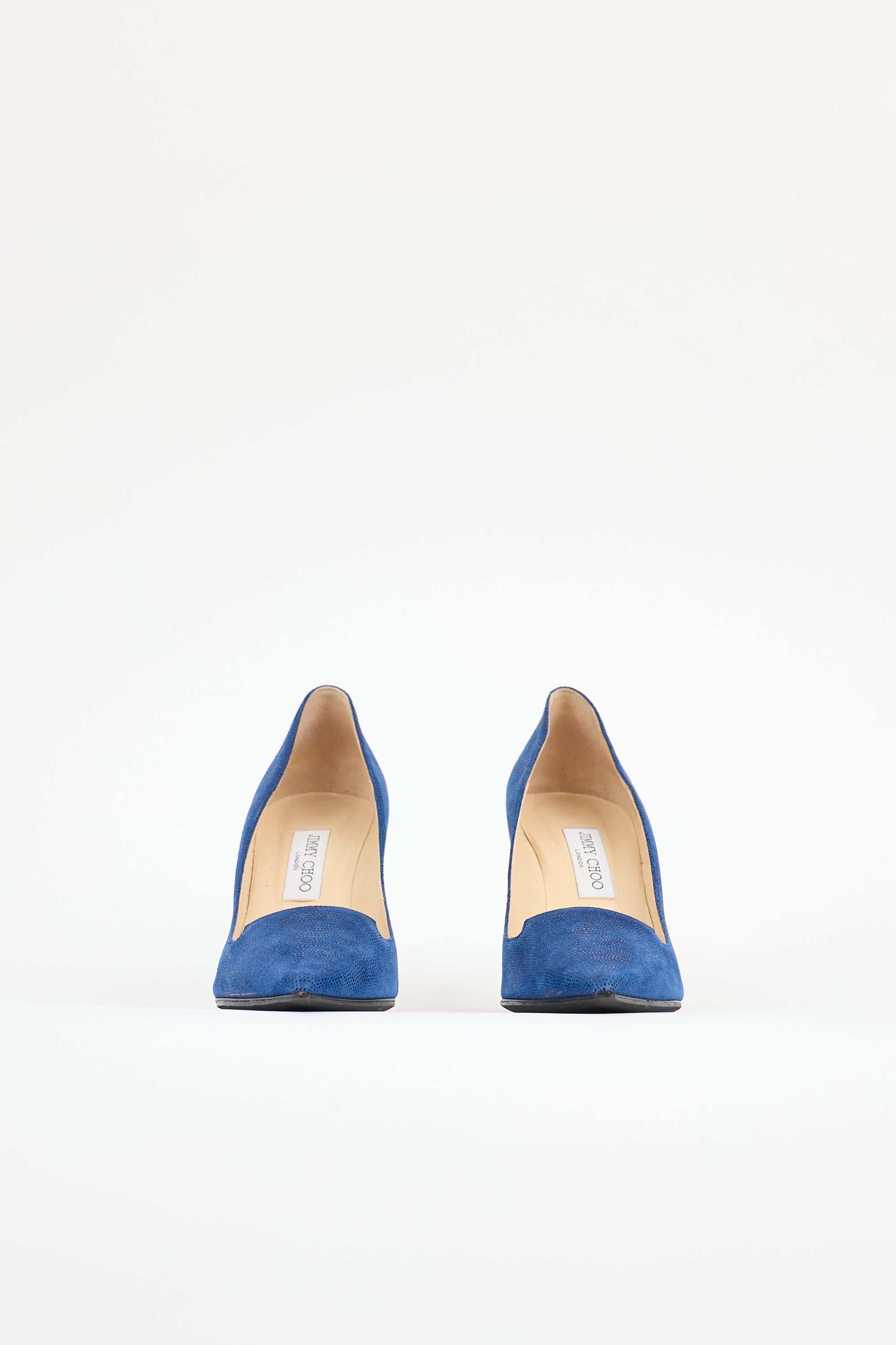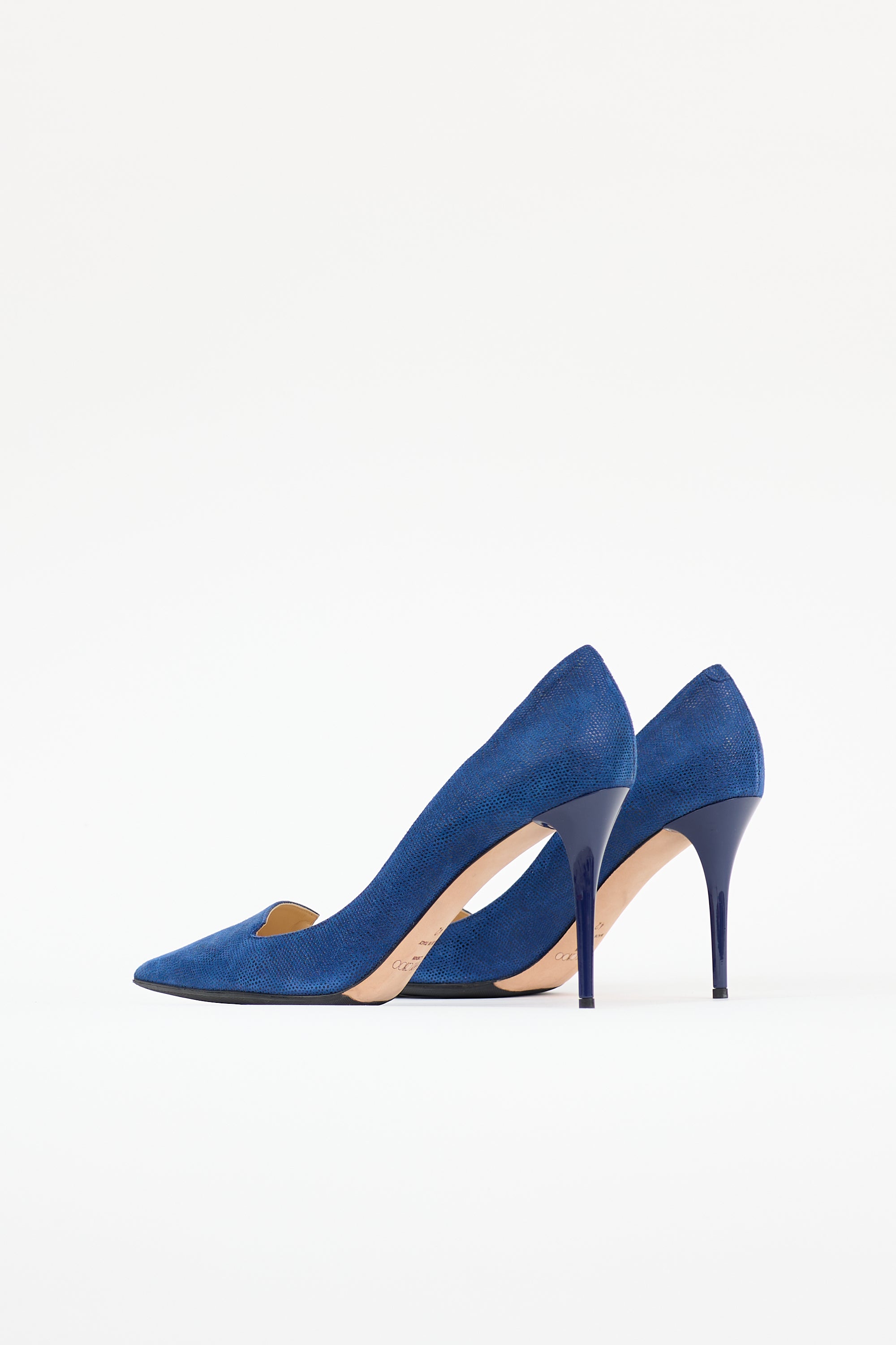 Pre-owned Jimmy Choo blue textured suede Alia pump featuring a pointed toe, notched topline, and stiletto heel.
