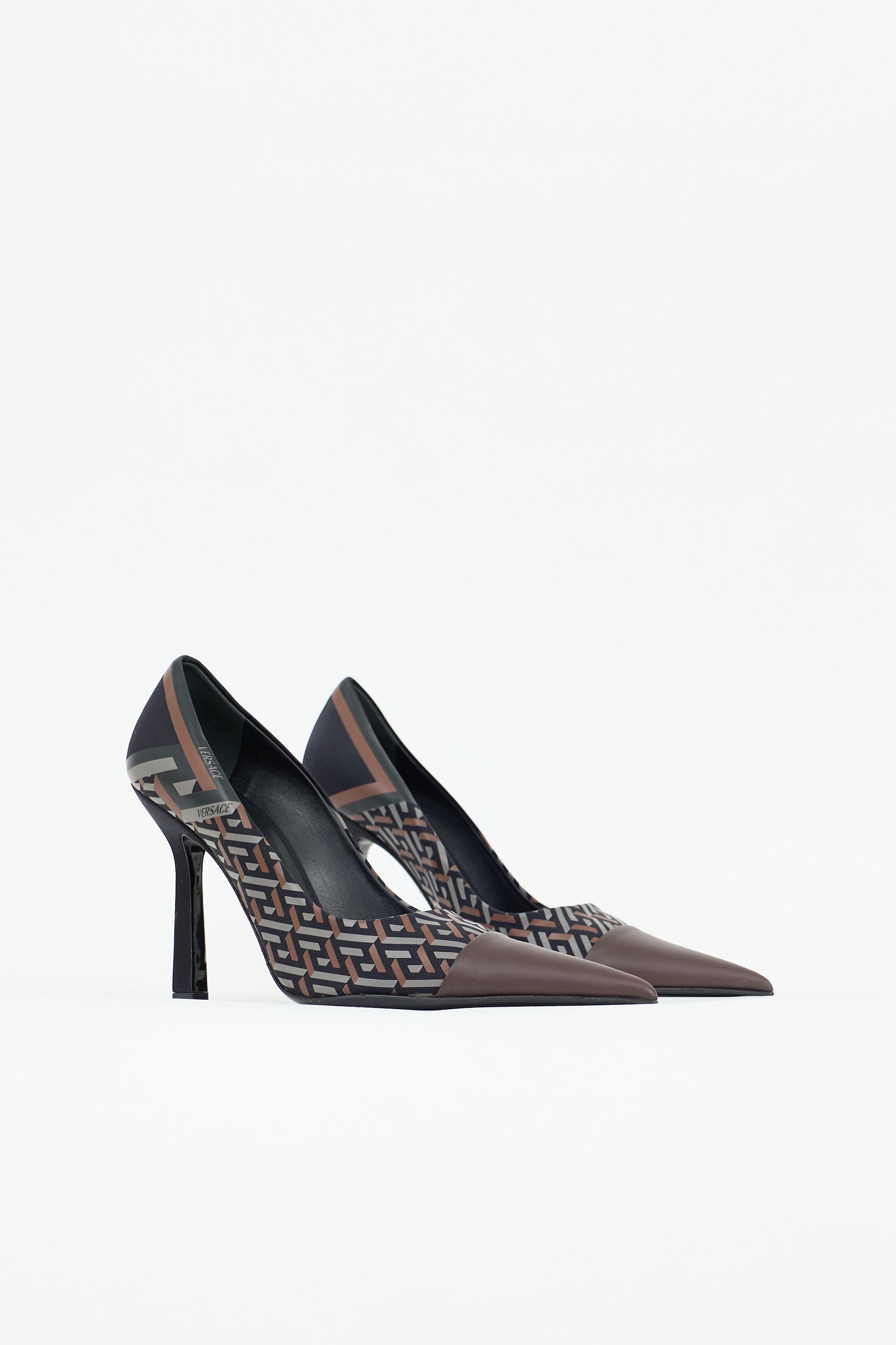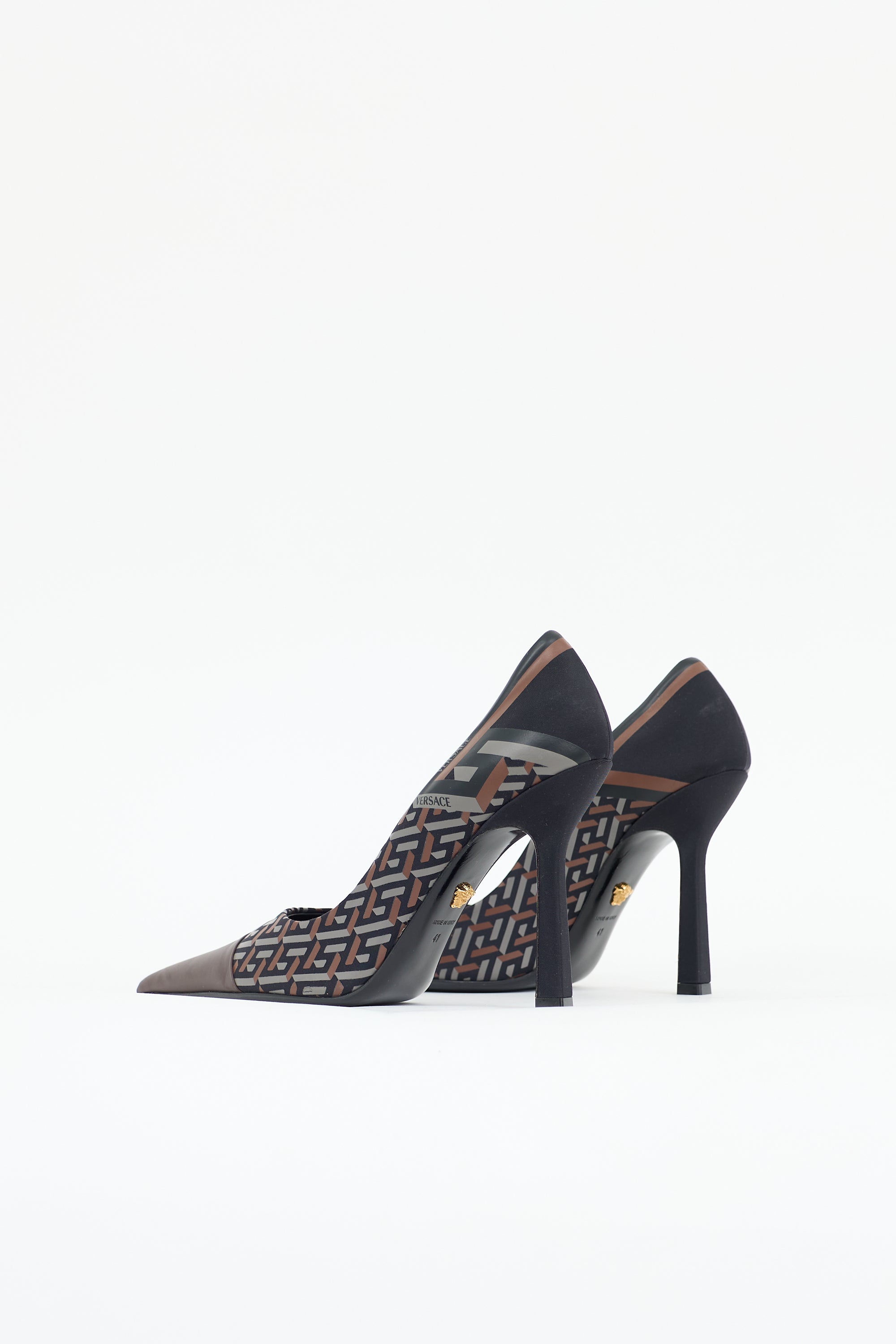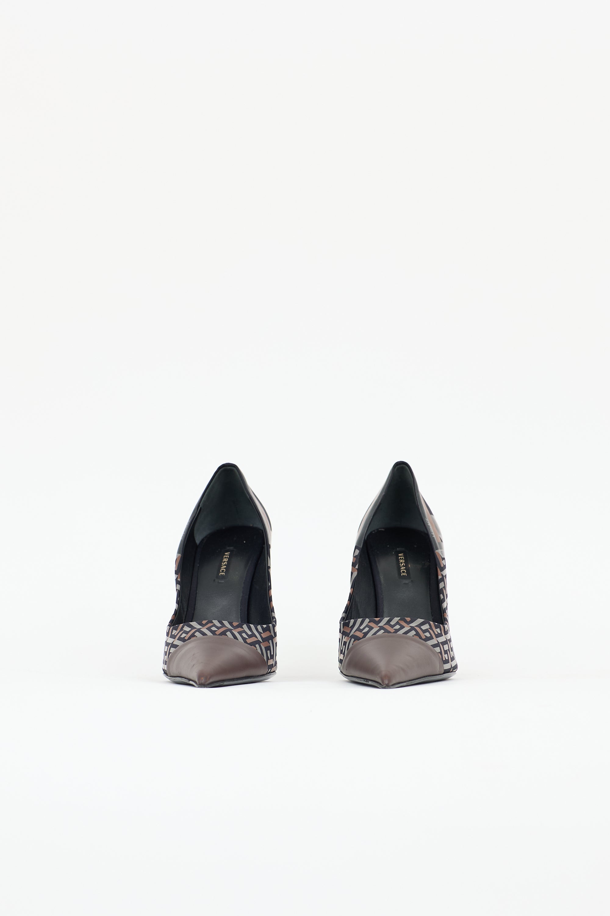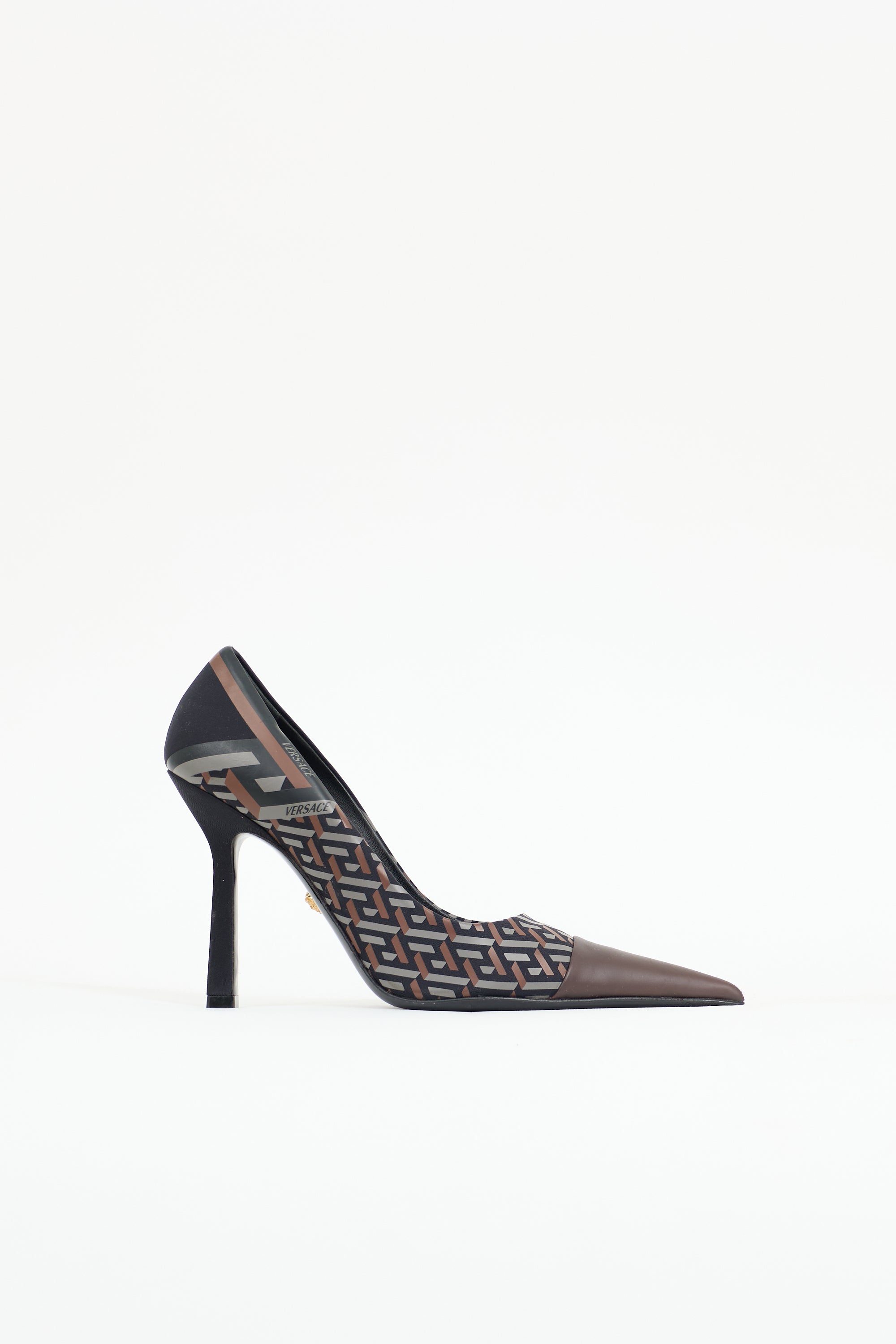Pre-owned Versace black and brown leather La Greca Signature pumps featuring a pointed cap toe, geometric print throughout with logo at outerside, neoprene counter, and covered sculptural heel.