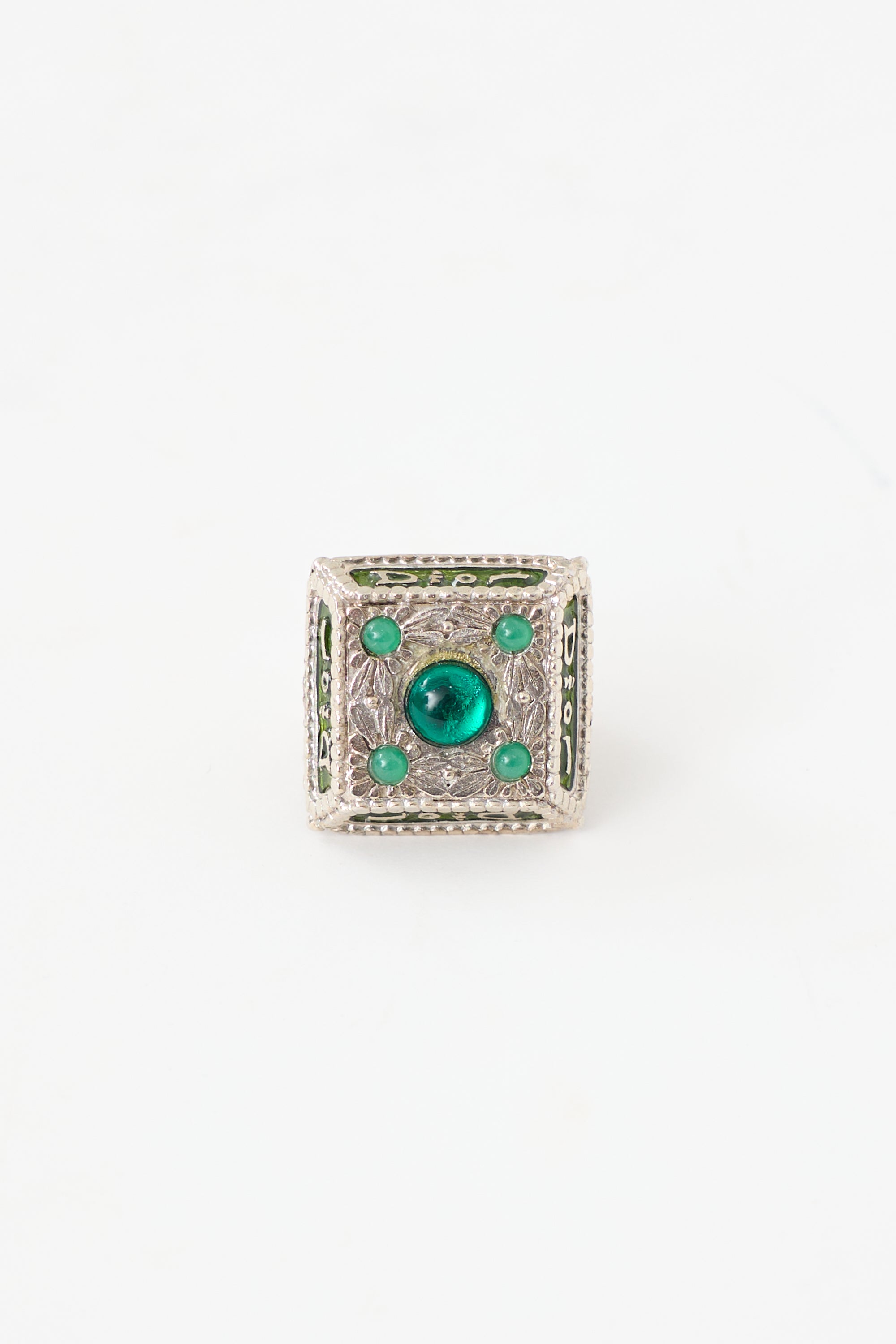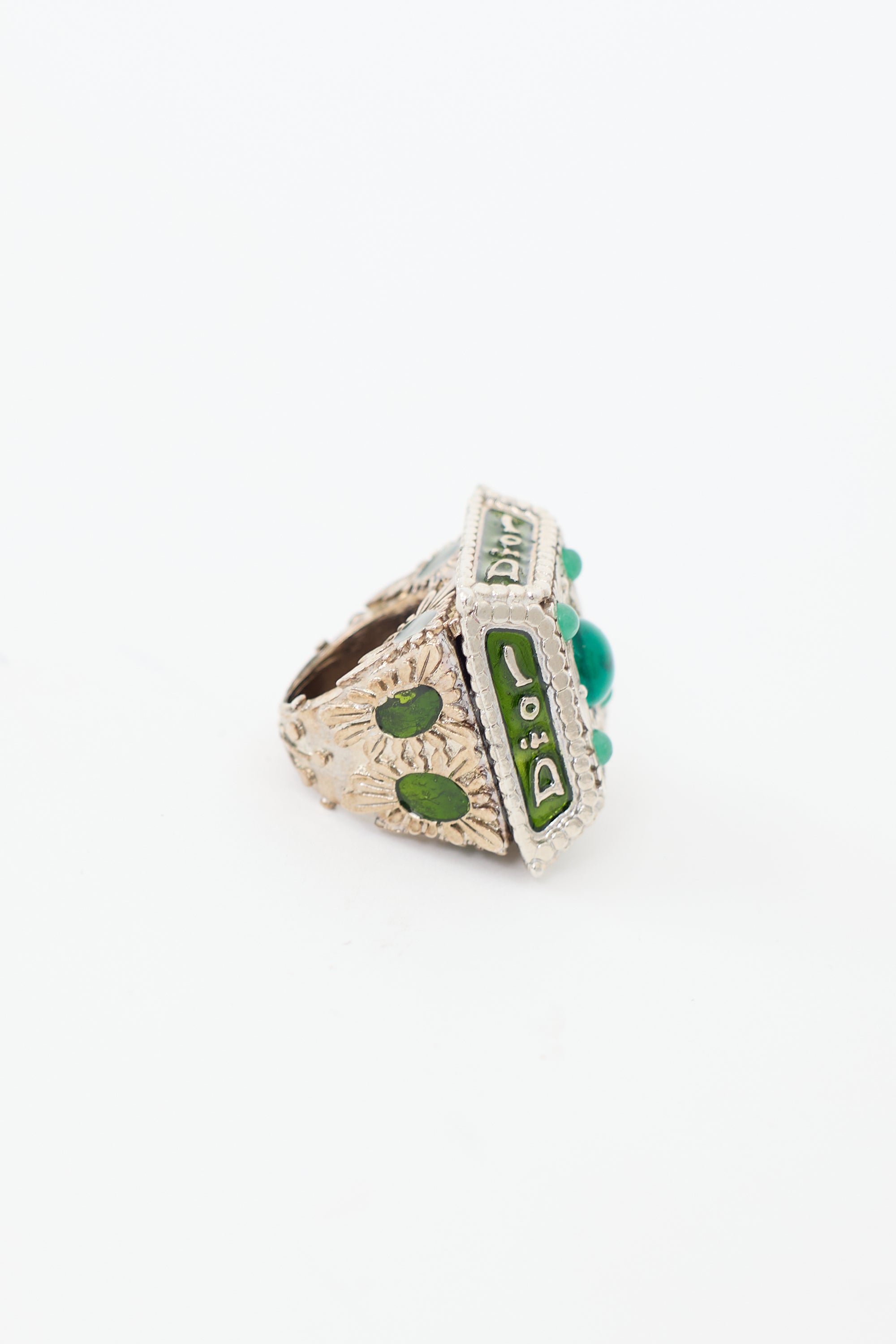 Pre-owned Dior Fall/Winter 2002 silver and green princess ring featuring large square setting, handcrafted floral motif, embossed logo with enamel inlay, and gemstones.