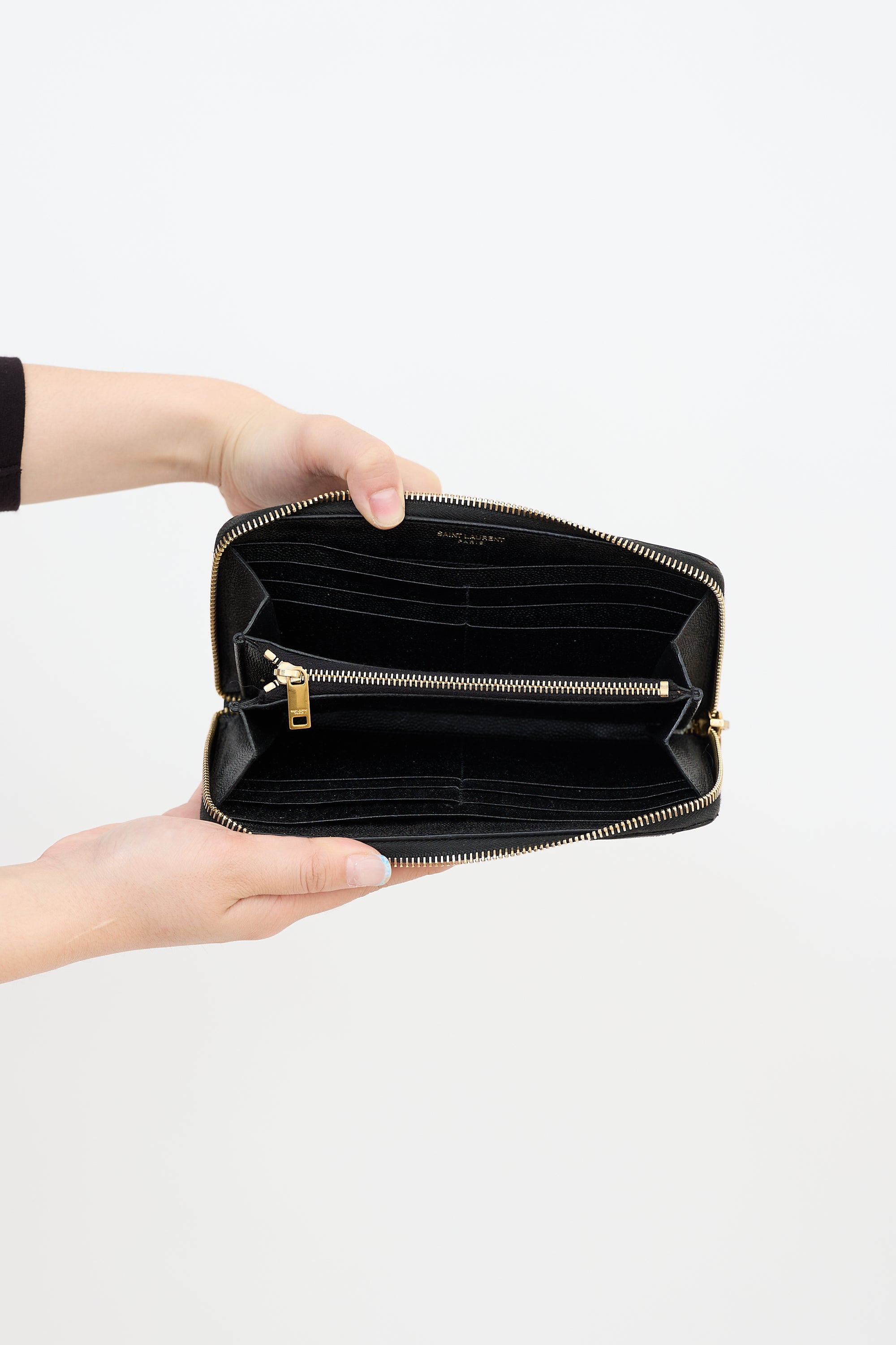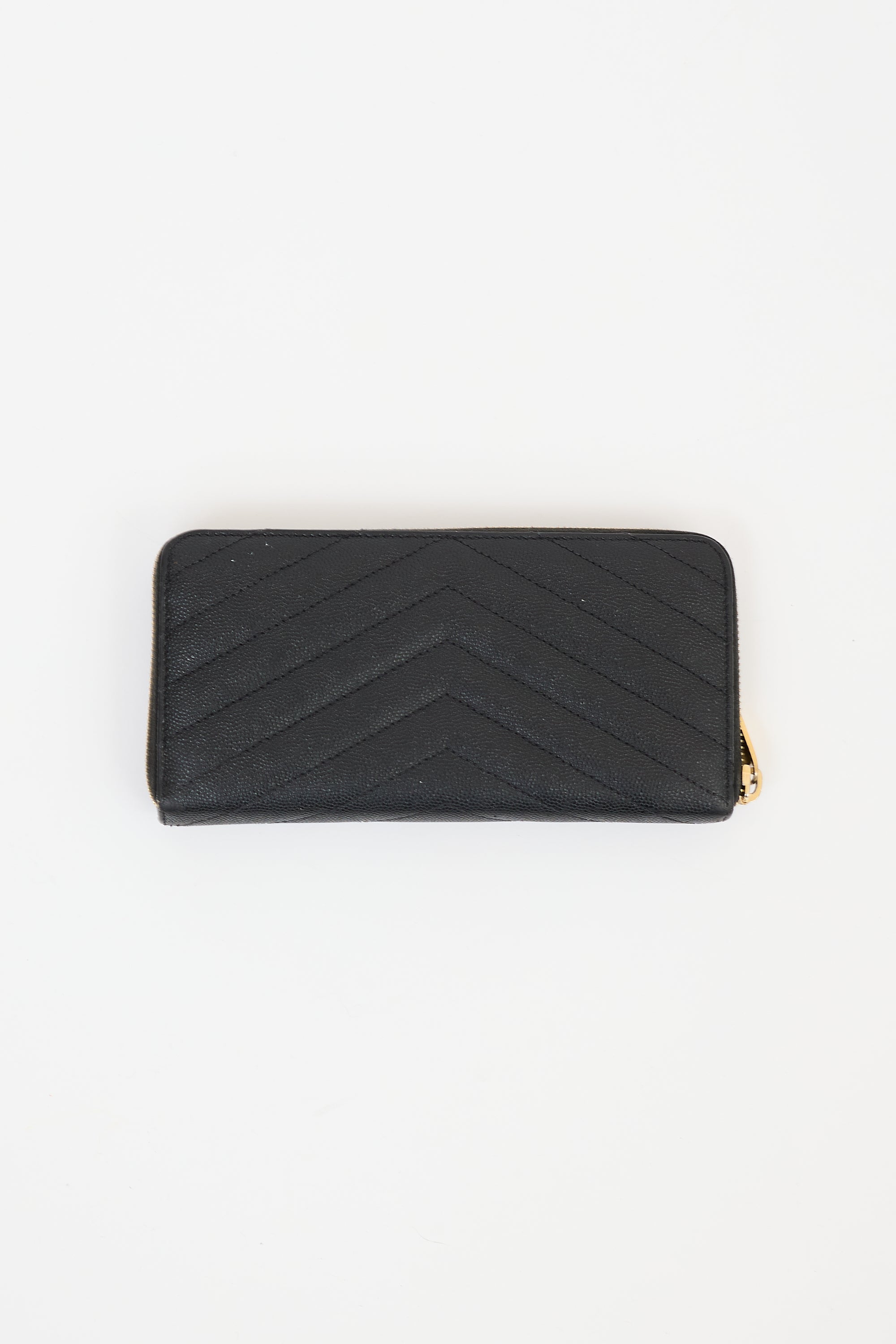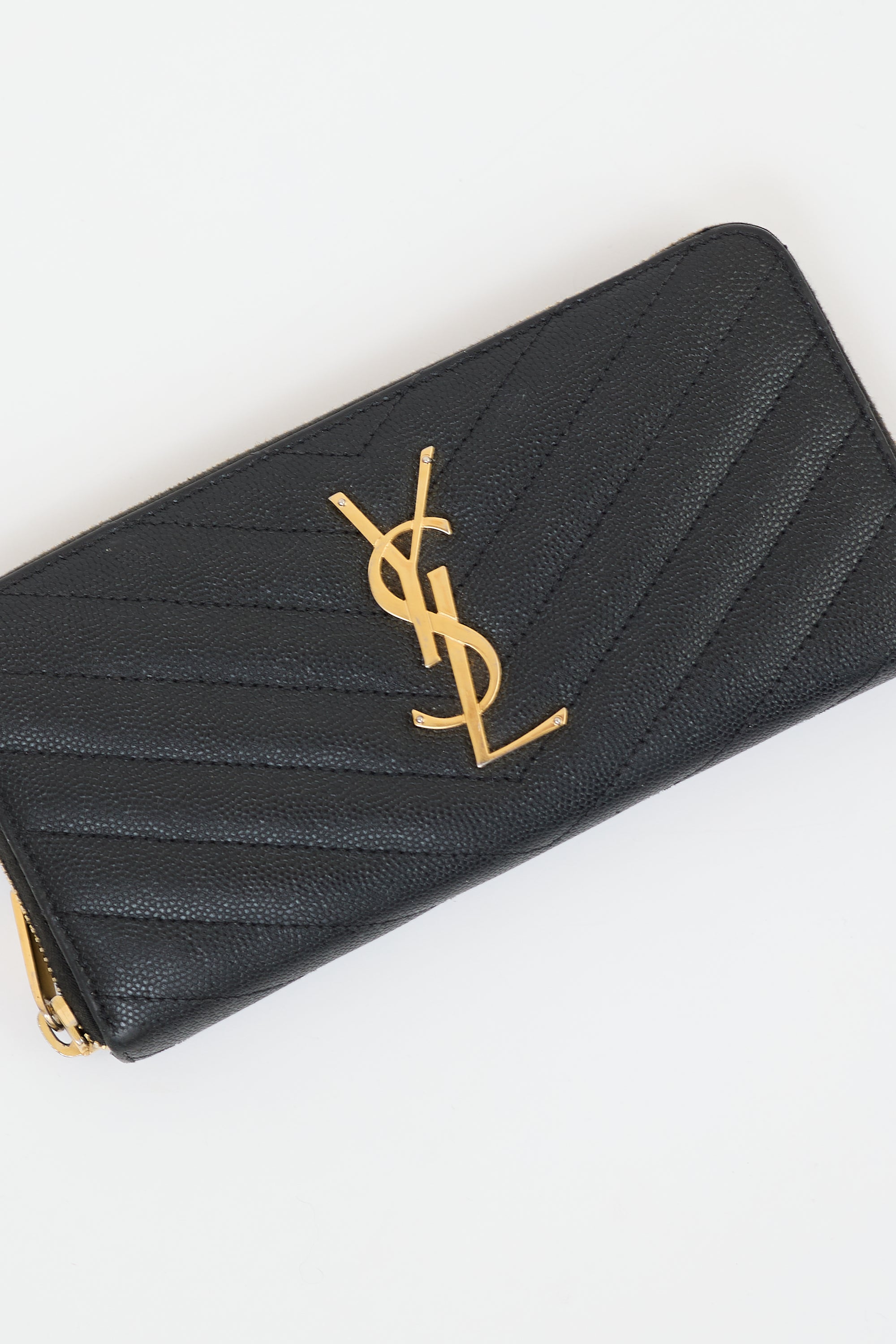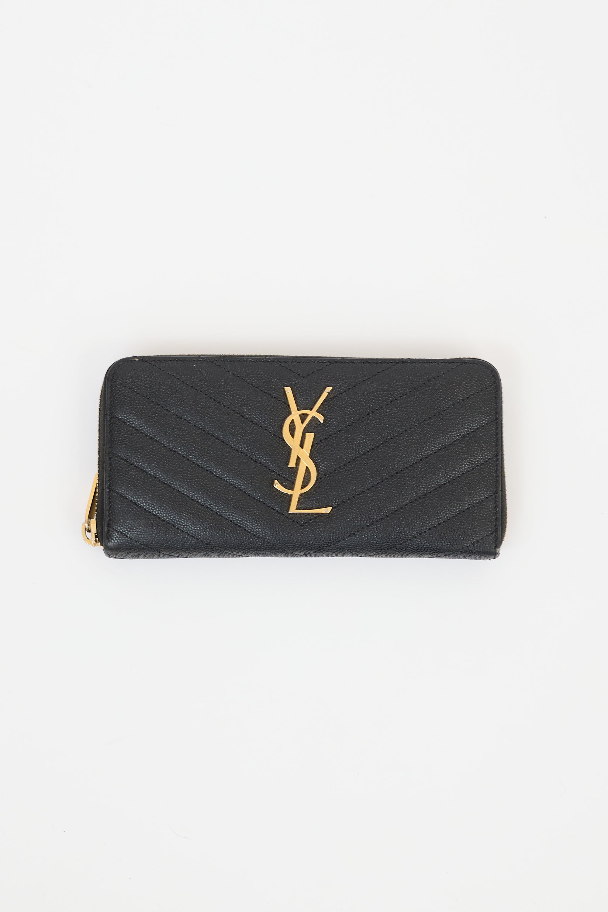 Pre-owned Saint Laurent black leather Cassandre wallet featuring graine de poudre quilted leather, gold tone hardware, Cassandre logo hardware at front, zip around closure, two main compartments, one interior zipped coin compartment, two slip pockets, and twelve card slots. Comes with original box and dust bag.