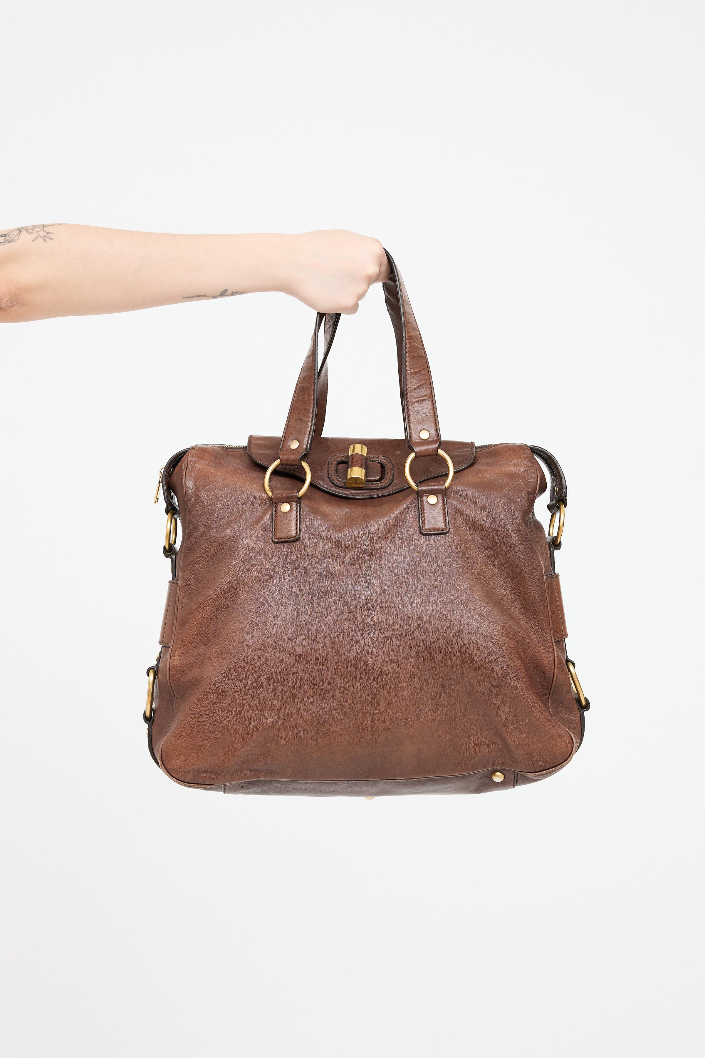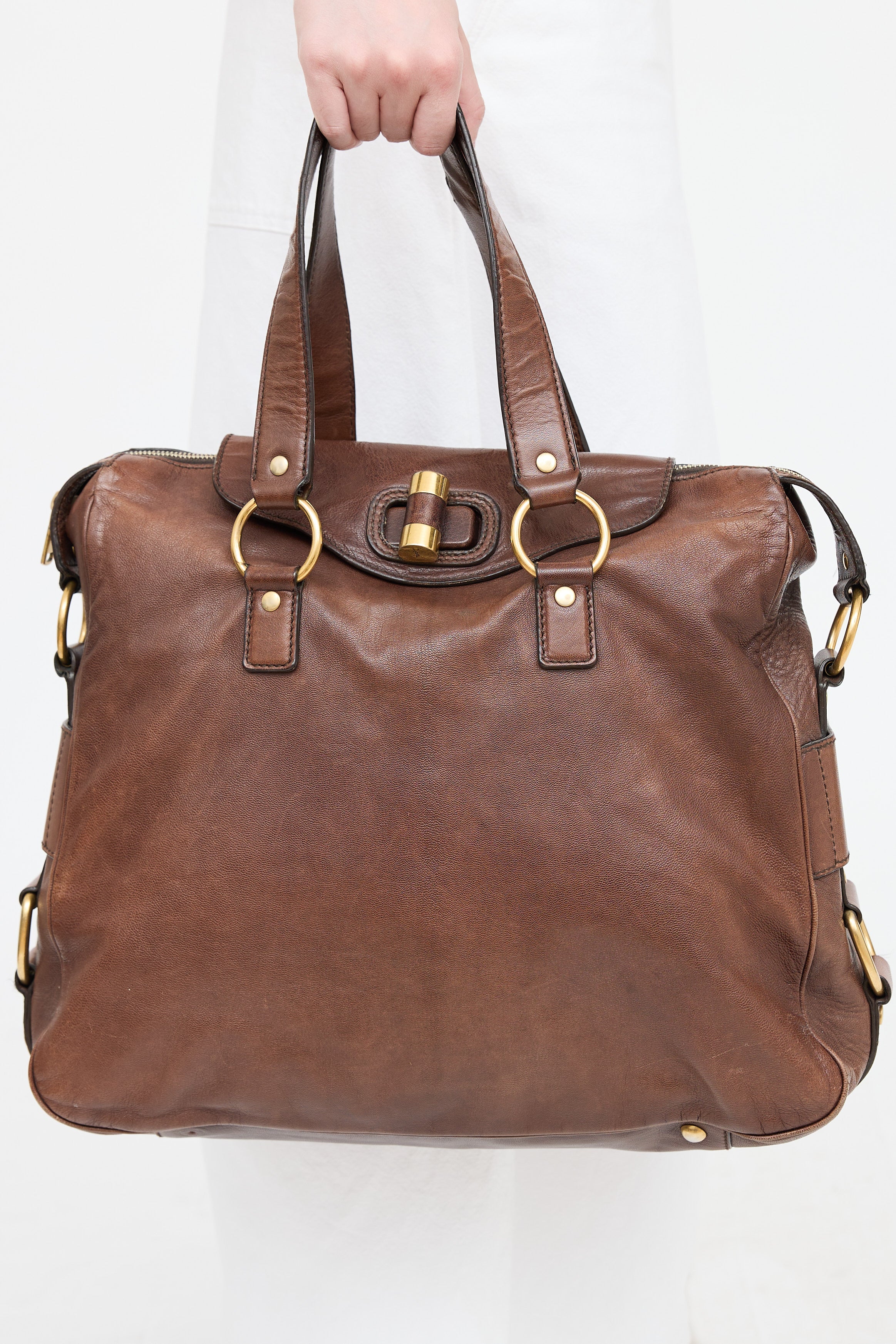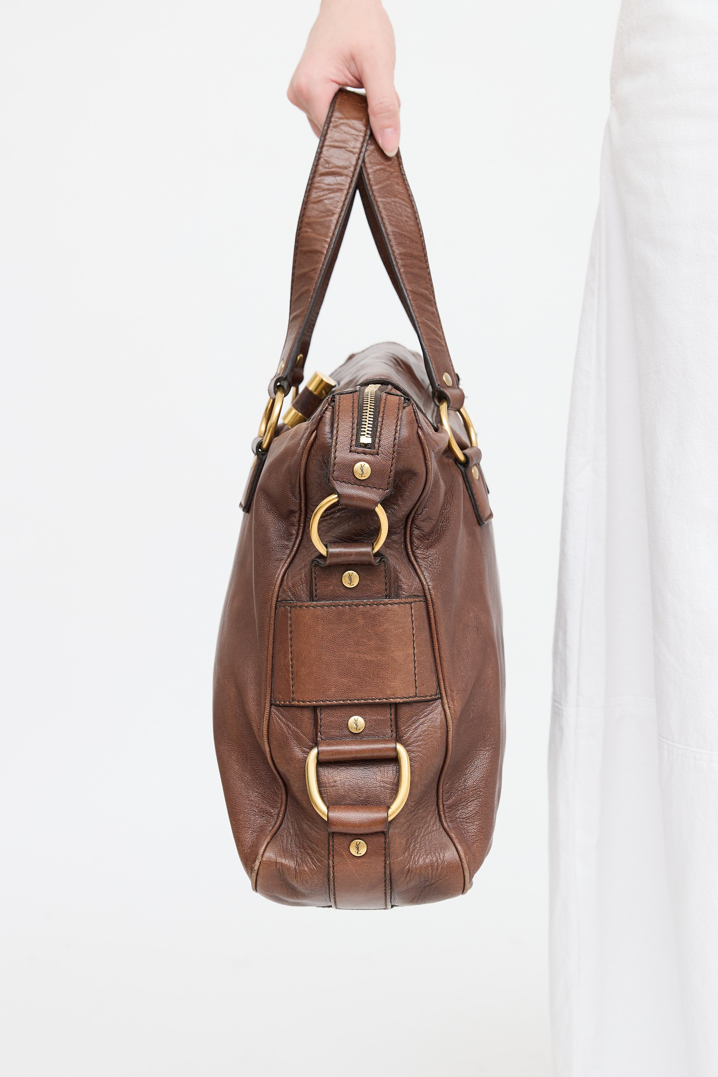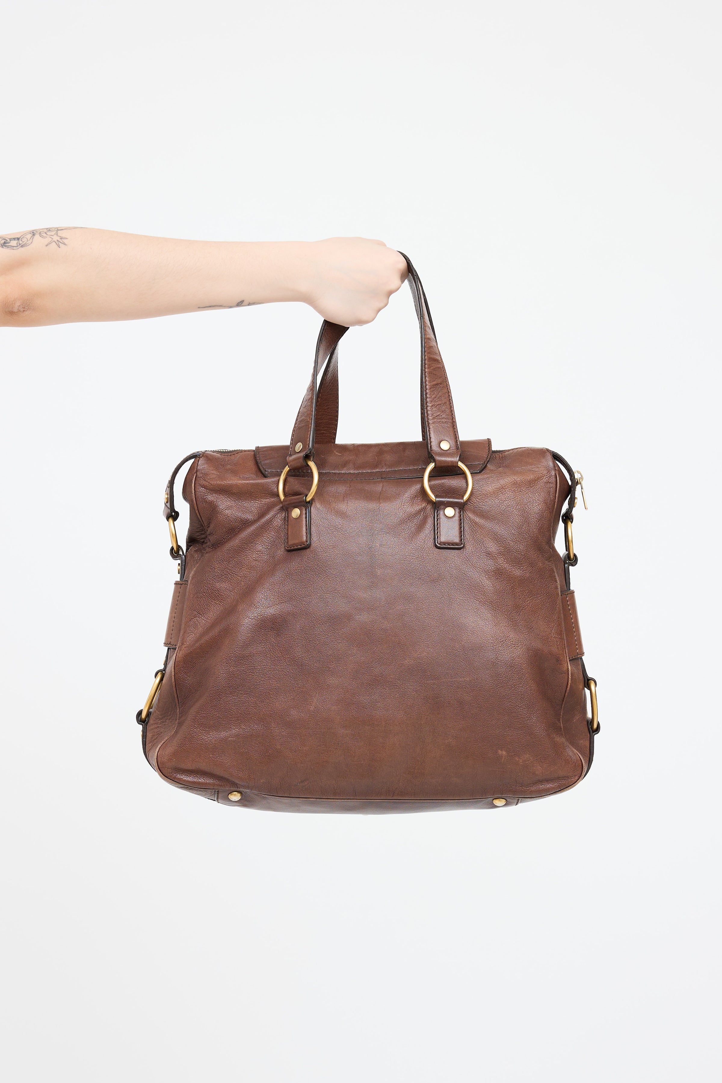 Pre-owned Saint Laurent brown messenger muse bag featuring gold tone hardware, four protective feet at base, dual flat carry handles, side belts. removable shoulder strap, front flap with turn lock, top zip closure, and one lined main compartment with one zip pocket.