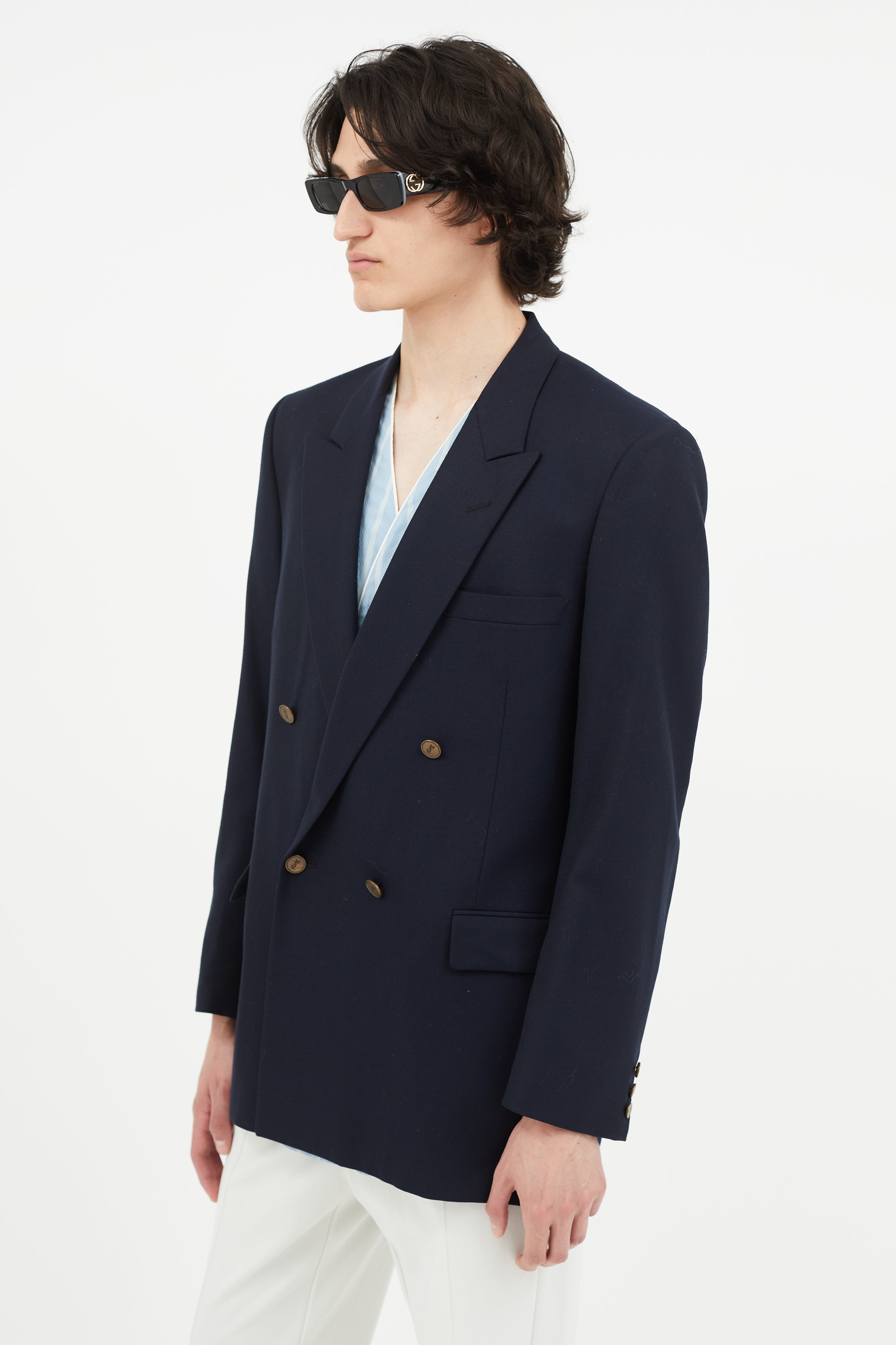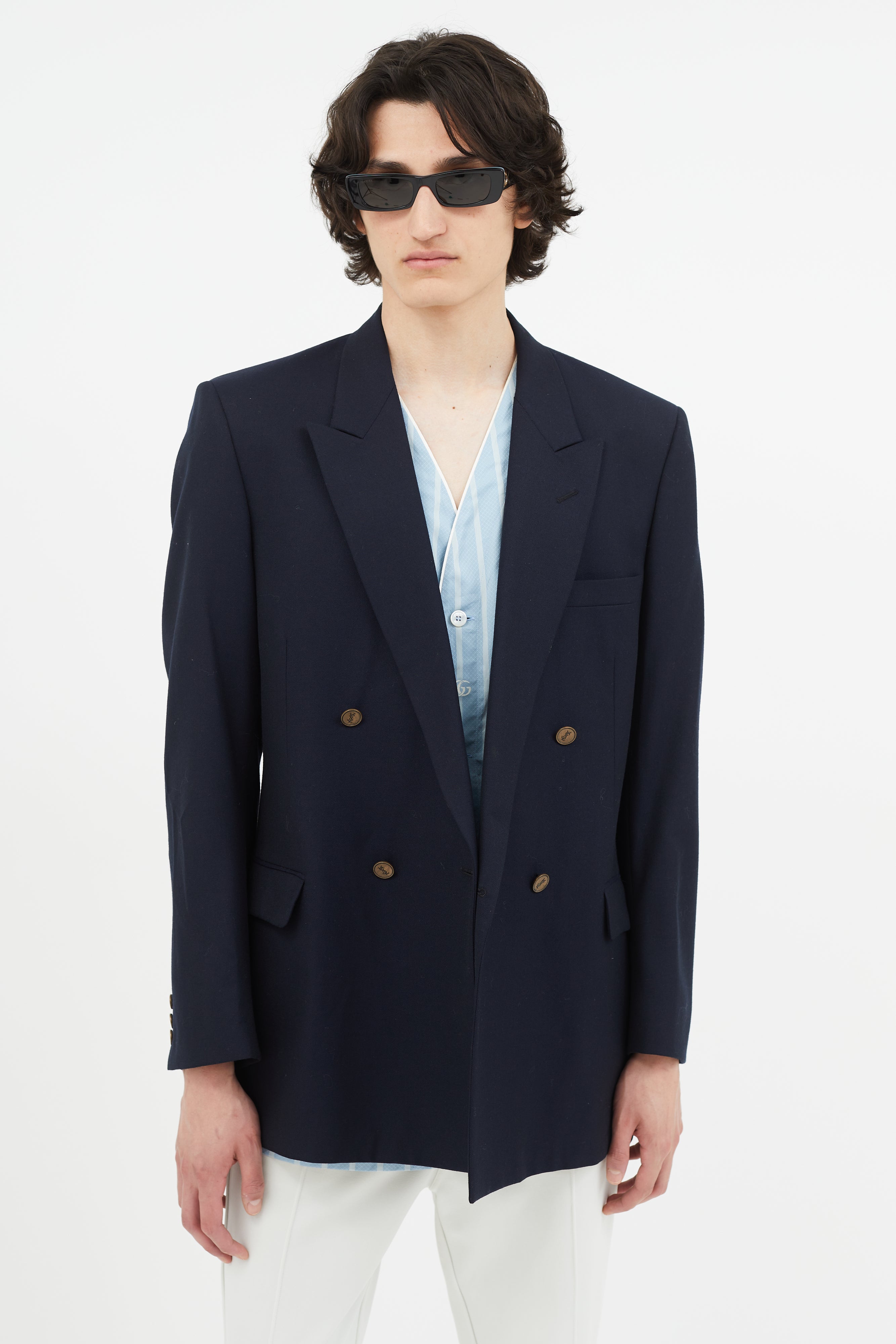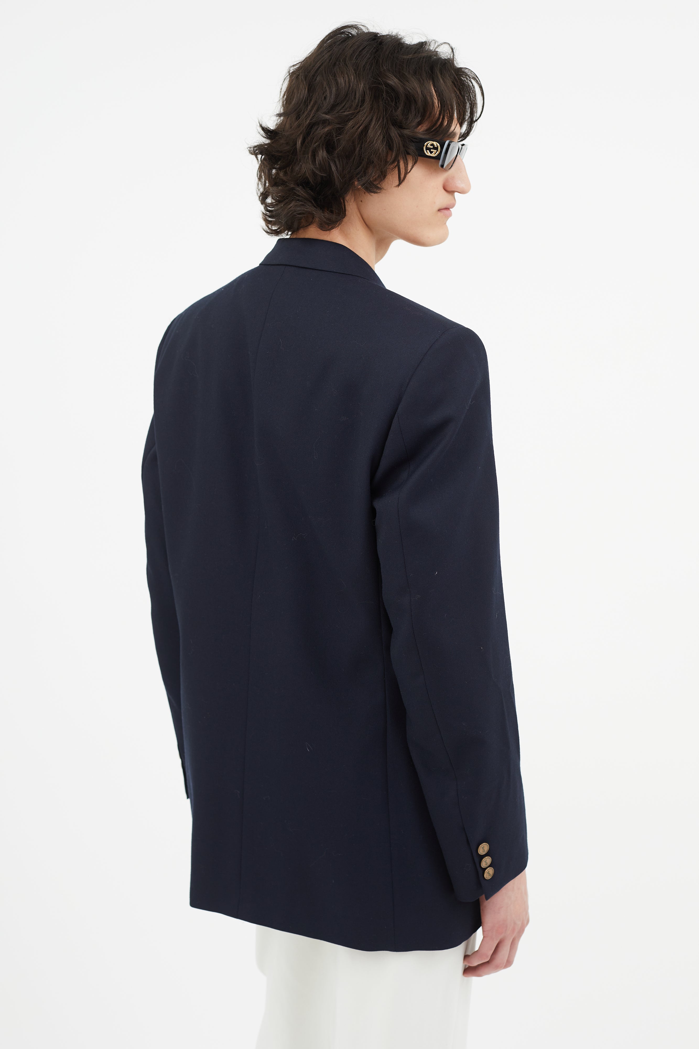 Pre-owned Yves Saint Laurent navy wool blazer featuring peak lapel, long sleeves with button closure at cuffs, one welt pocket at chest, two patch pockets at hip, and a double breasted button closure at front. Lined.