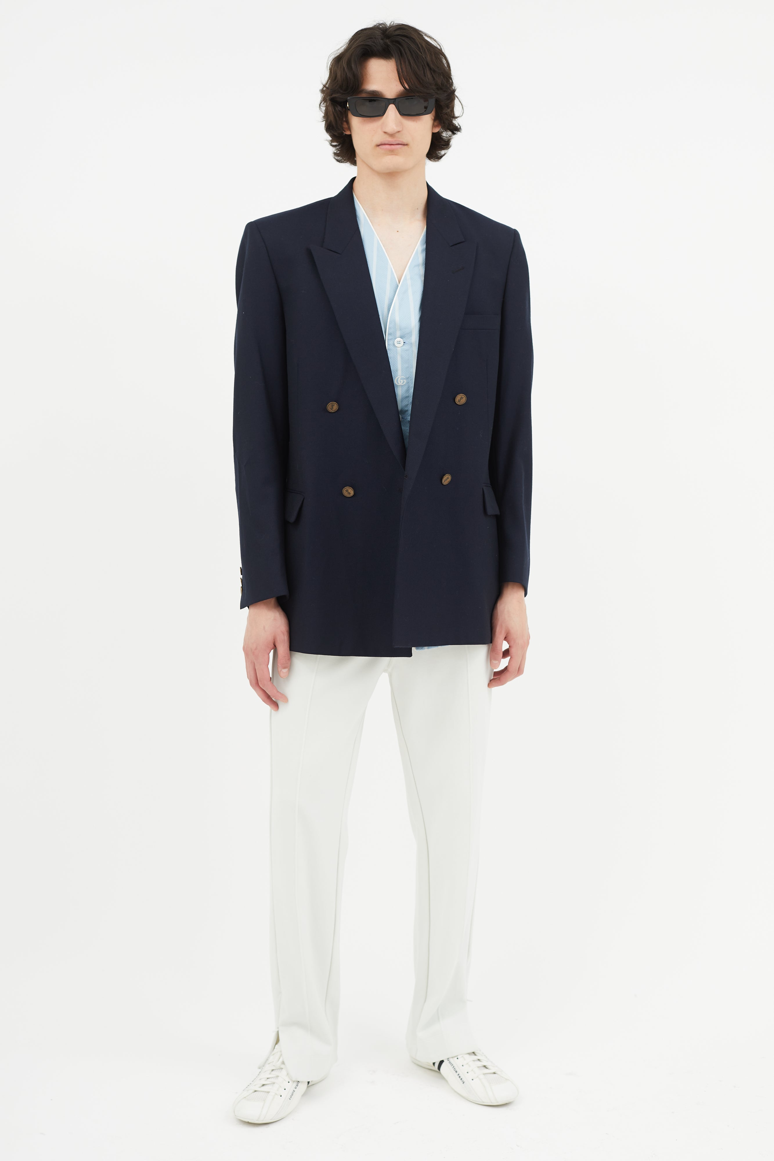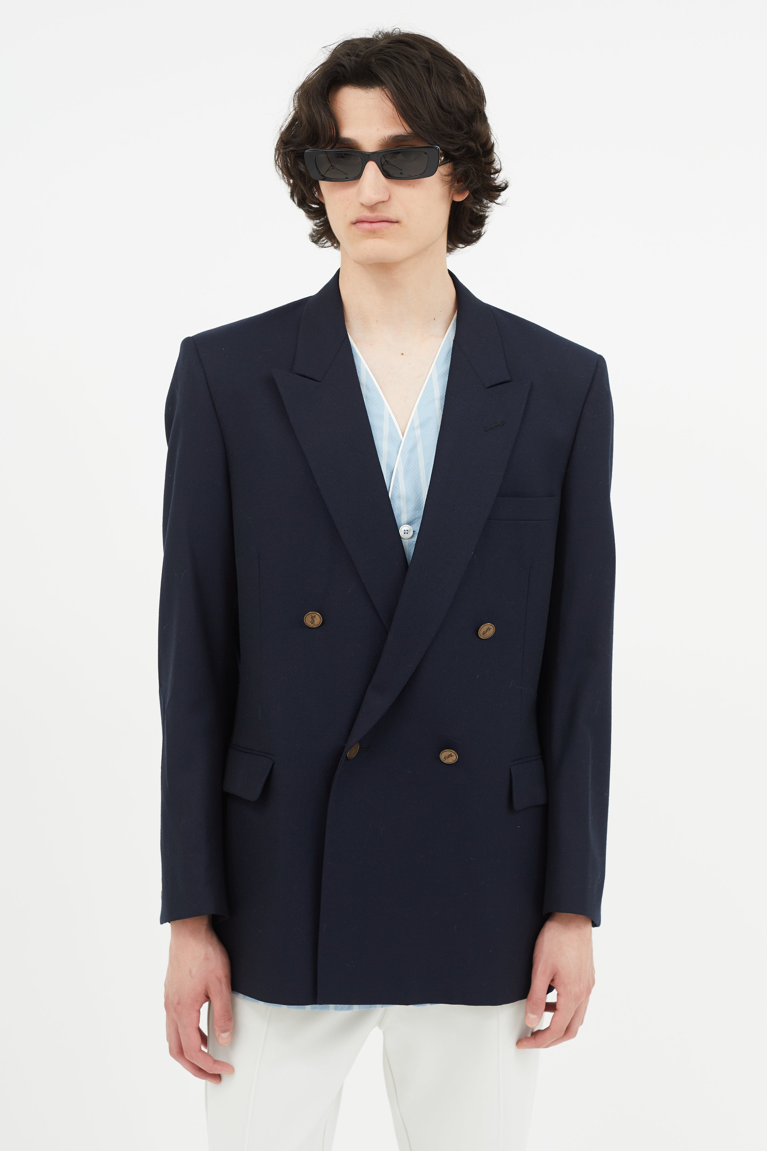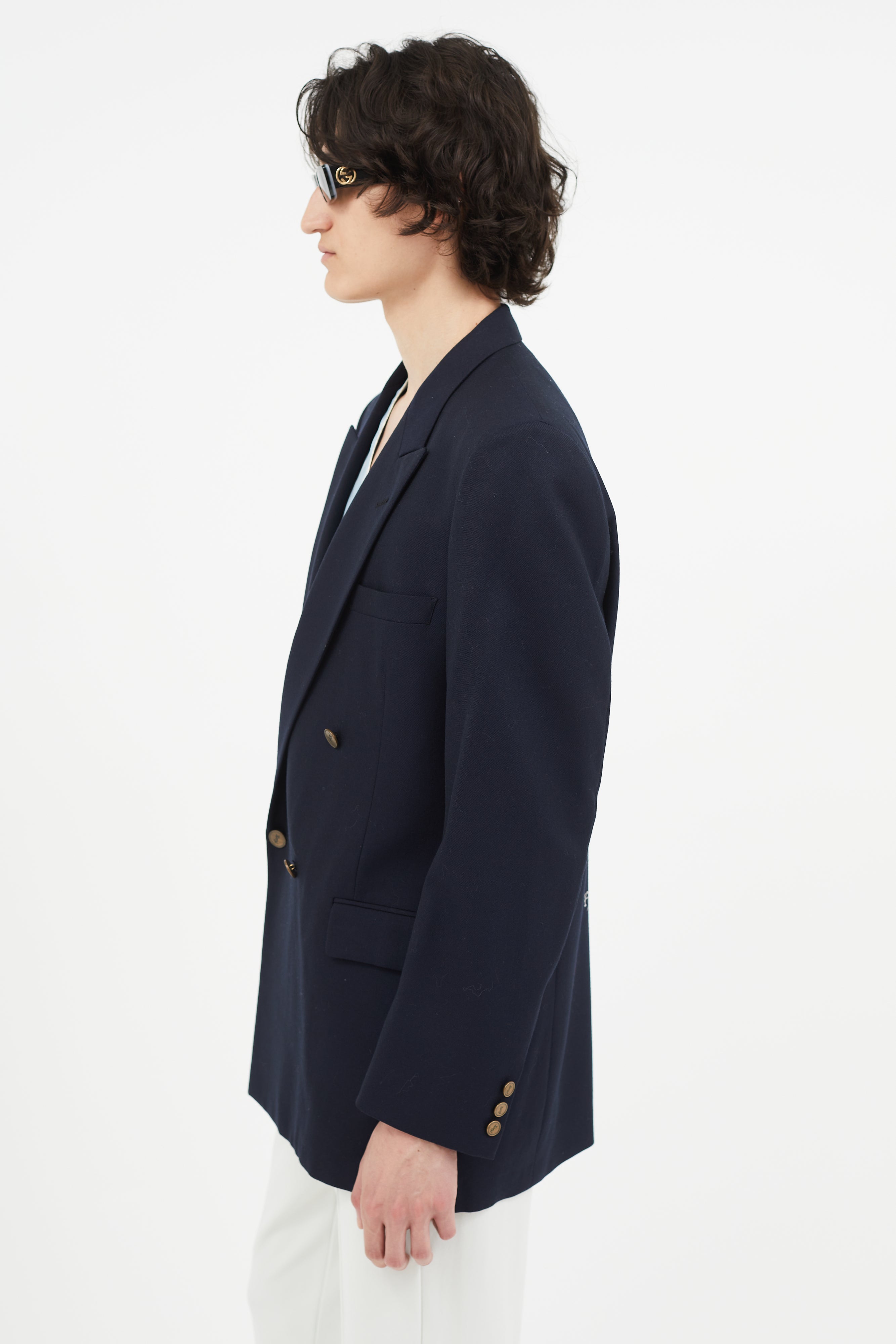 Pre-owned Yves Saint Laurent navy wool blazer featuring peak lapel, long sleeves with button closure at cuffs, one welt pocket at chest, two patch pockets at hip, and a double breasted button closure at front. Lined.