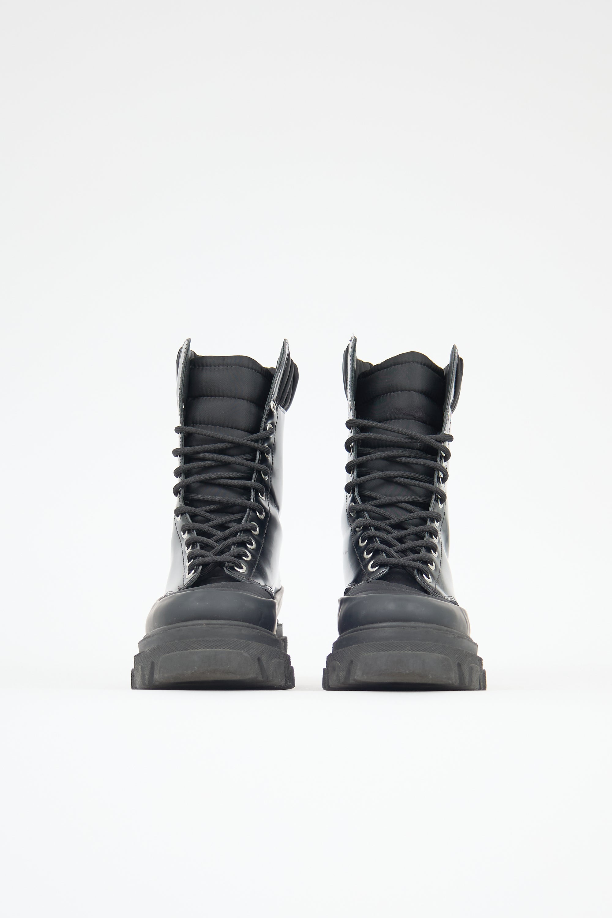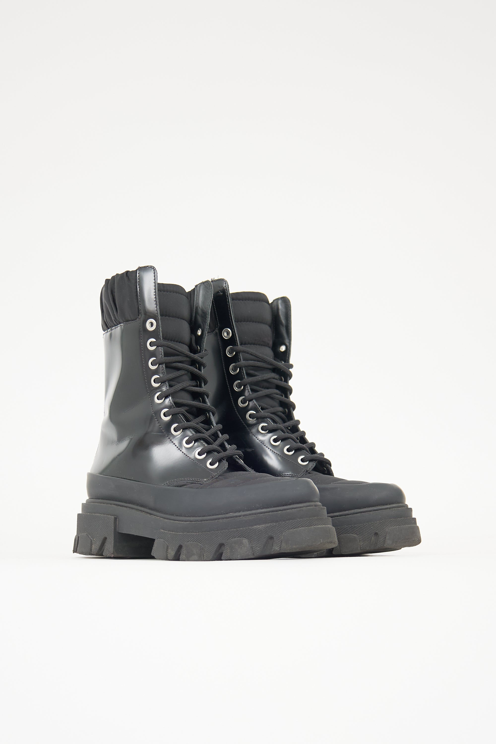 Pre-owned Ganni black leather combat boots featuring rounded toe, quilted nylon lace up vamp, gathered collar, tonal embossed logo at shaft, and rubber lug sole.