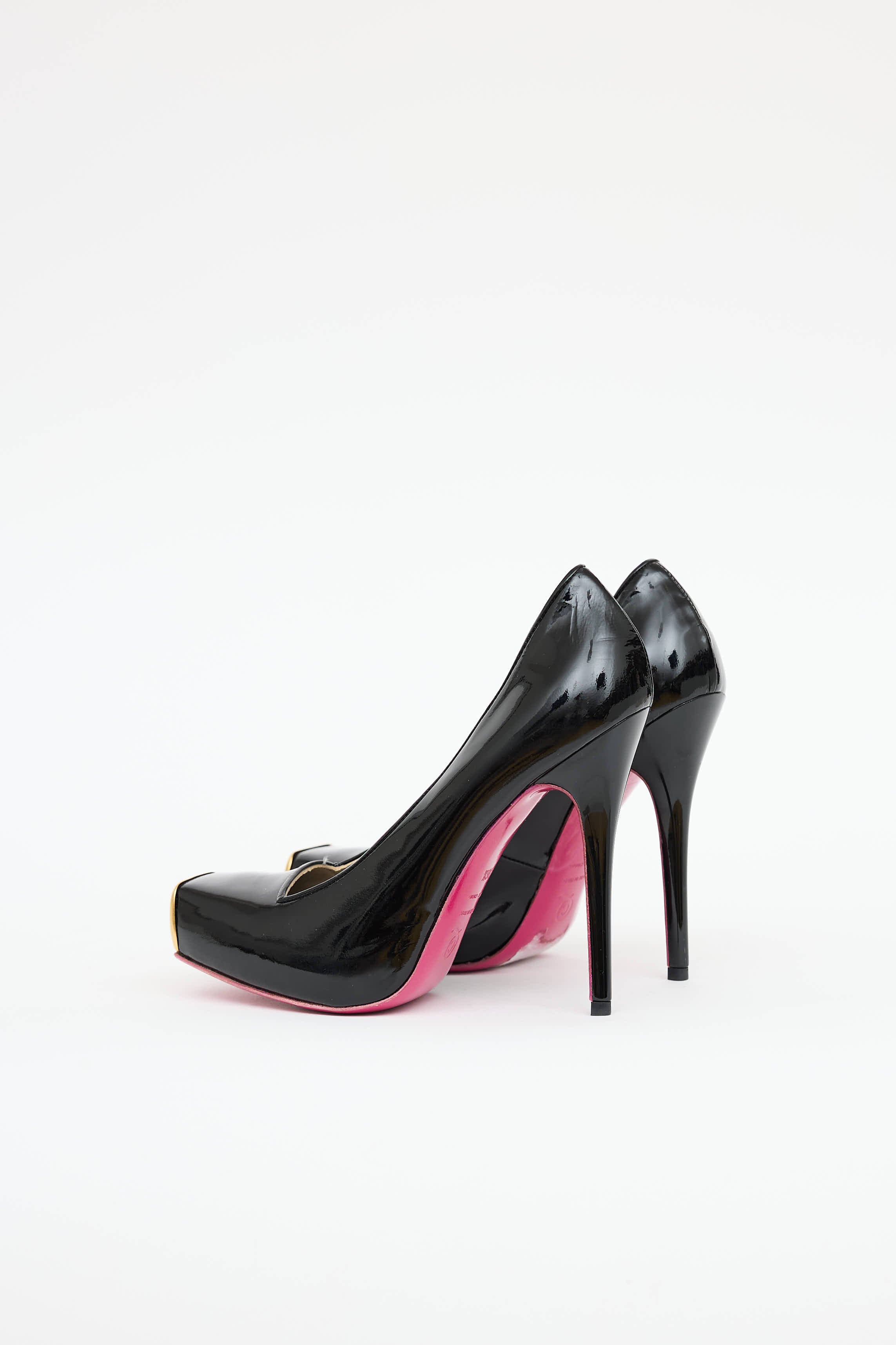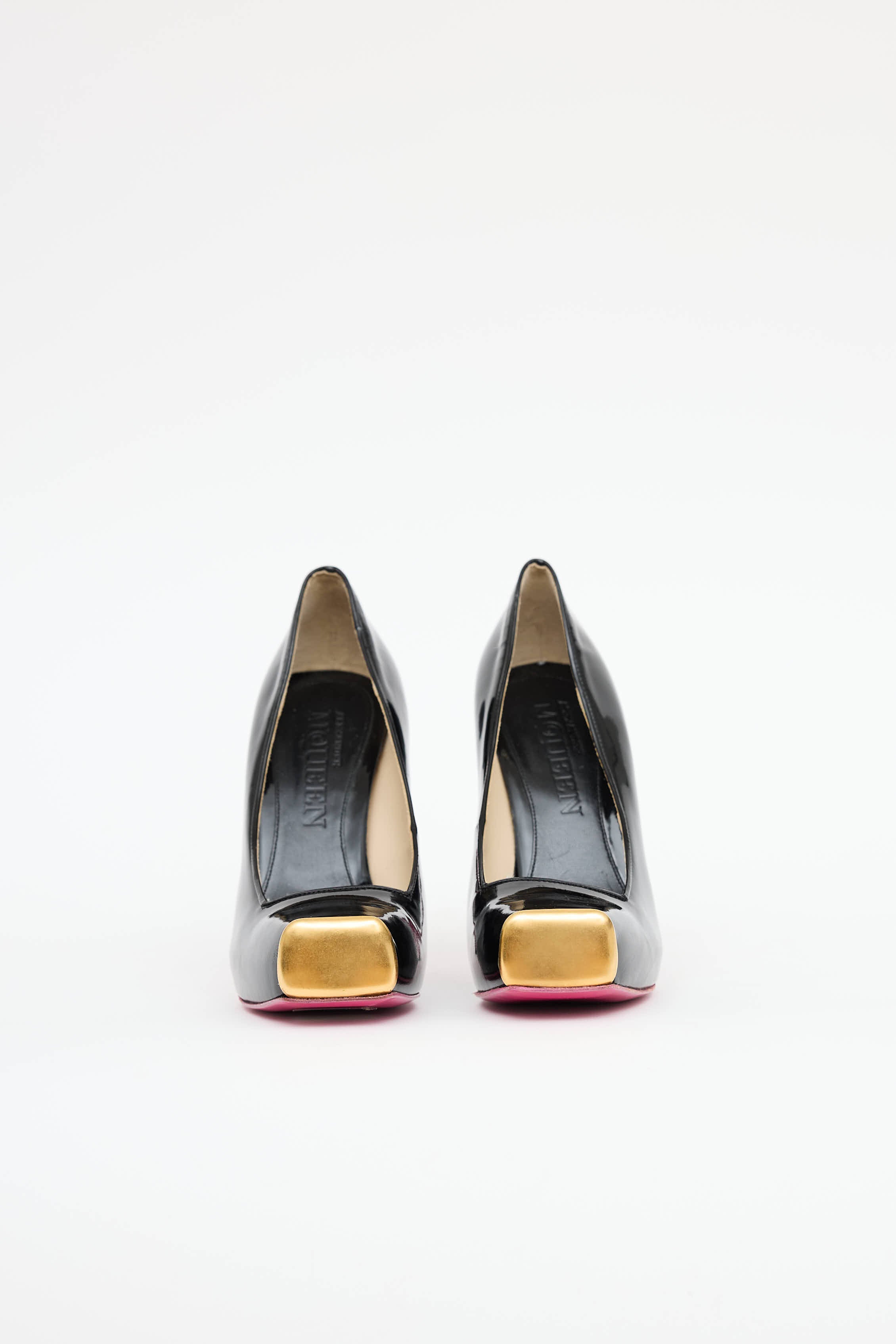 Pre-owned Alexander McQueen black patent leather pump featuring a gold tone ballerina square toe, pink lacquered heels, and covered heel.