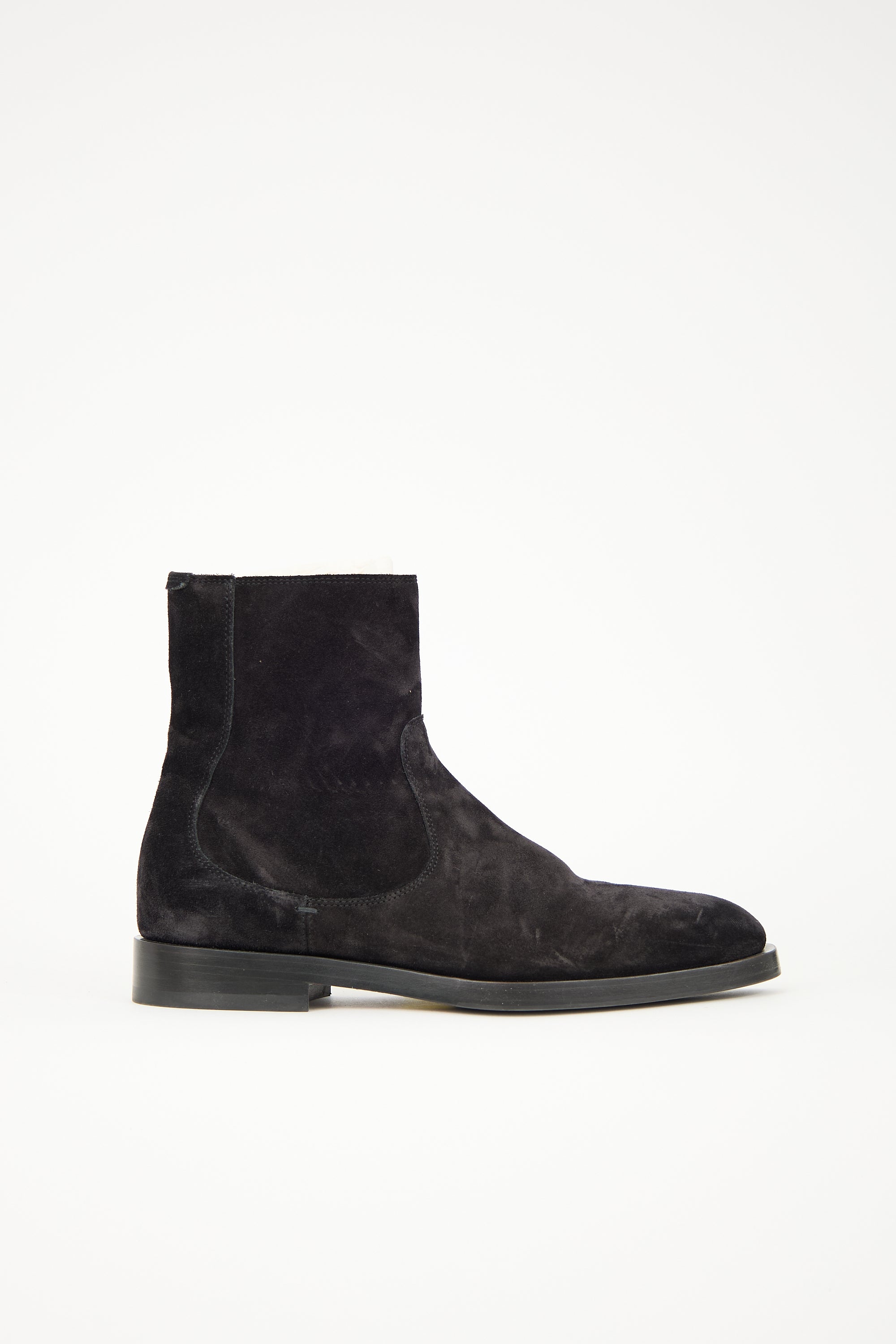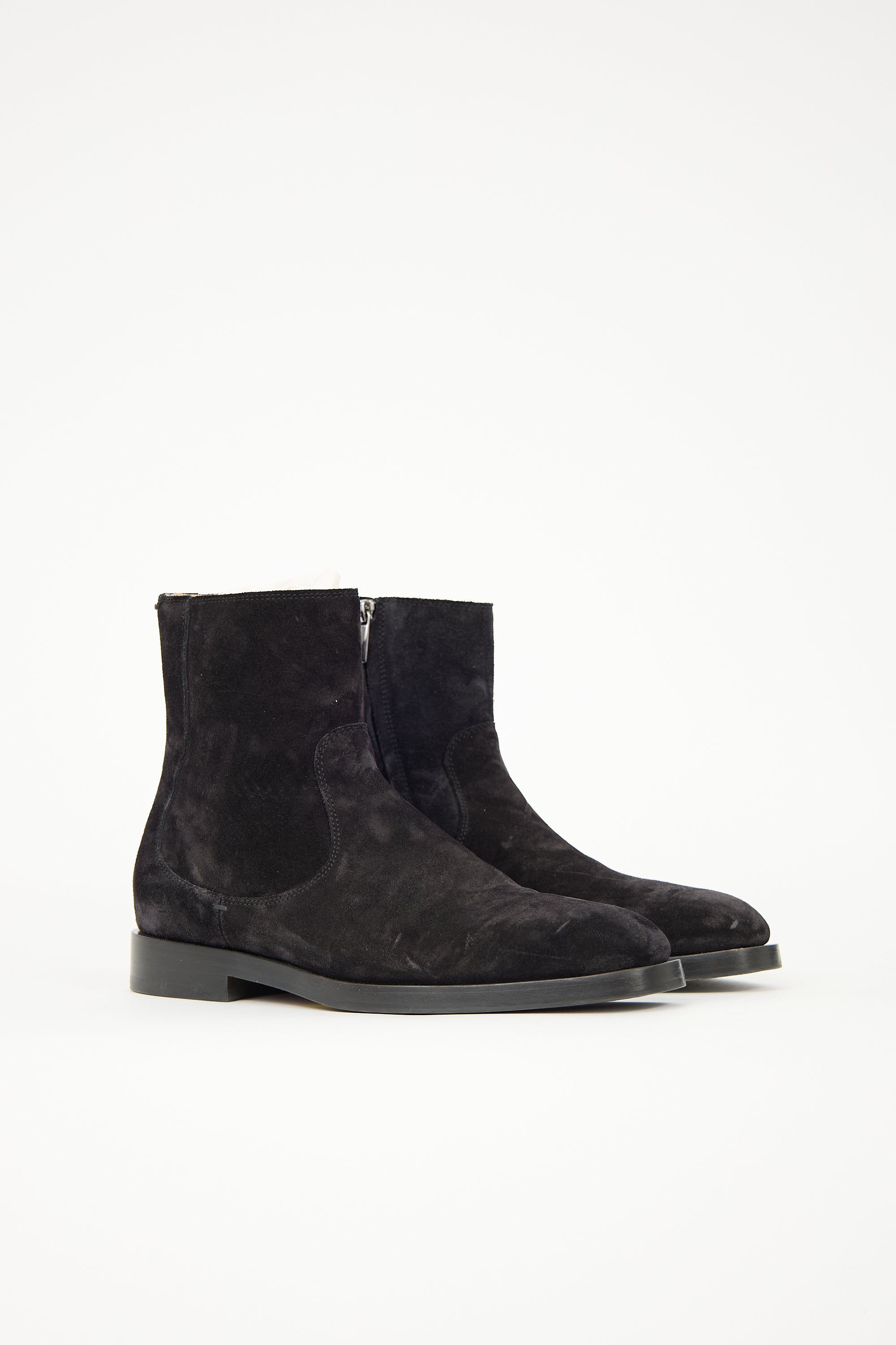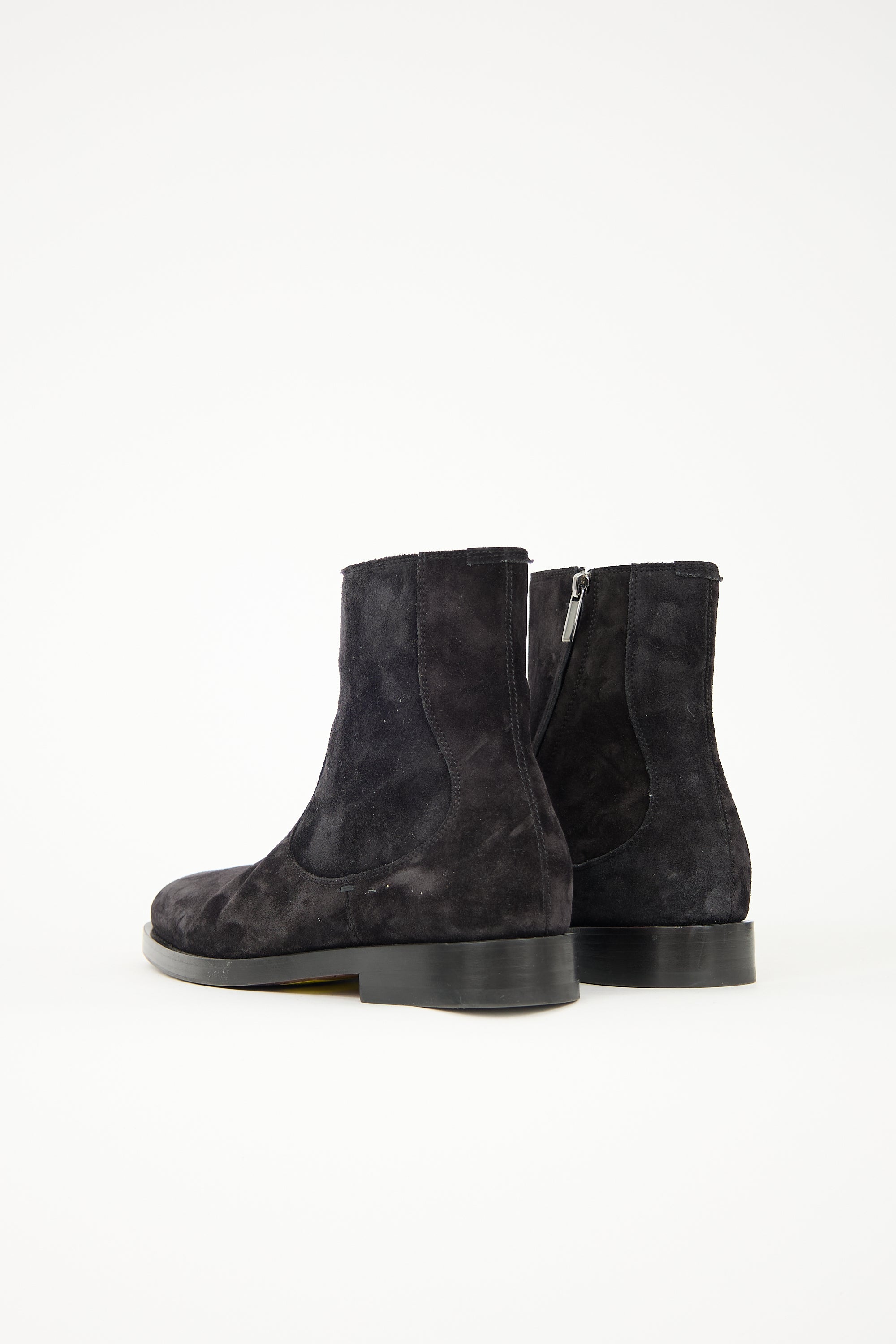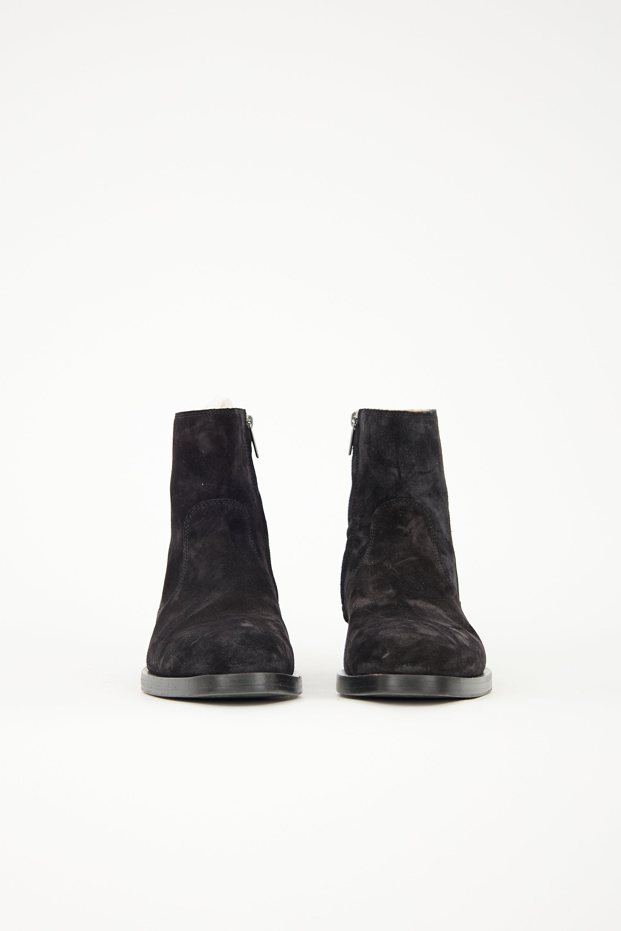 Pre-owned Brunello Cucinelli black suede ankle boots featuring tapered square toe, inner side zip closure, and short stacked heel.