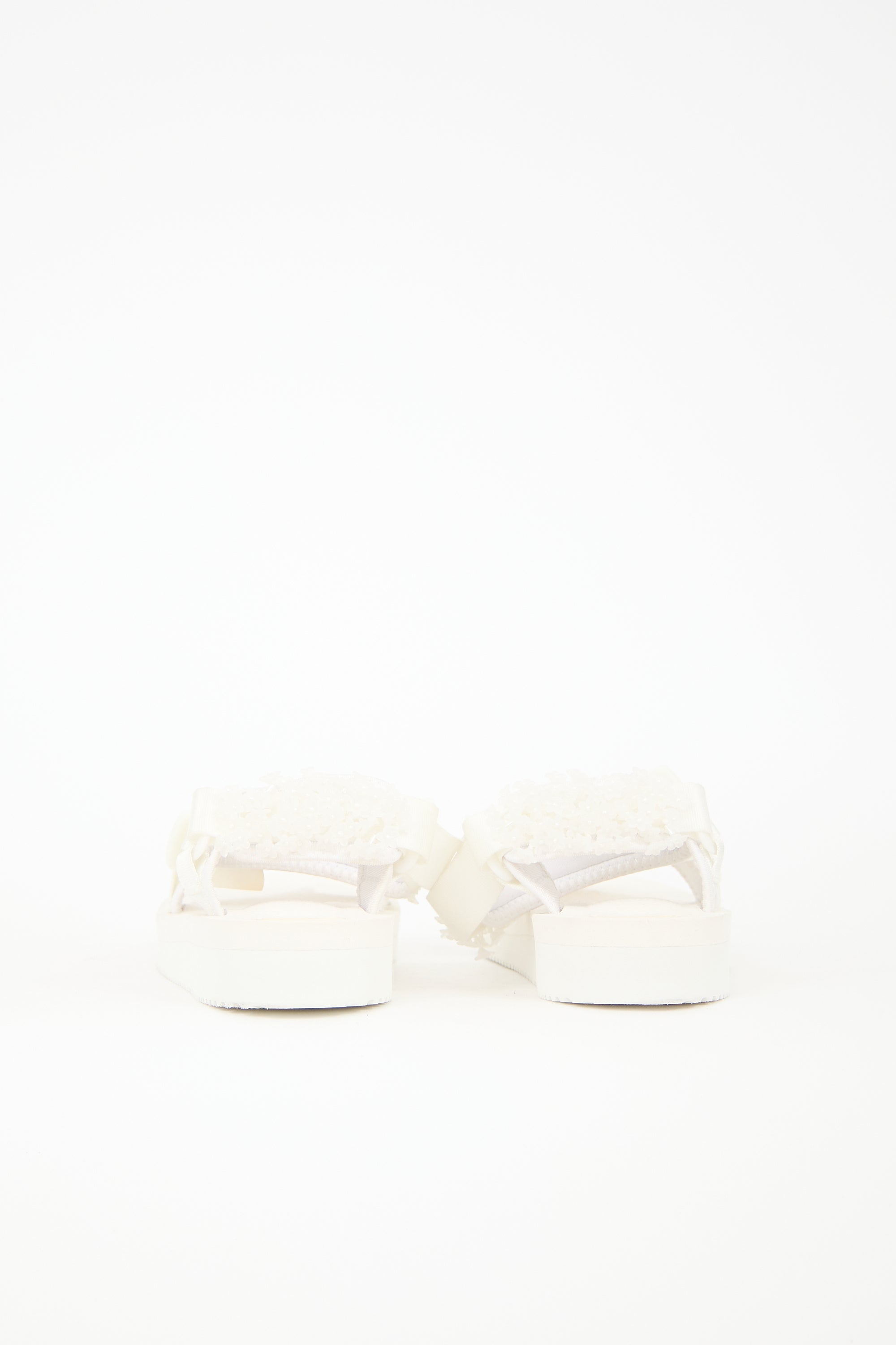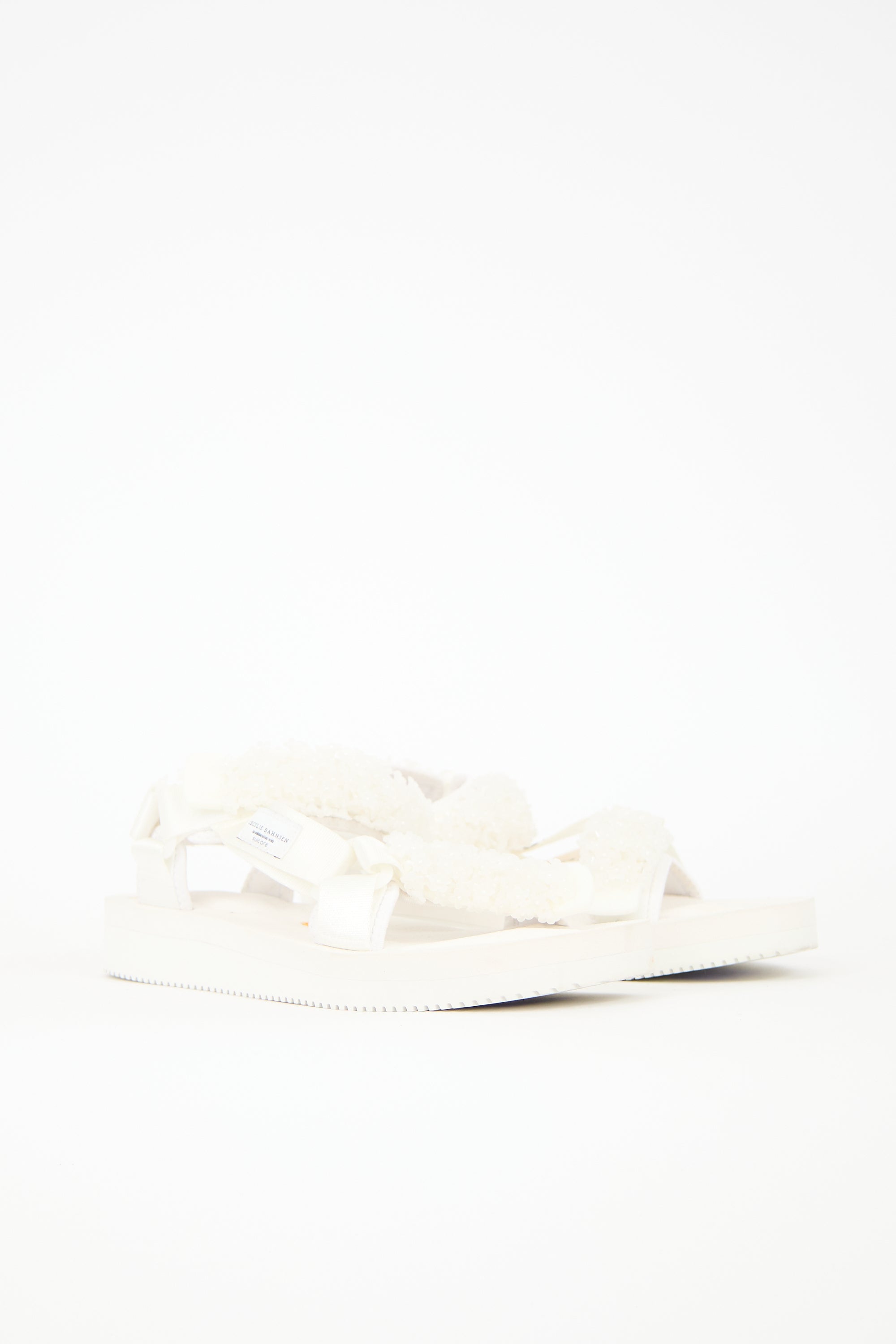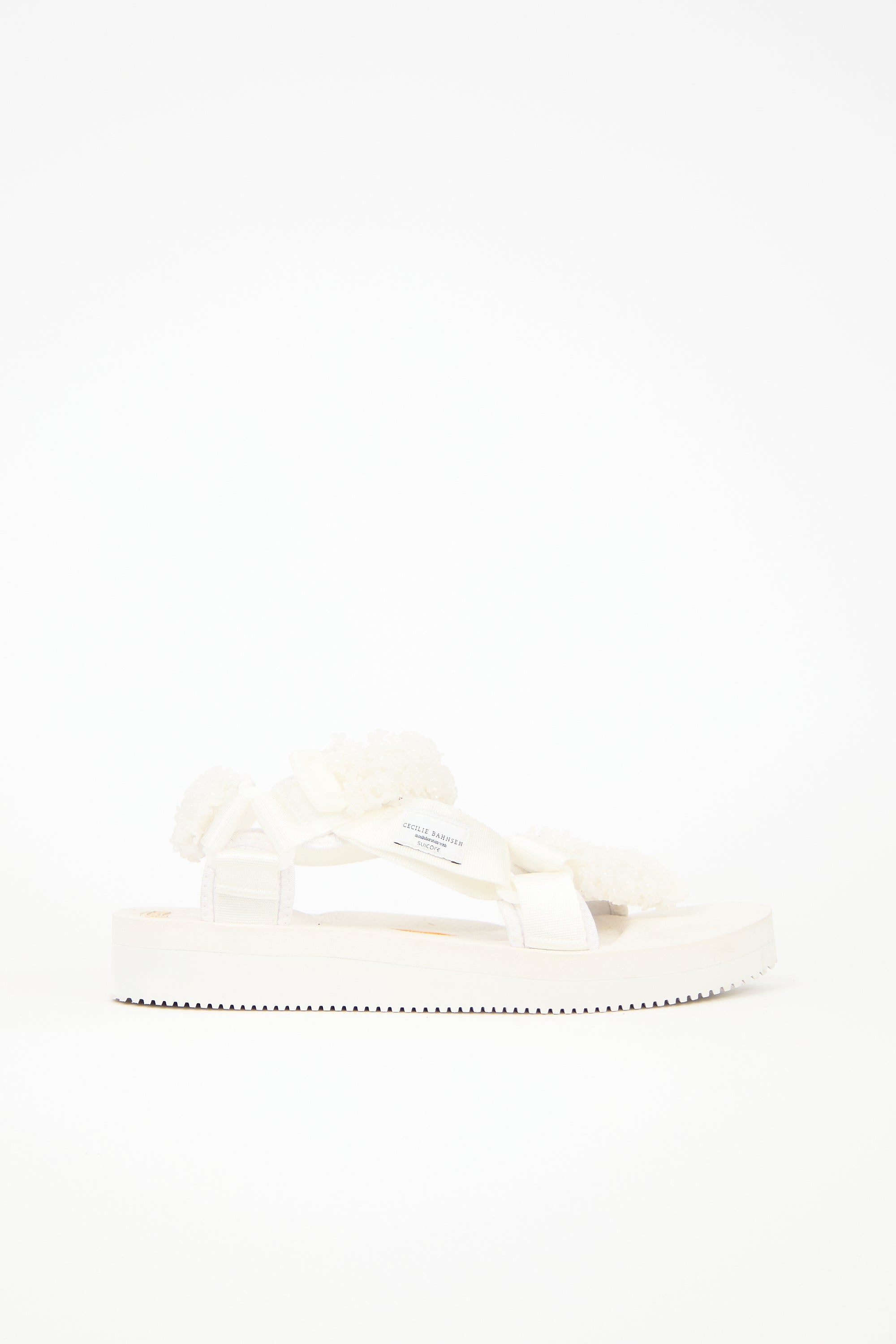 Pre-owned Cecilie Bahnsen X Suicoke white Maria sandals featuring rounded toe, flower bead embellished upper, Velcro straps, and Vibram rubber sole.
