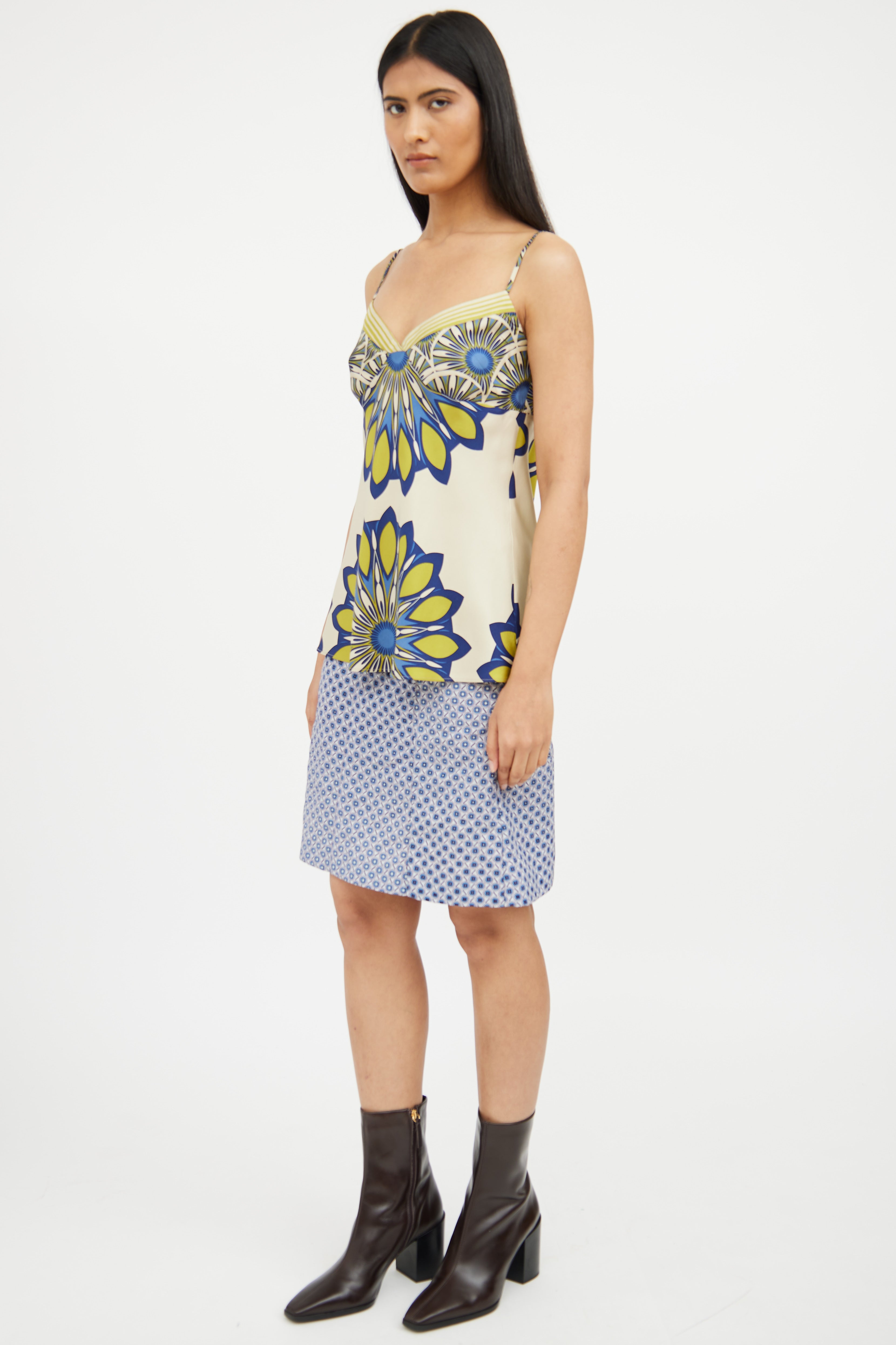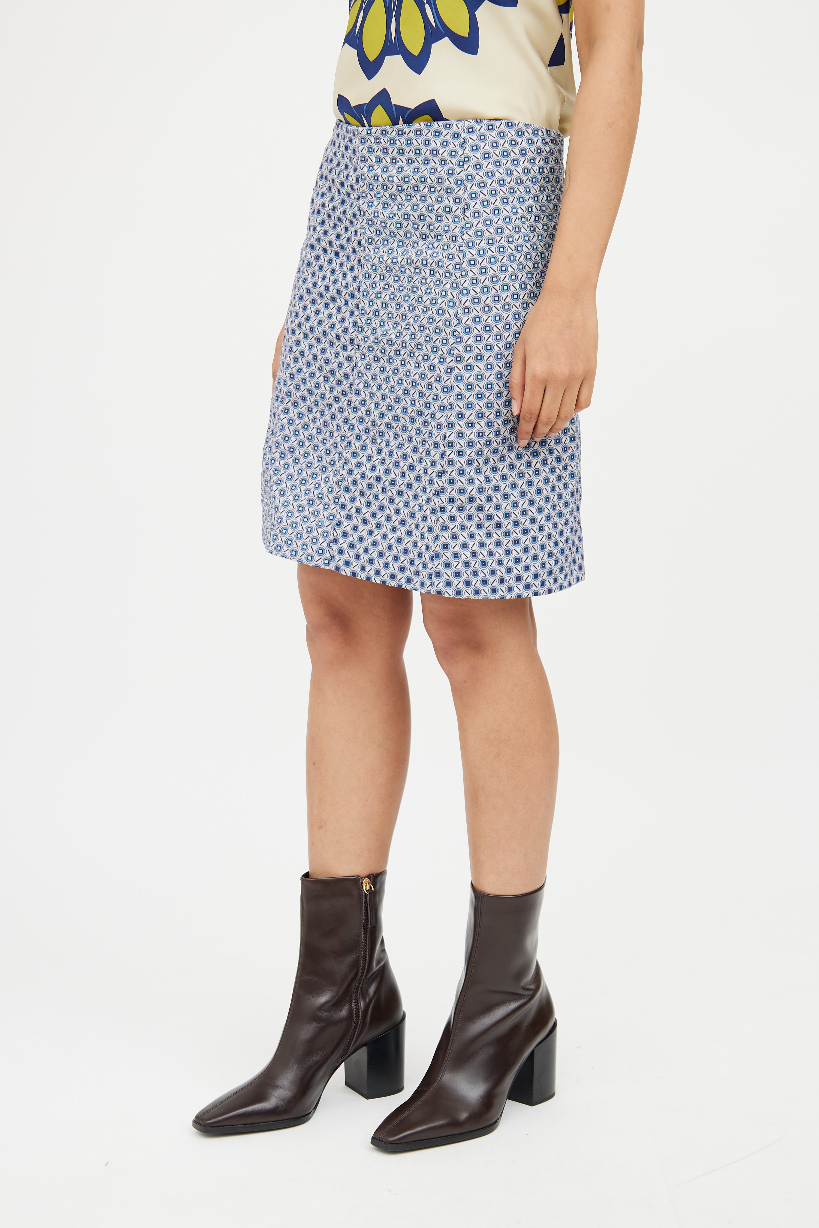 Pre-owned Marni blue multi colour skirt featuring centre seams, abstract print and zip entry back.