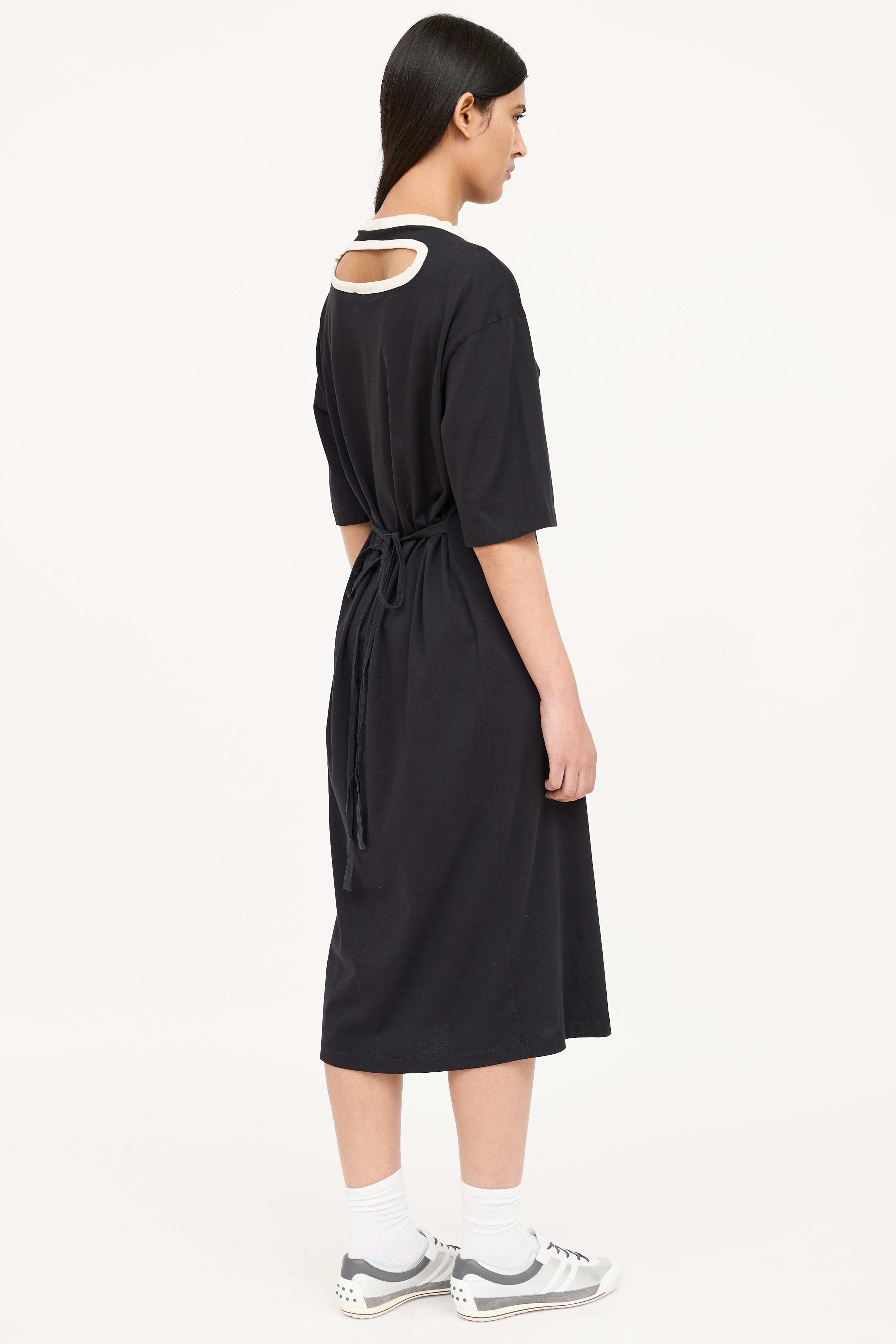 Pre-owned Marni black and white short sleeve dress featuring round neckline with contrast trim, embroidered logo patch at bottom and oval cut out and tie at back.