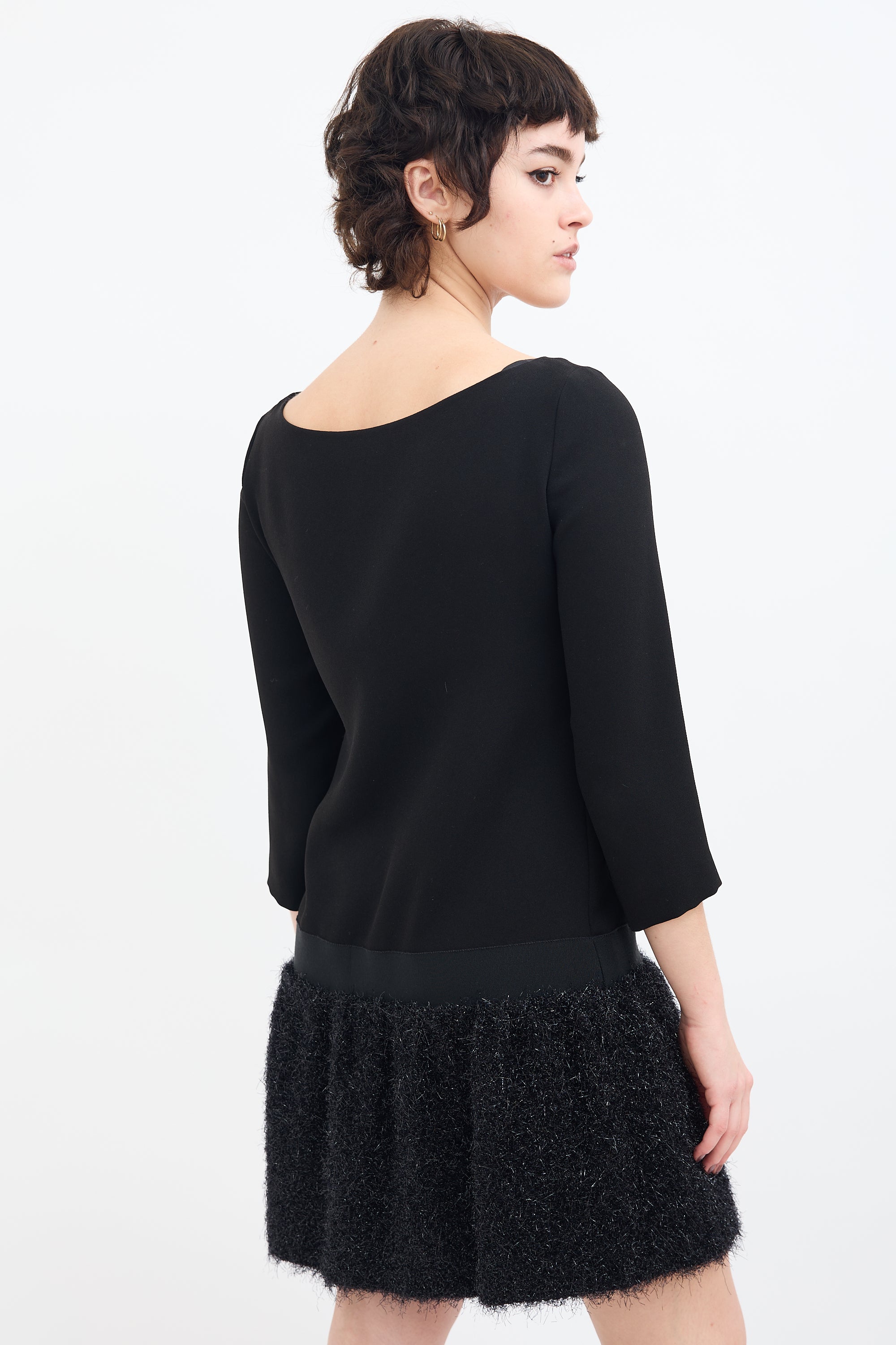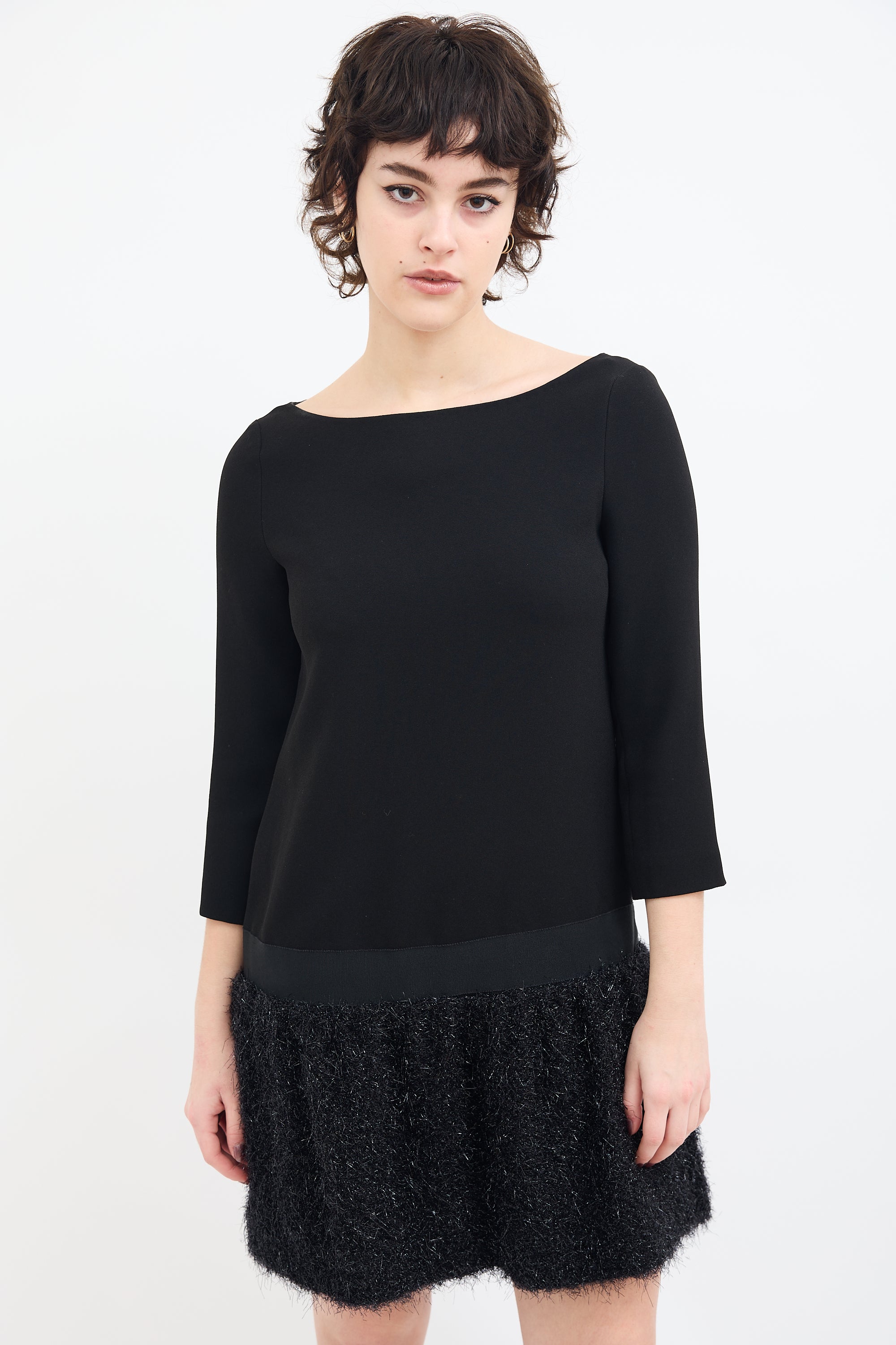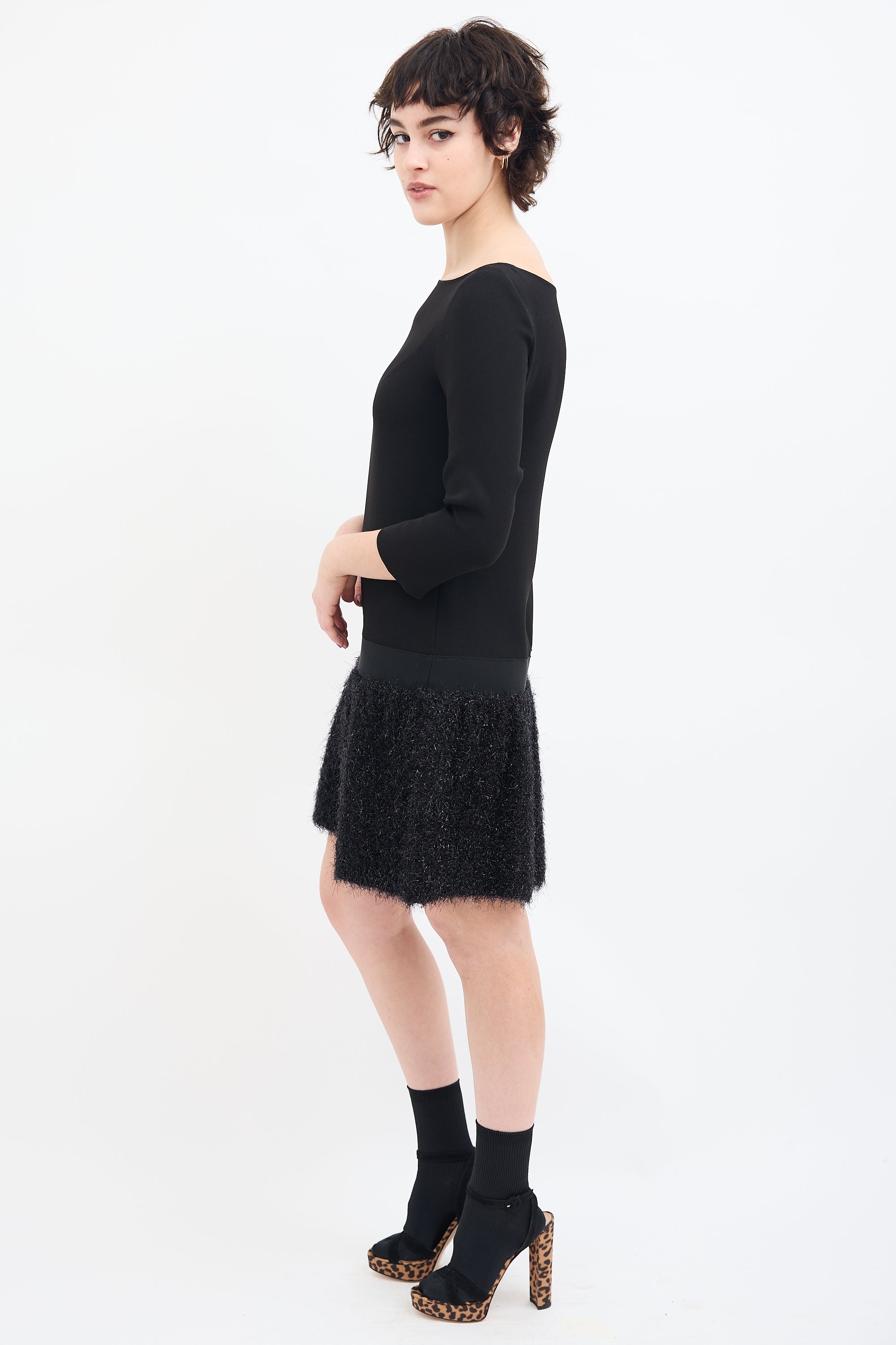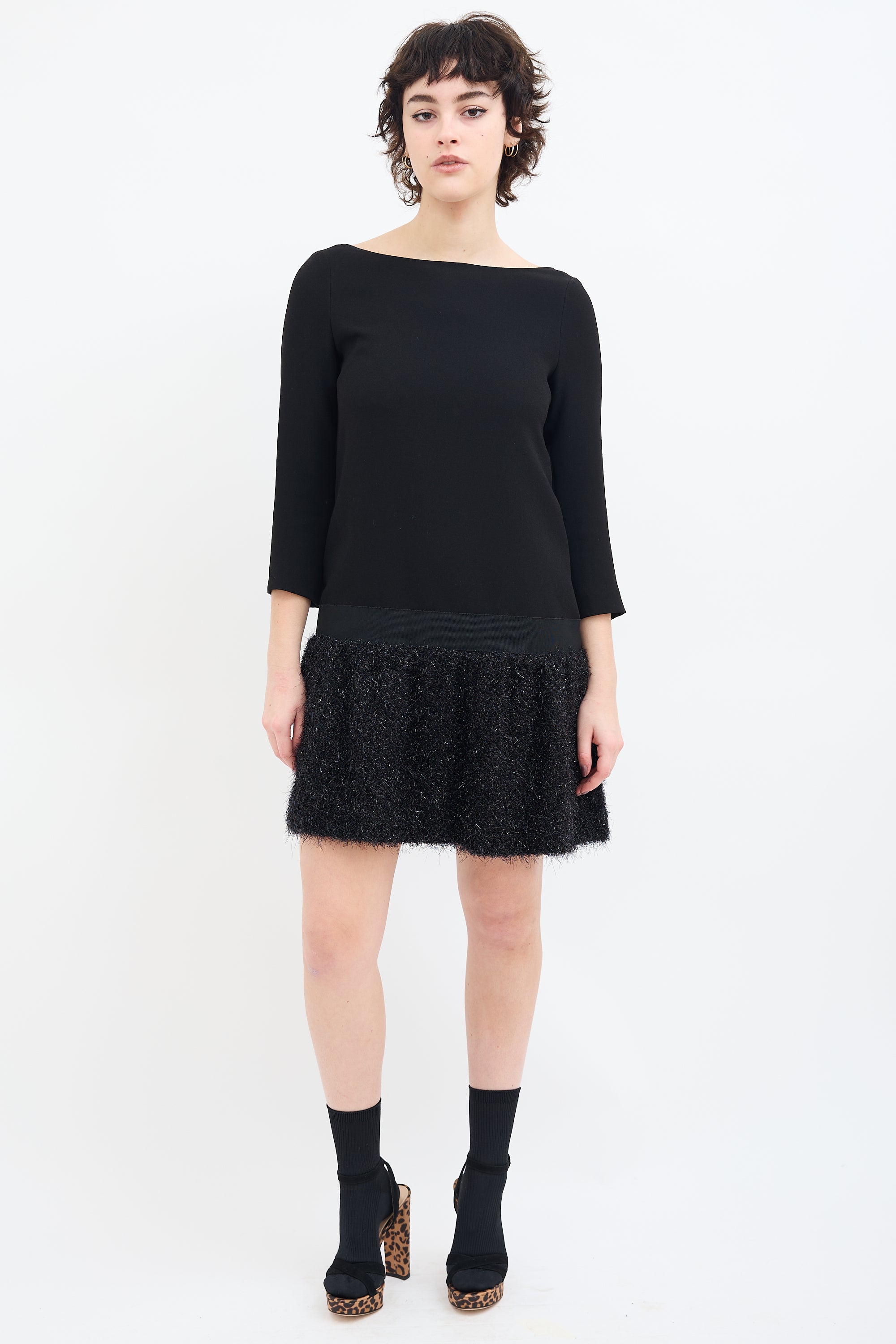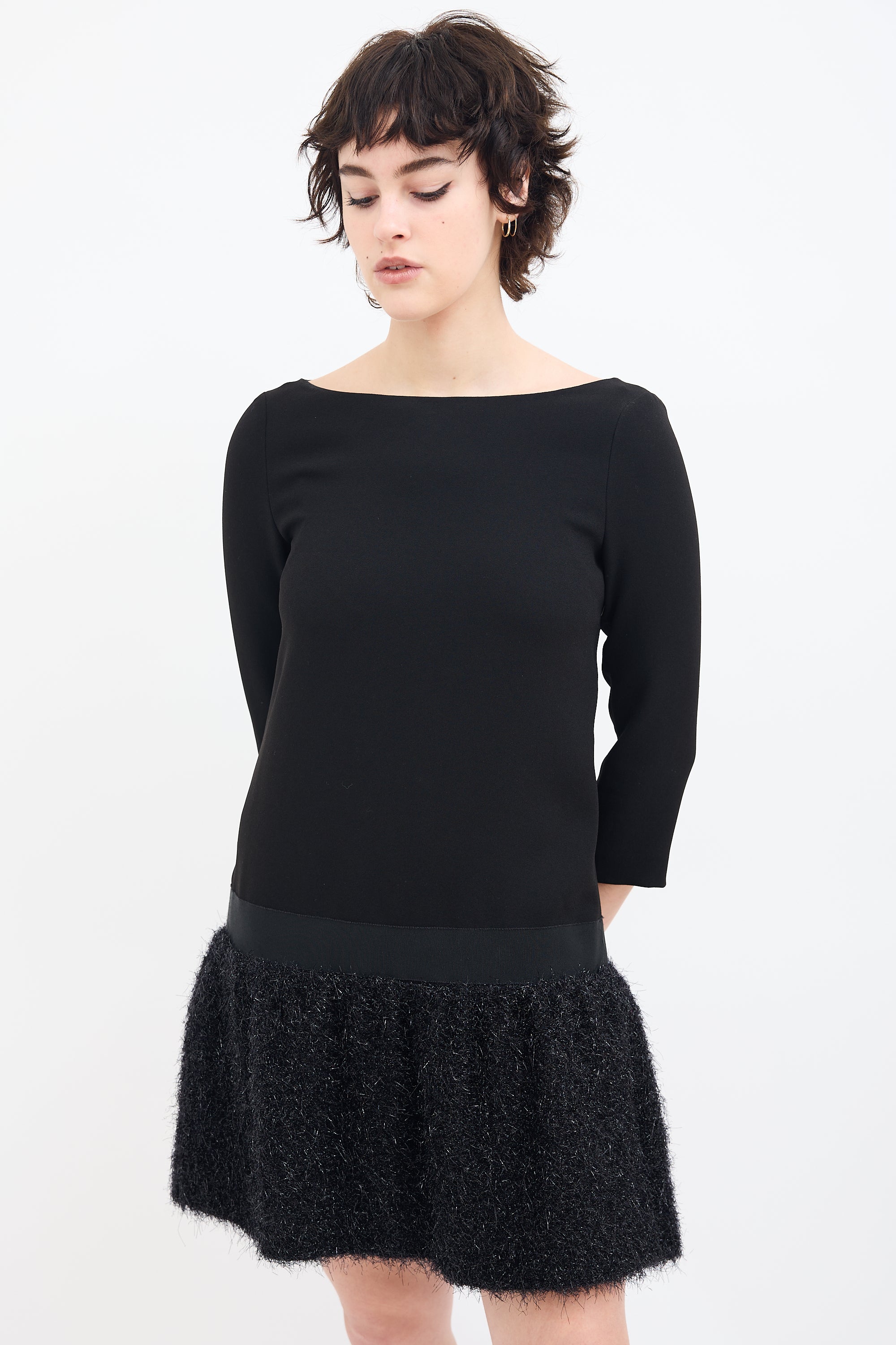 Pre-owned Moschino black midi dress featuring a bateau neckline, dropped waist, tinsel hem with grosgrain trim, three quarter length sleeves, and concealed side zip closure. Partially lined.