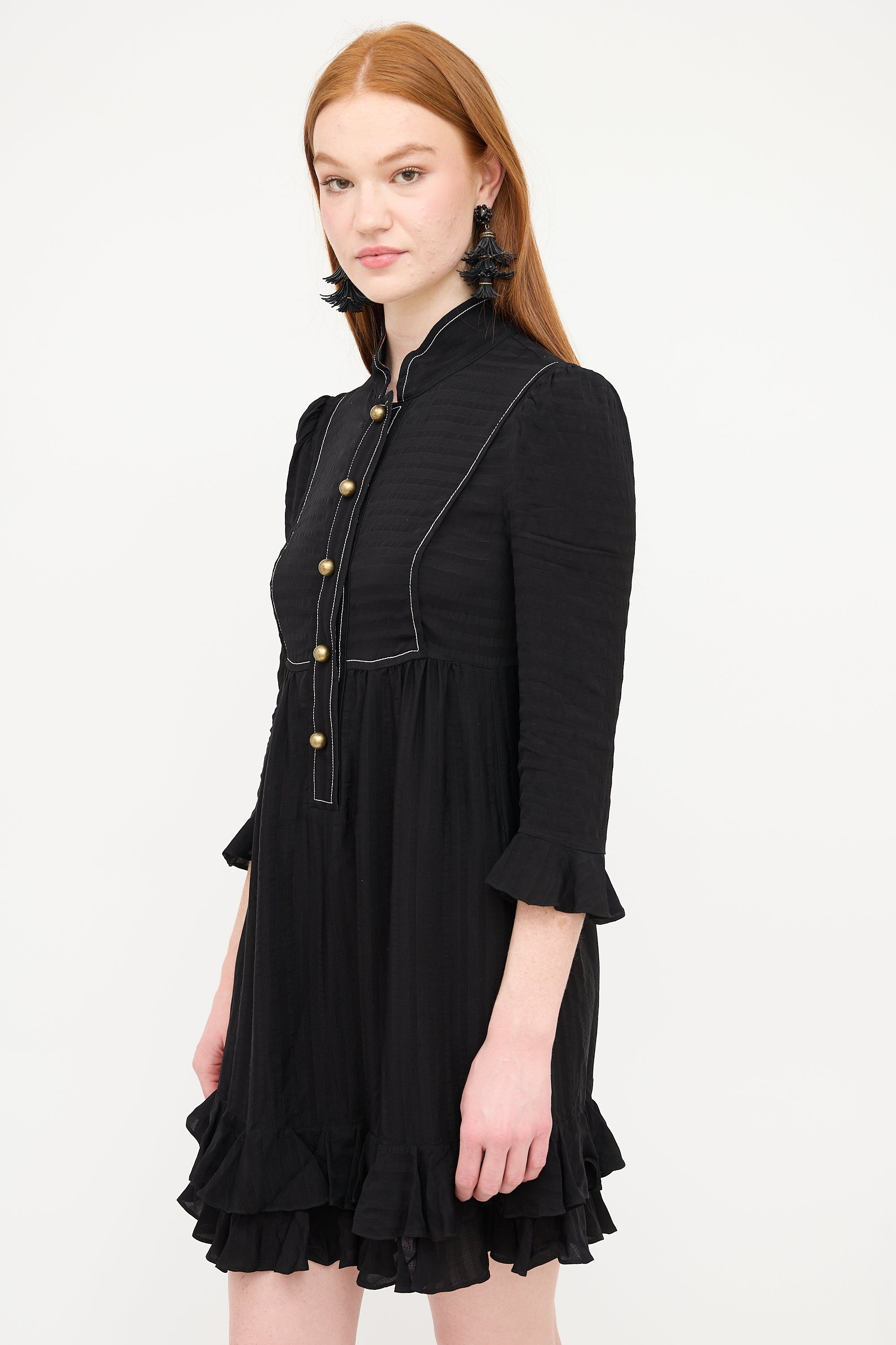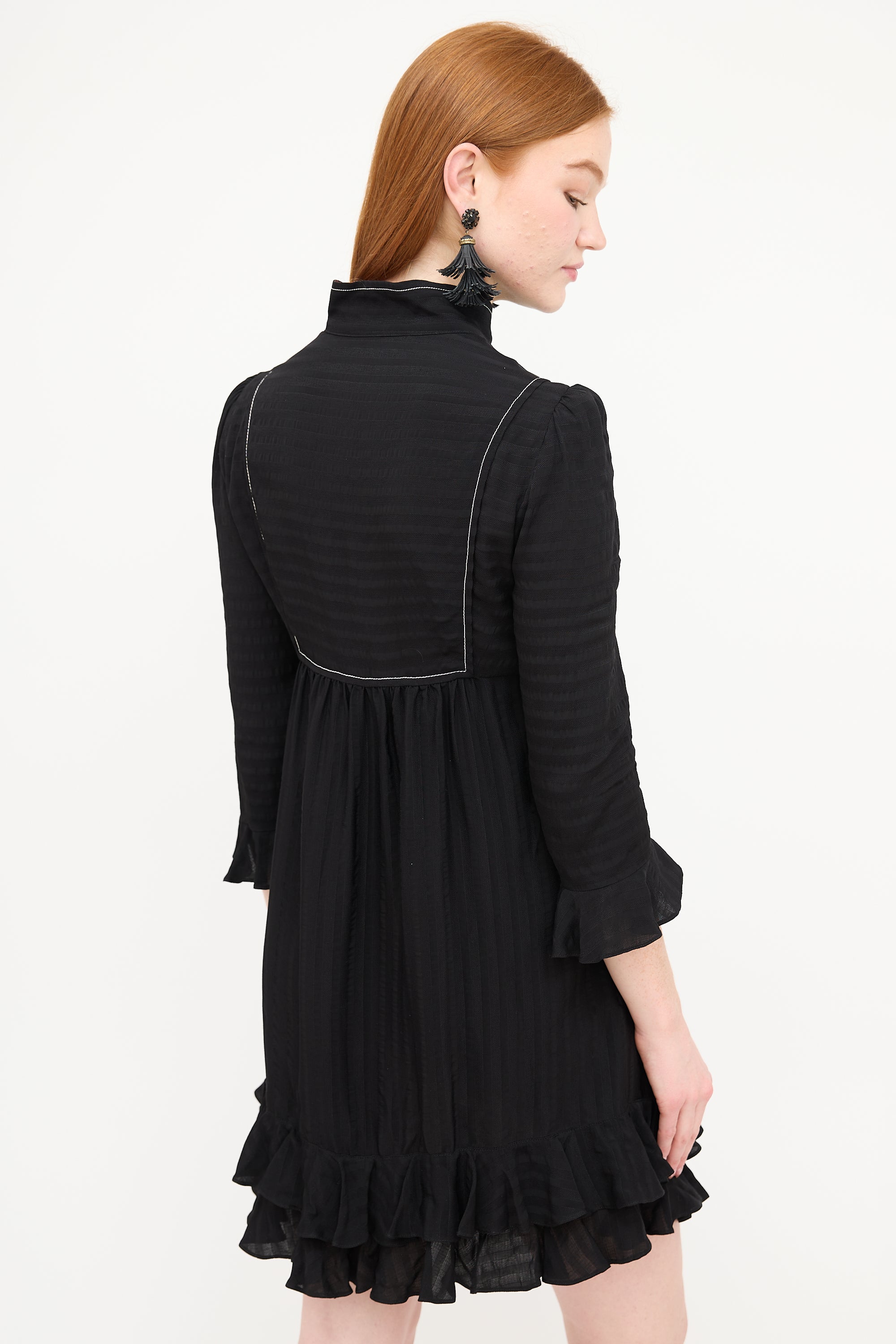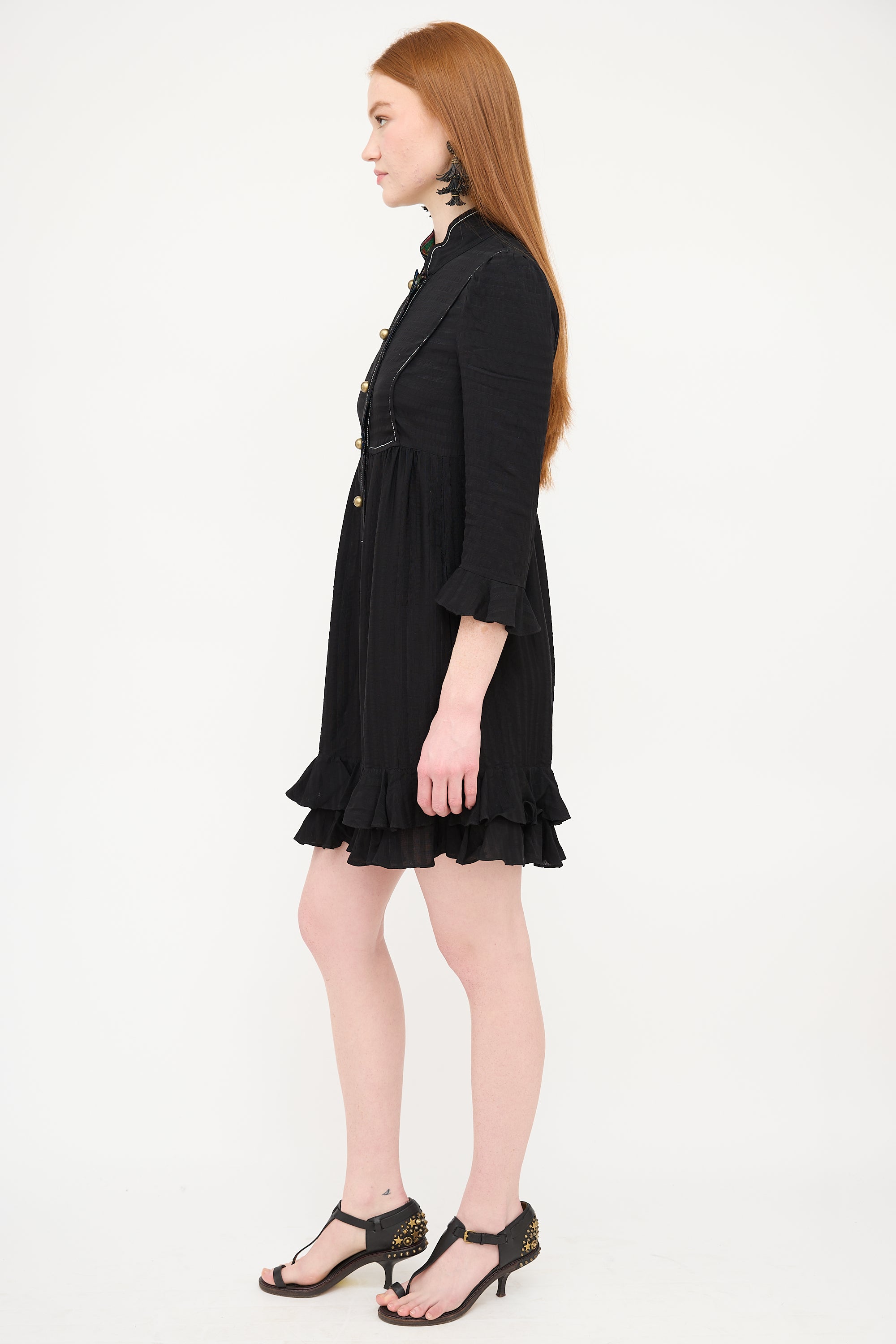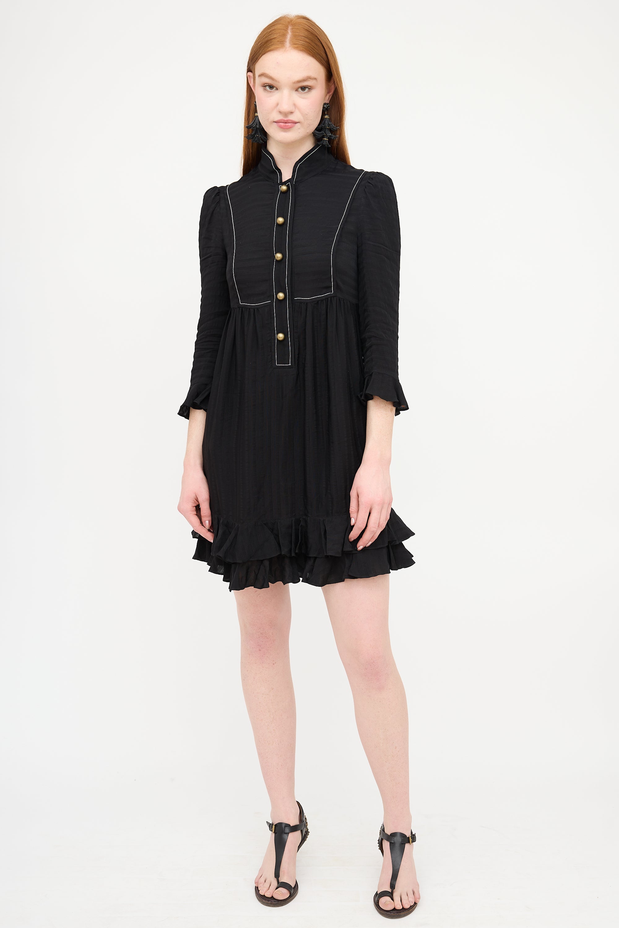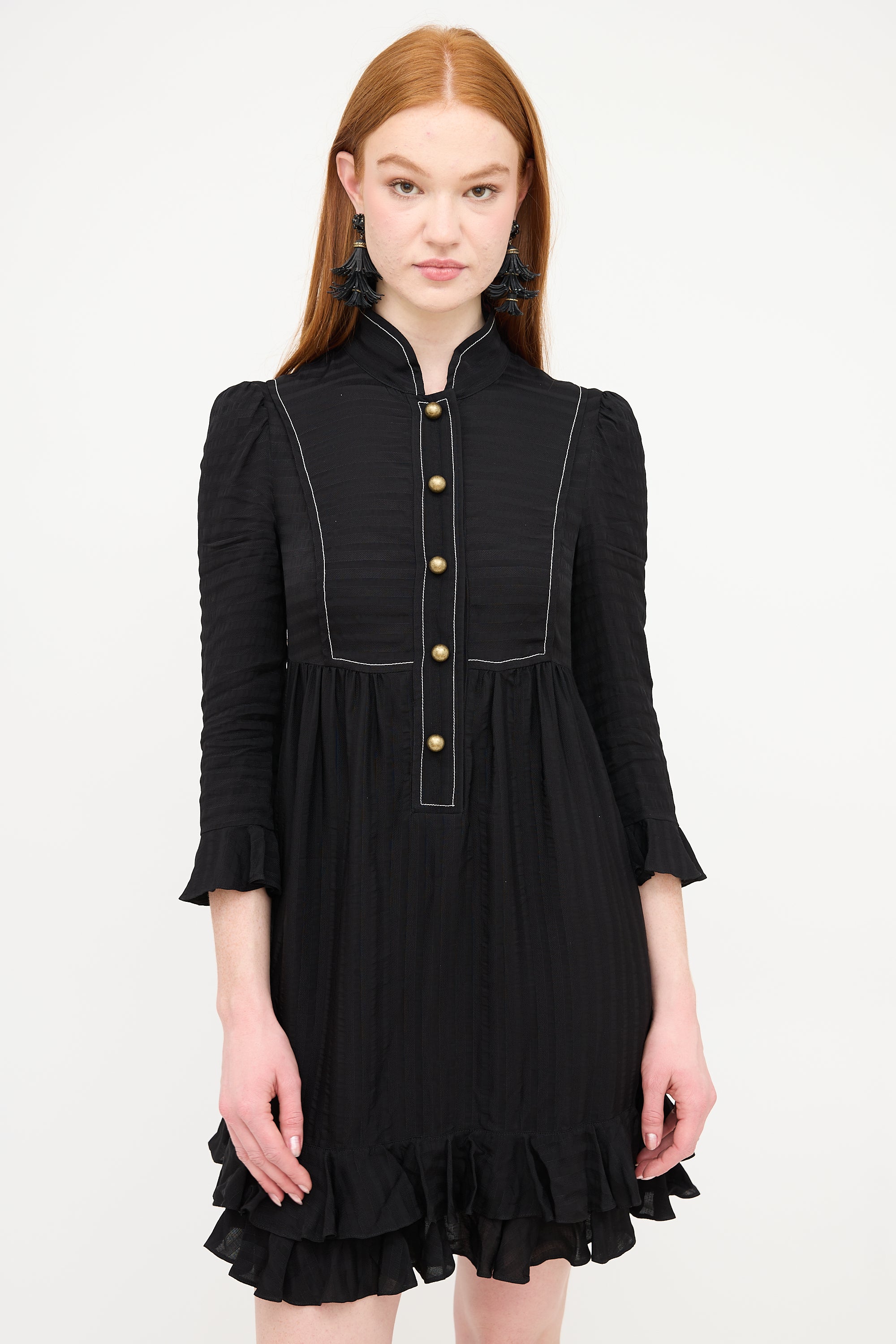 Philosophy black silk tonal striped dress featuring a stand collar, multicolour floral placket lining, snap button up chest, contrast stitching, three quarter length sleeves with ruffled cuff, gathered skirt, two inseam pockets at hip, and ruffled hem. Lined.