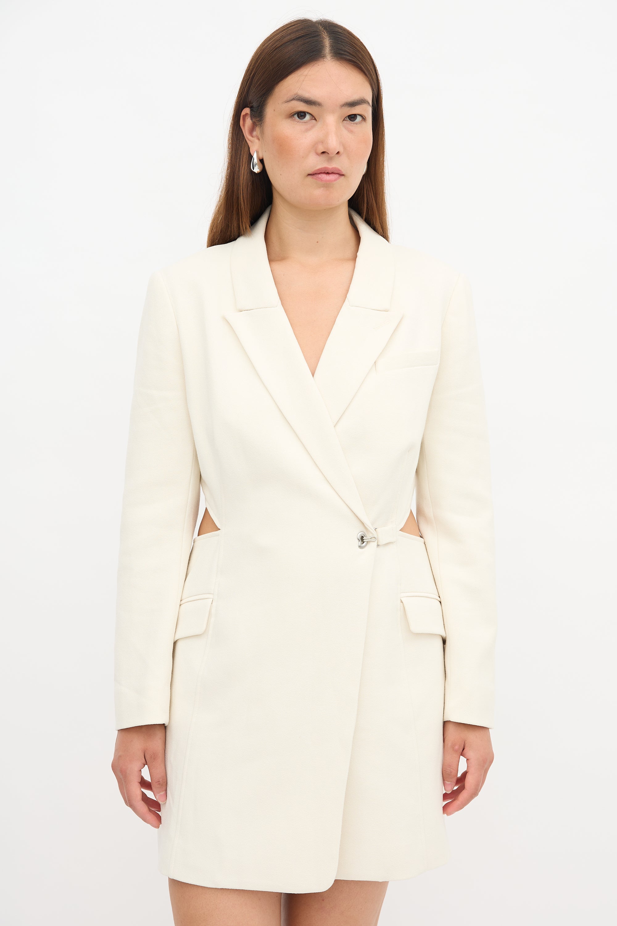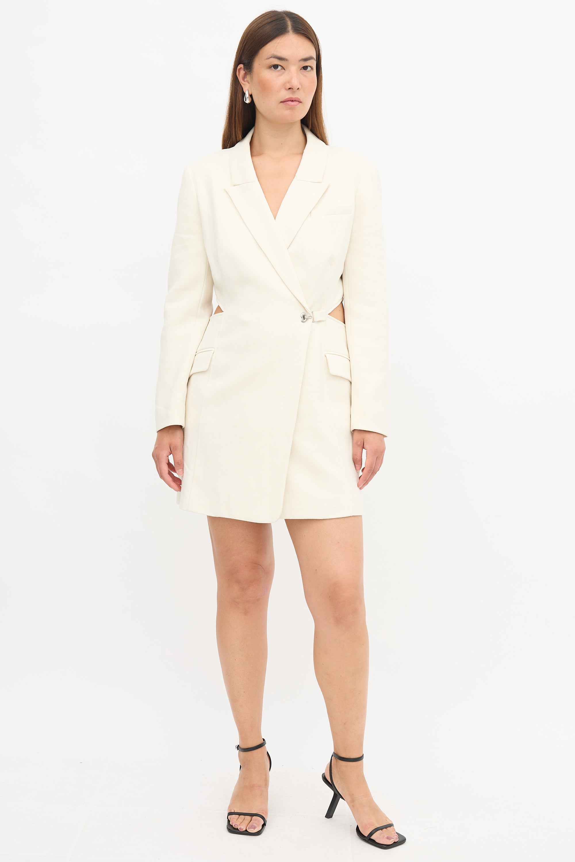 Pre-owned Jonathan Simkhai cream crepe blazer dress featuring peak lapels, hook and eye front closure, cutout sides, and two double welt pockets. Lined.
