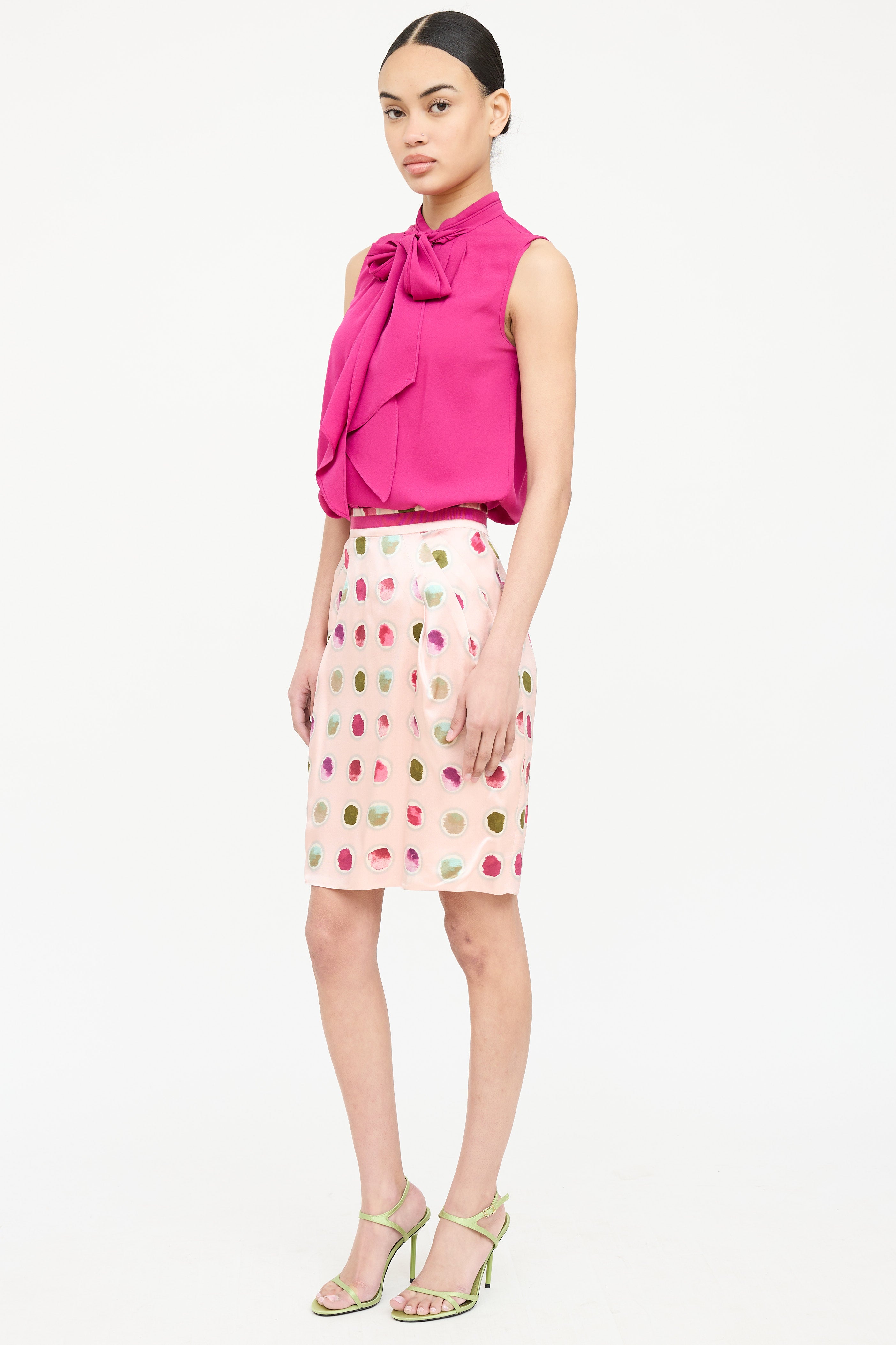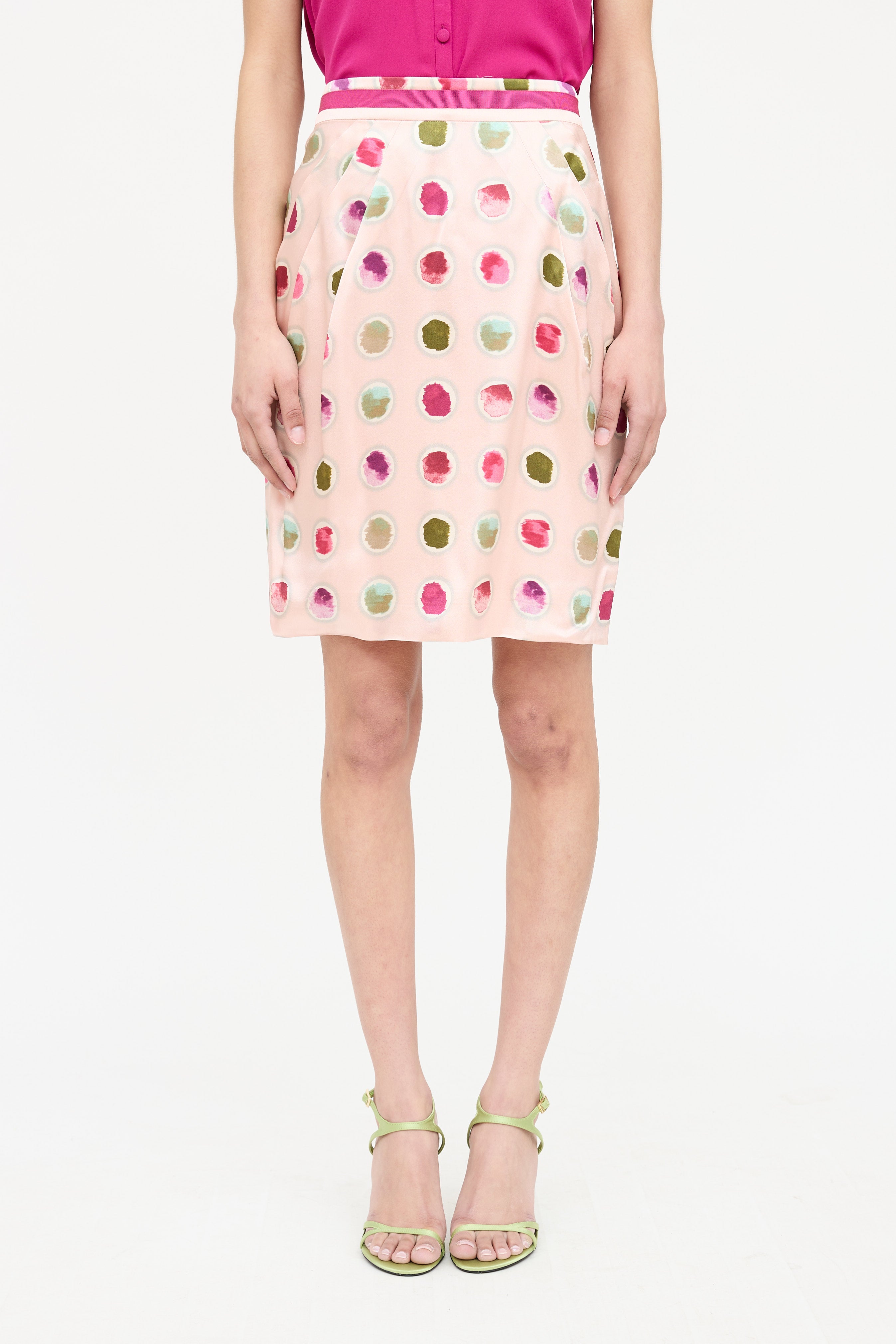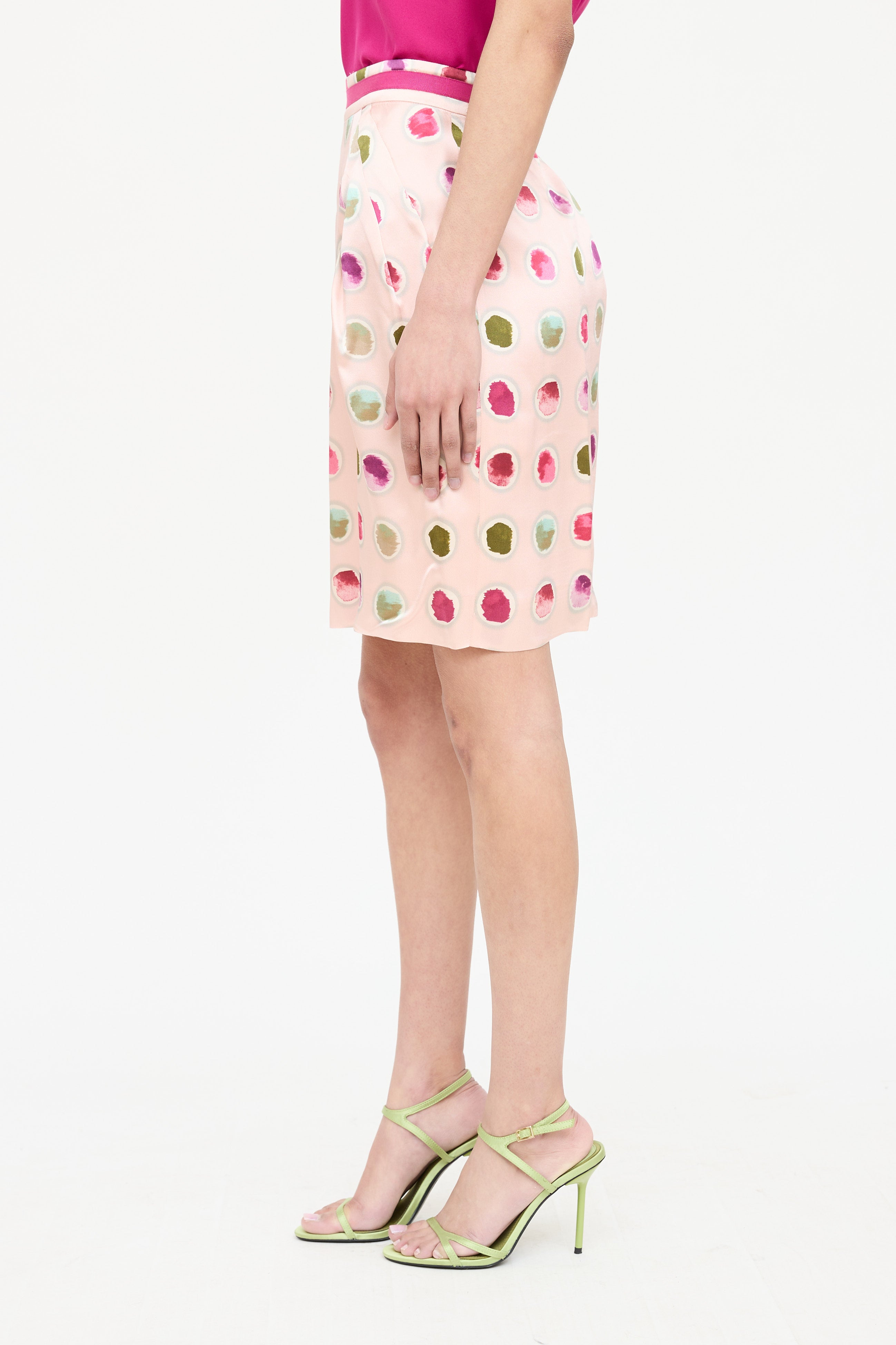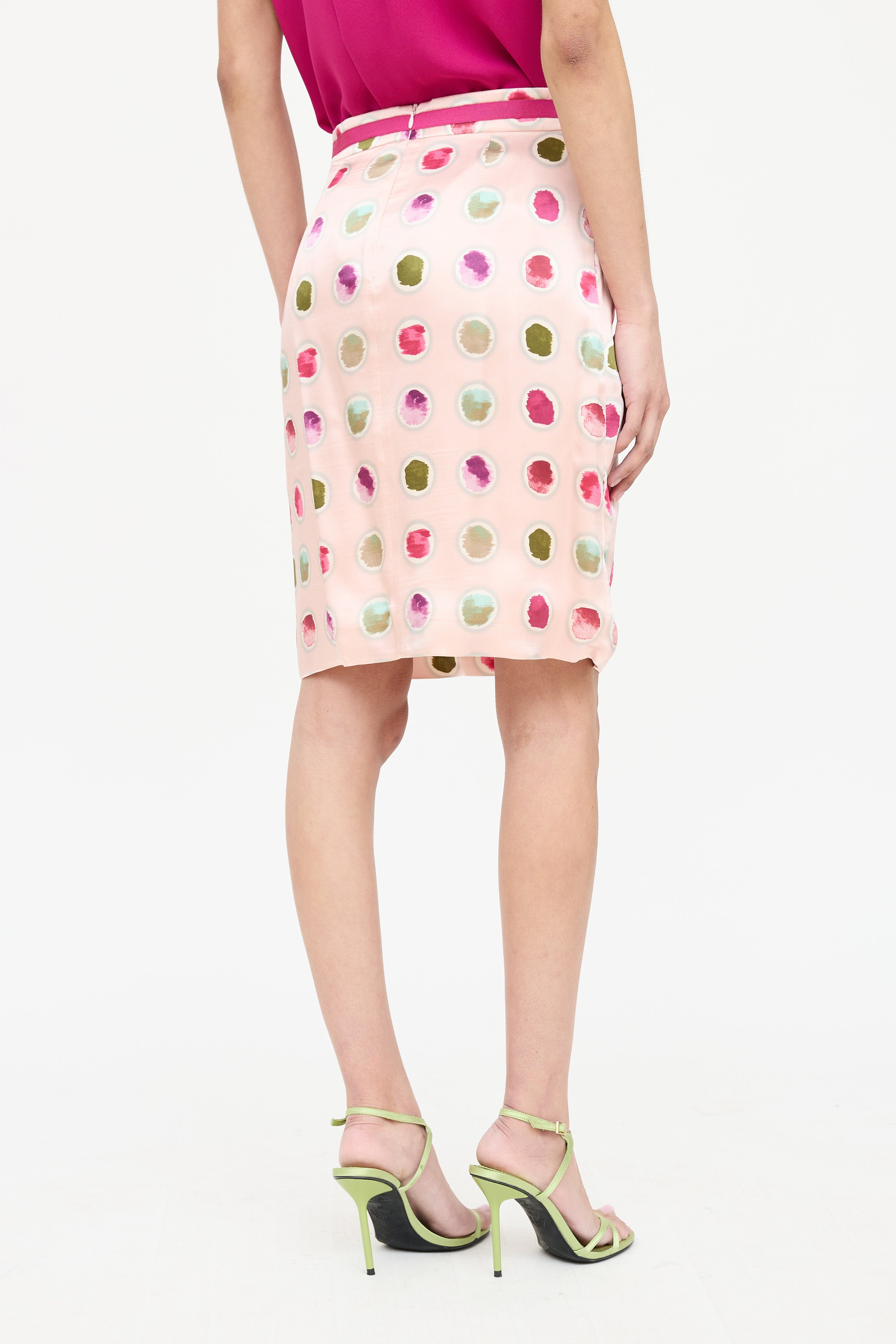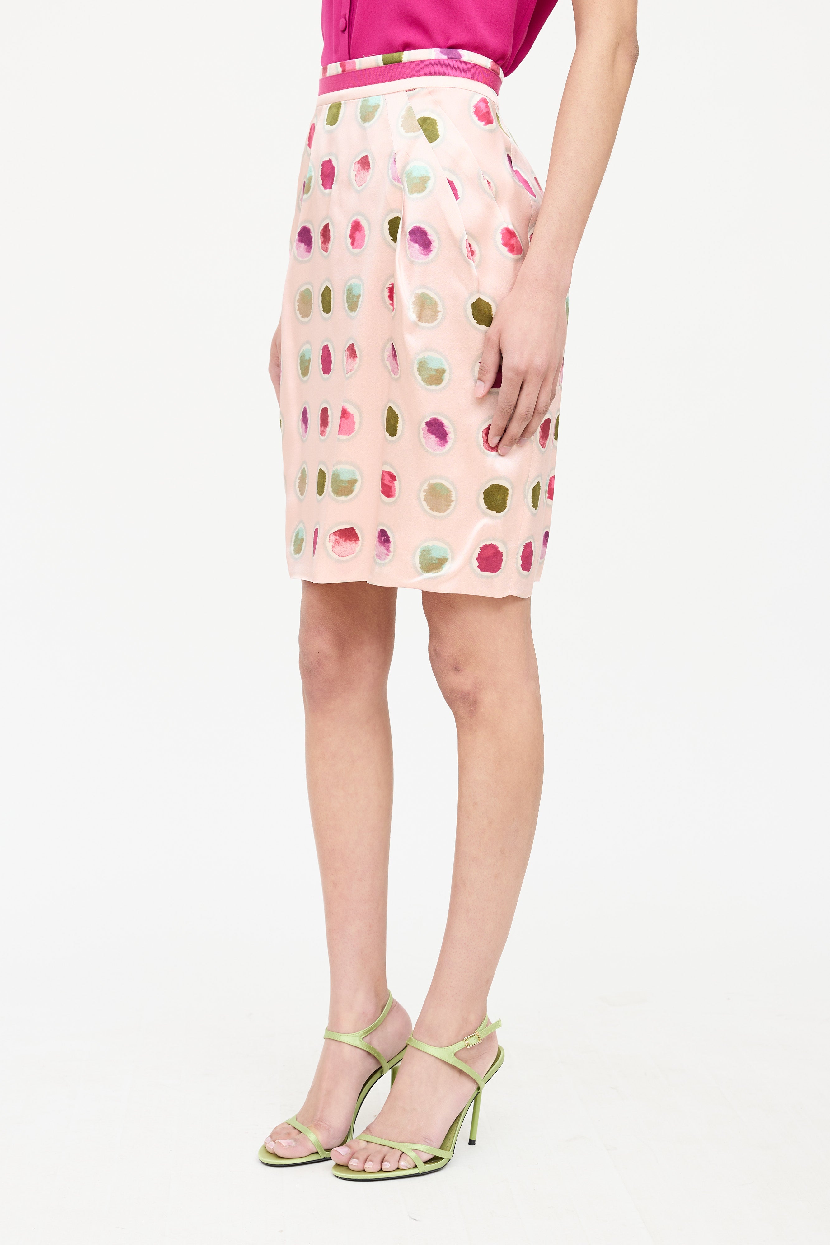 Pre-owned Blumarine Blugirl pink and multicolour silk skirt featuring watercolour dotted print, pleating at front, pink waistband and concealed back zip closure.