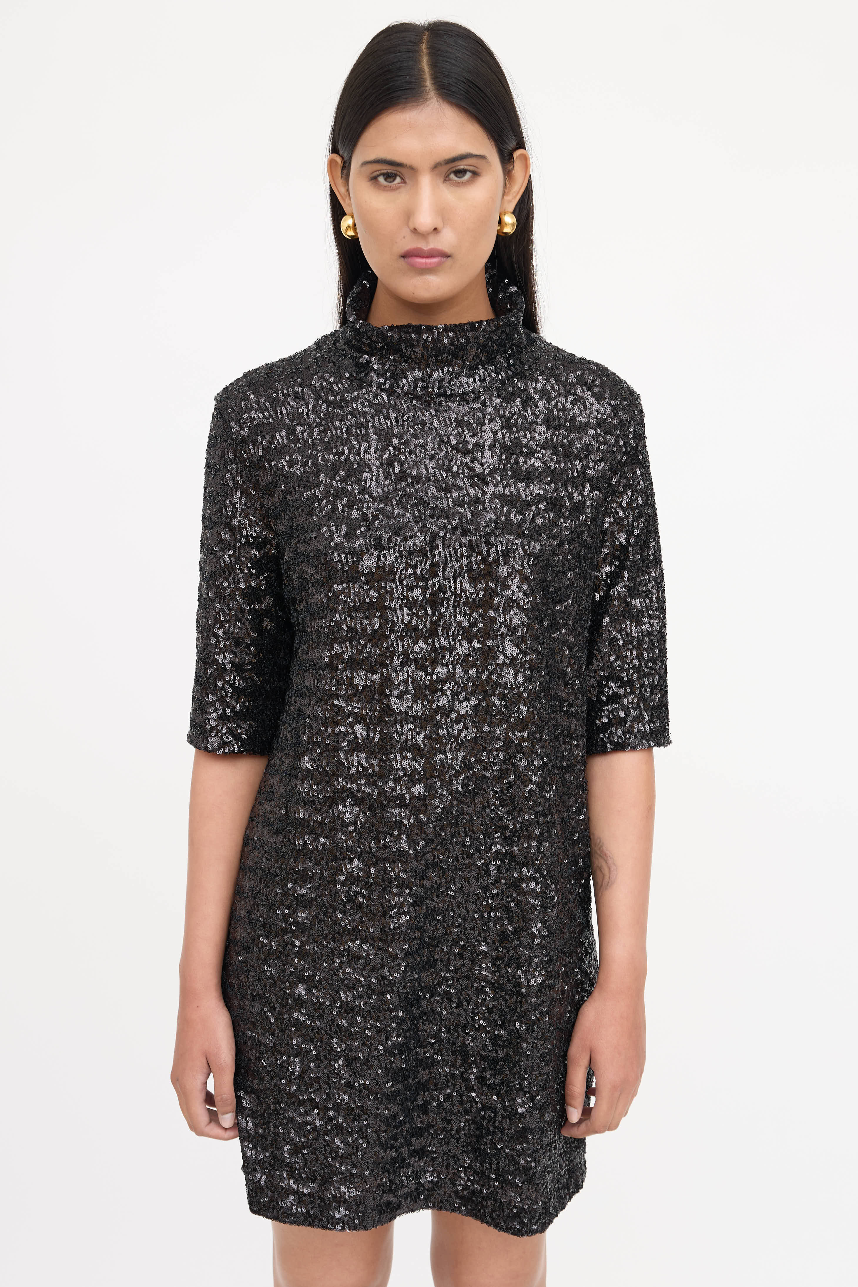 Pre-owned Fabiana Filippi black half sleeve dress featuring mock neckline, concealed zip at back, and sequin embellishments throughout. Lined.