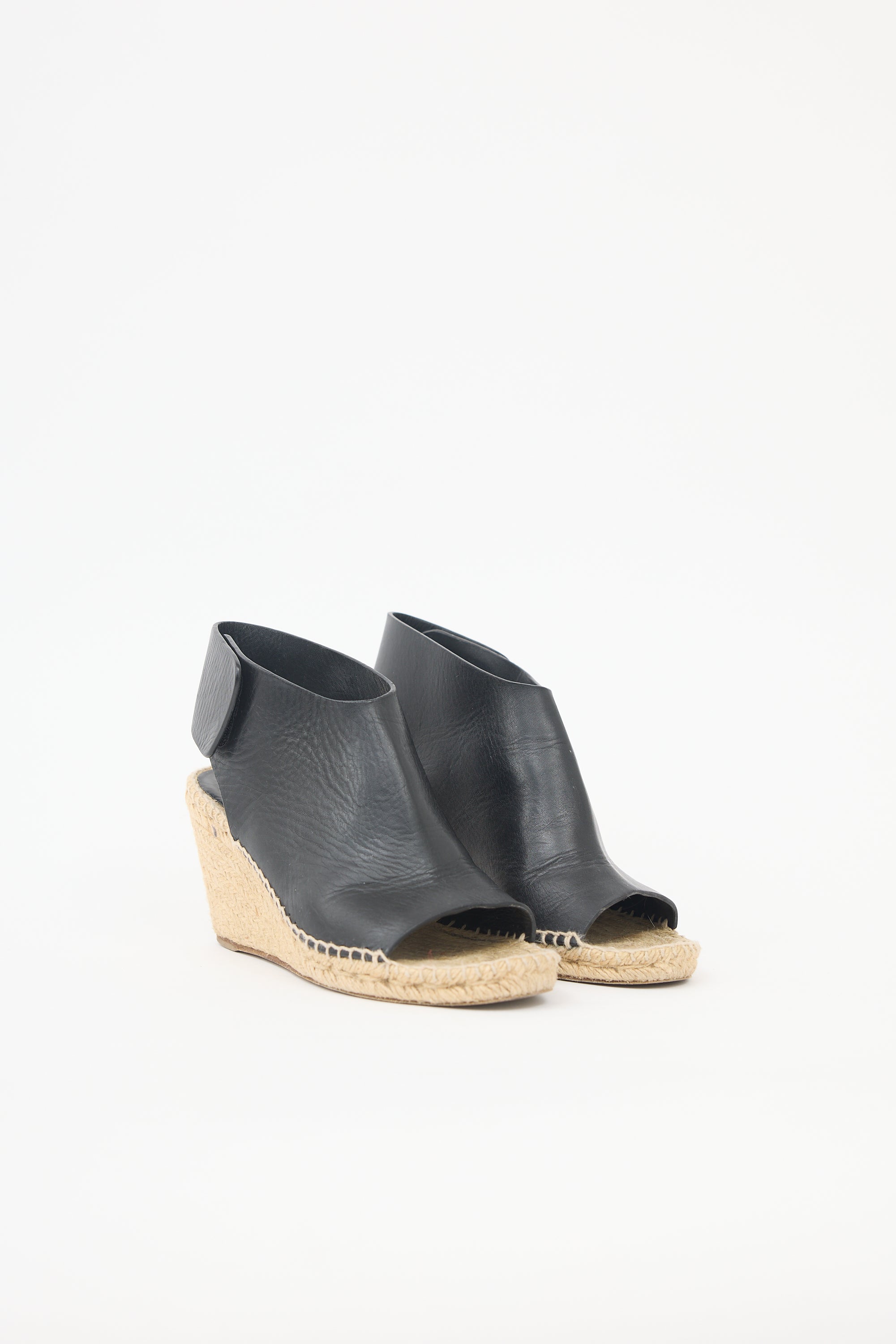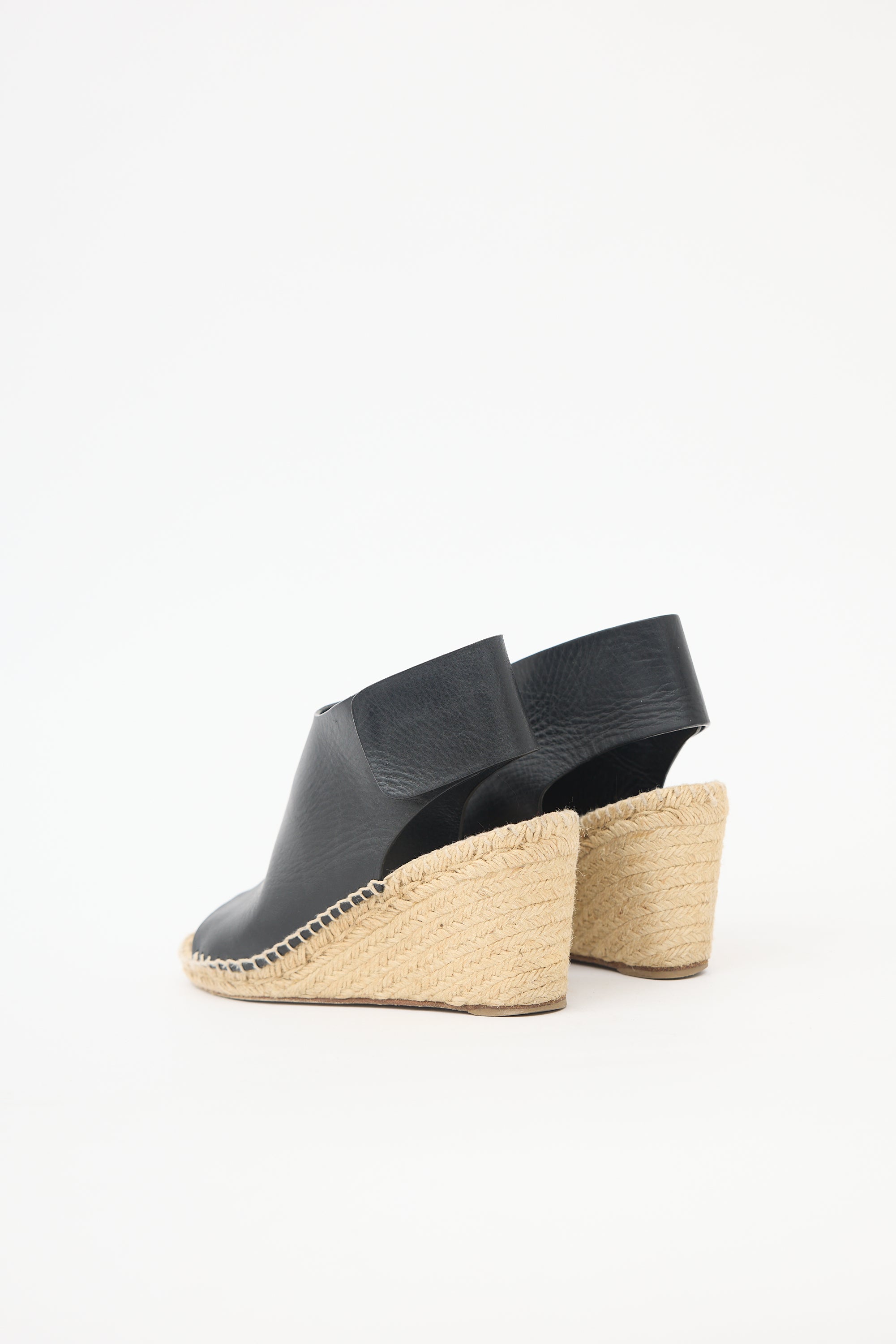 Pre-owned Celine black leather sandals featuring rounded toe, leather upper, Velcro counter closure, beige braided wedge, and leather outsole.