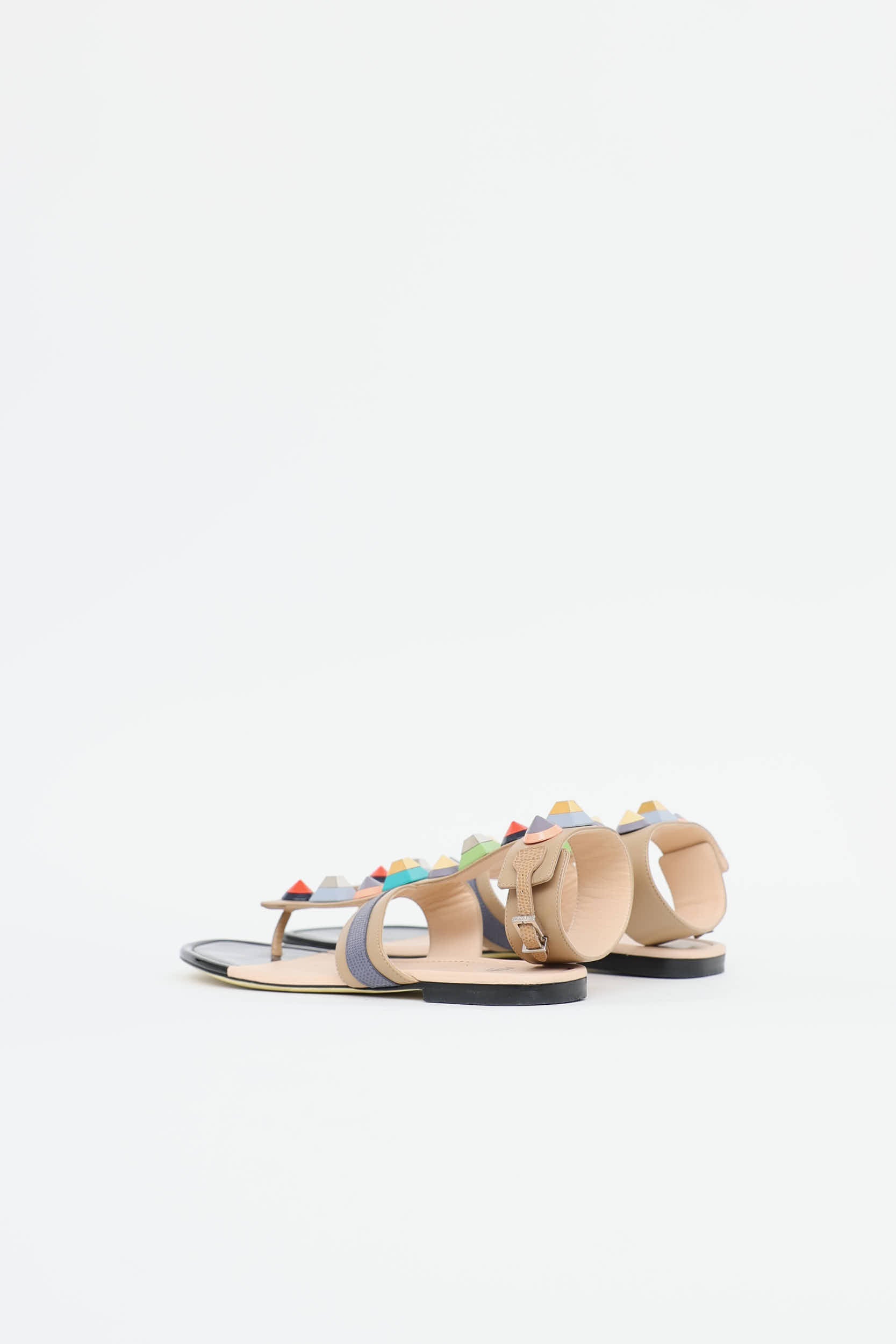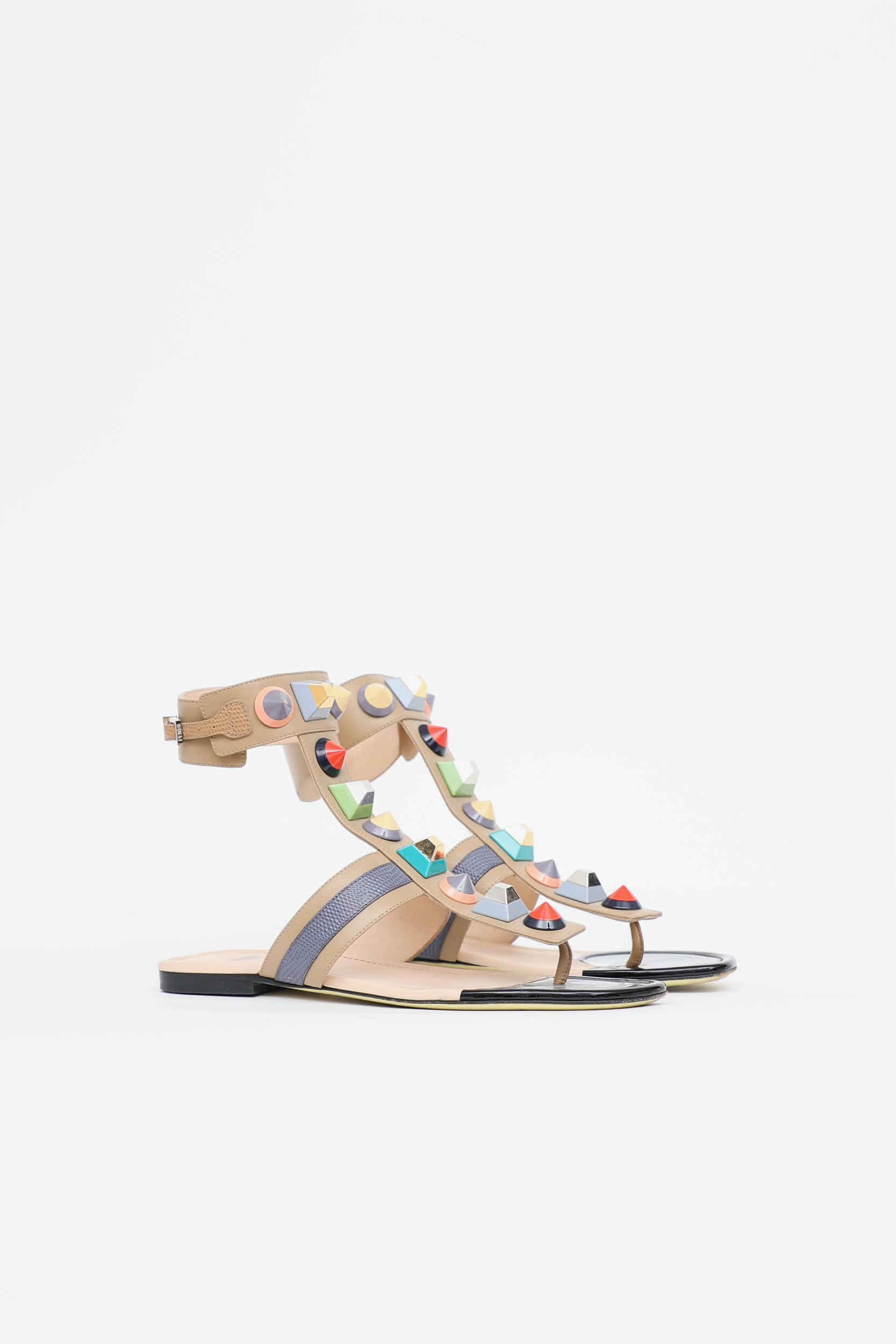 Pre-owned Fendi beige and multi colour Gladiator sandals featuring a square open toe, T strap with multicolour geometric studs, ankle strap with silver toned adjustable buckle, leather insoles, and a short stacked heel.