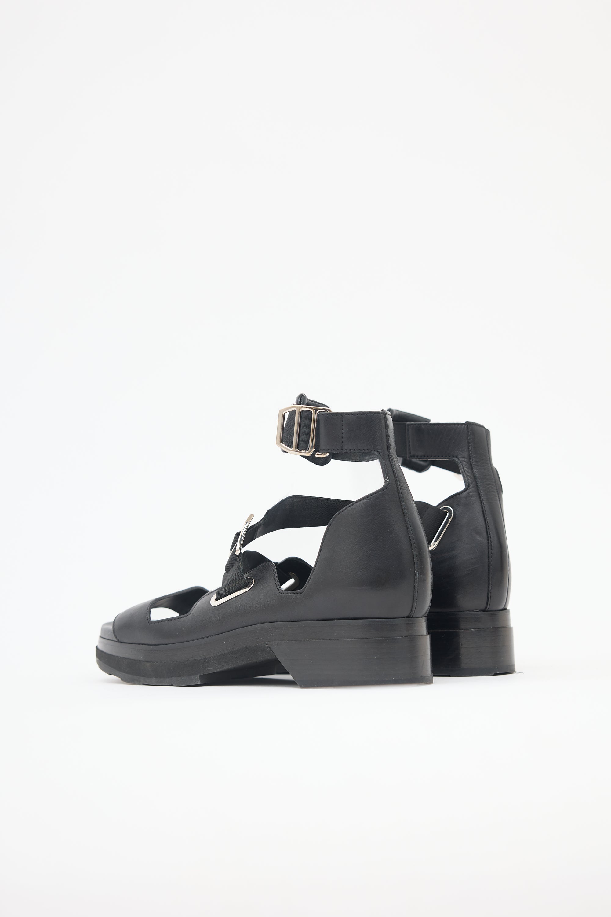 Pre-owned Hermès black leather sandals featuring square toe, leather vamp strap, elasticized strappy upper, elastic ankle strap, tonal platform and block heel, and rubber outsole. Comes with original dust bags.