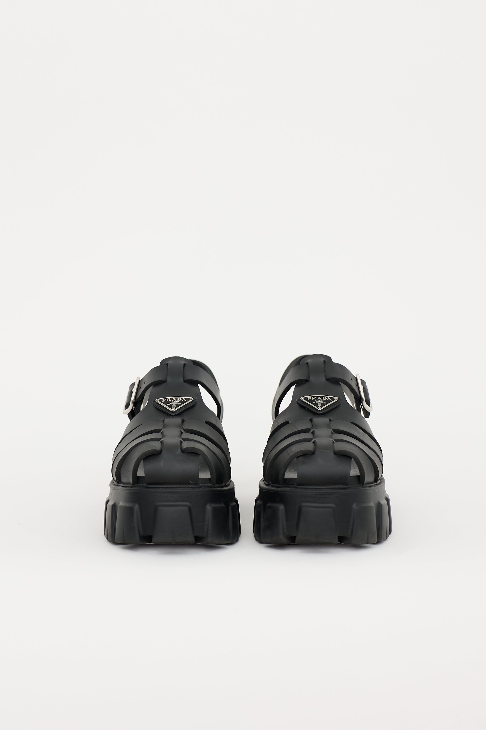 Pre-owned Prada black rubber Monolith Fisherman sandals featuring rounded toe, cage upper, signature triangle logo plaque at instep, adjustable ankle strap, debossed logo at counter, and tonal rubber lug sole. Comes with original box.