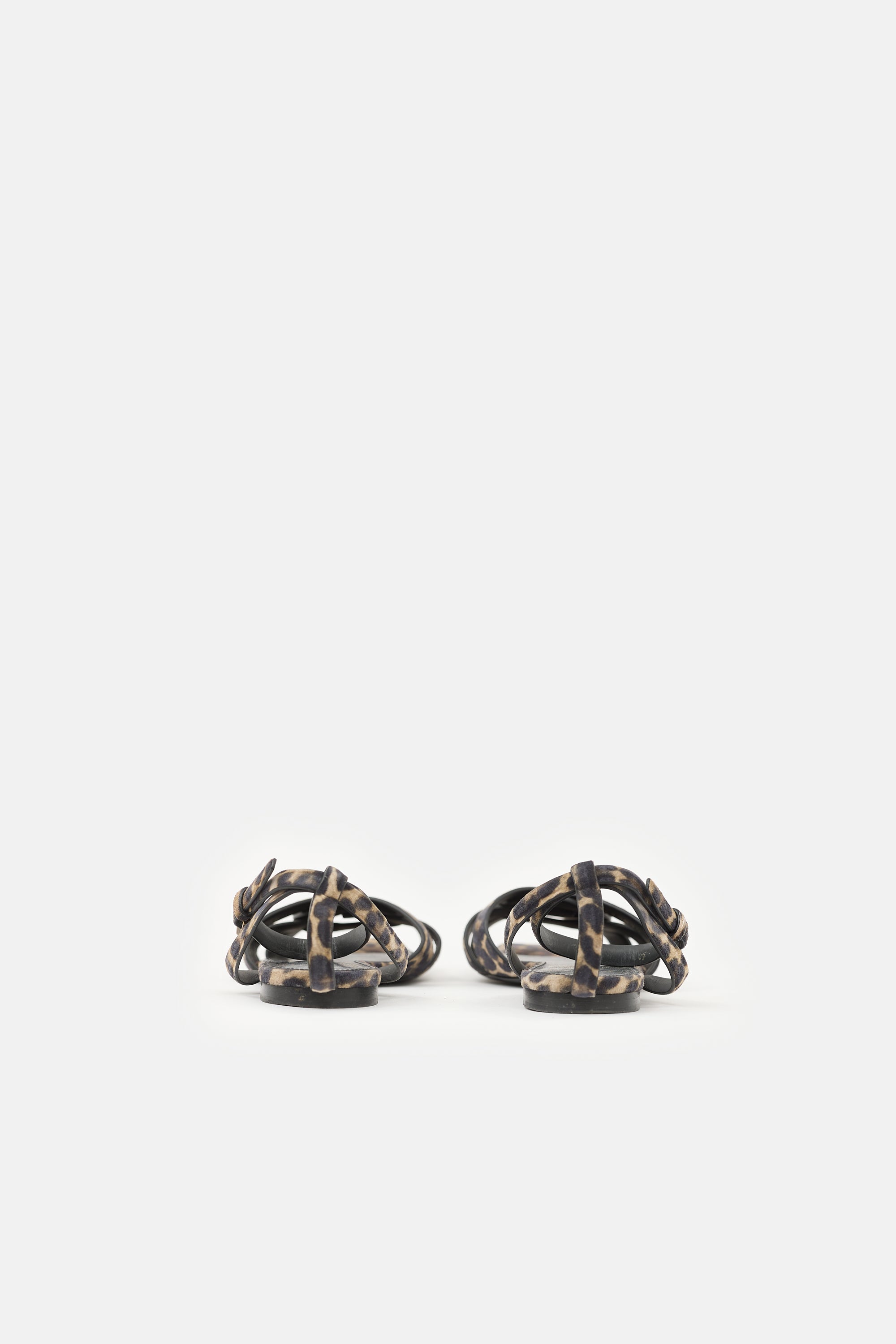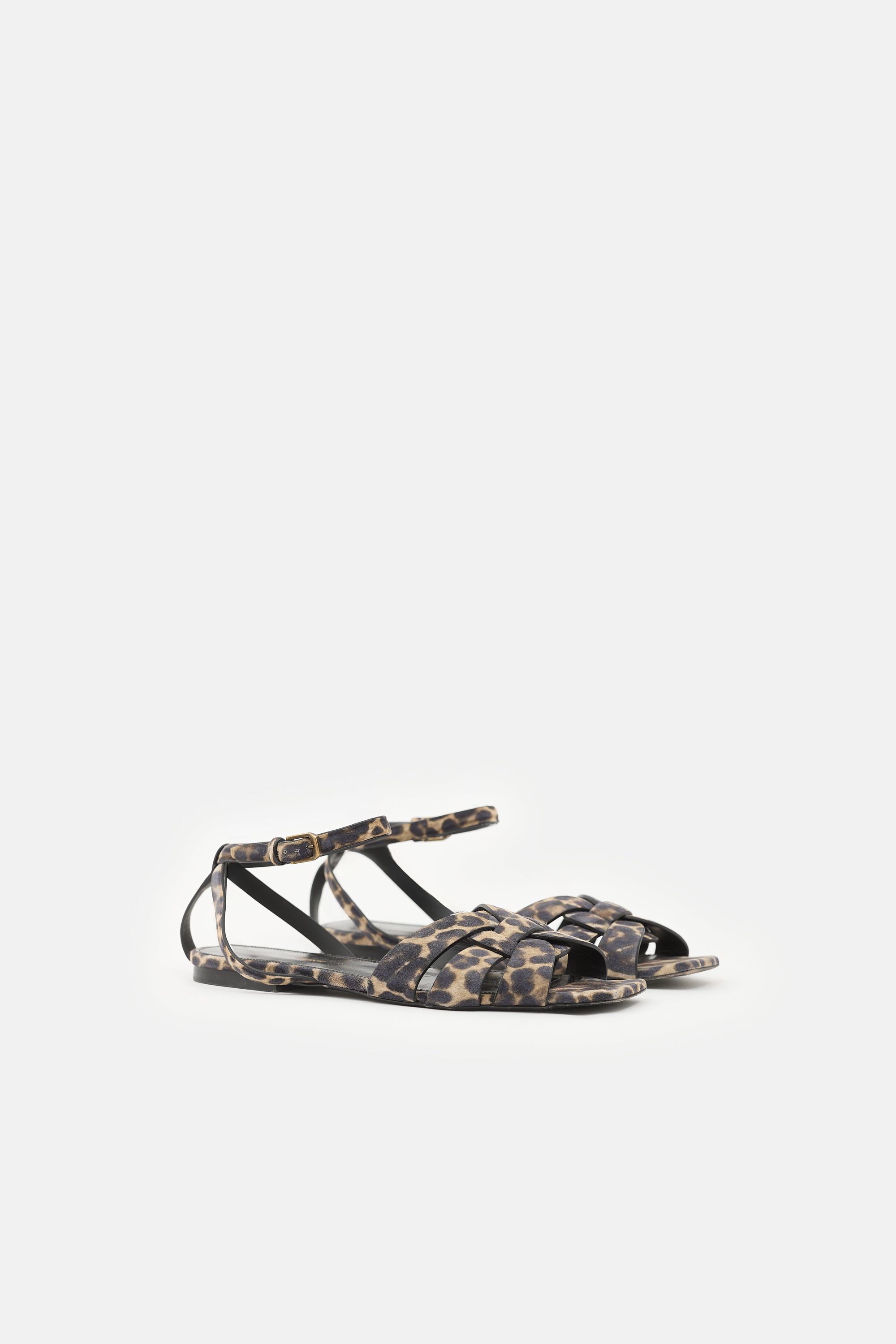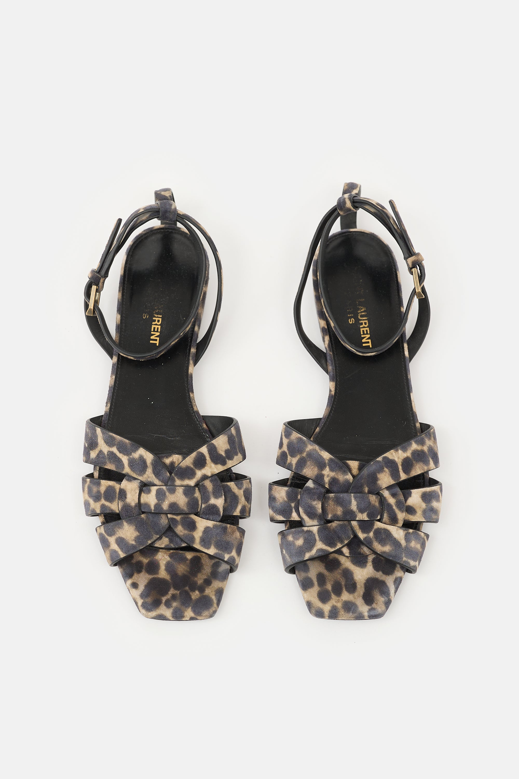 Pre-owned Saint Laurent suede Tribute sandals featuring a beige and black leopard print, open squared toe, woven straps at vamp, and adjustable ankle strap.