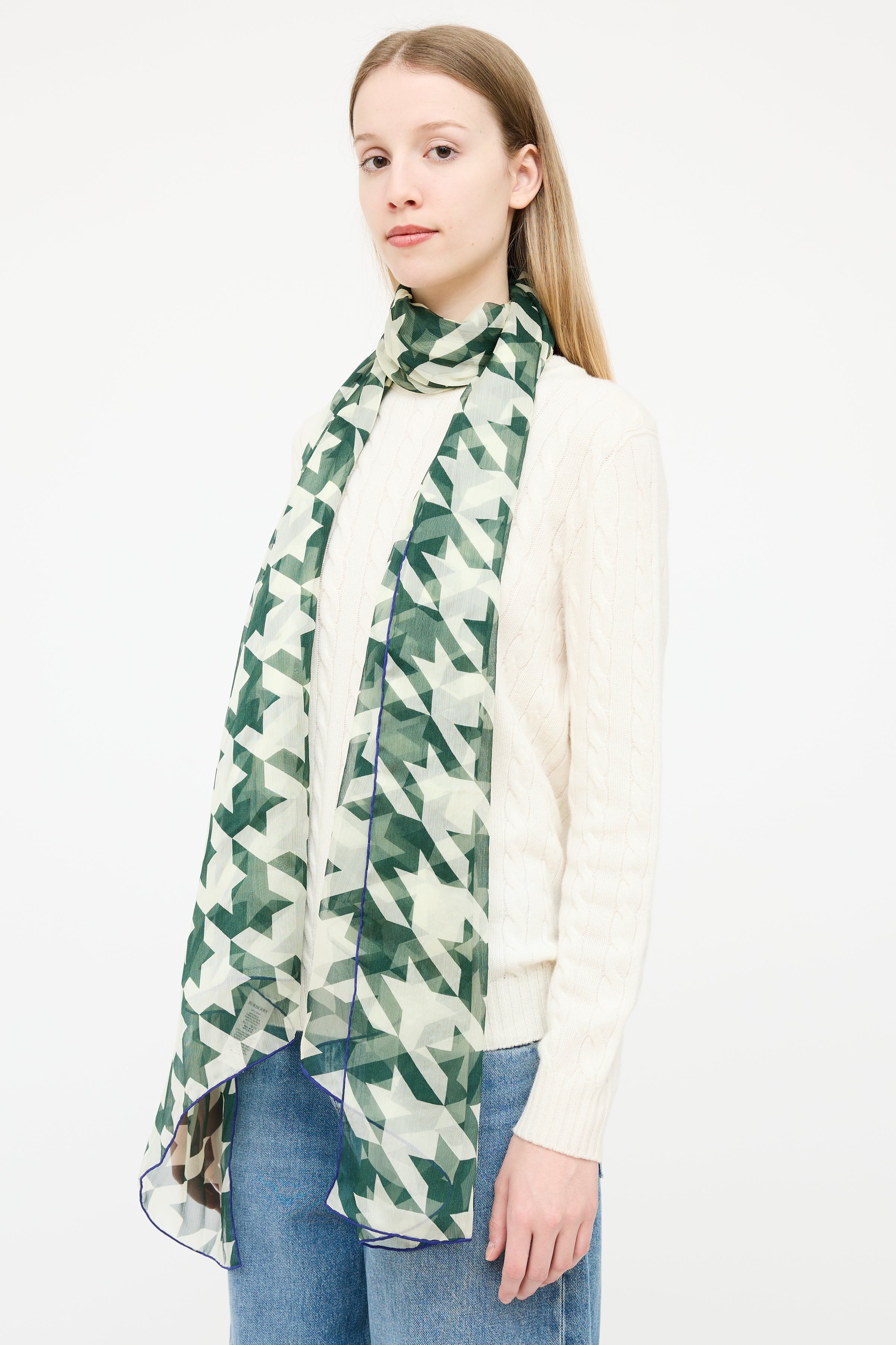 Burberry Green & Cream Silk Houndstooth Scarf
