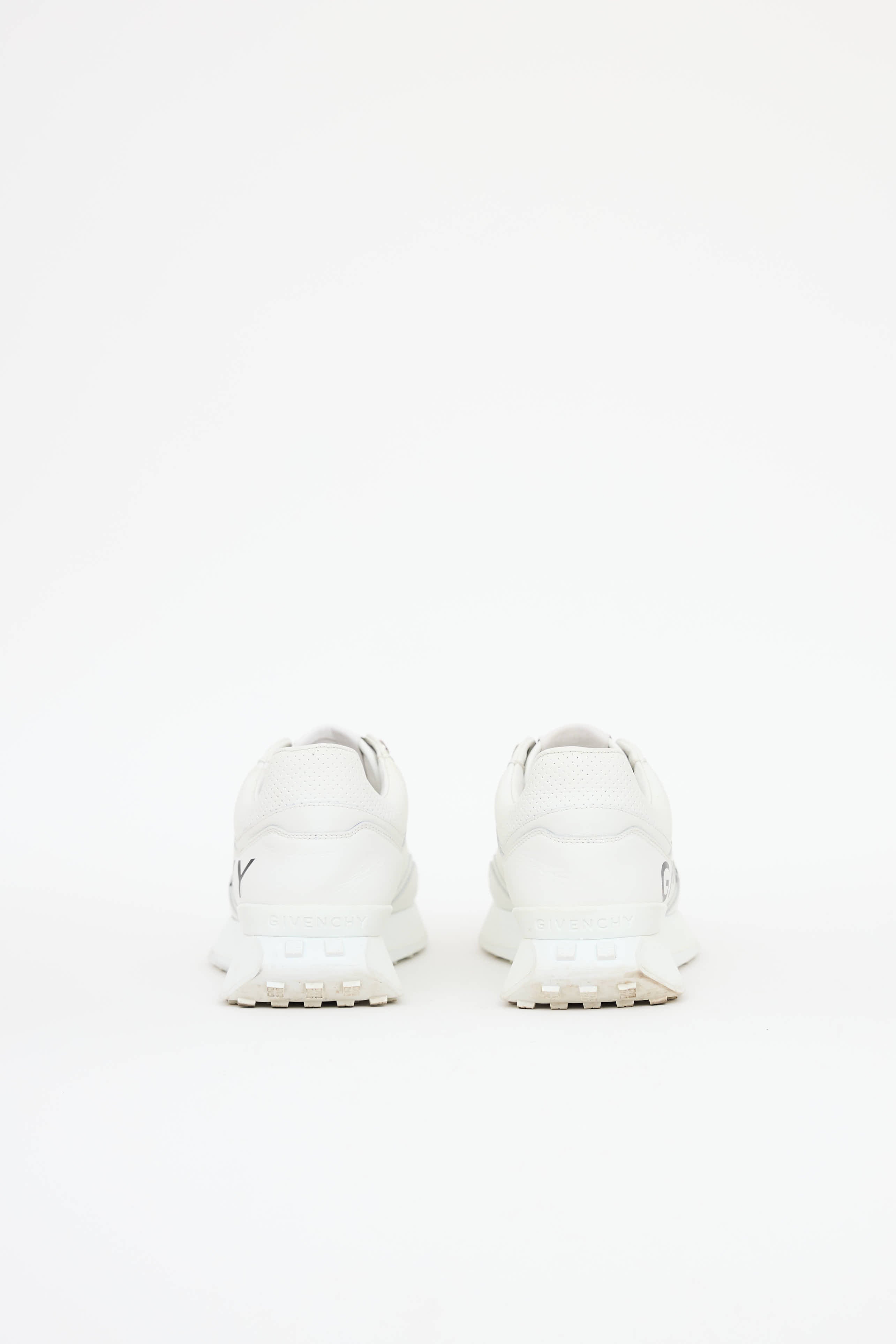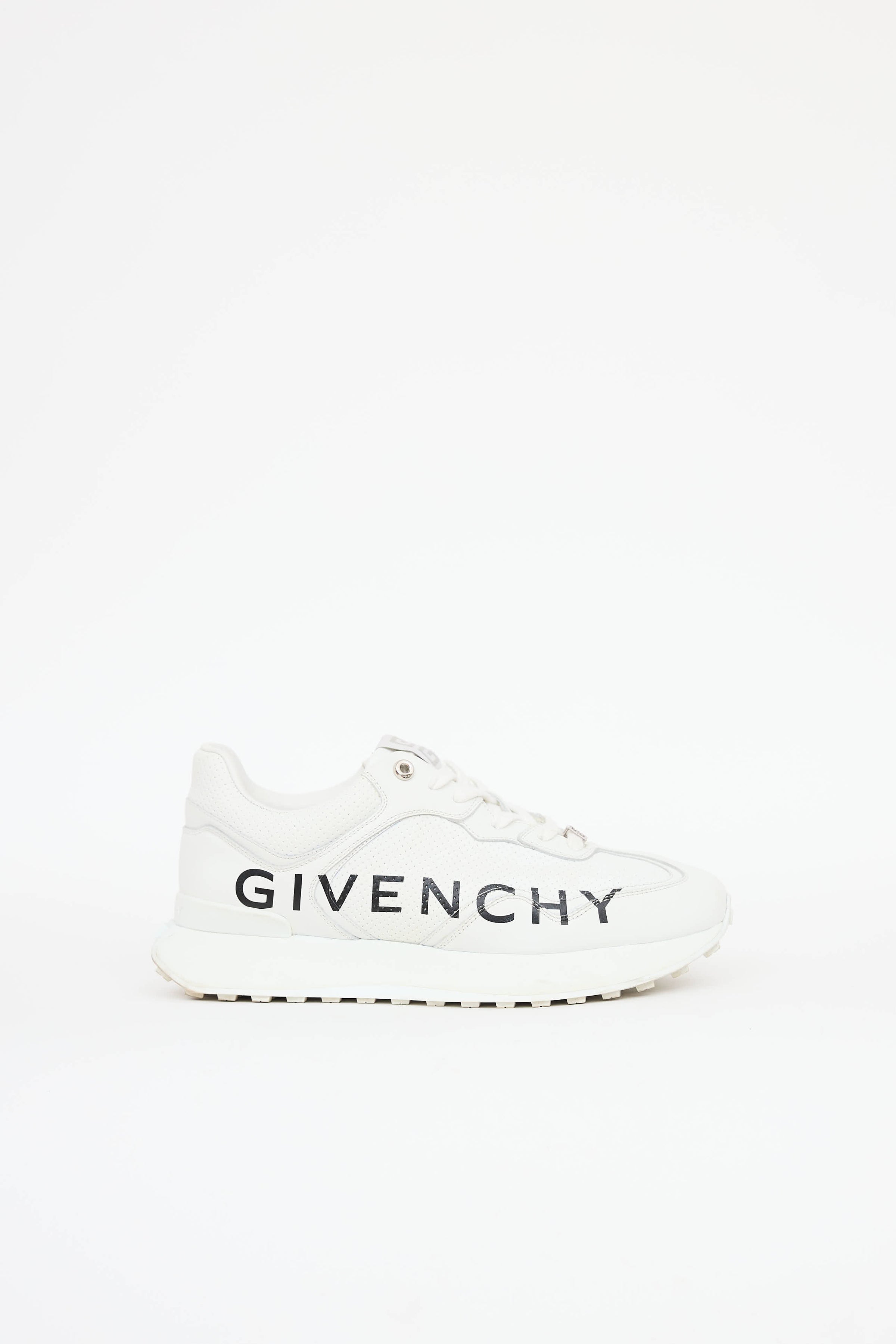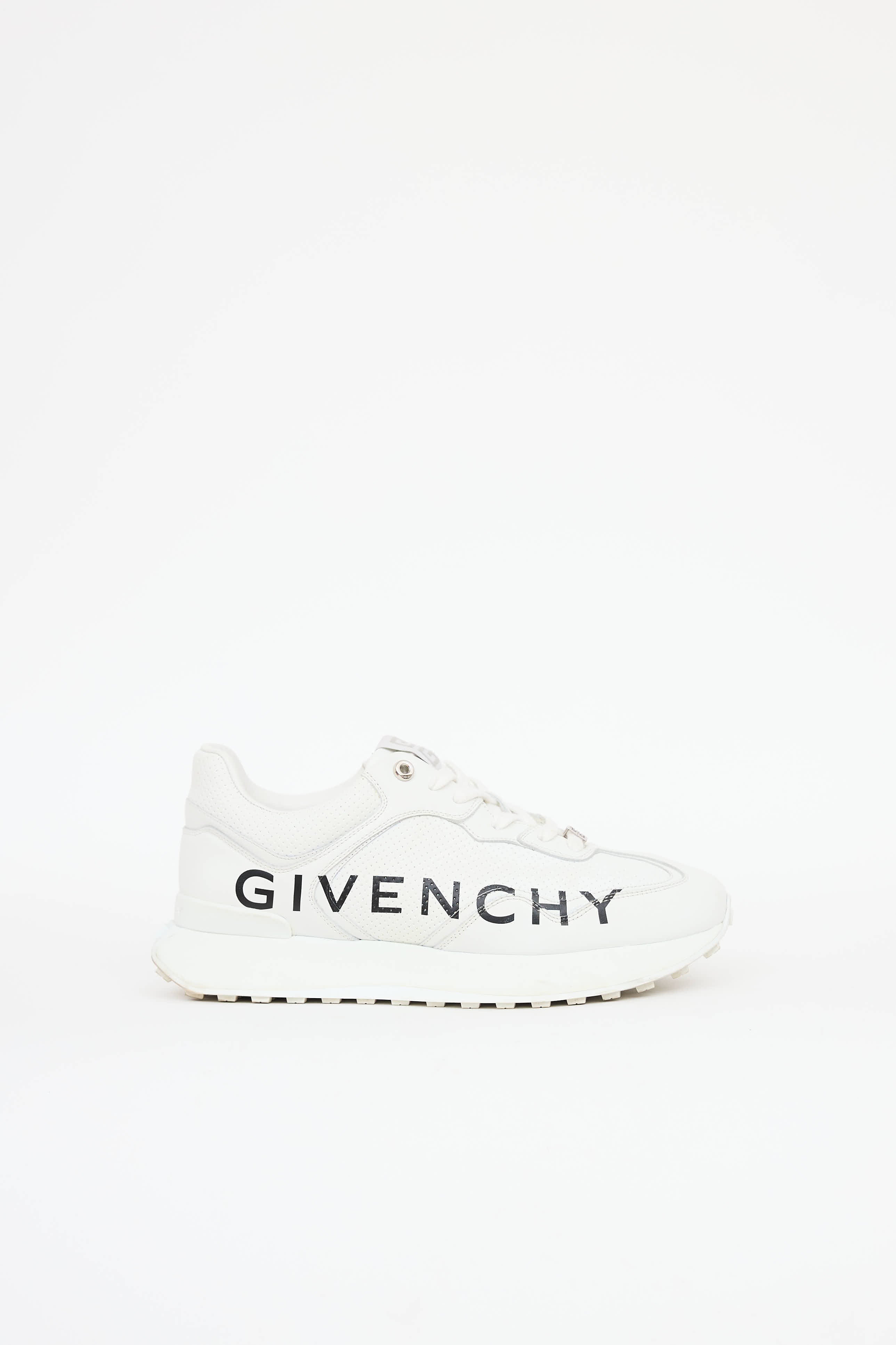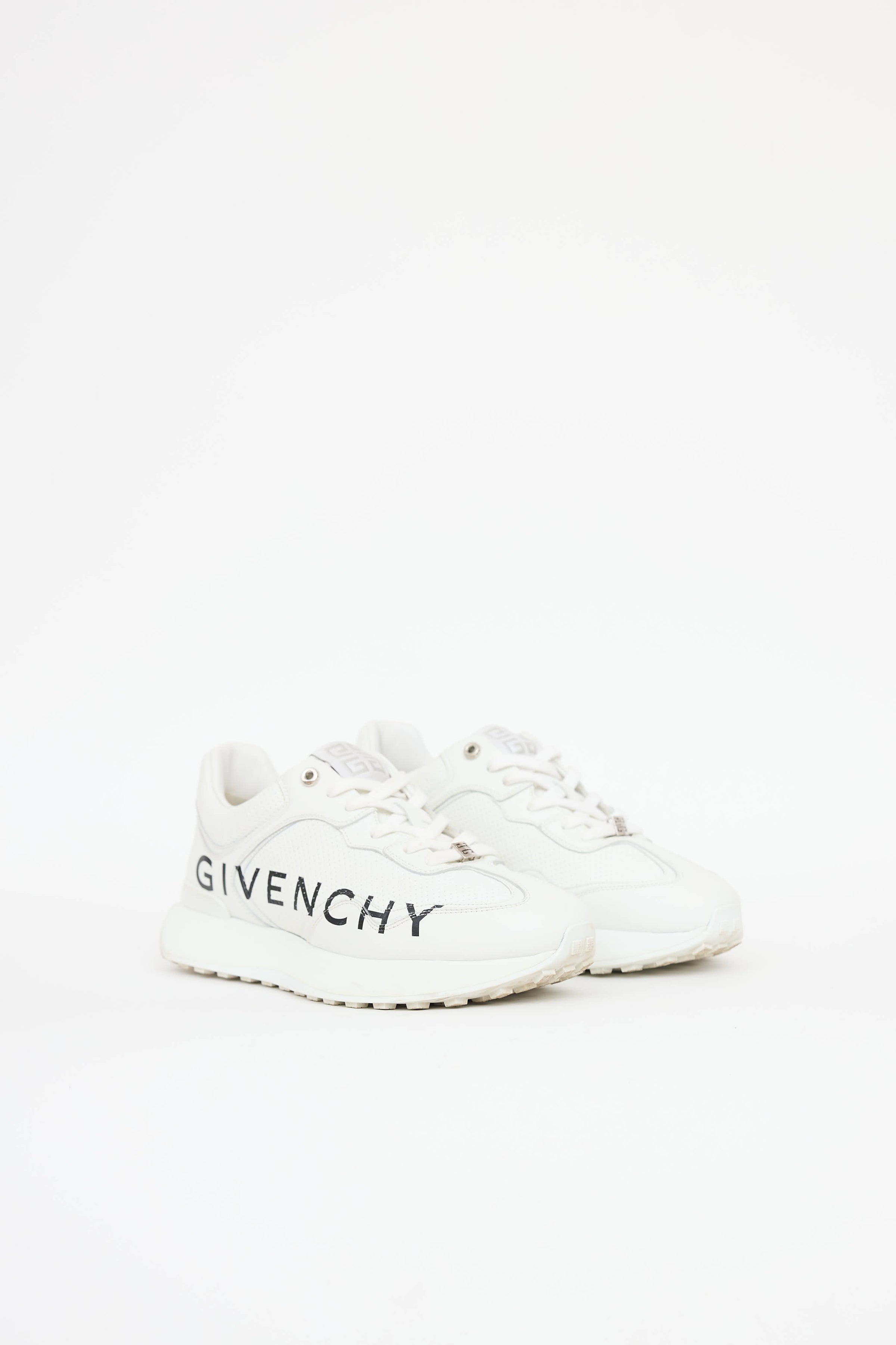 Pre-owned Givenchy white GIV sneakers featuring a round toe, black printed logo at sides, platform midsole, perforated paneled upper, debossed logo at counter, logo tab at tongue, and lace up closure.