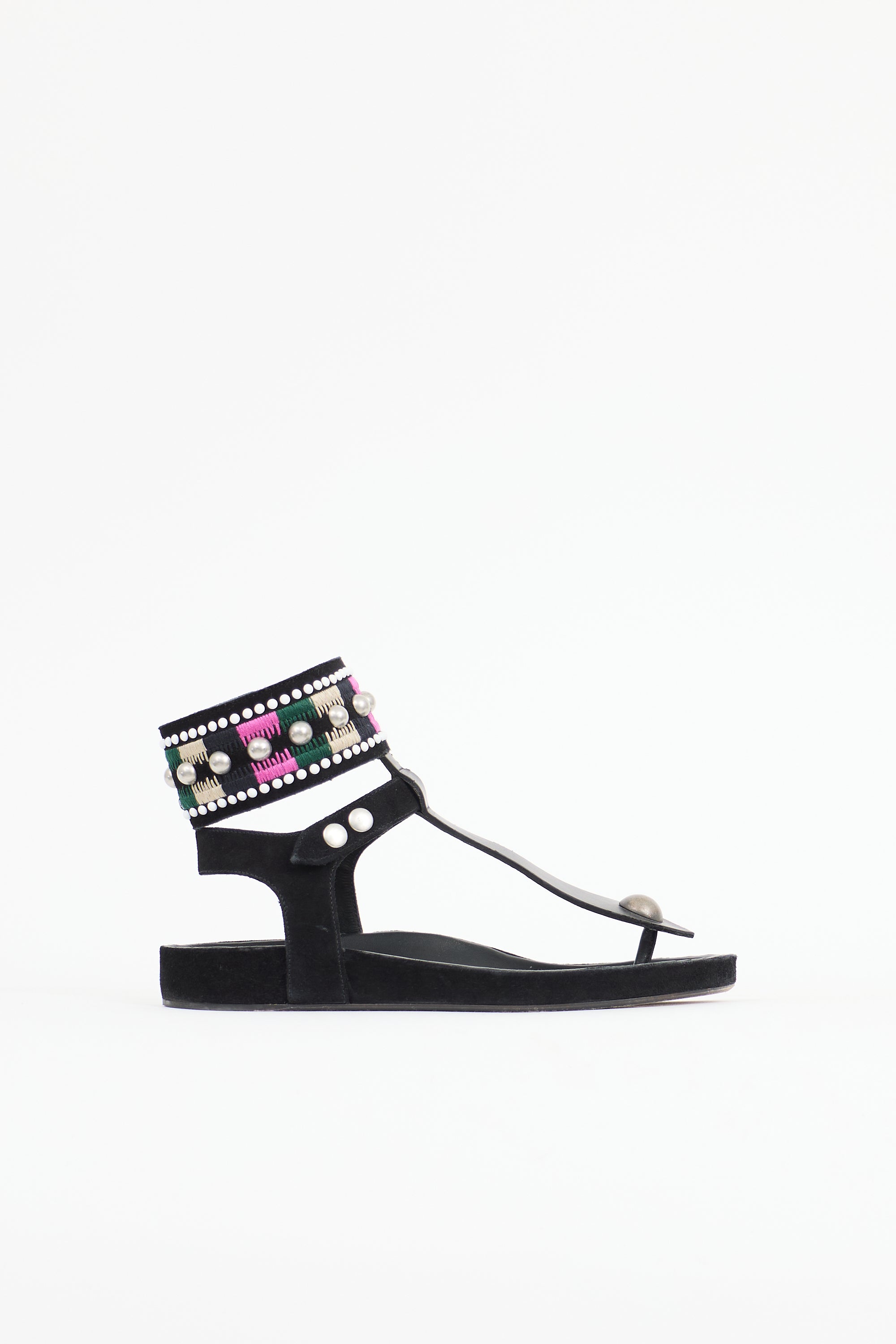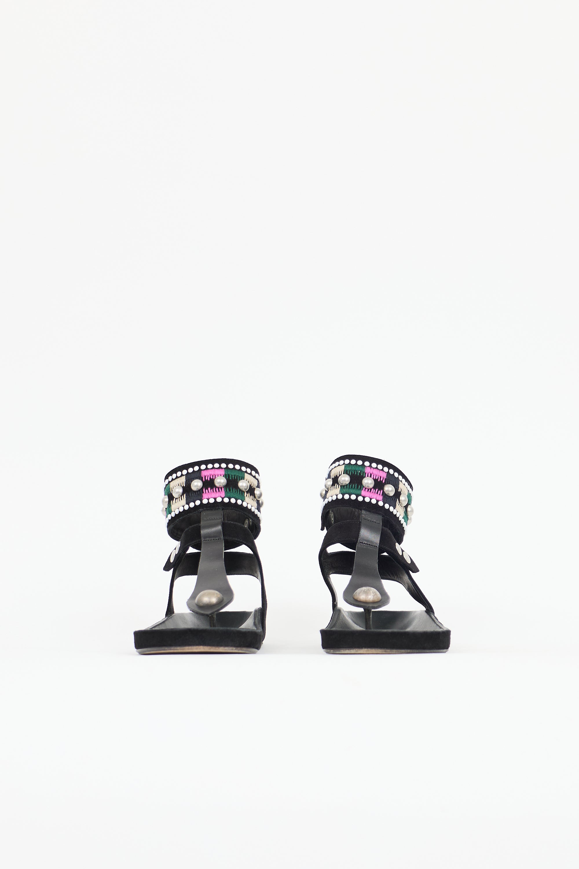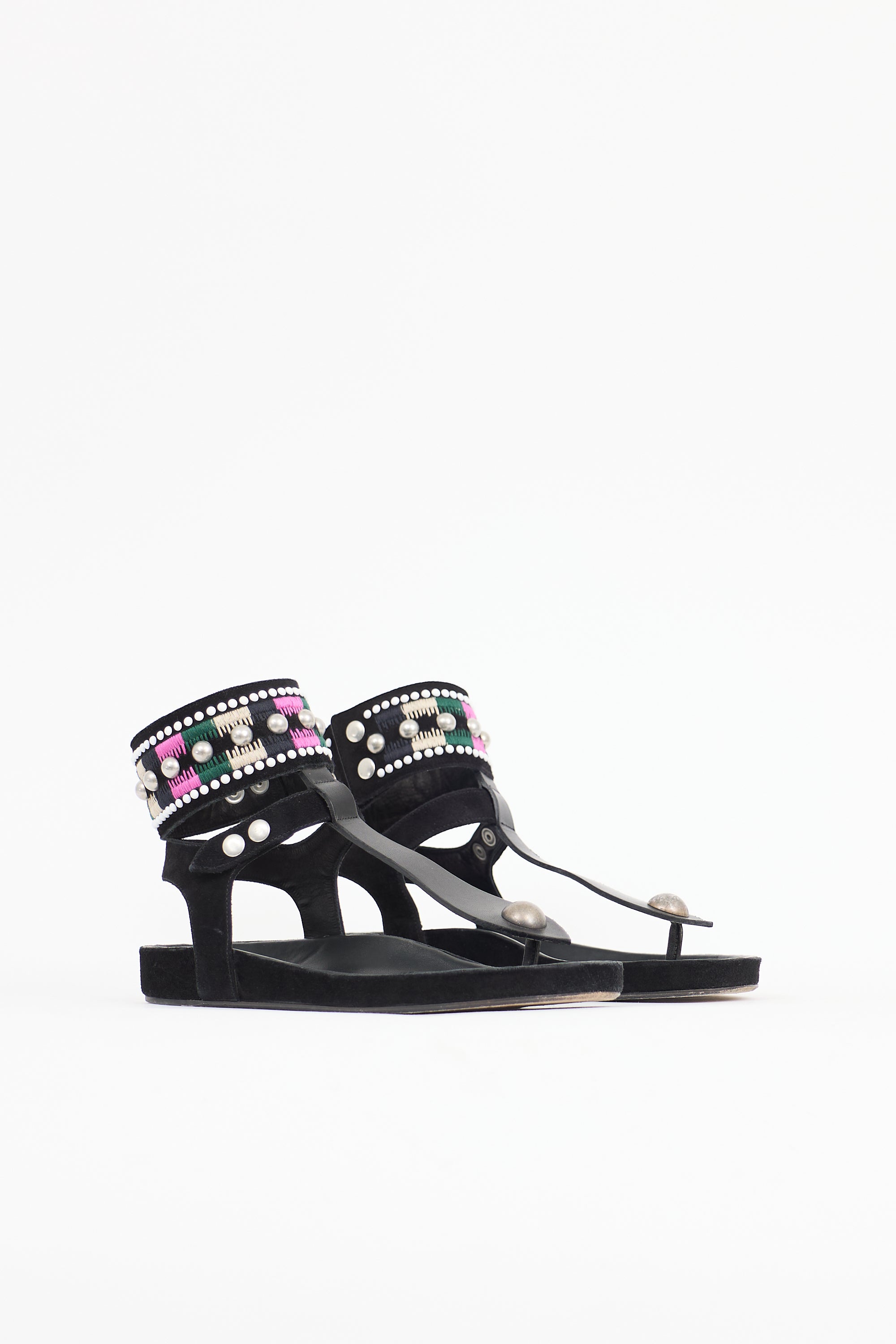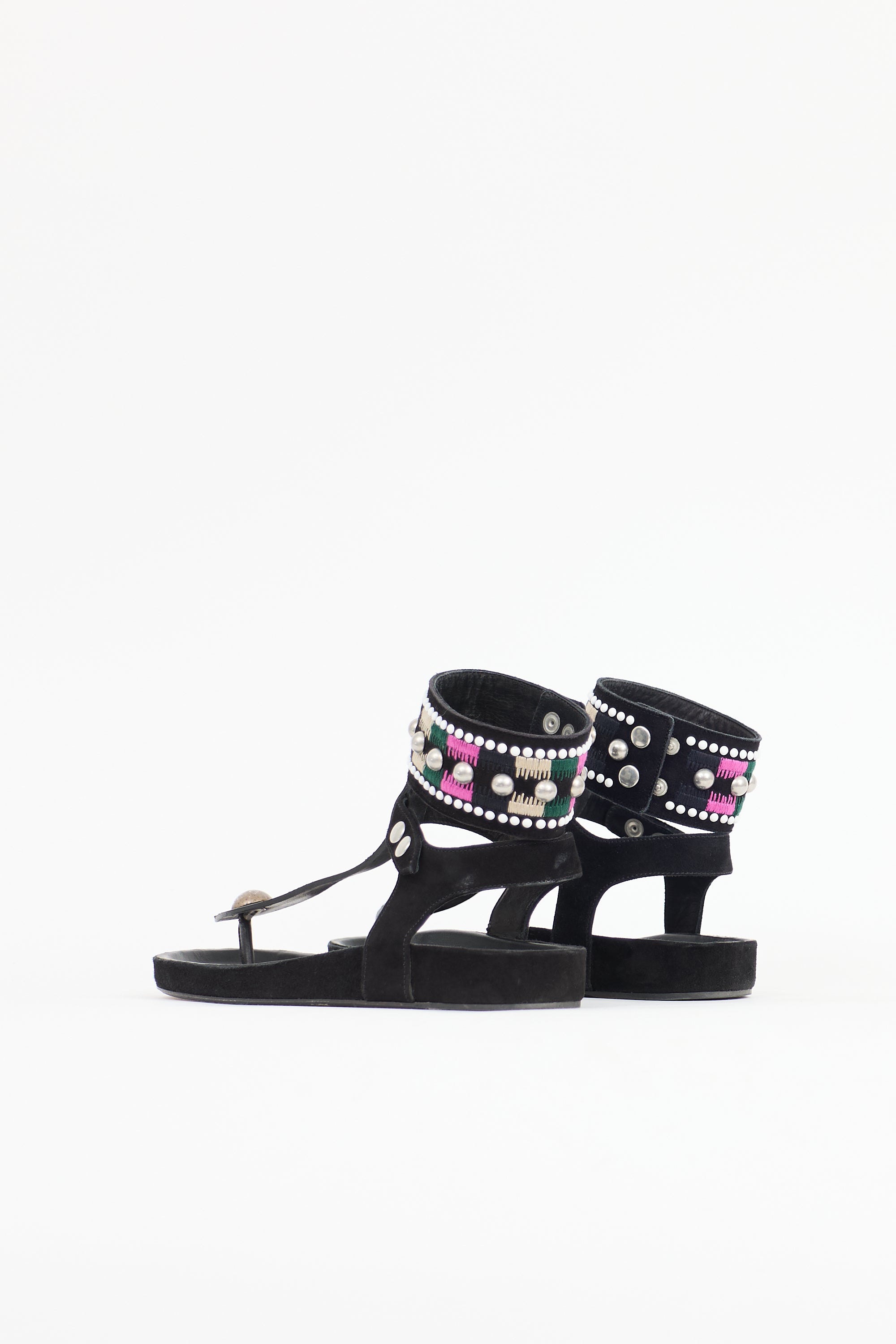 Pre-owned Isabel Marant black suede sandals featuring an open rounded toe, silver tone stud embellishments throughout, adjustable T-strap, and multicolour embroidered ankle strap.