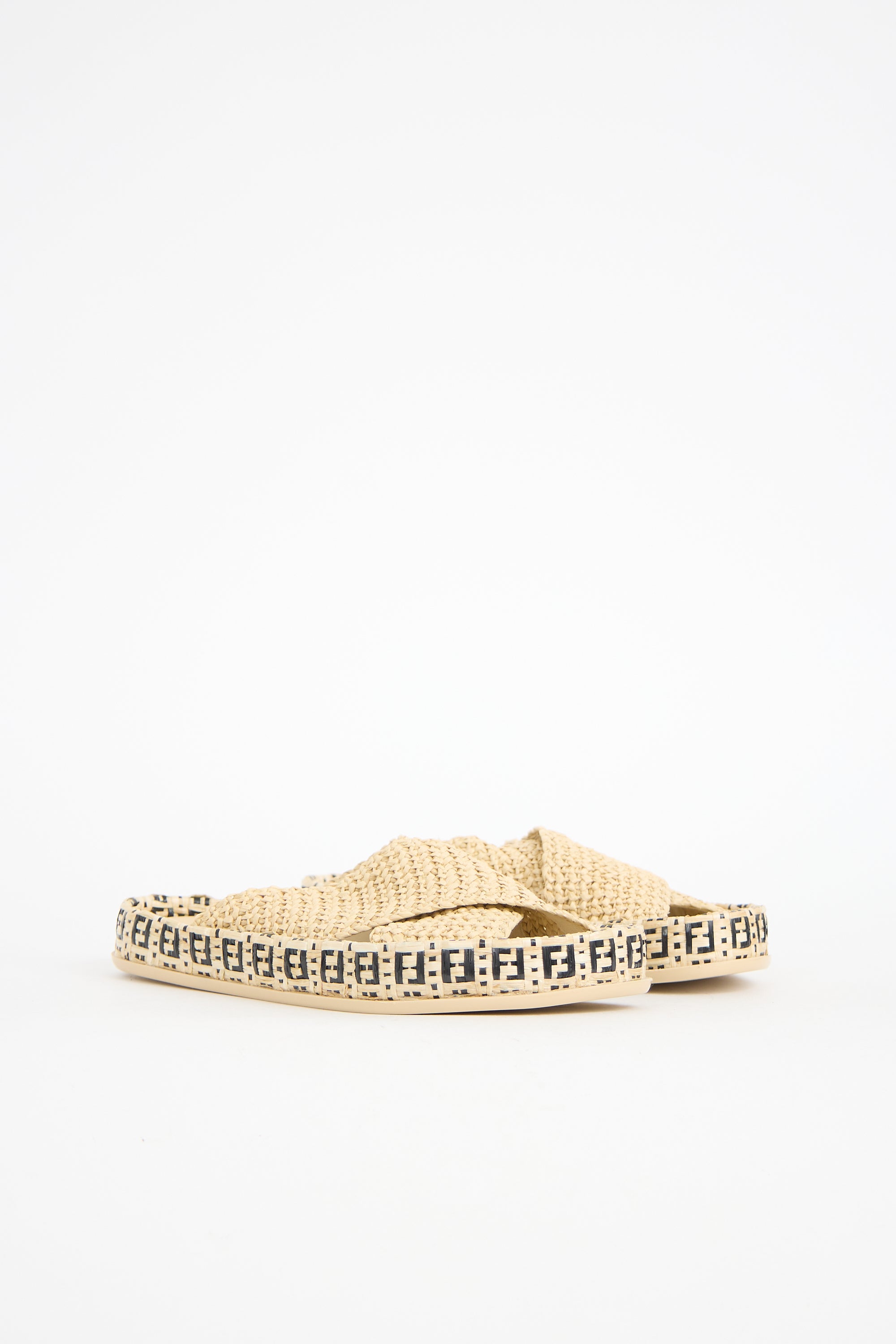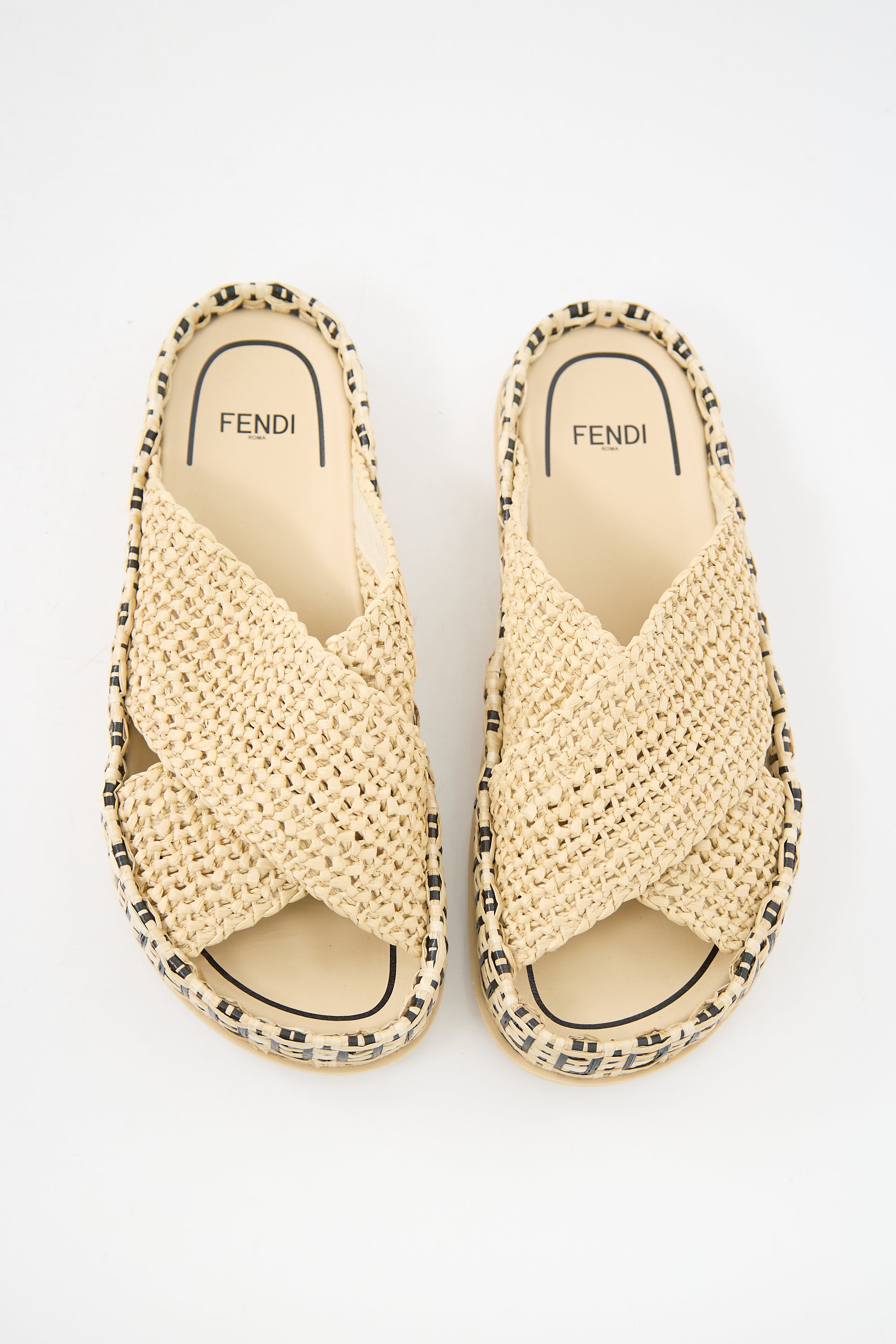 Pre-owned Fendi beige and black raffia Reflection slides featuring rounded toe, criss cross vamp, woven FF monogram footbed, and rubber outsole.