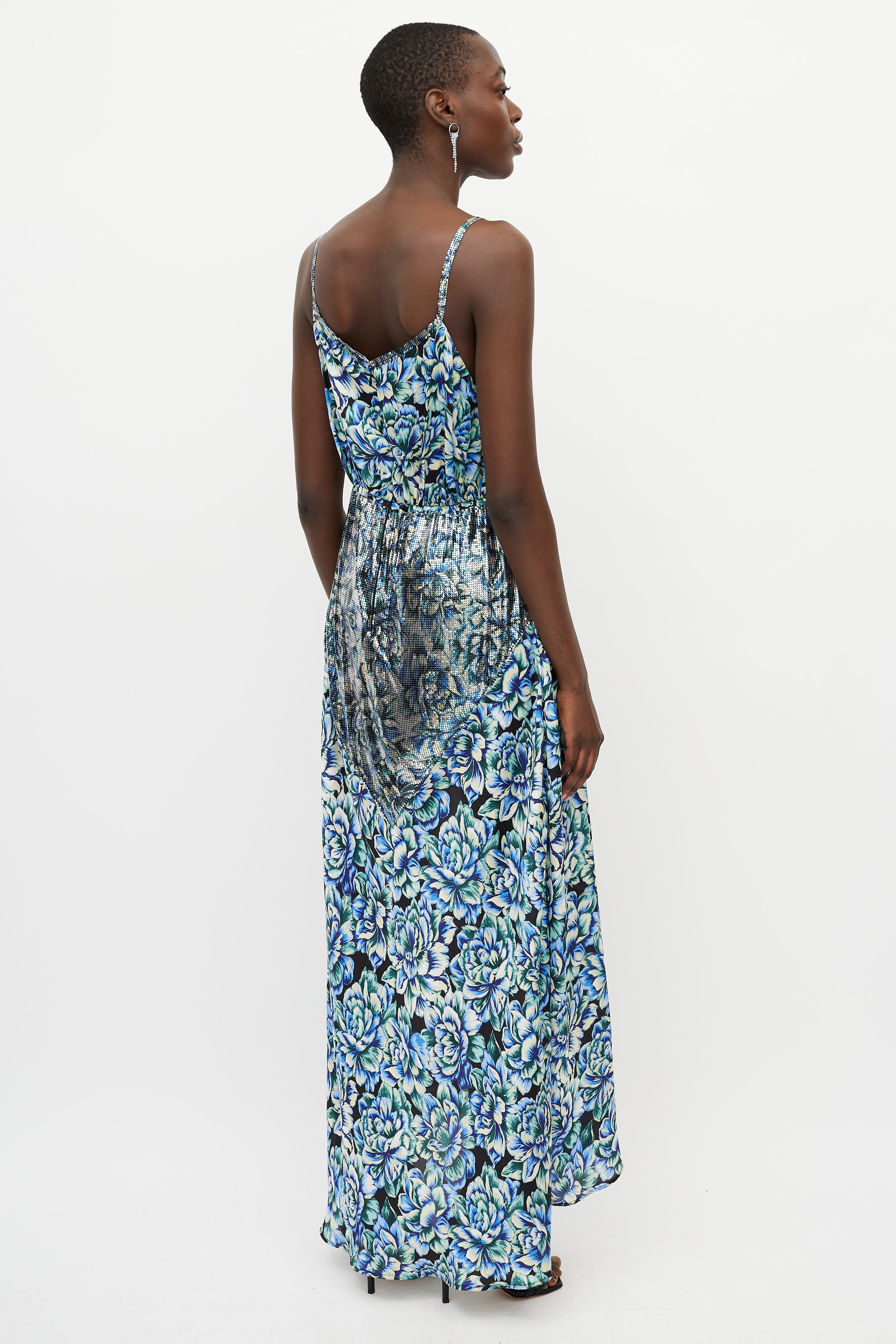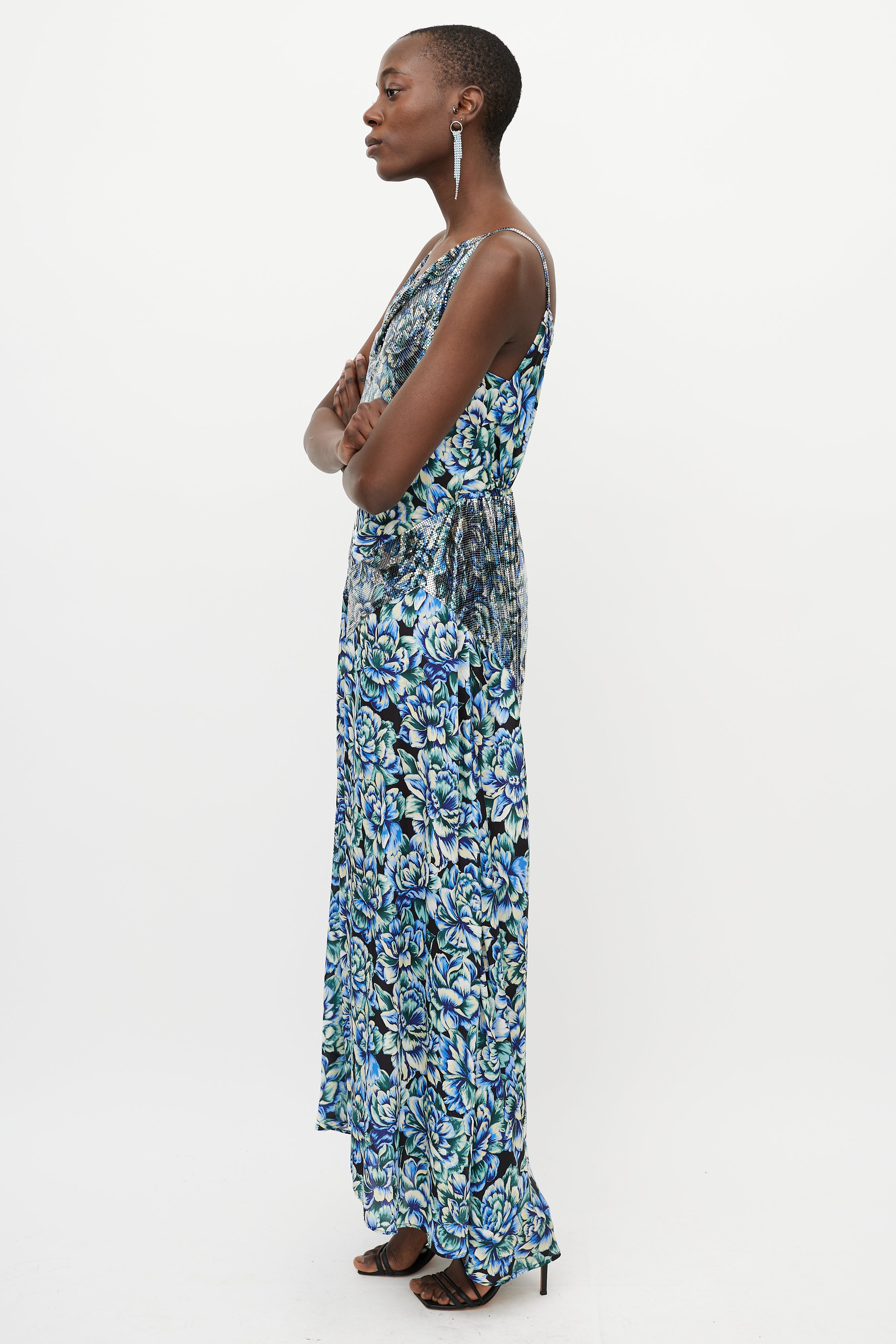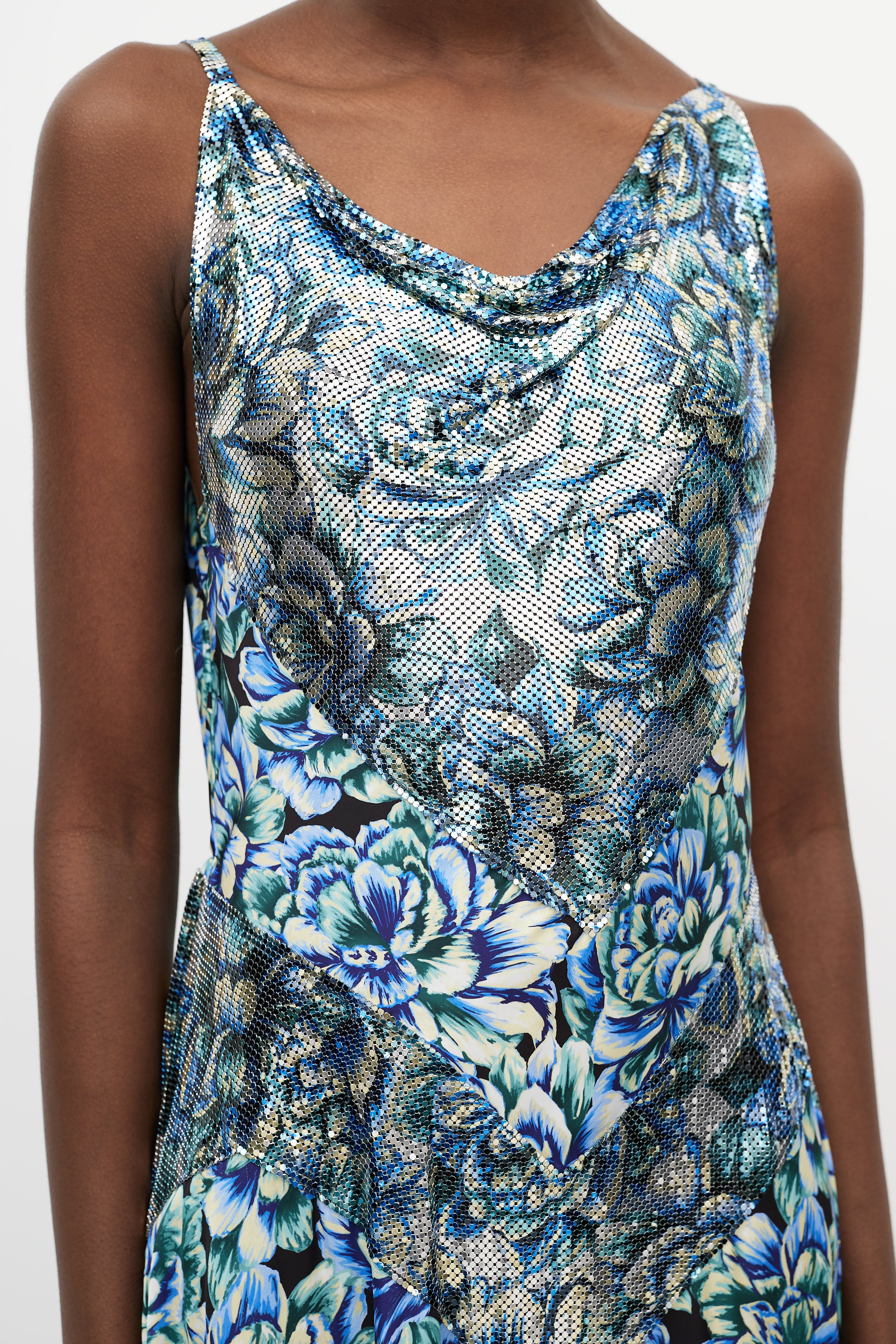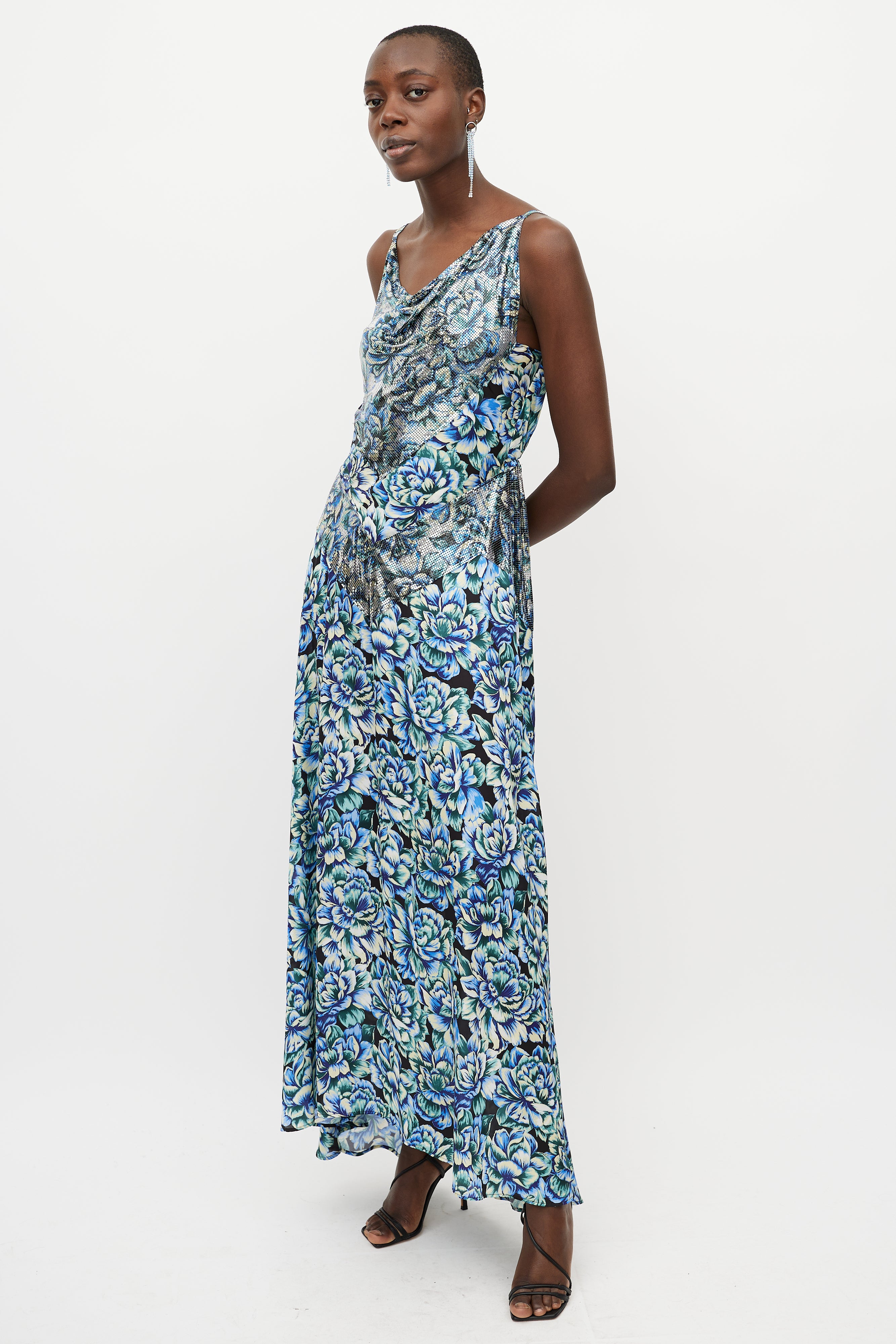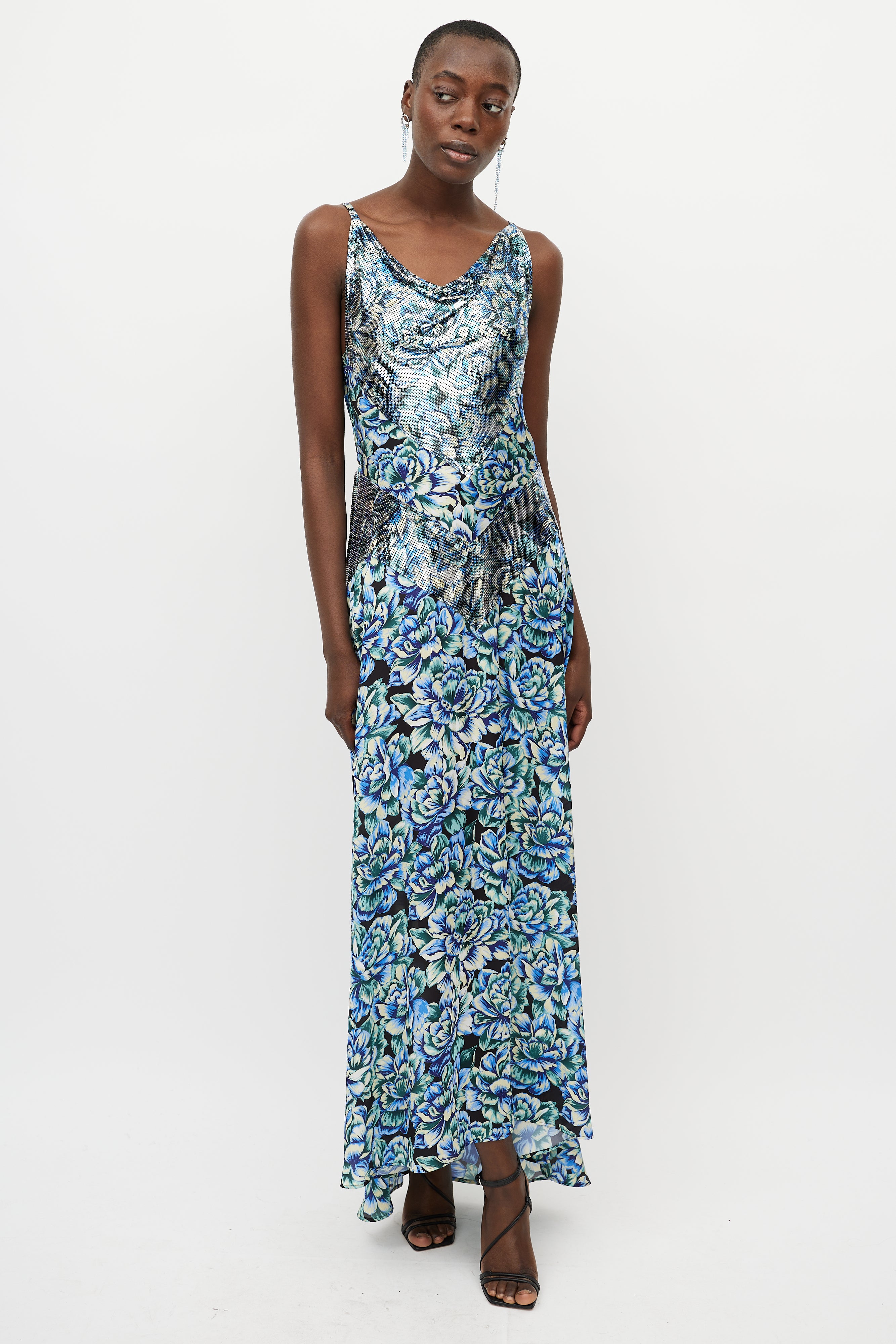 Pre-owned Paco Rabanne chainmail-panelled floral satin maxi dress featuring chainmail panel detail at chest and hip, blue and green floral design throughout, cowl neck, and concealed hook and zip fastening at back.