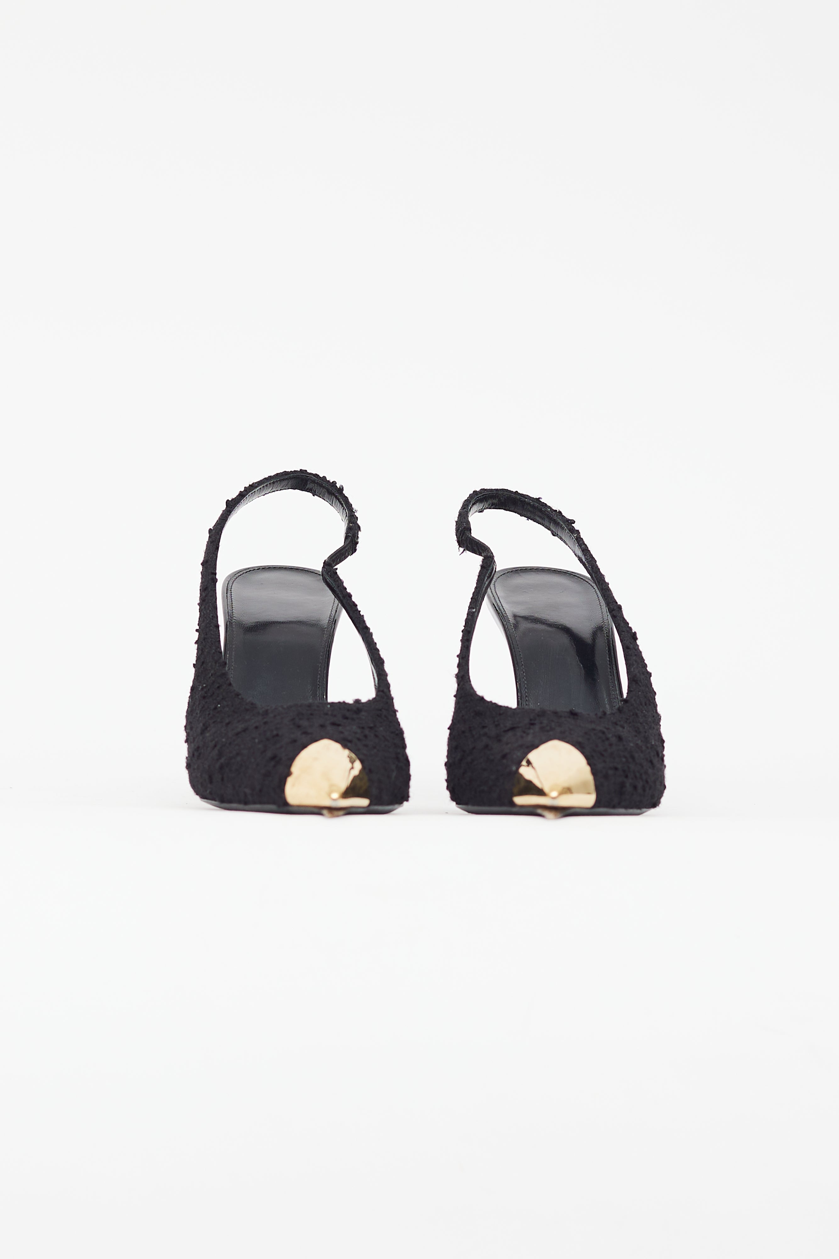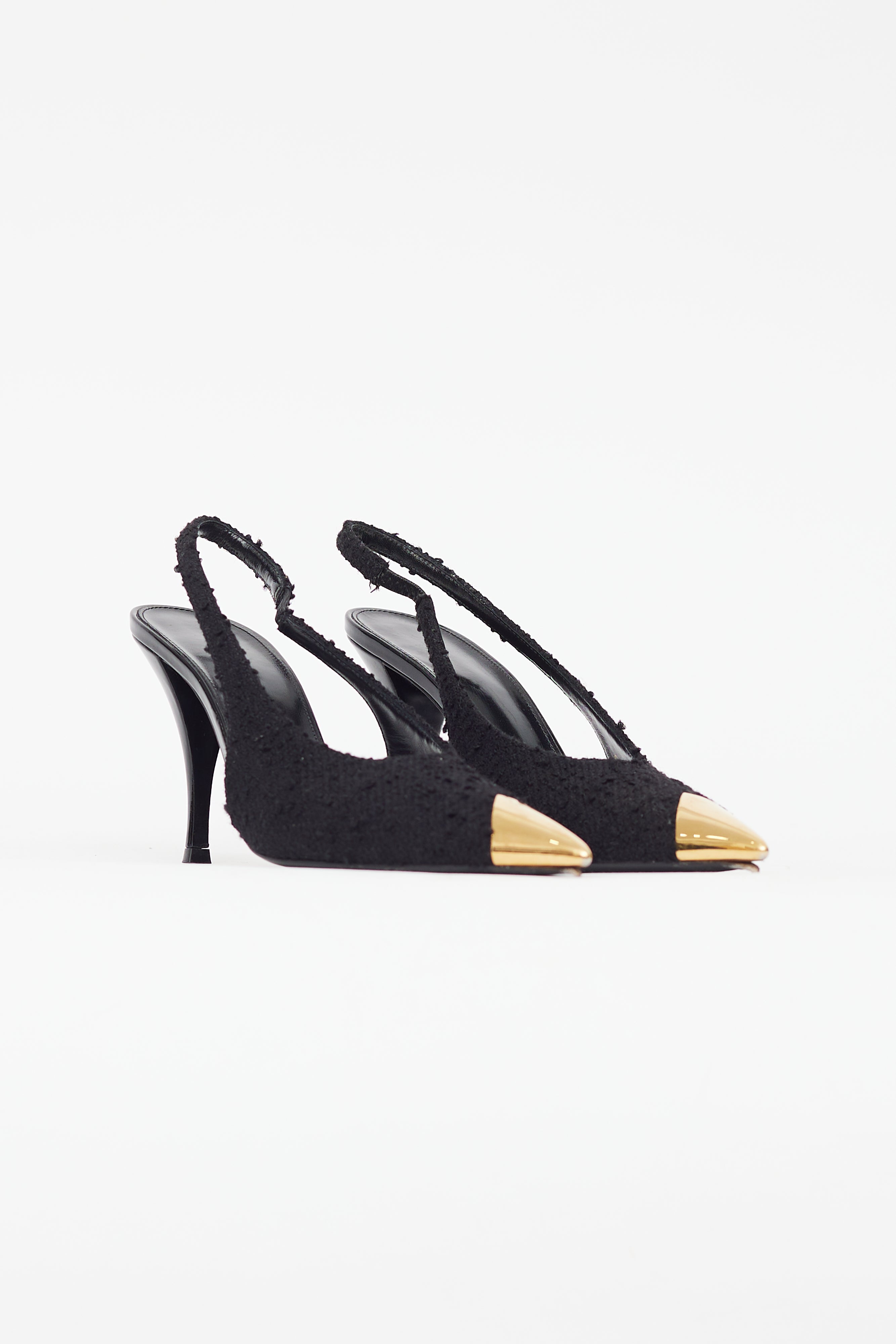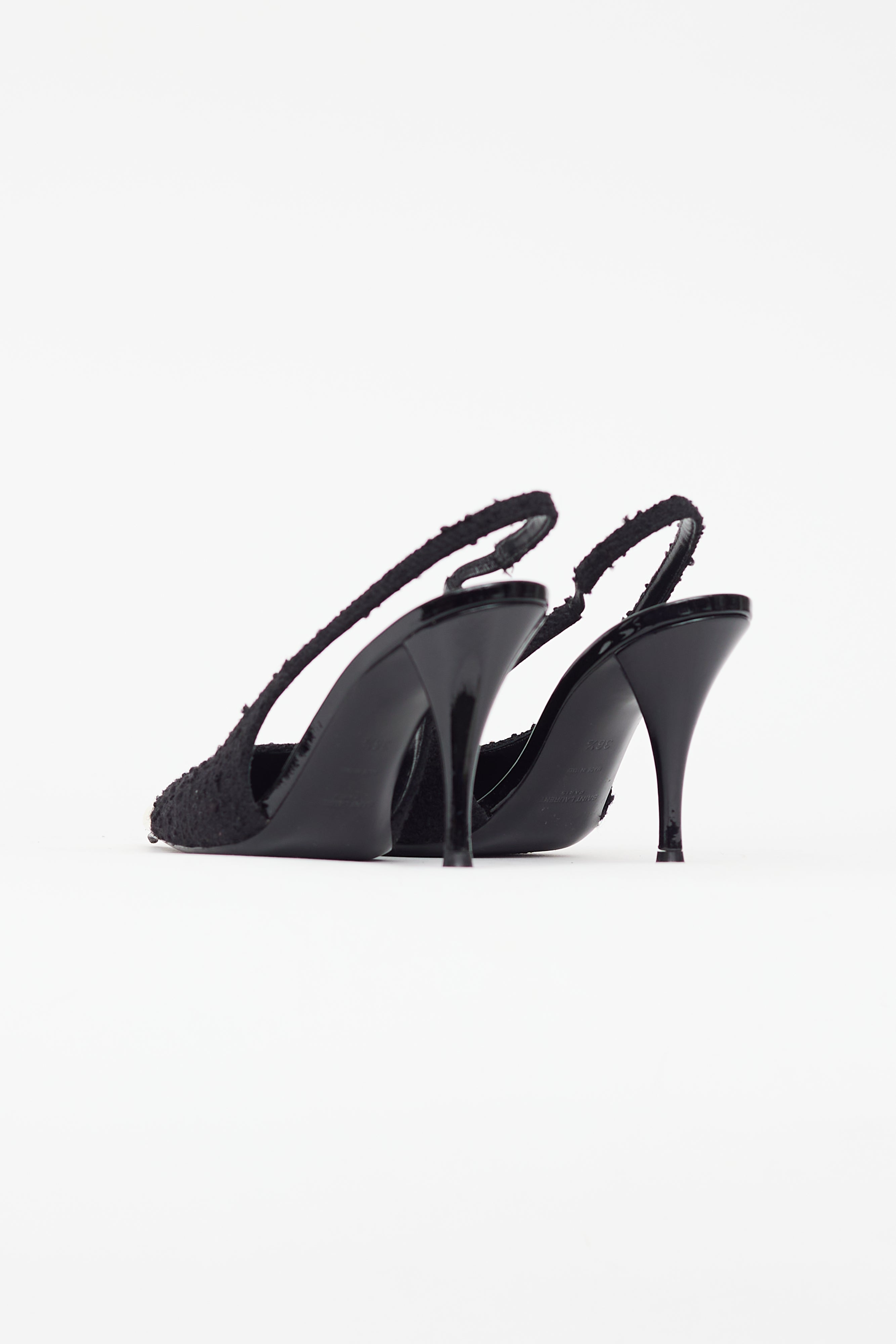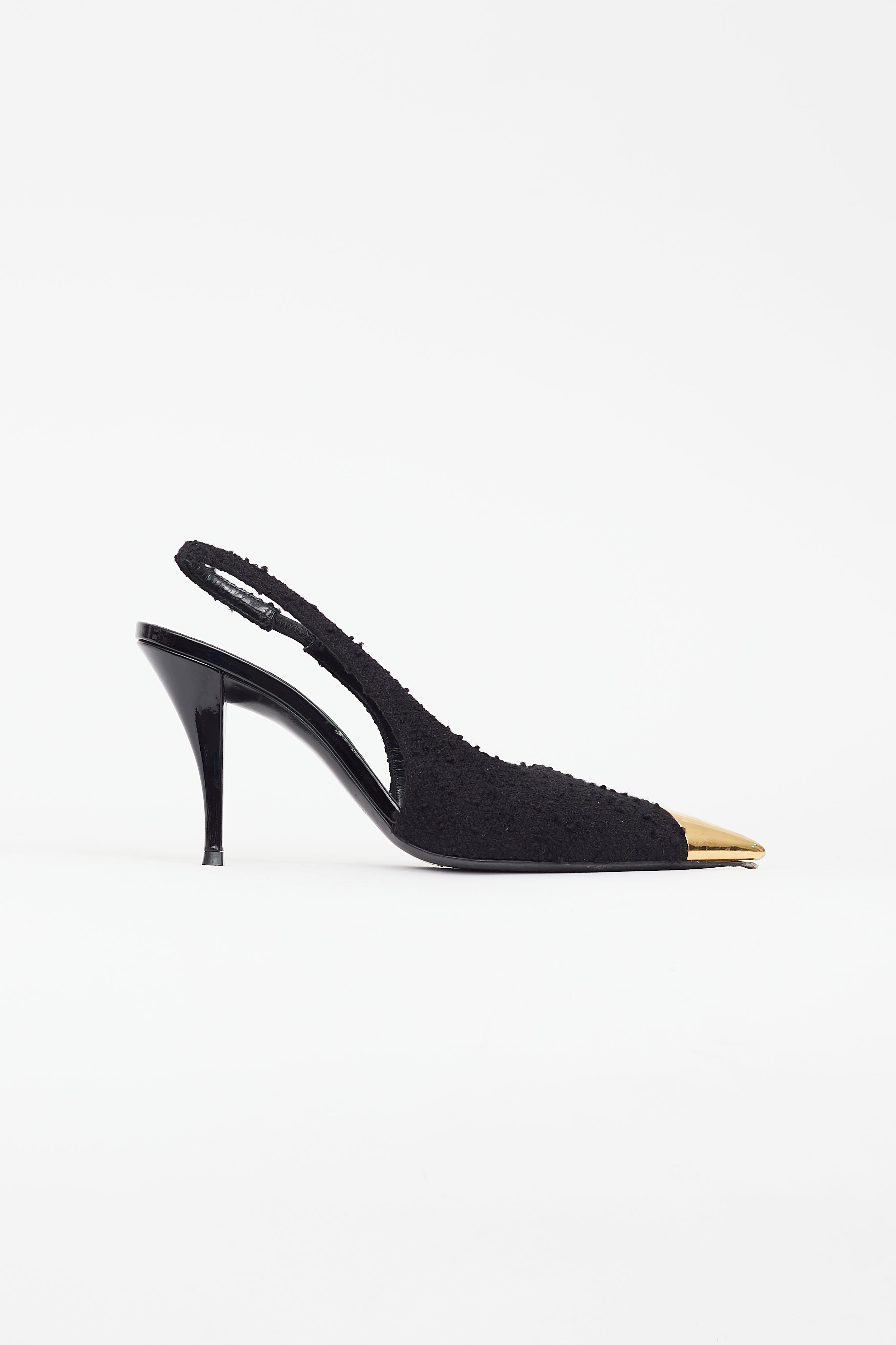 Pre-owned Saint Laurent black tweed Vesper slingback pump featuring gold tone pointed toe, shiny black stiletto heel, and leather insoles. Comes with original box.